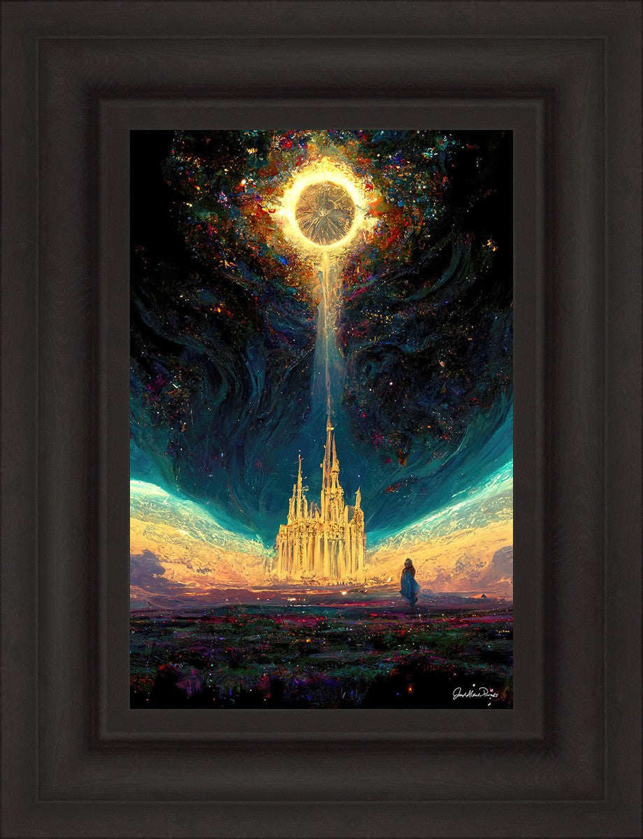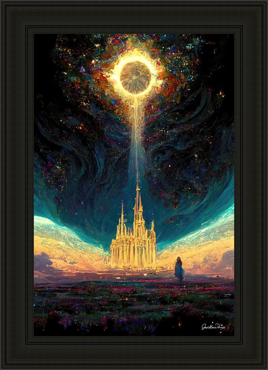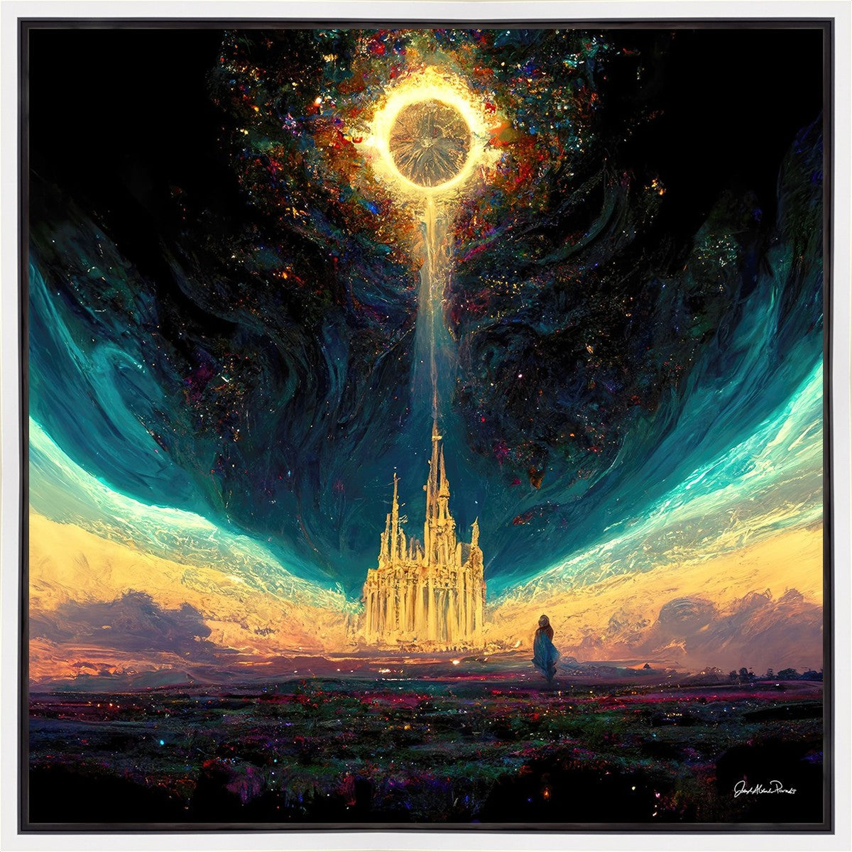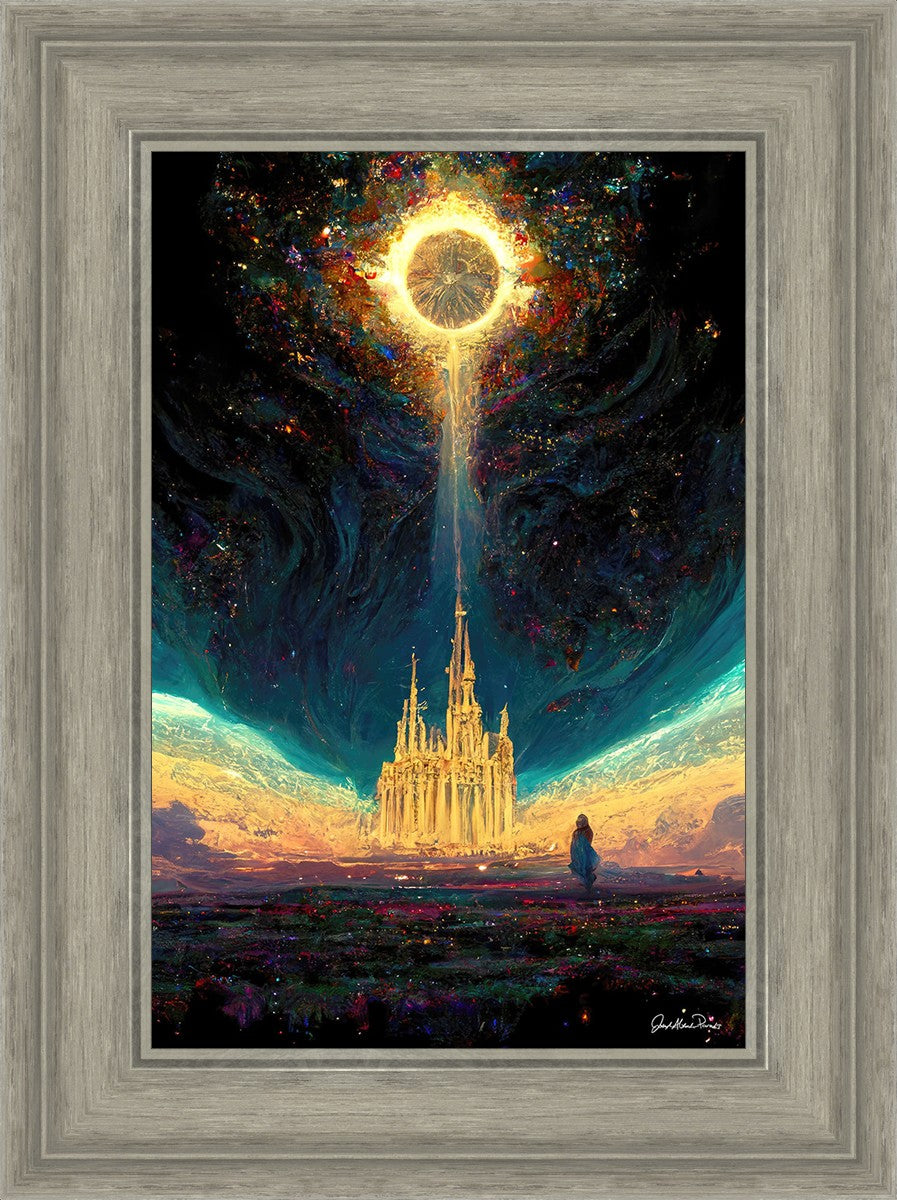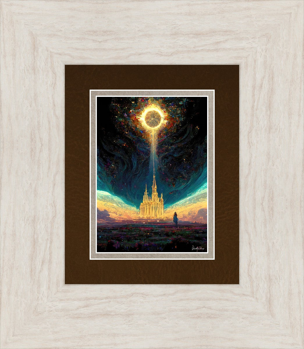 A depiction of the Light of Christ emanating from His throne down to all of His creations and His church. The wake of which, parts the clouds in similitude of the parting of the Red Sea. A solitary woman stands in the awe of this bewildering sight in which she is blessed to behold.