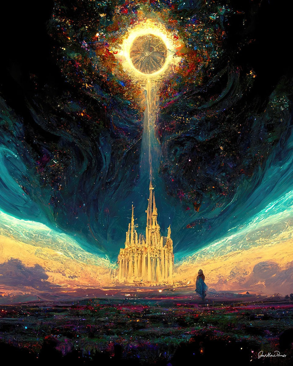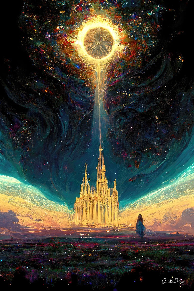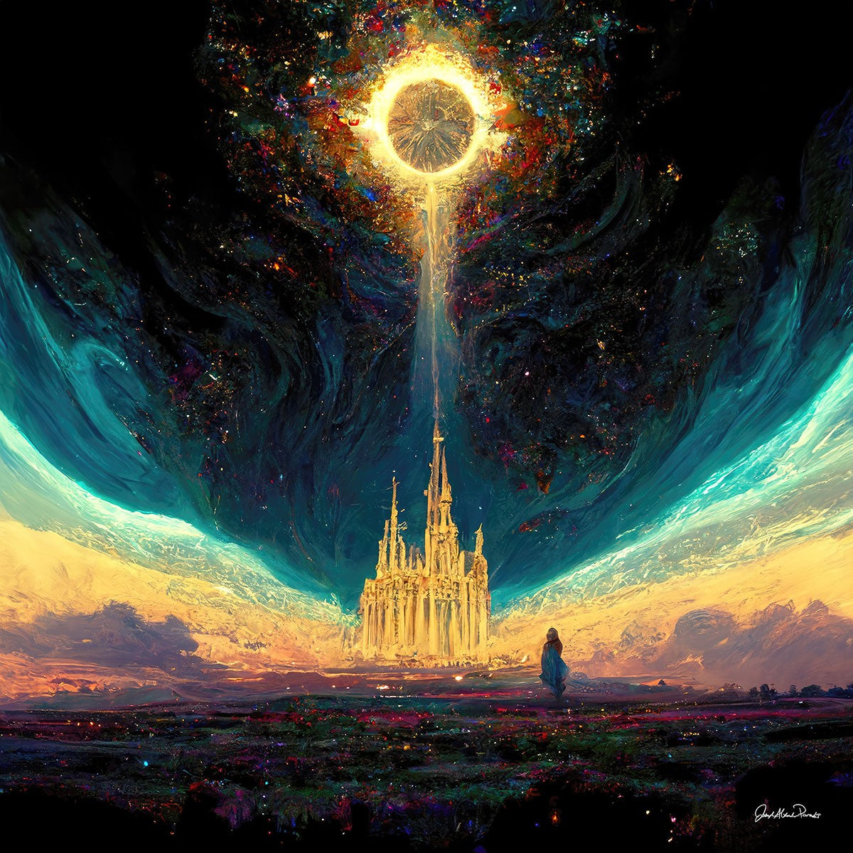 Reproduced from the artist’s original digital file created with Midjourney, Adobe Photoshop, Adobe Fresco, & TopazLabs. Created 2023.