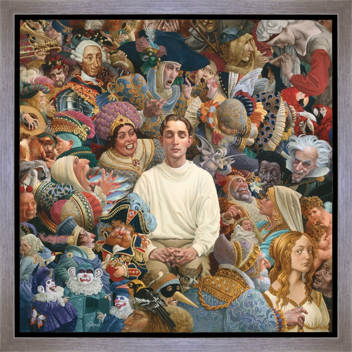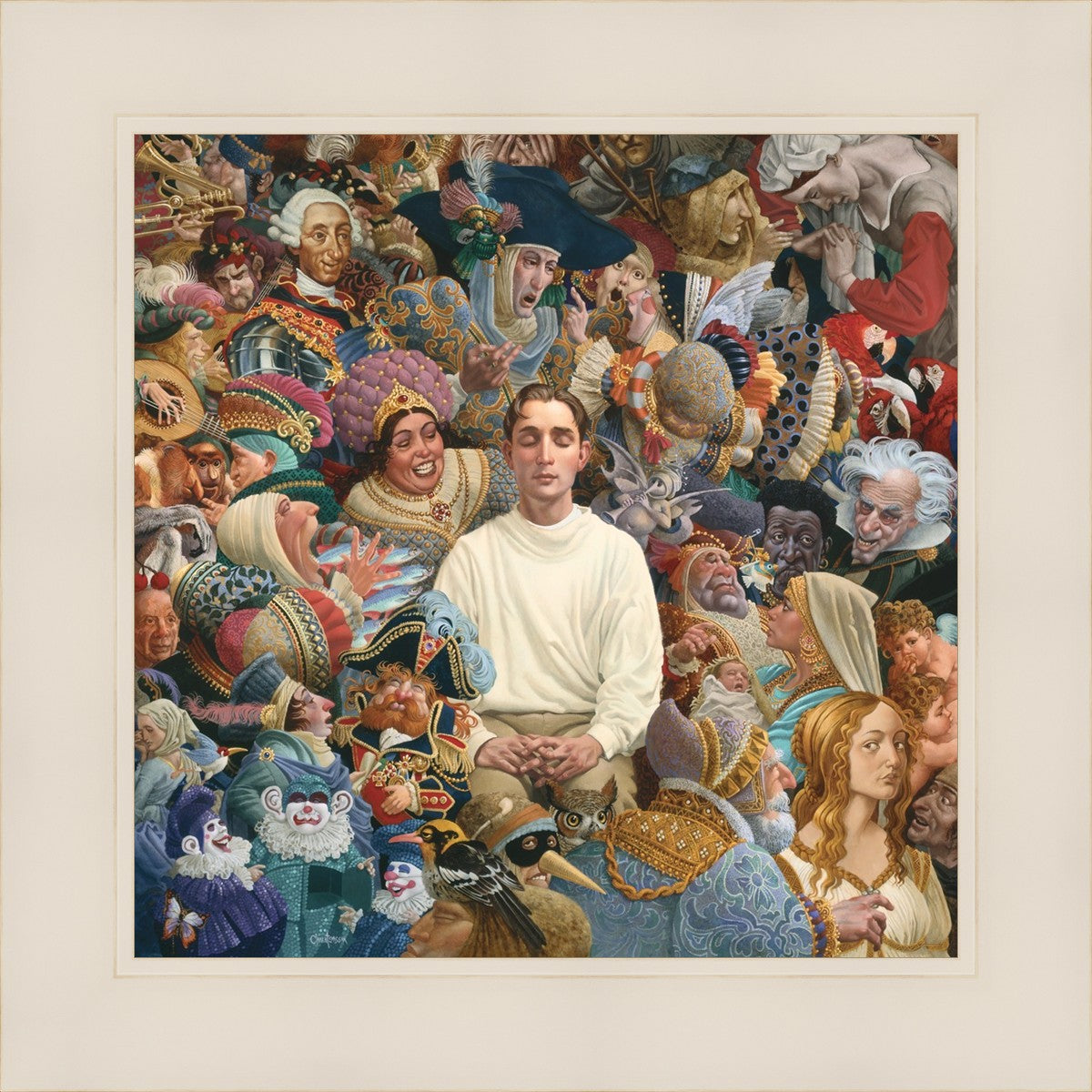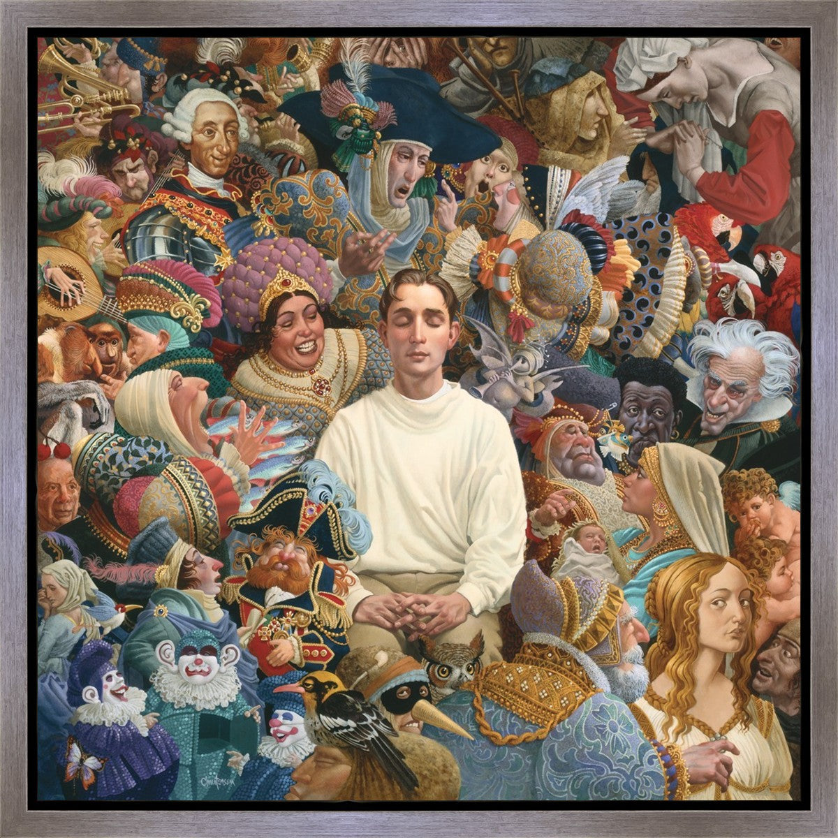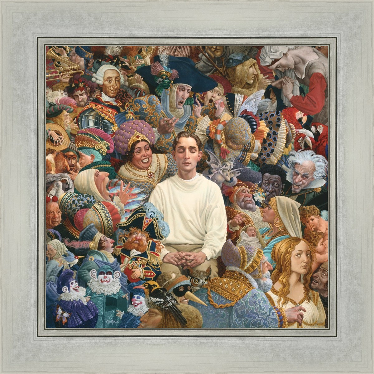 The characters found in the colorful “noise” around the listener in this painting take many forms including politicians, mothers-in-law, musicians, and famous artists… can you find Picasso? Through it all, our listener ignores the noise in favor of his own personal tranquility.