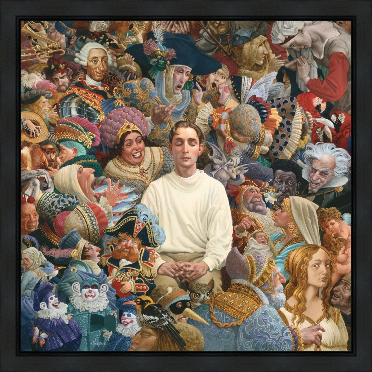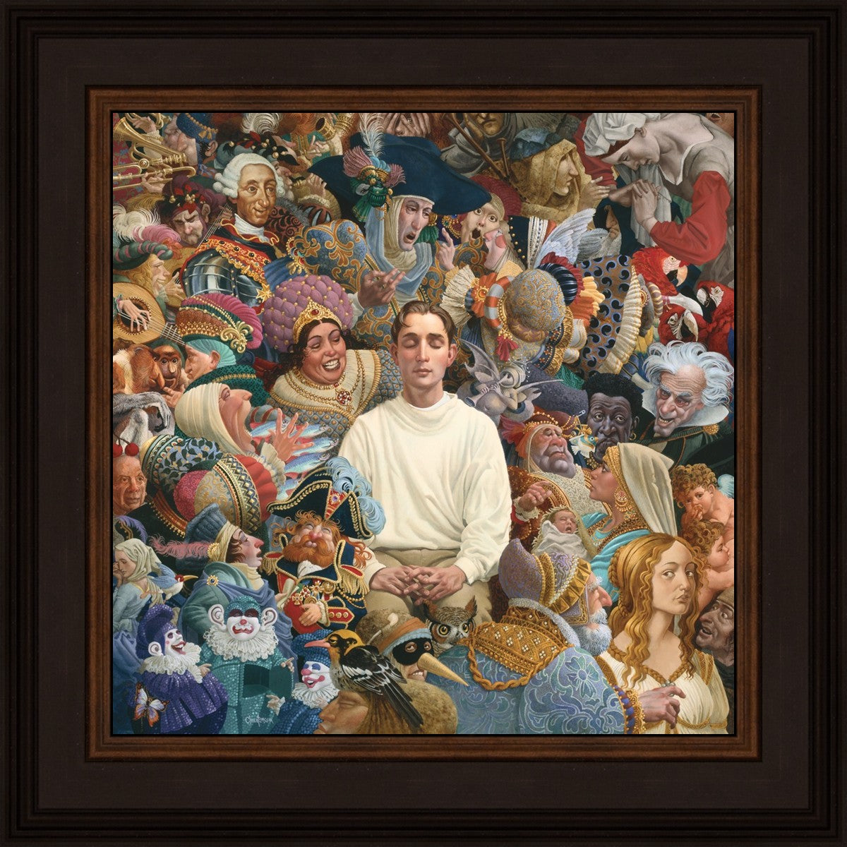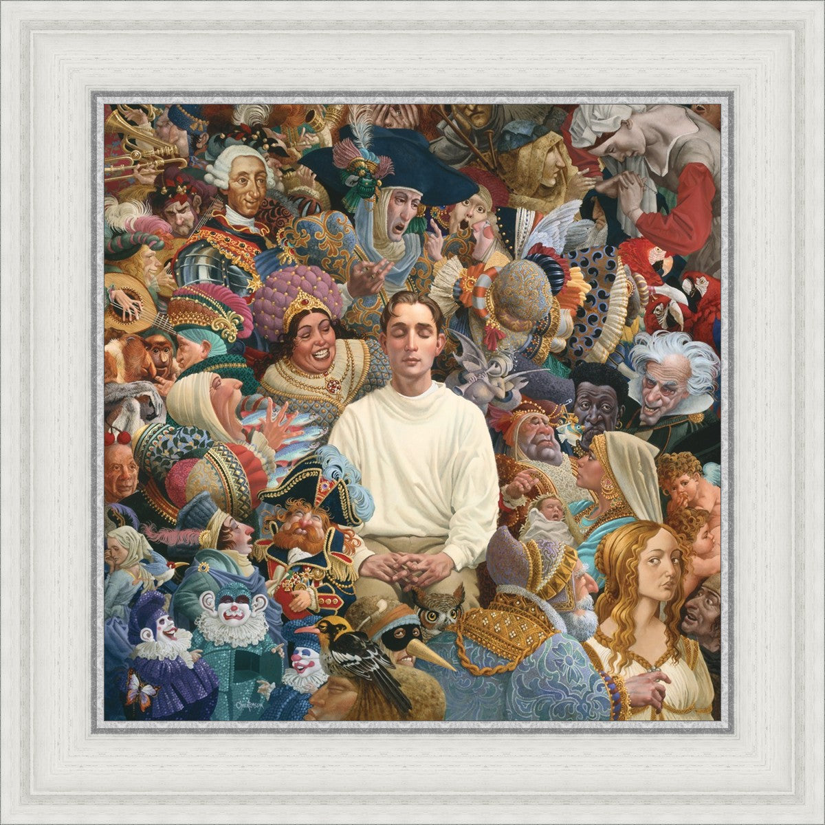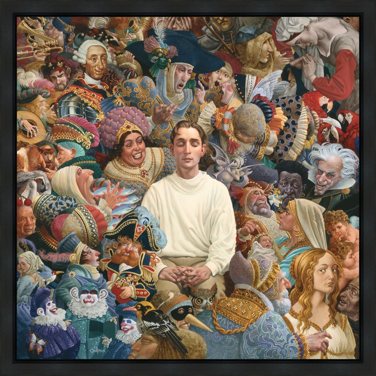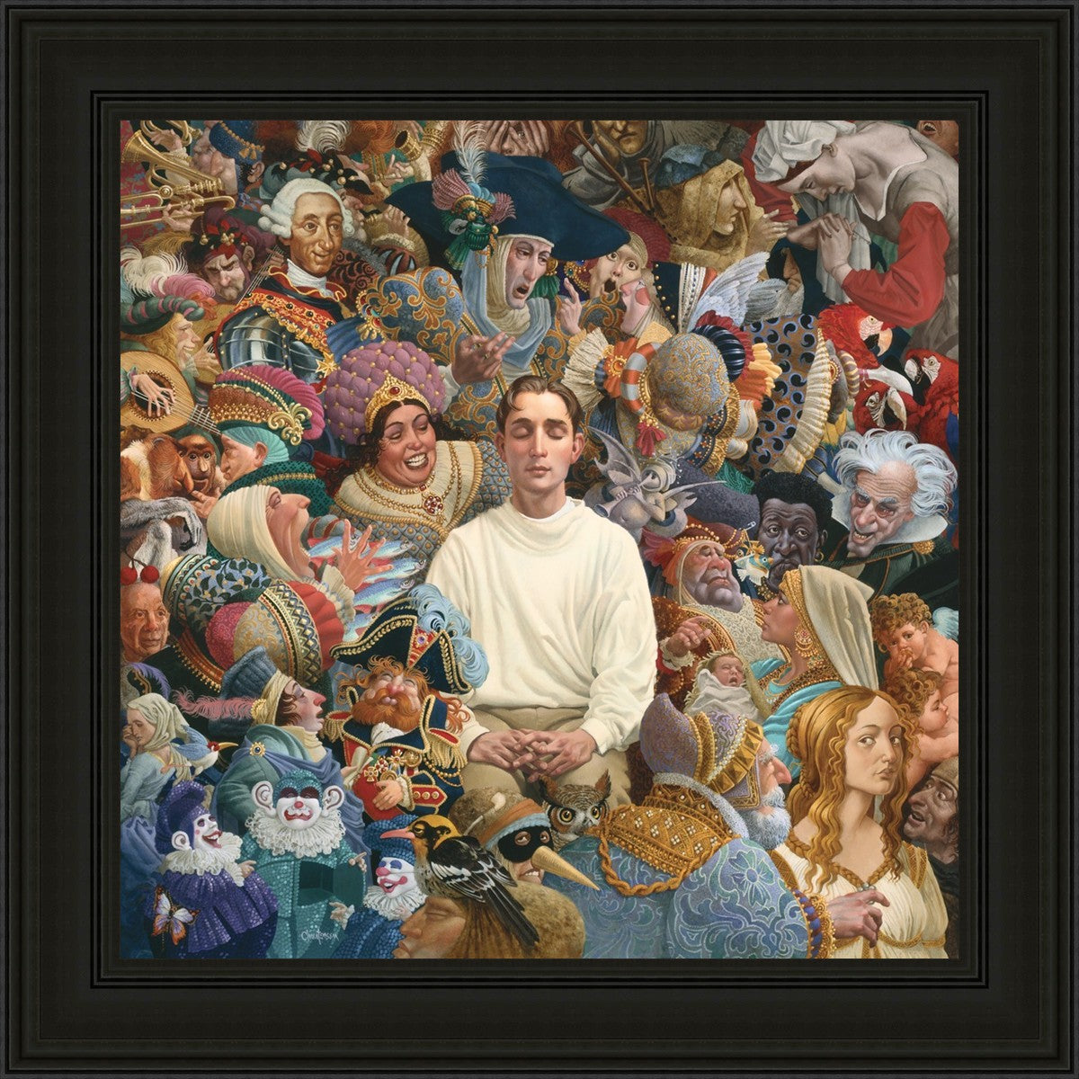 The characters found in the colorful “noise” around the listener in this painting take many forms including politicians, mothers-in-law, musicians, and famous artists… can you find Picasso? Through it all, our listener ignores the noise in favor of his own personal tranquility.
