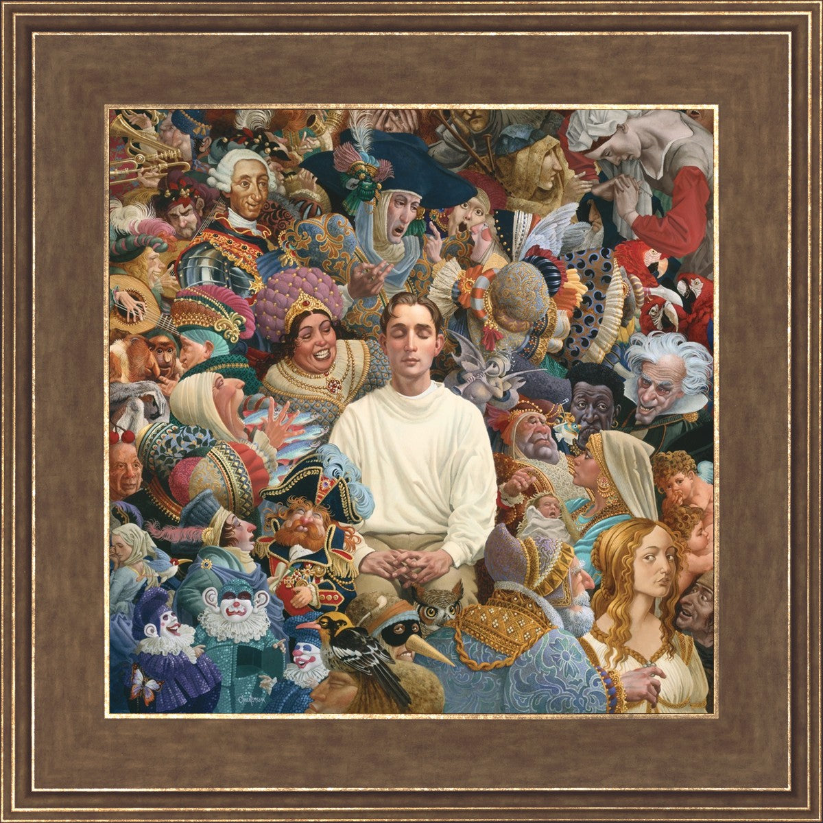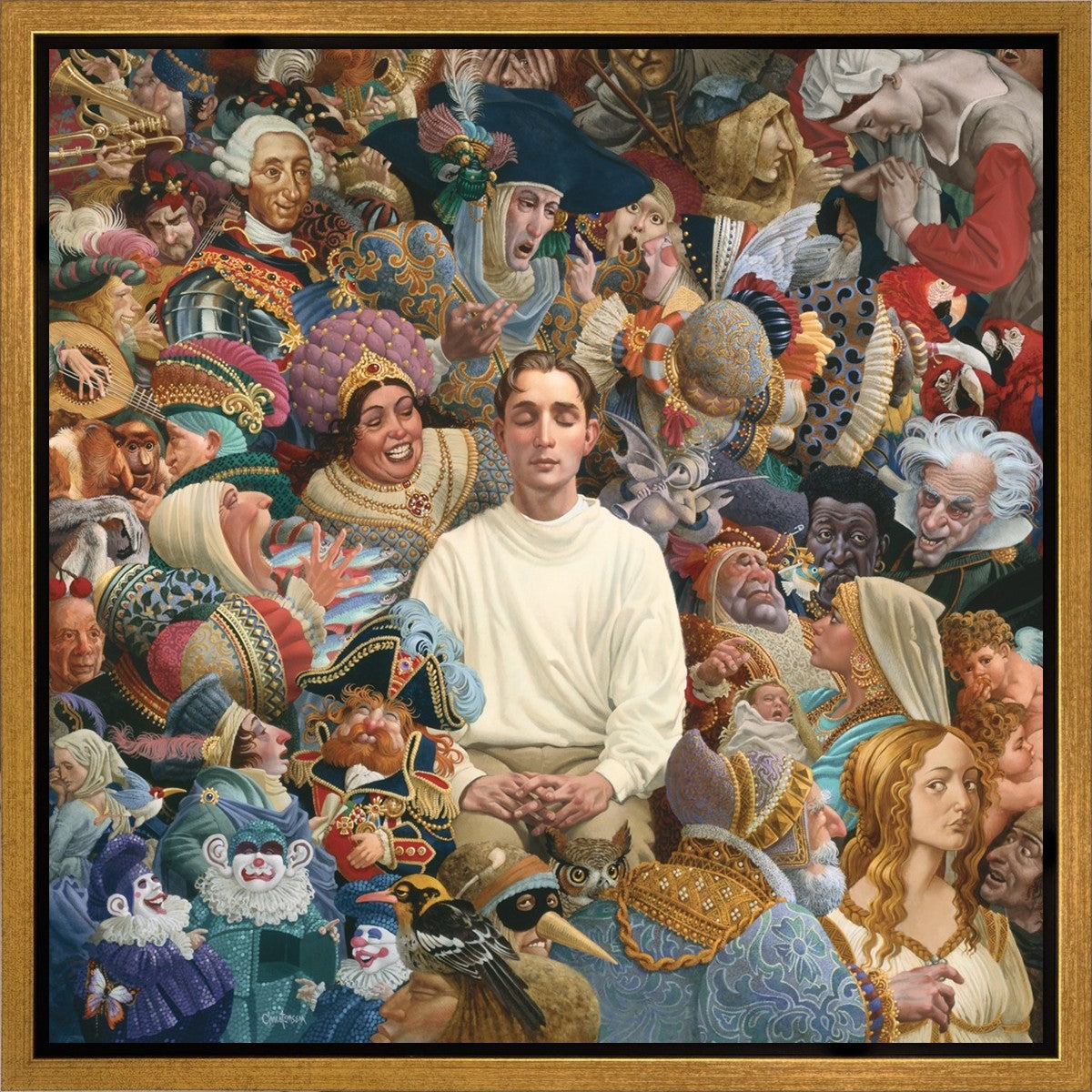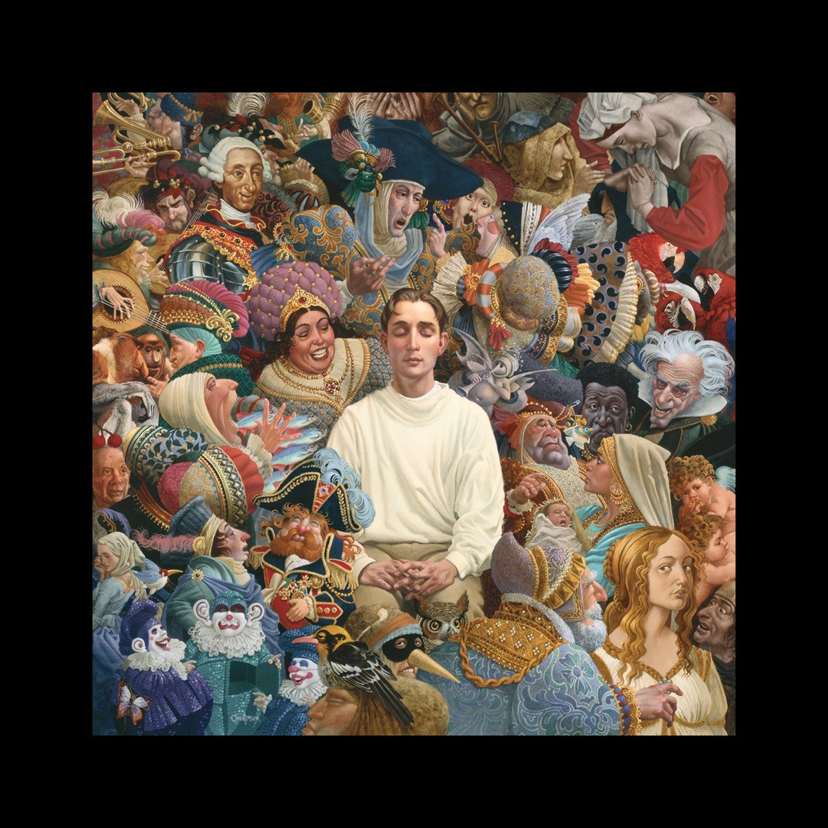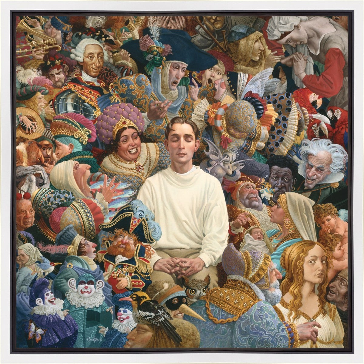 The characters found in the colorful “noise” around the listener in this painting take many forms including politicians, mothers-in-law, musicians, and famous artists… can you find Picasso? Through it all, our listener ignores the noise in favor of his own personal tranquility.
