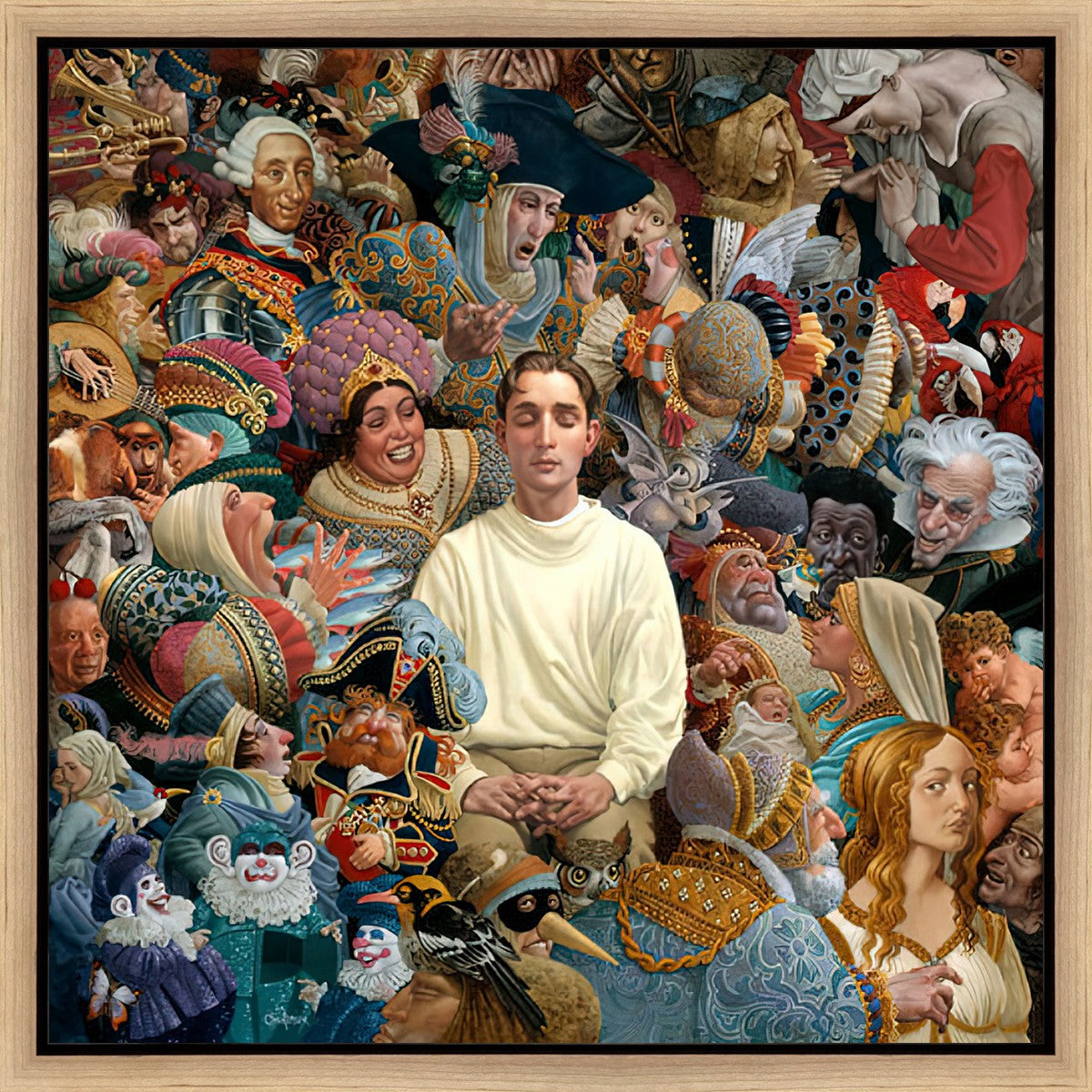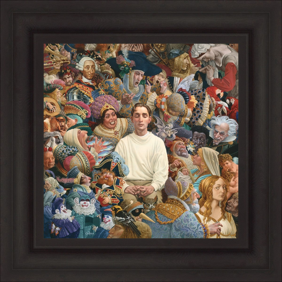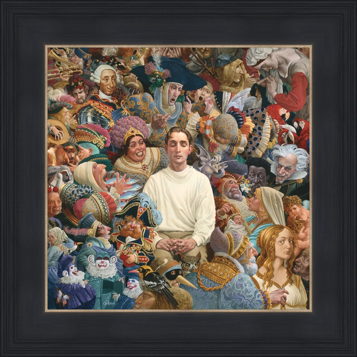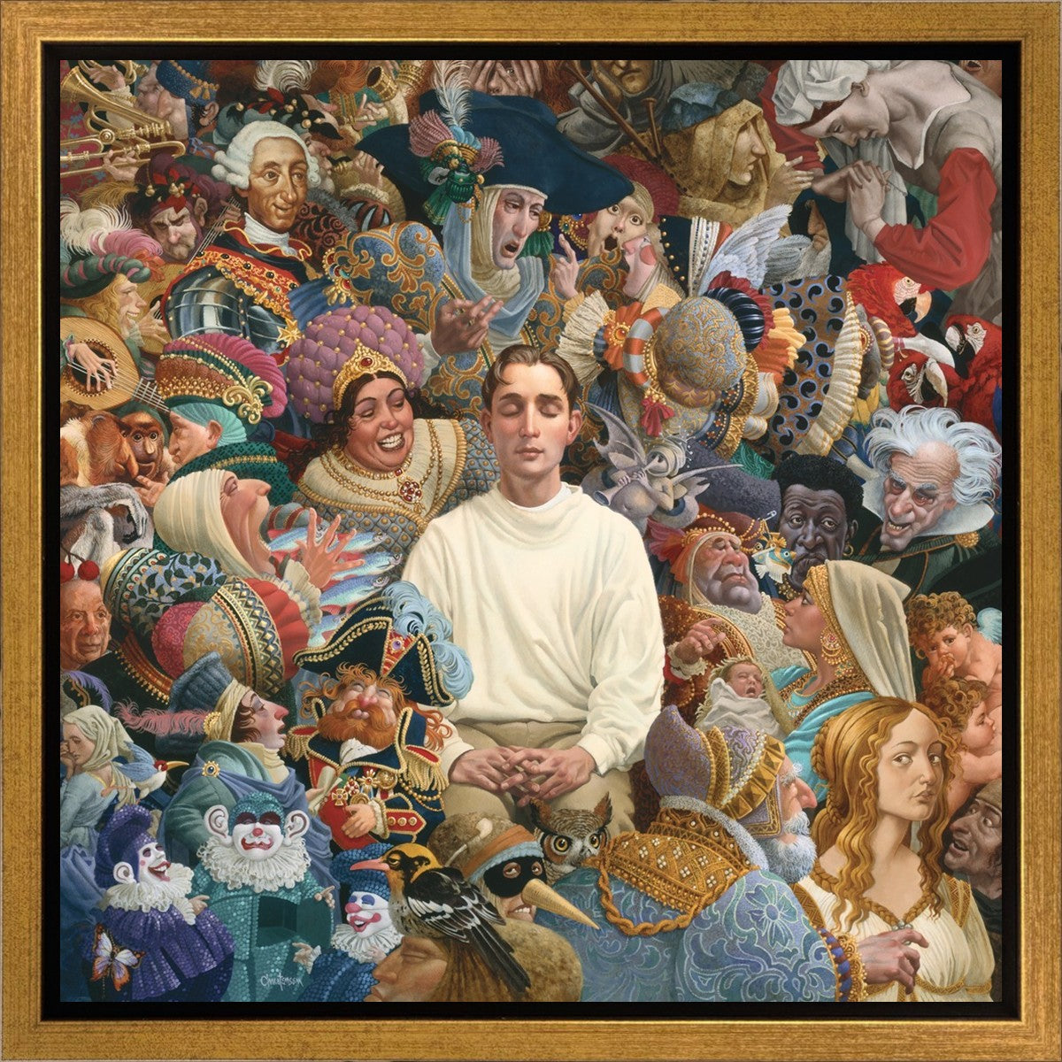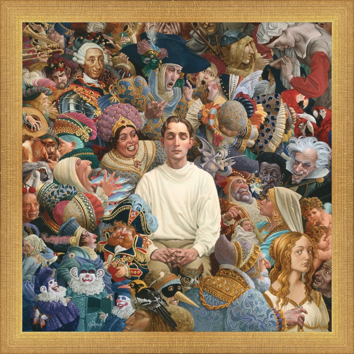 The characters found in the colorful “noise” around the listener in this painting take many forms including politicians, mothers-in-law, musicians, and famous artists… can you find Picasso? Through it all, our listener ignores the noise in favor of his own personal tranquility.
