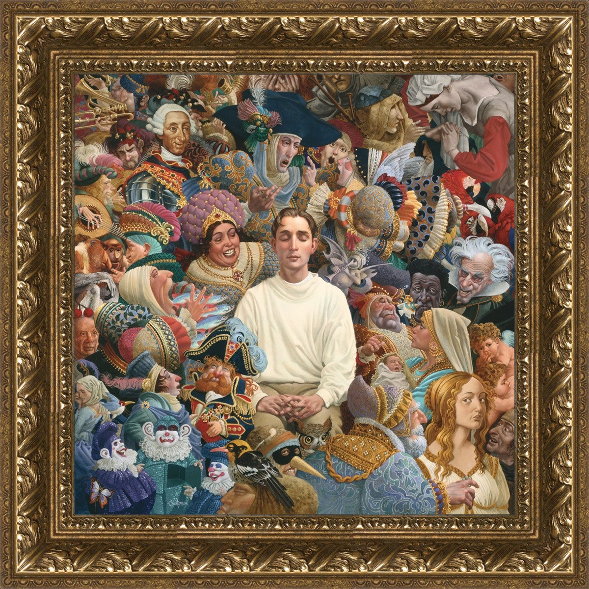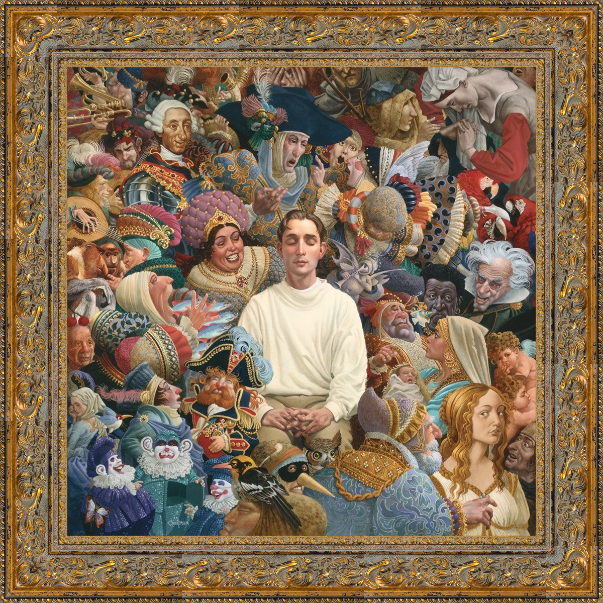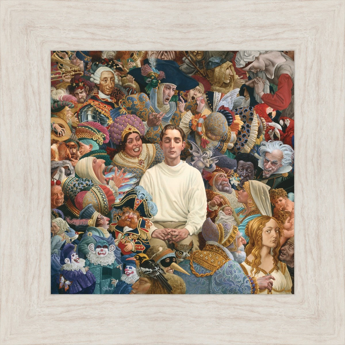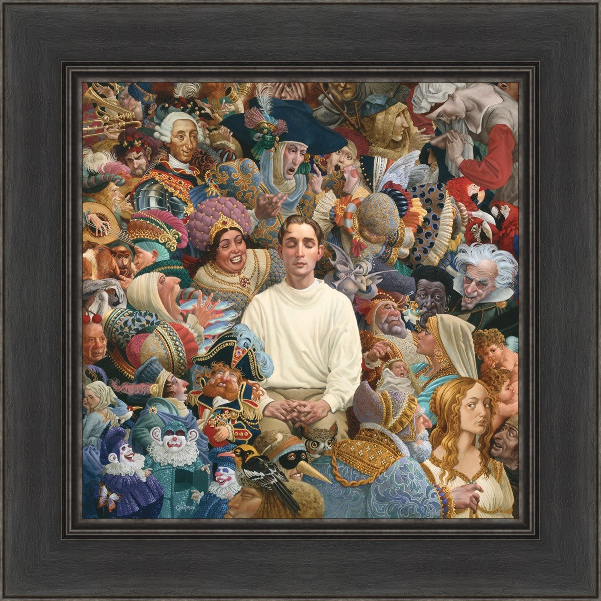 The characters found in the colorful “noise” around the listener in this painting take many forms including politicians, mothers-in-law, musicians, and famous artists… can you find Picasso? Through it all, our listener ignores the noise in favor of his own personal tranquility.