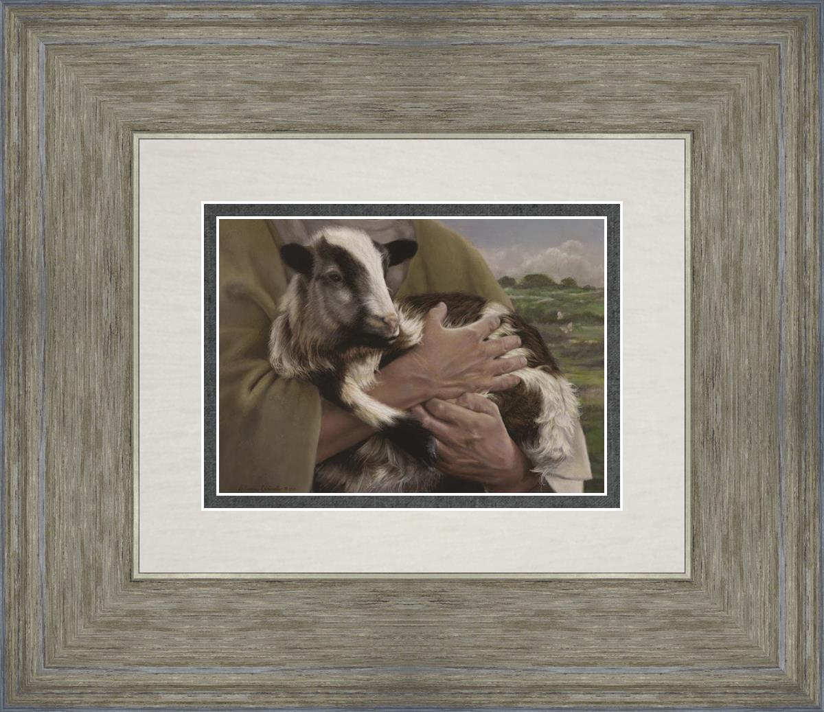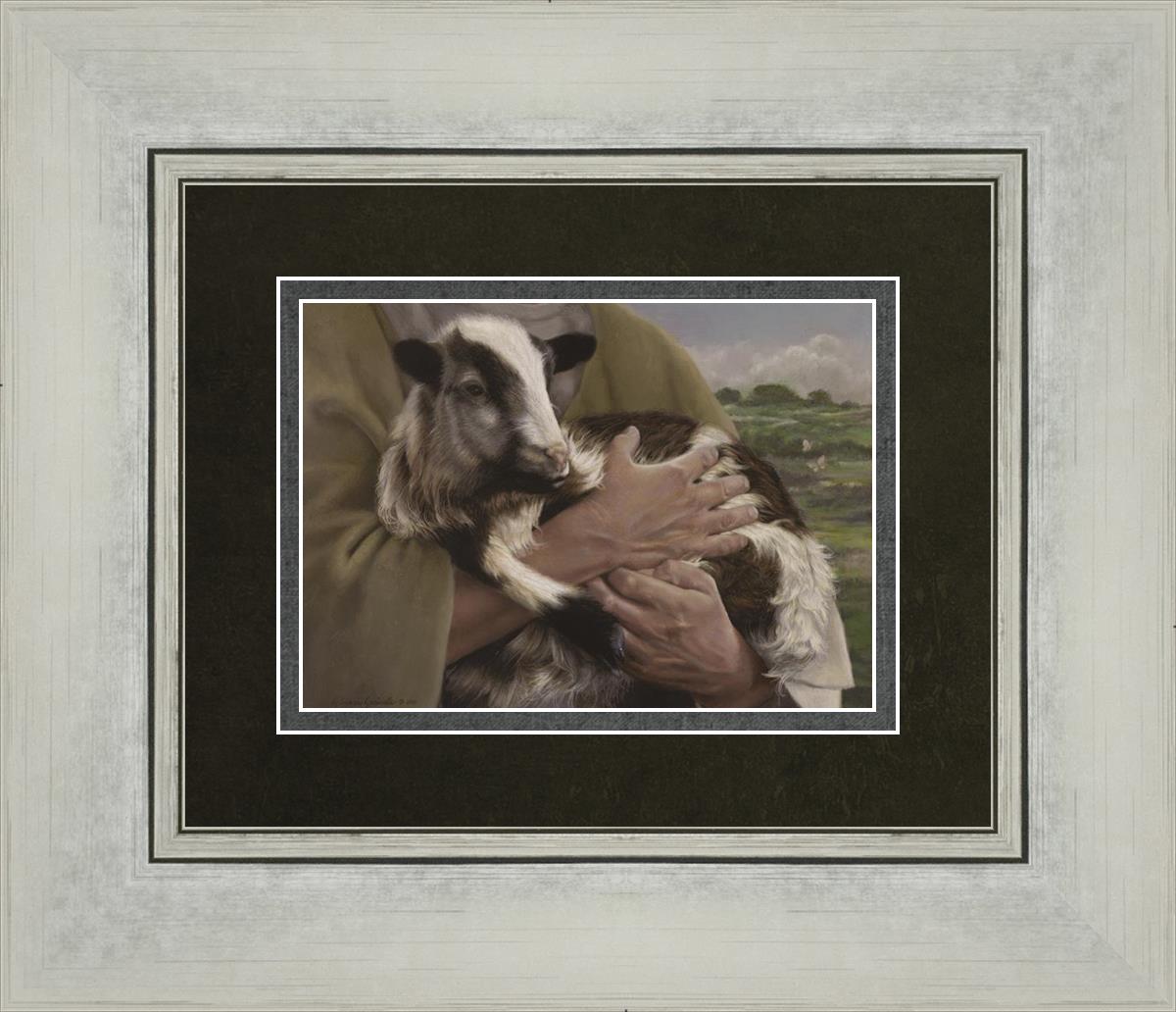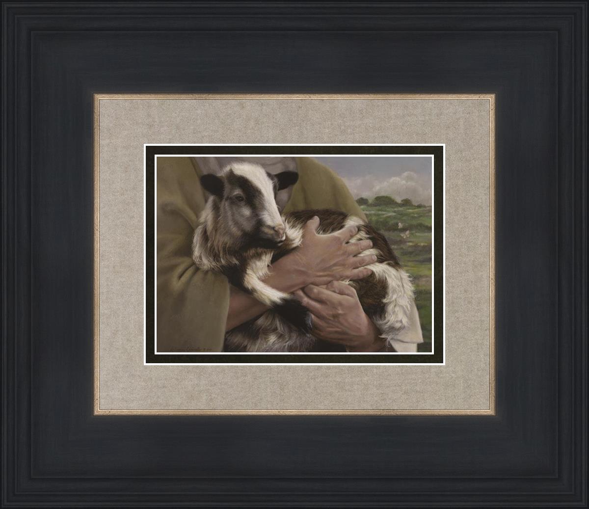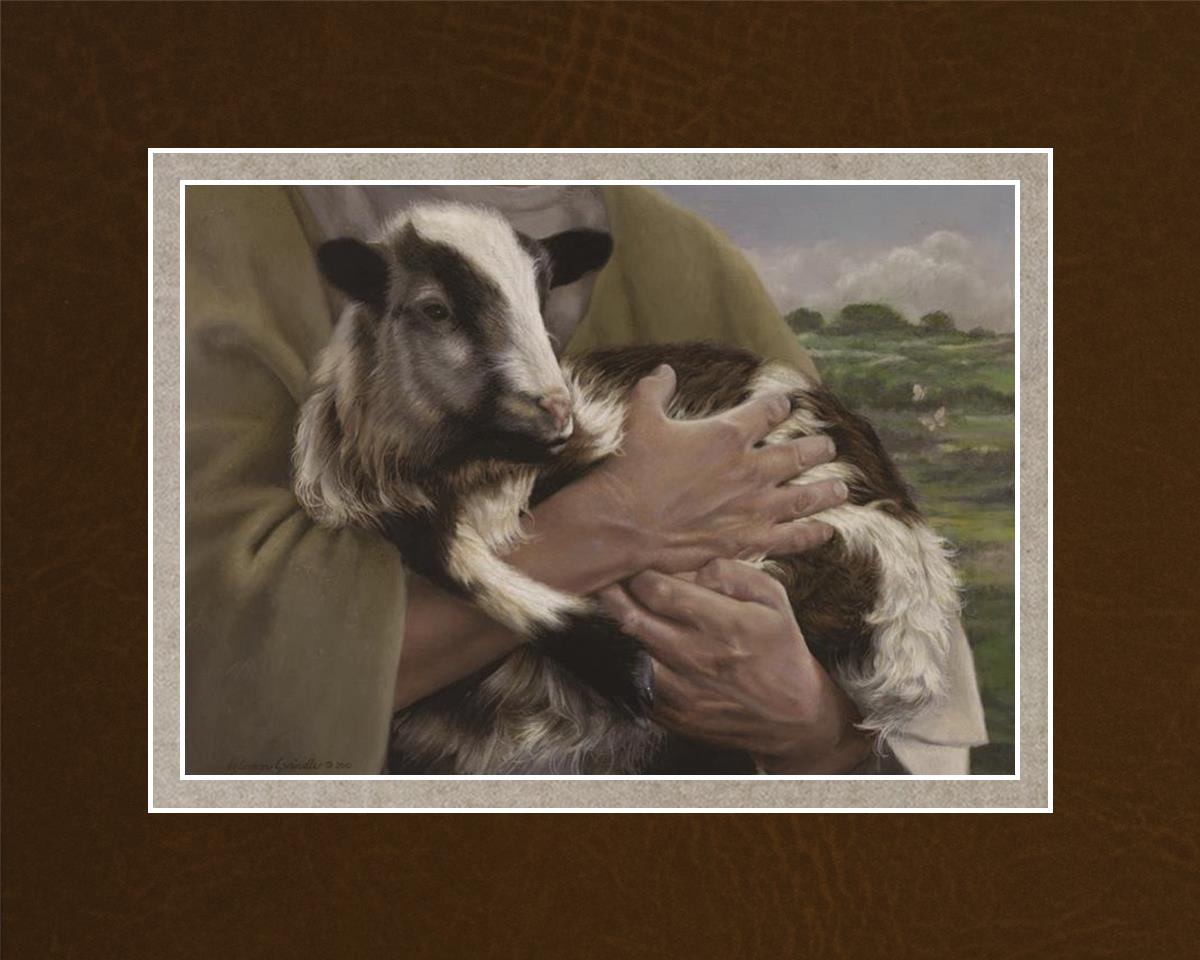 In the parable, one of the shepherd´s sheep has gone astray and become lost. The shepherd leaves the rest of his sheep safely in the fold to go in search of the lost one. When he finds the sheep he throws it on his shoulders and returns to the others, rejoicing with his friends and neighbors over finding the one that was lost. The parable concludes, ®...likewise joy shall be in heaven over one sinner that repenteth....® God is the shepherd and we are His sheep. Each of us wanders from His safety and becomes lost at times. The parable reminds us that God knows each one of us and He will search after us and bring us safely home. I included a butterfly in the background, a symbol thought by many to represent the soul, to remind us that every soul is precious in the sight of God and none of us are forgotten to Him.