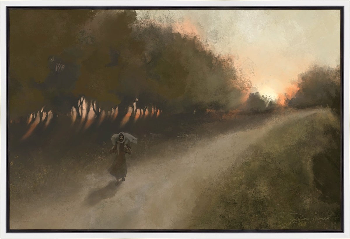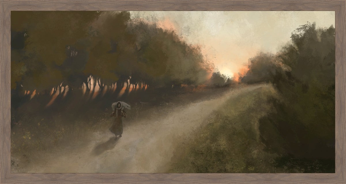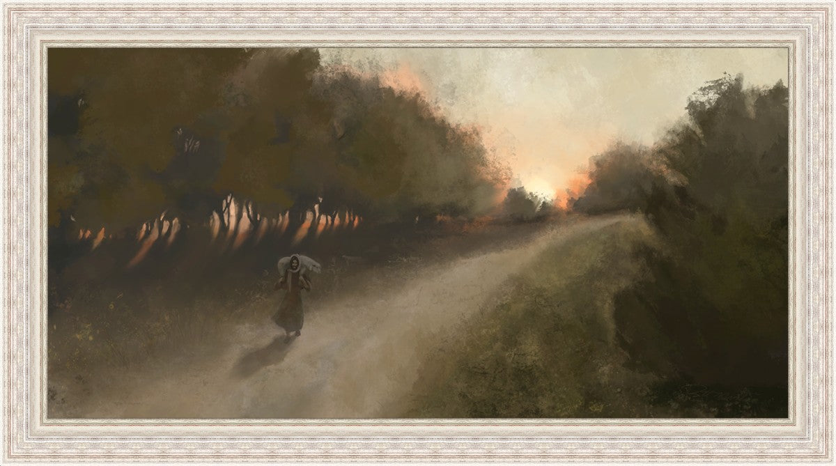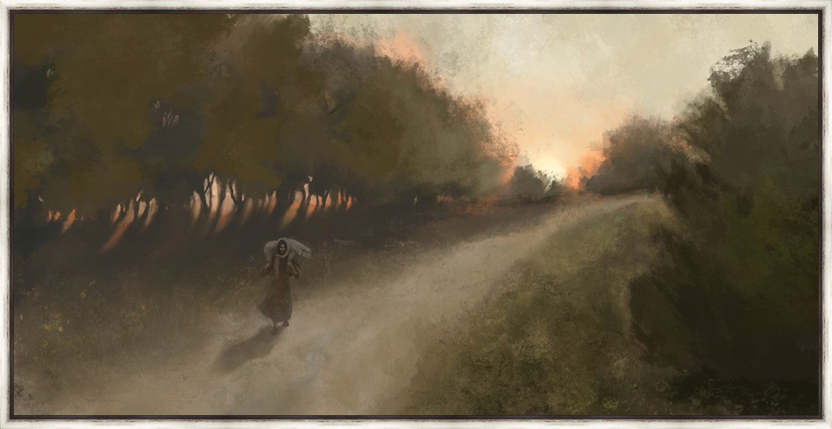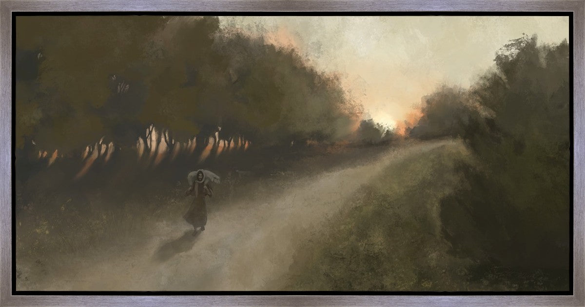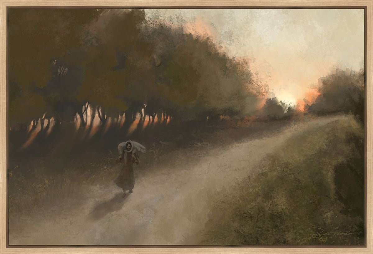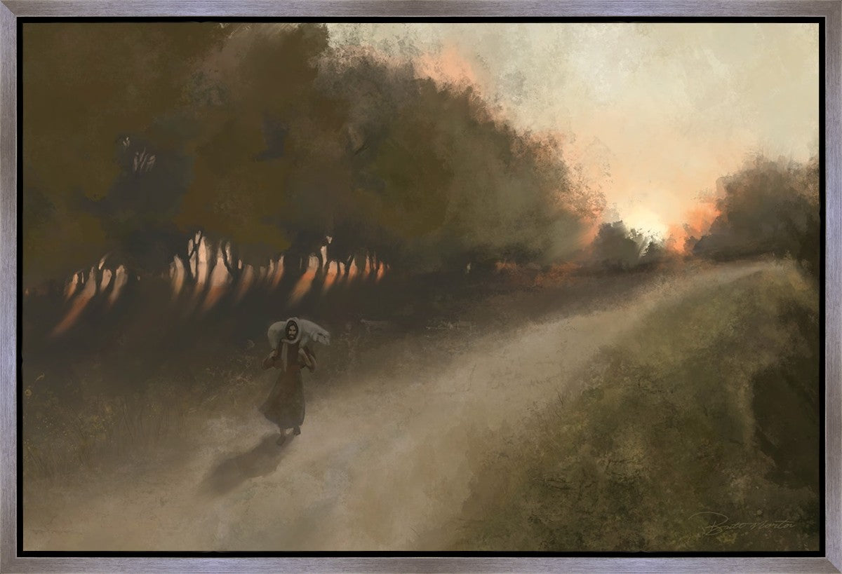 Inspired by the New Testament parable of the Lost Sheep, this piece is a reminder that Christ leaves the 99 the search for the one. This piece depicts the Good Shepherd after a long day of searching, coming home with his precious lost sheep. This piece was created during some scary and potentially life threatening pregnancy complications the artist experienced with her second daughter . The dark, moody colors echo the fear and uncertainty the artist had to navigate while also reconciling her faith that the situation was in God’s hands. When the artist completed the piece, it was a confirmation to her that like the sheep, Christ would carry her through this.