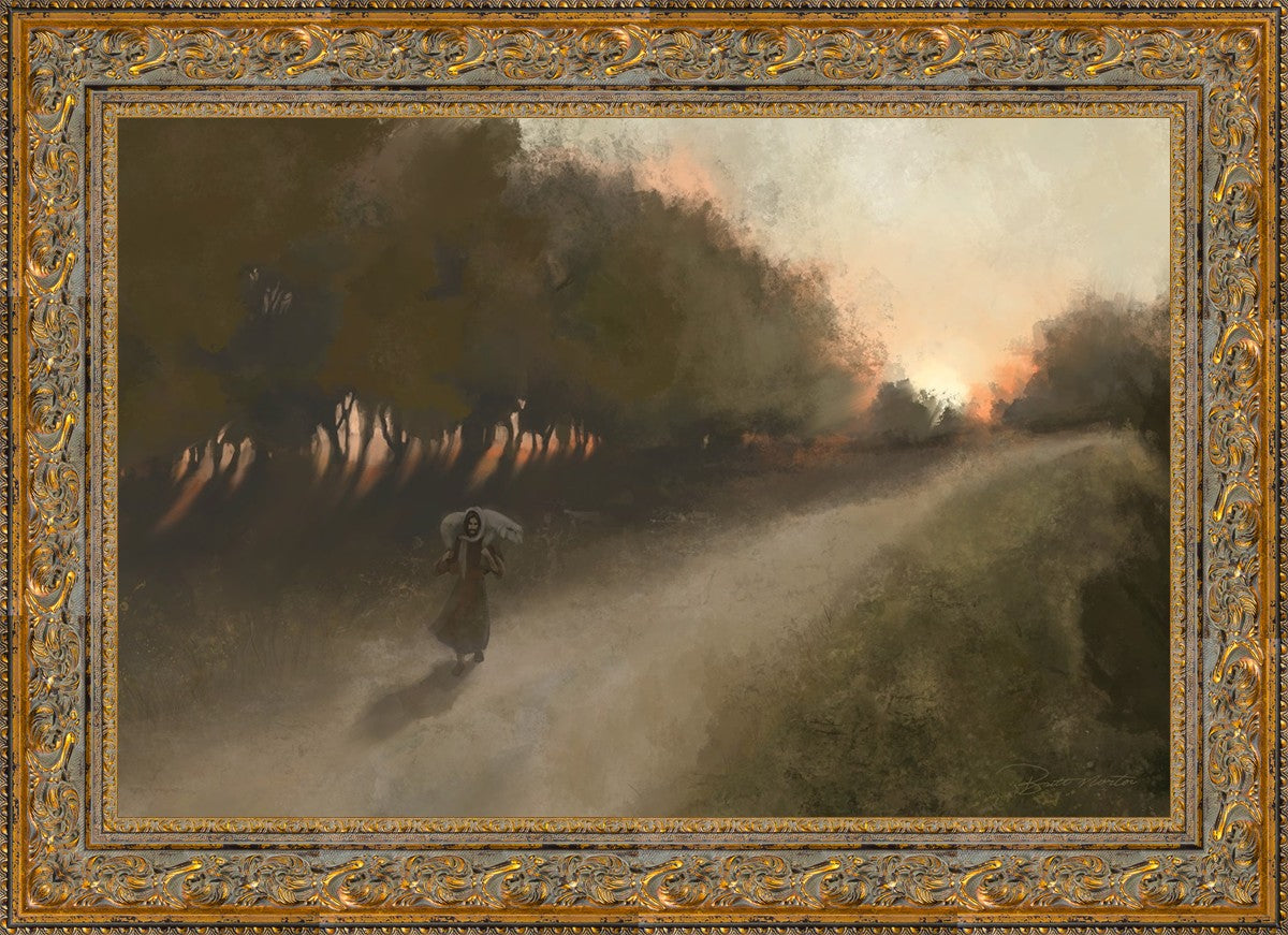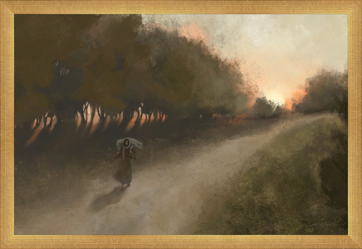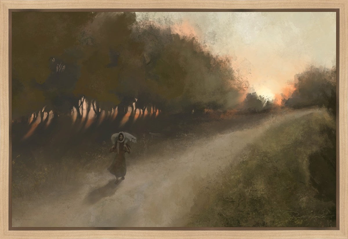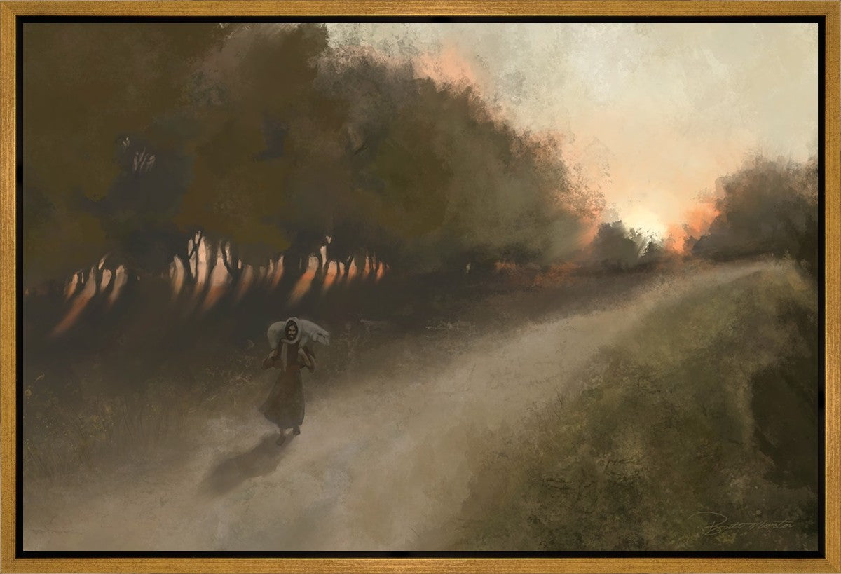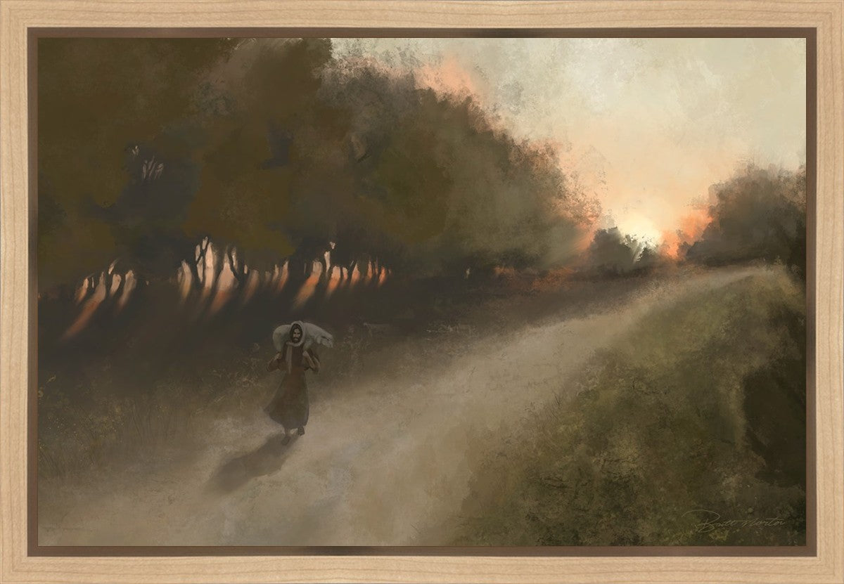 Inspired by the New Testament parable of the Lost Sheep, this piece is a reminder that Christ leaves the 99 the search for the one. This piece depicts the Good Shepherd after a long day of searching, coming home with his precious lost sheep. This piece was created during some scary and potentially life threatening pregnancy complications the artist experienced with her second daughter . The dark, moody colors echo the fear and uncertainty the artist had to navigate while also reconciling her faith that the situation was in God’s hands. When the artist completed the piece, it was a confirmation to her that like the sheep, Christ would carry her through this.
