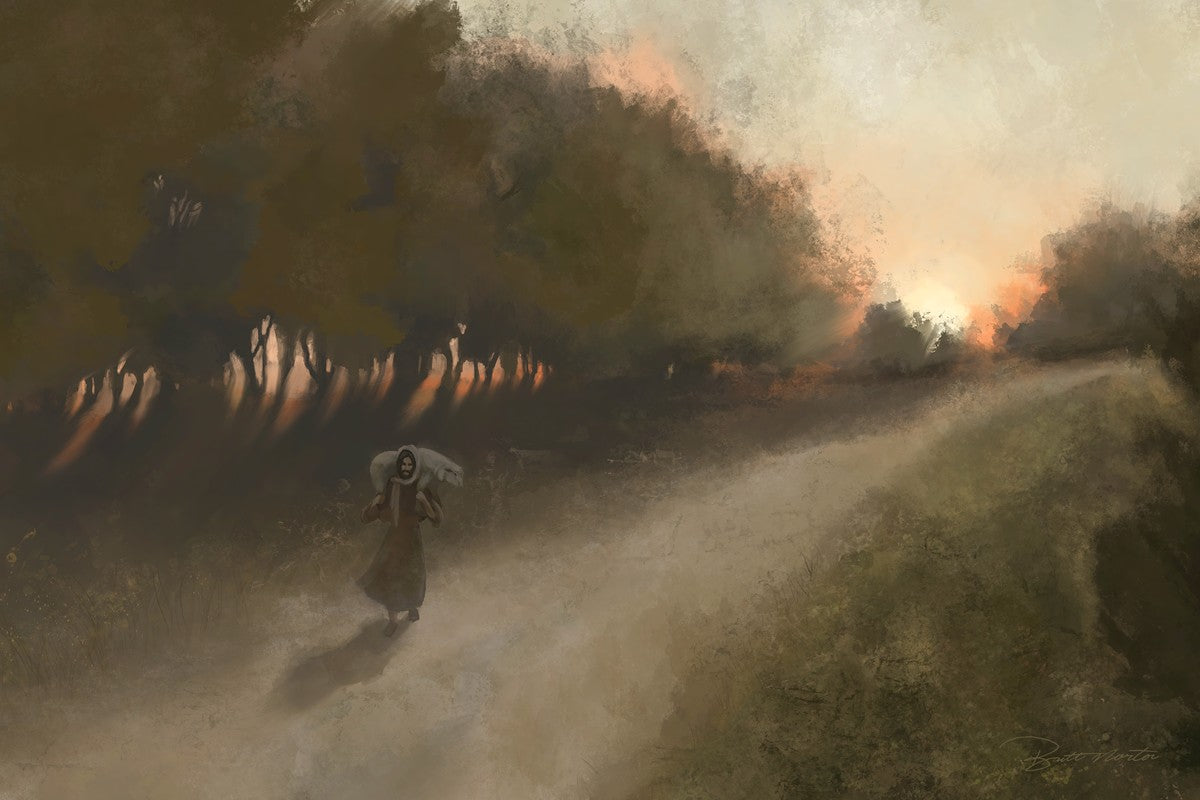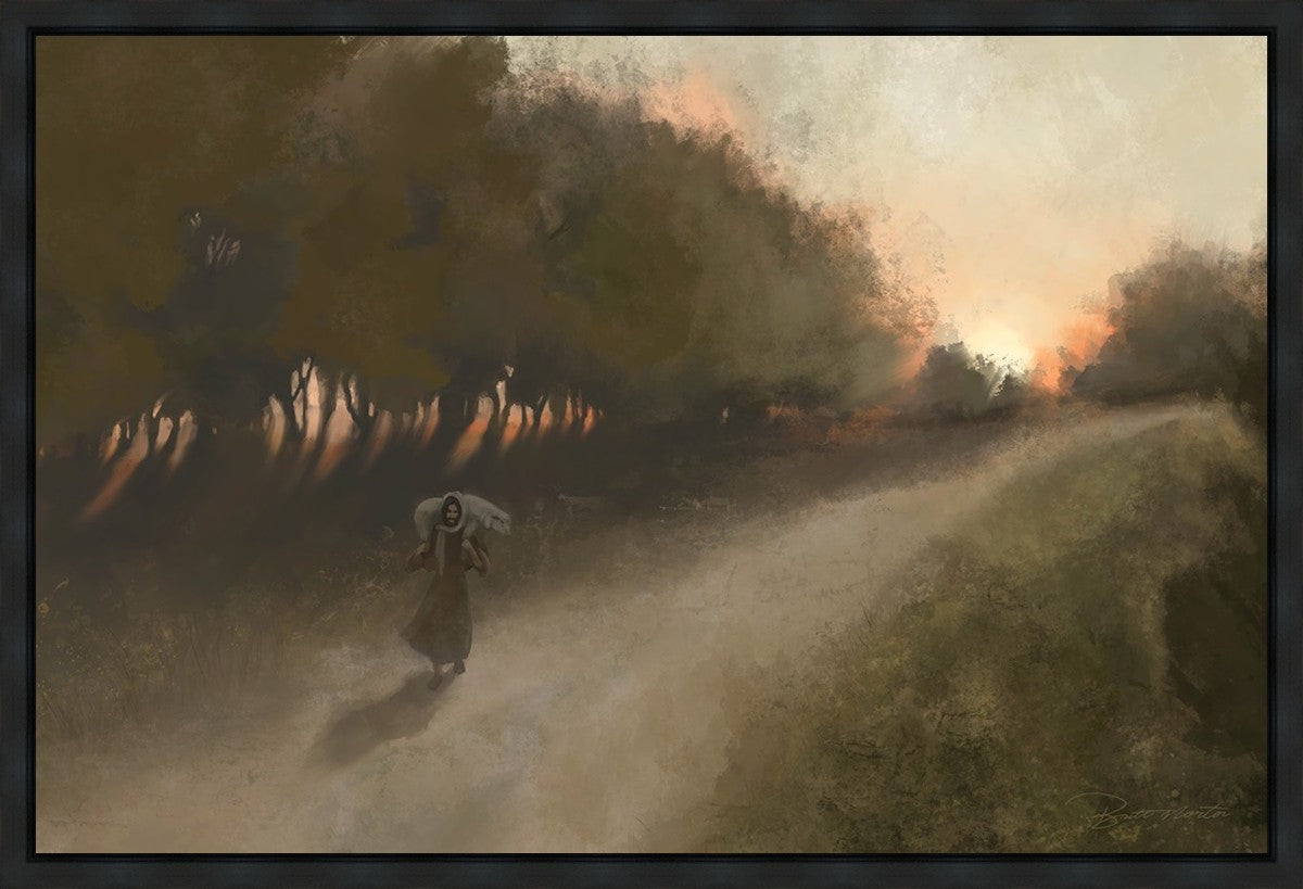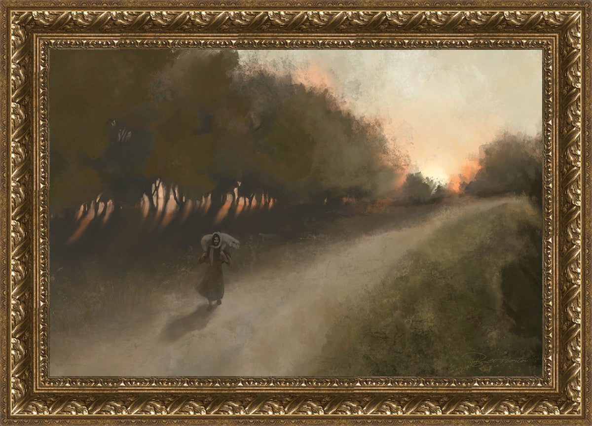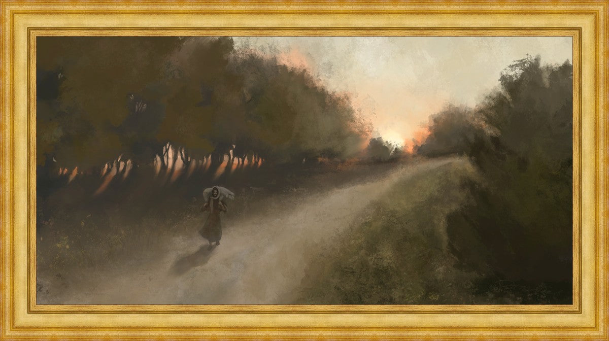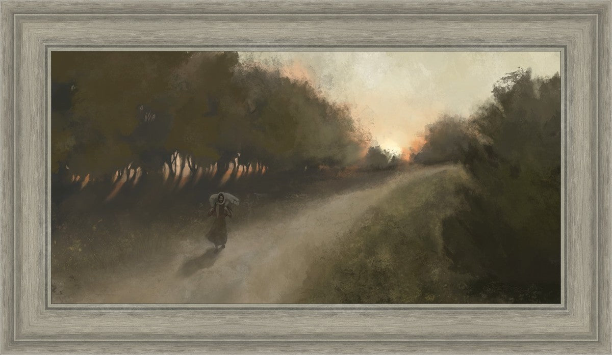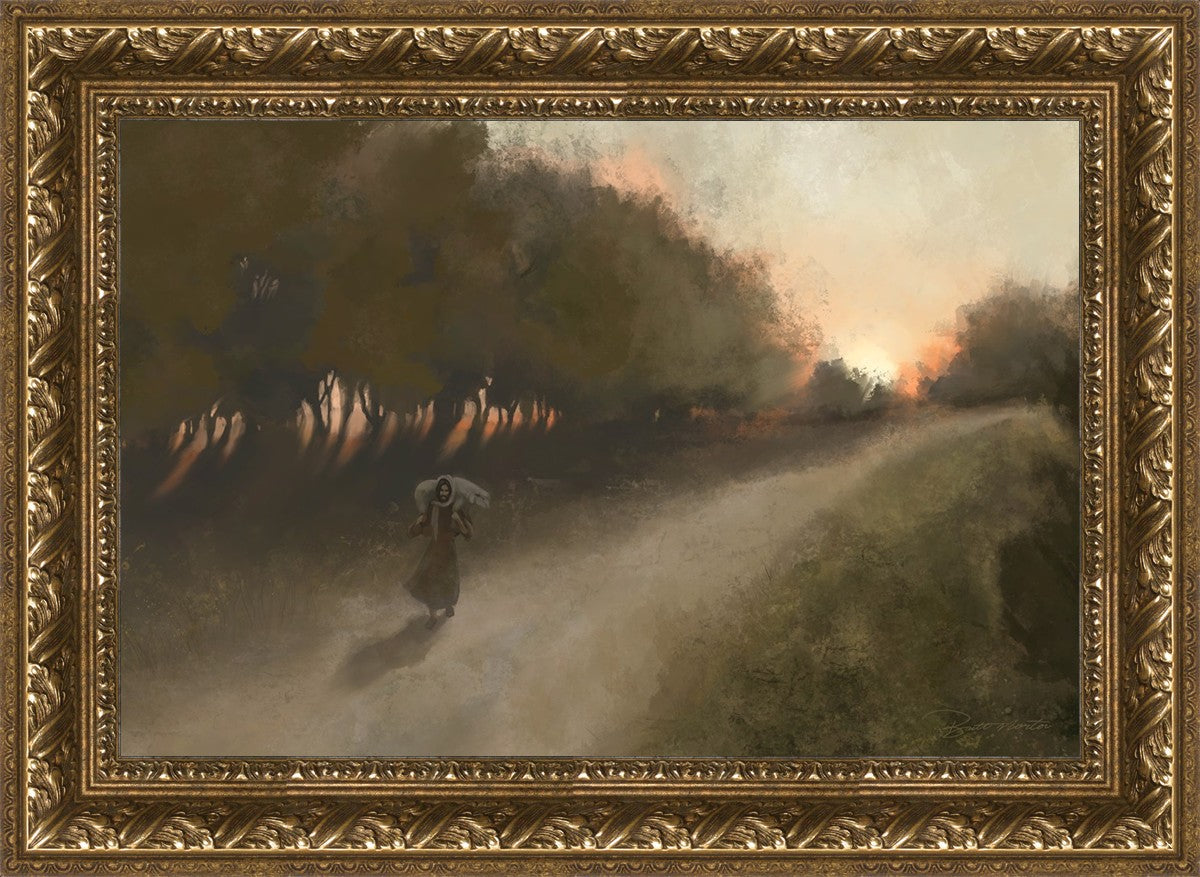 Inspired by the New Testament parable of the Lost Sheep, this piece is a reminder that Christ leaves the 99 the search for the one. This piece depicts the Good Shepherd after a long day of searching, coming home with his precious lost sheep. This piece was created during some scary and potentially life threatening pregnancy complications the artist experienced with her second daughter . The dark, moody colors echo the fear and uncertainty the artist had to navigate while also reconciling her faith that the situation was in God’s hands. When the artist completed the piece, it was a confirmation to her that like the sheep, Christ would carry her through this.