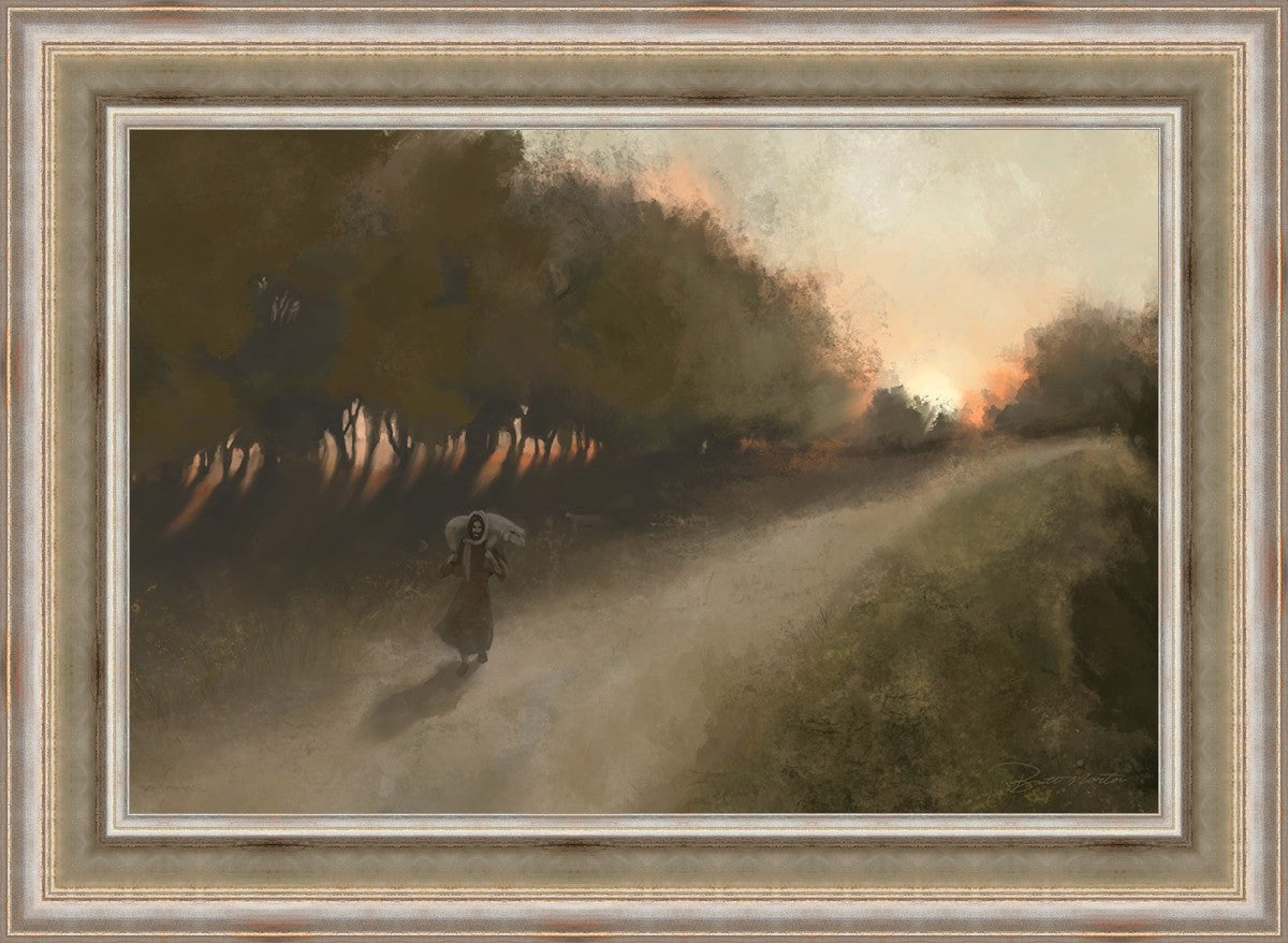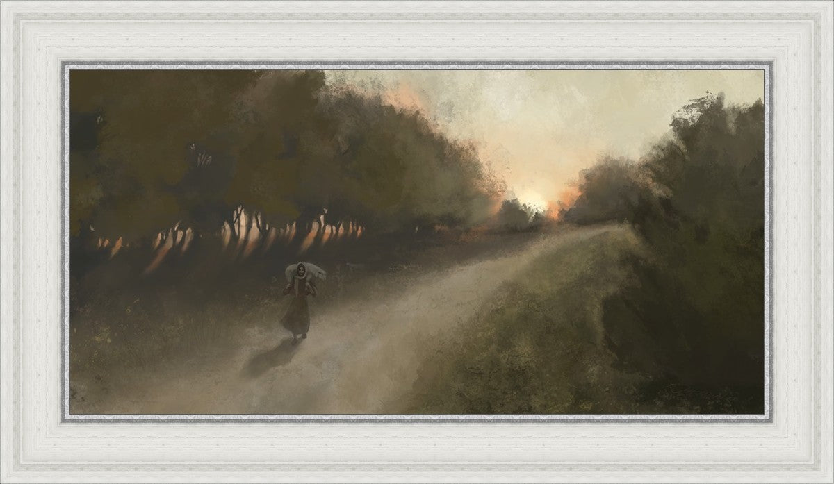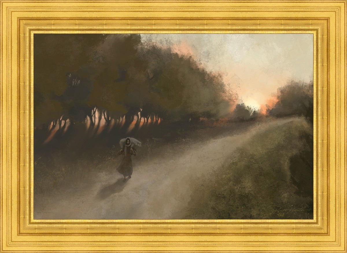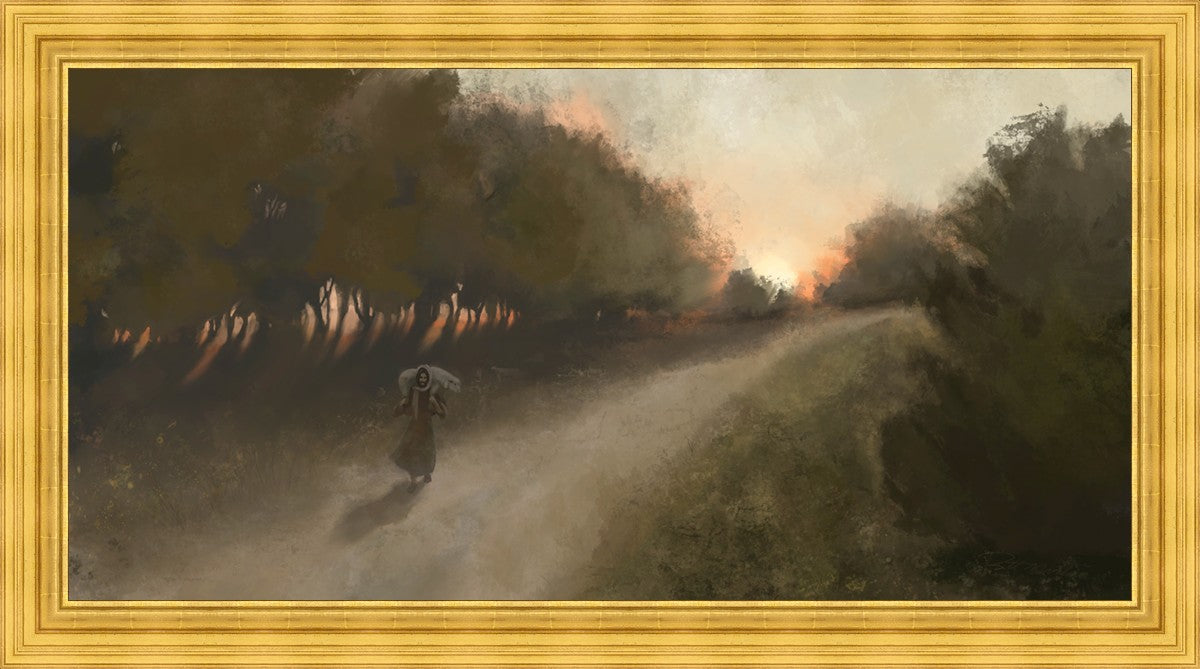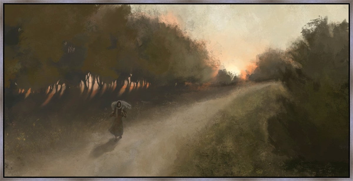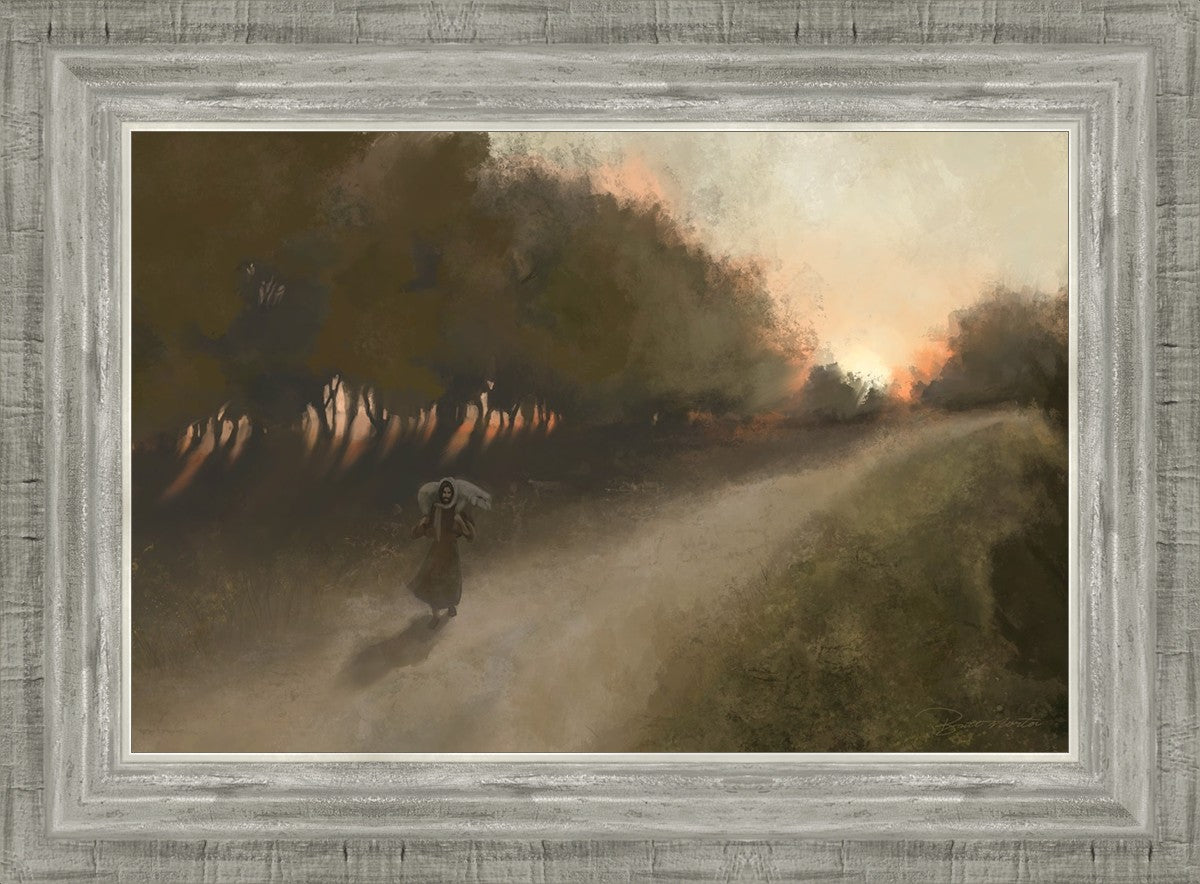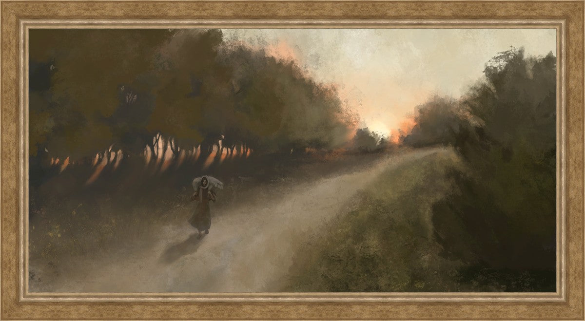 Inspired by the New Testament parable of the Lost Sheep, this piece is a reminder that Christ leaves the 99 the search for the one. This piece depicts the Good Shepherd after a long day of searching, coming home with his precious lost sheep. This piece was created during some scary and potentially life threatening pregnancy complications the artist experienced with her second daughter . The dark, moody colors echo the fear and uncertainty the artist had to navigate while also reconciling her faith that the situation was in God’s hands. When the artist completed the piece, it was a confirmation to her that like the sheep, Christ would carry her through this.