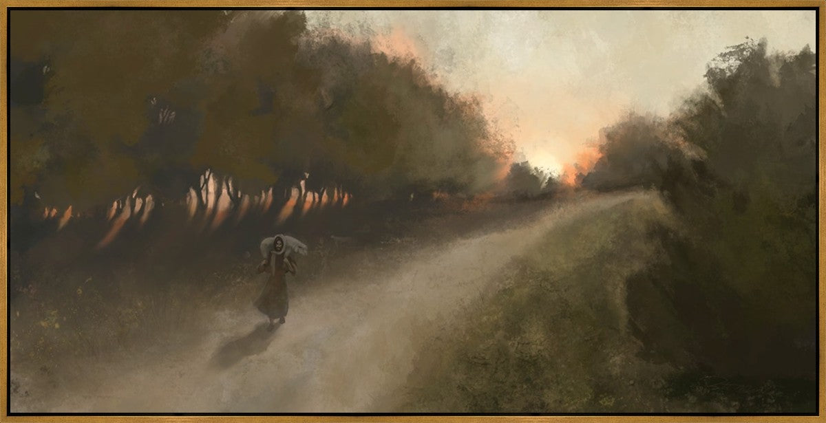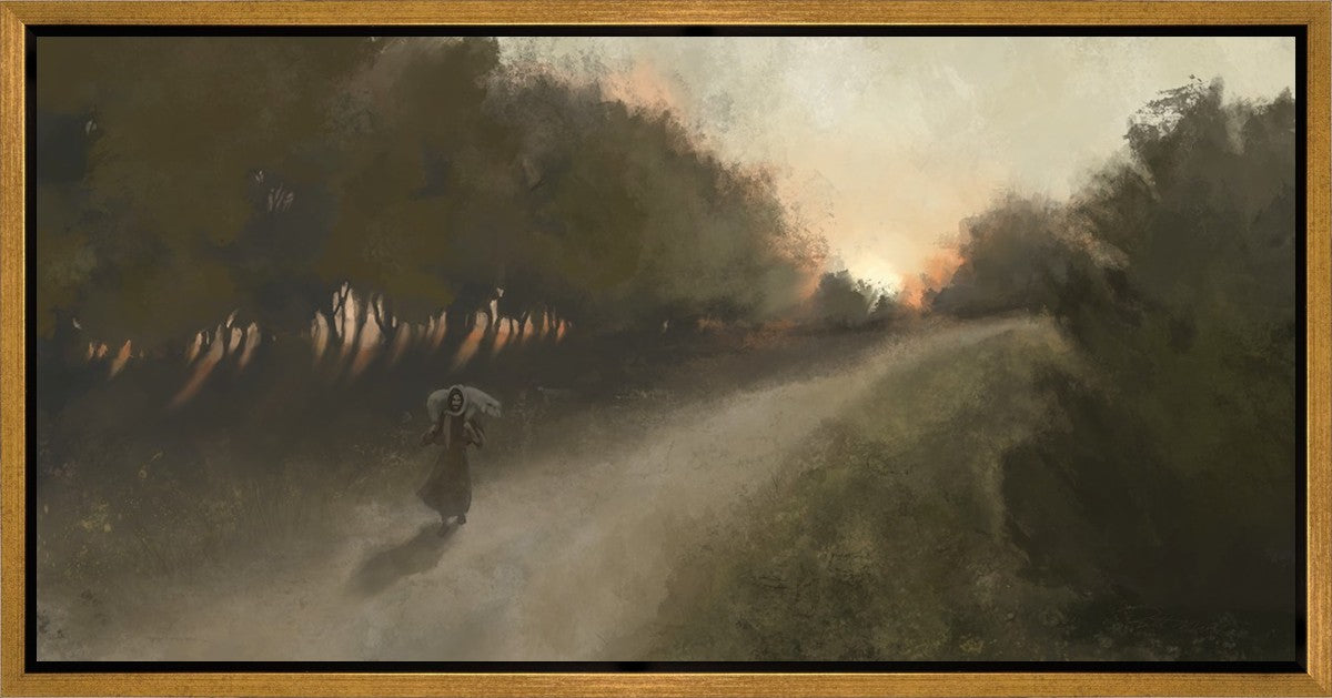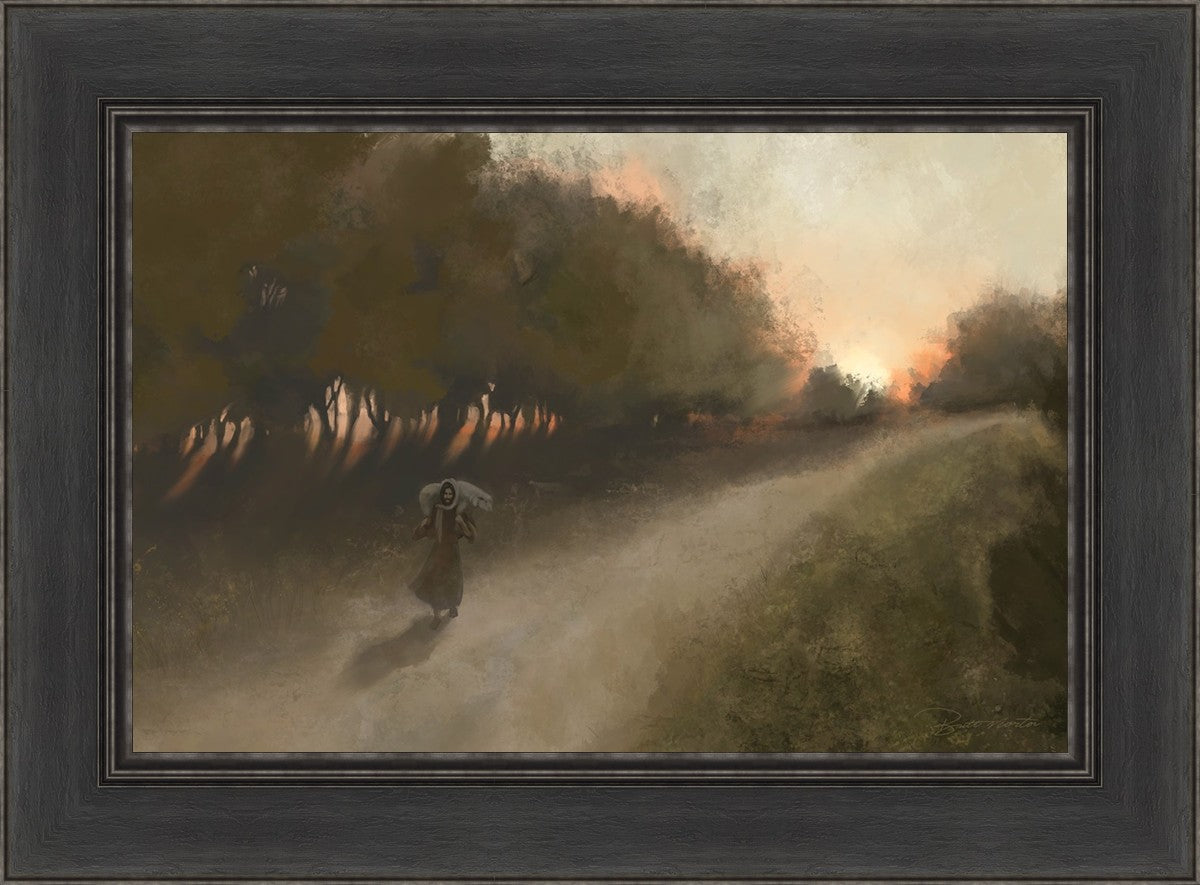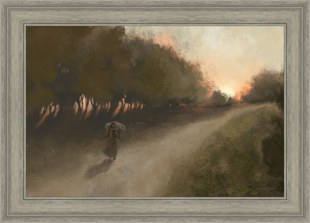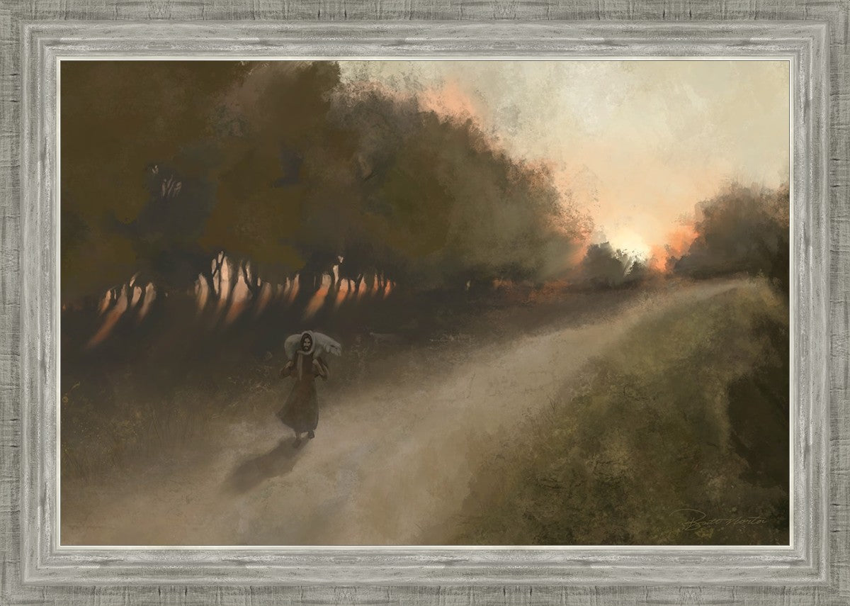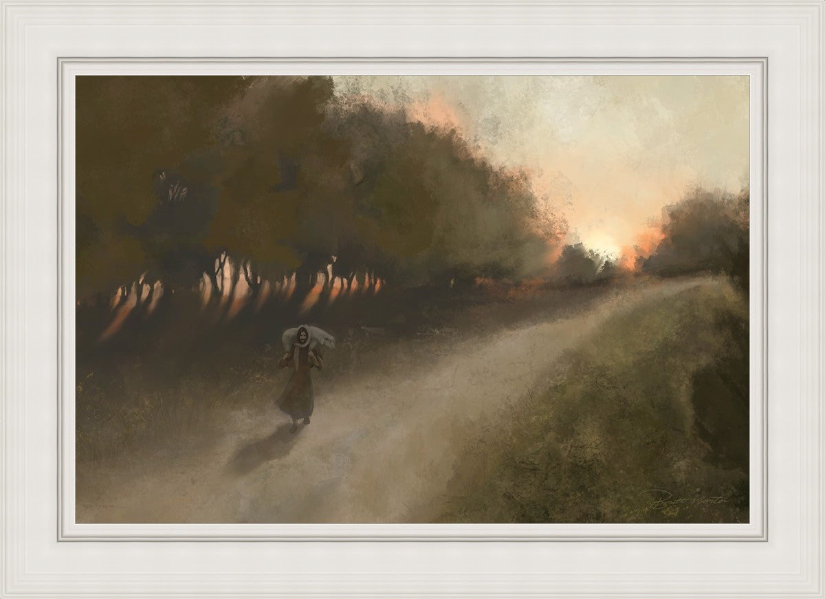 Inspired by the New Testament parable of the Lost Sheep, this piece is a reminder that Christ leaves the 99 the search for the one. This piece depicts the Good Shepherd after a long day of searching, coming home with his precious lost sheep. This piece was created during some scary and potentially life threatening pregnancy complications the artist experienced with her second daughter . The dark, moody colors echo the fear and uncertainty the artist had to navigate while also reconciling her faith that the situation was in God’s hands. When the artist completed the piece, it was a confirmation to her that like the sheep, Christ would carry her through this.