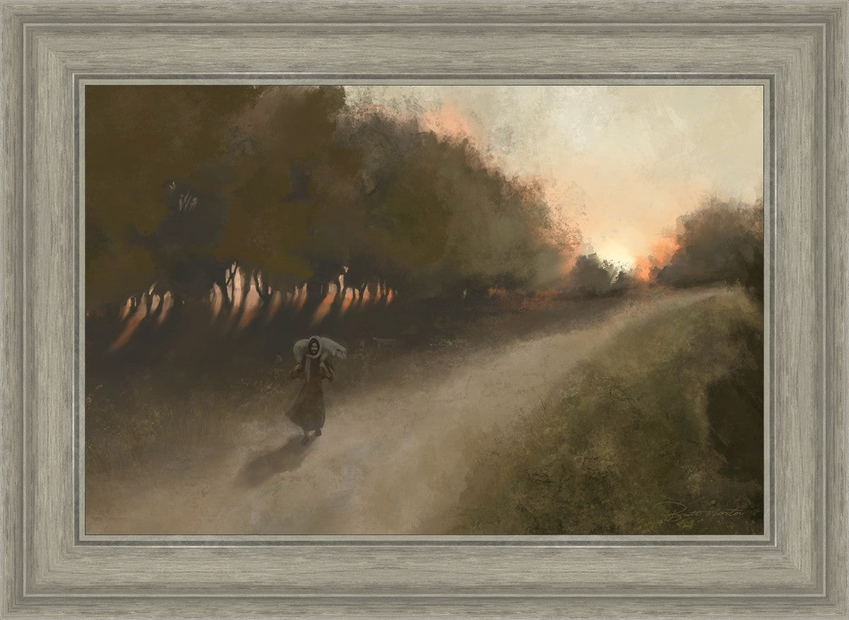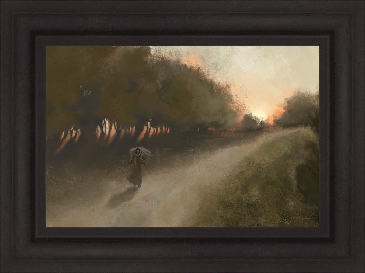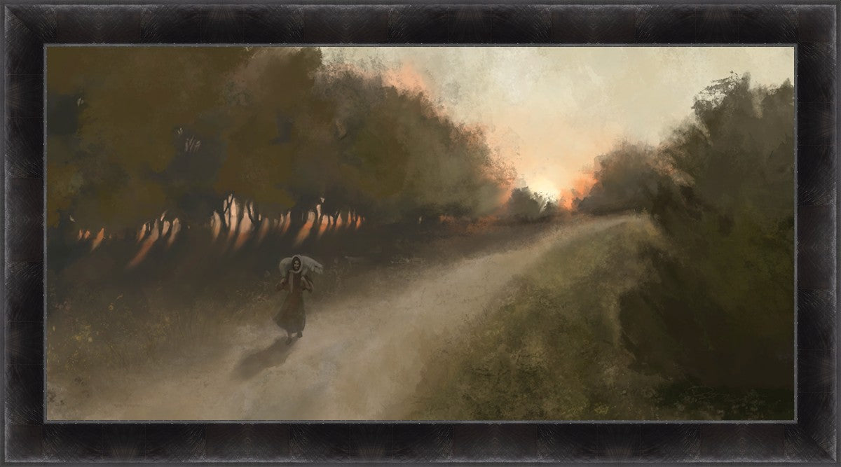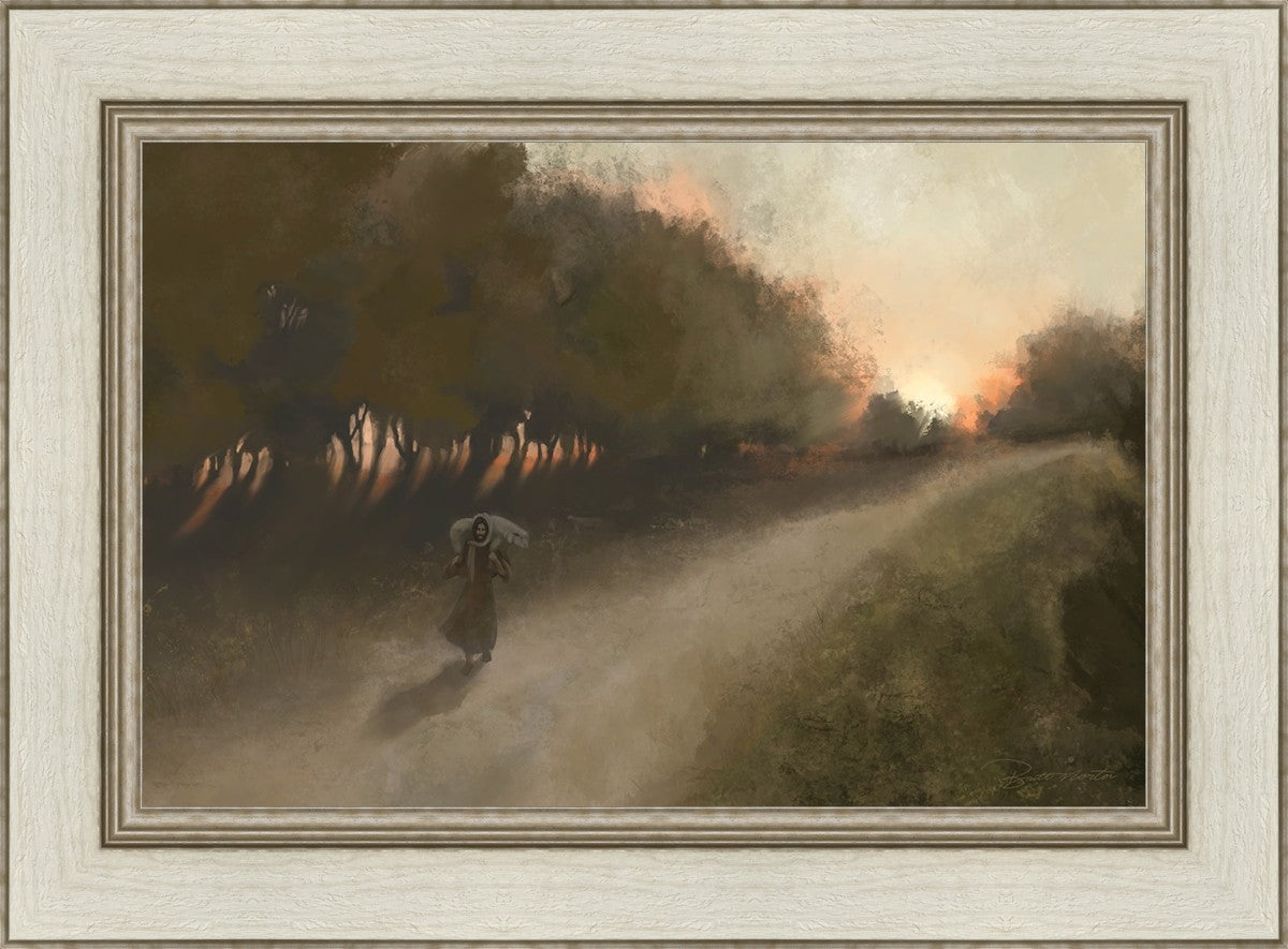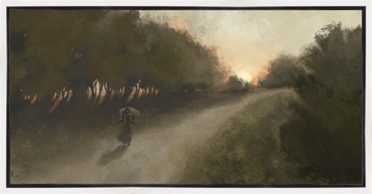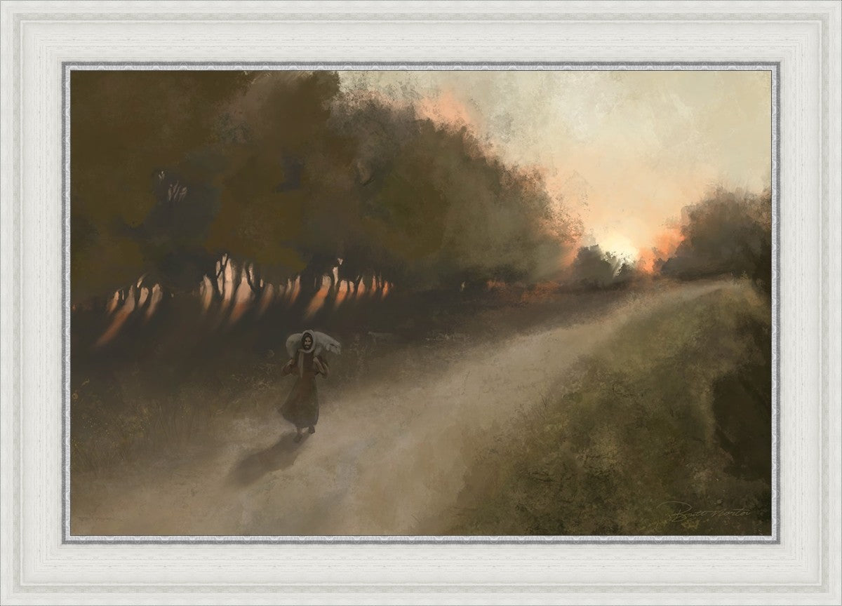 Inspired by the New Testament parable of the Lost Sheep, this piece is a reminder that Christ leaves the 99 the search for the one. This piece depicts the Good Shepherd after a long day of searching, coming home with his precious lost sheep. This piece was created during some scary and potentially life threatening pregnancy complications the artist experienced with her second daughter . The dark, moody colors echo the fear and uncertainty the artist had to navigate while also reconciling her faith that the situation was in God’s hands. When the artist completed the piece, it was a confirmation to her that like the sheep, Christ would carry her through this.
