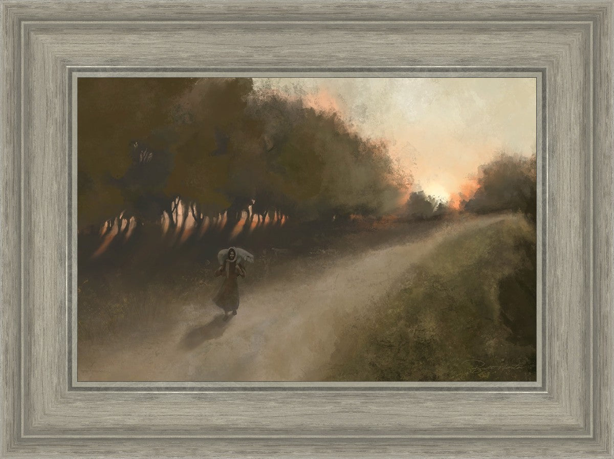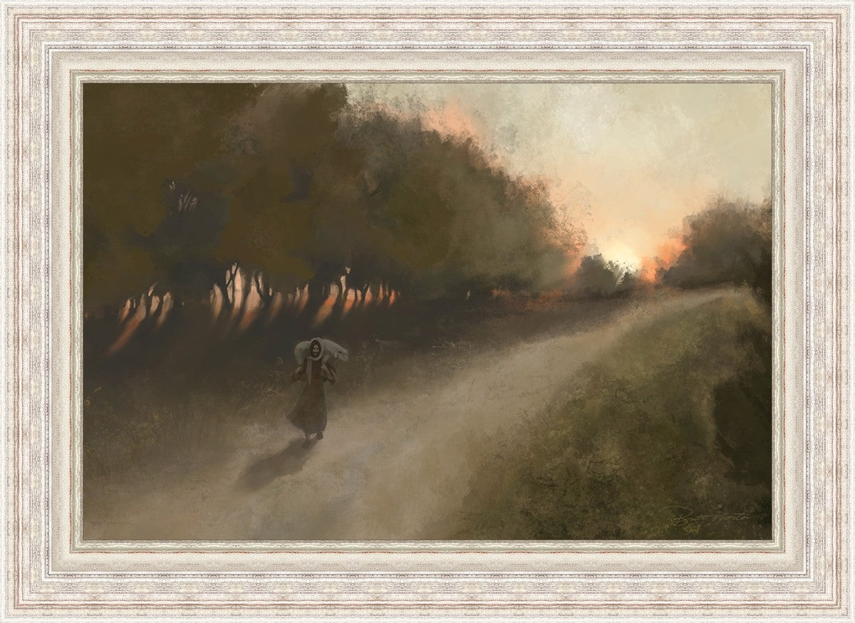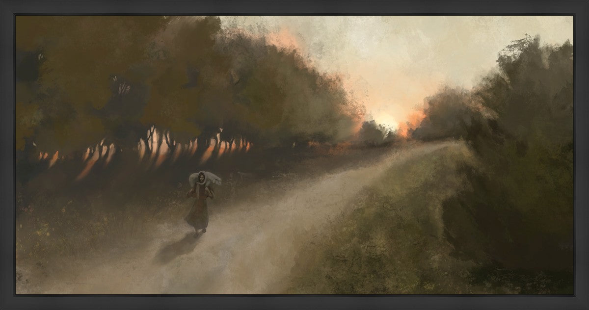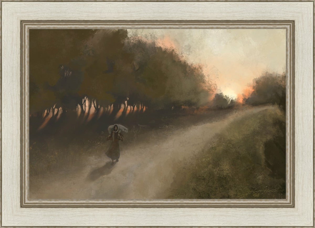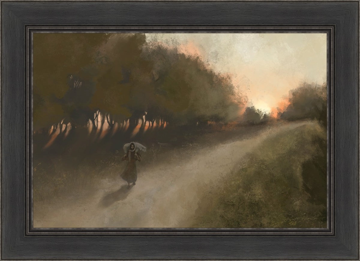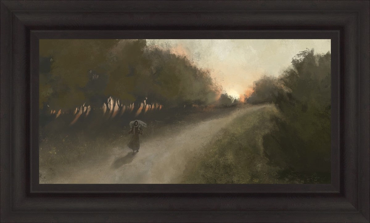 Inspired by the New Testament parable of the Lost Sheep, this piece is a reminder that Christ leaves the 99 the search for the one. This piece depicts the Good Shepherd after a long day of searching, coming home with his precious lost sheep. This piece was created during some scary and potentially life threatening pregnancy complications the artist experienced with her second daughter . The dark, moody colors echo the fear and uncertainty the artist had to navigate while also reconciling her faith that the situation was in God’s hands. When the artist completed the piece, it was a confirmation to her that like the sheep, Christ would carry her through this.