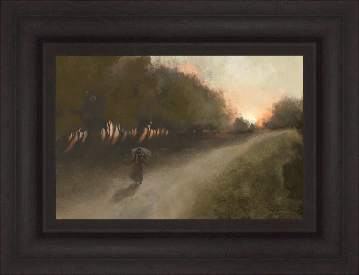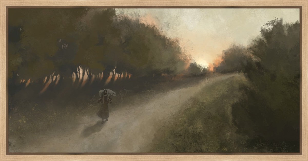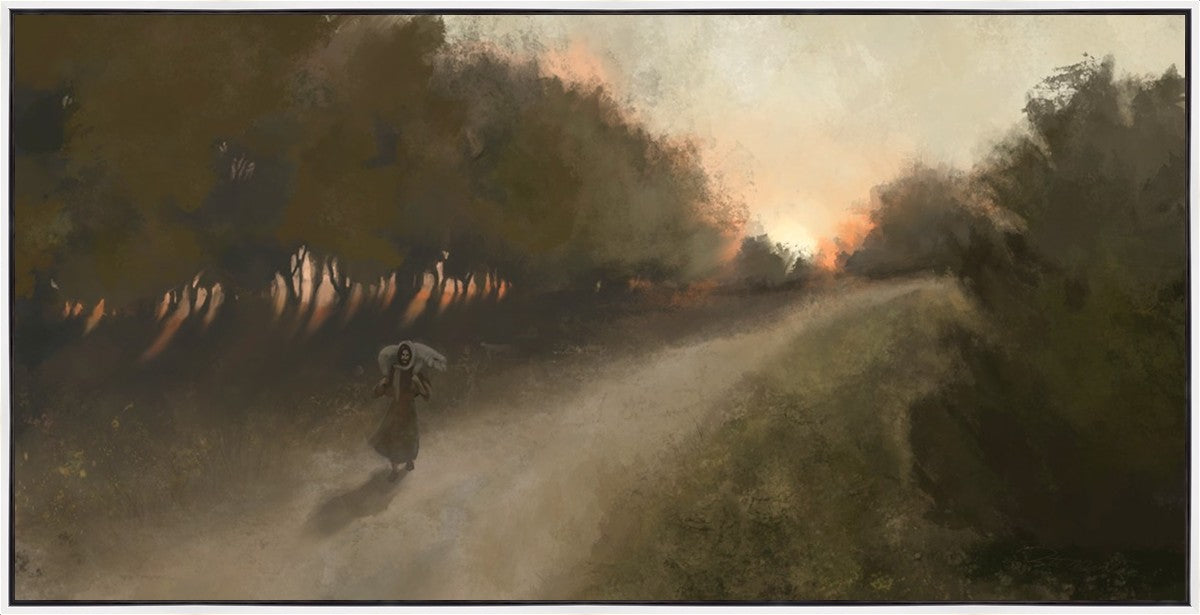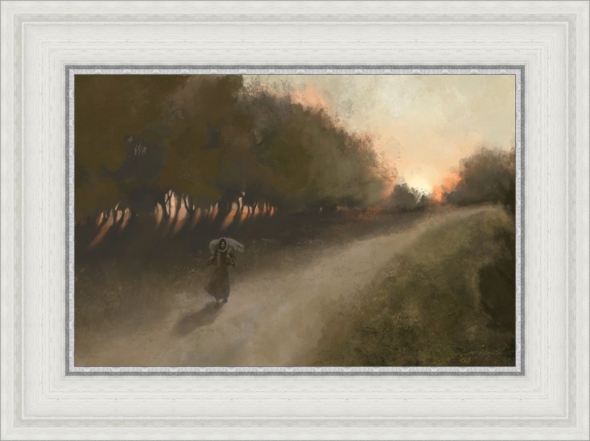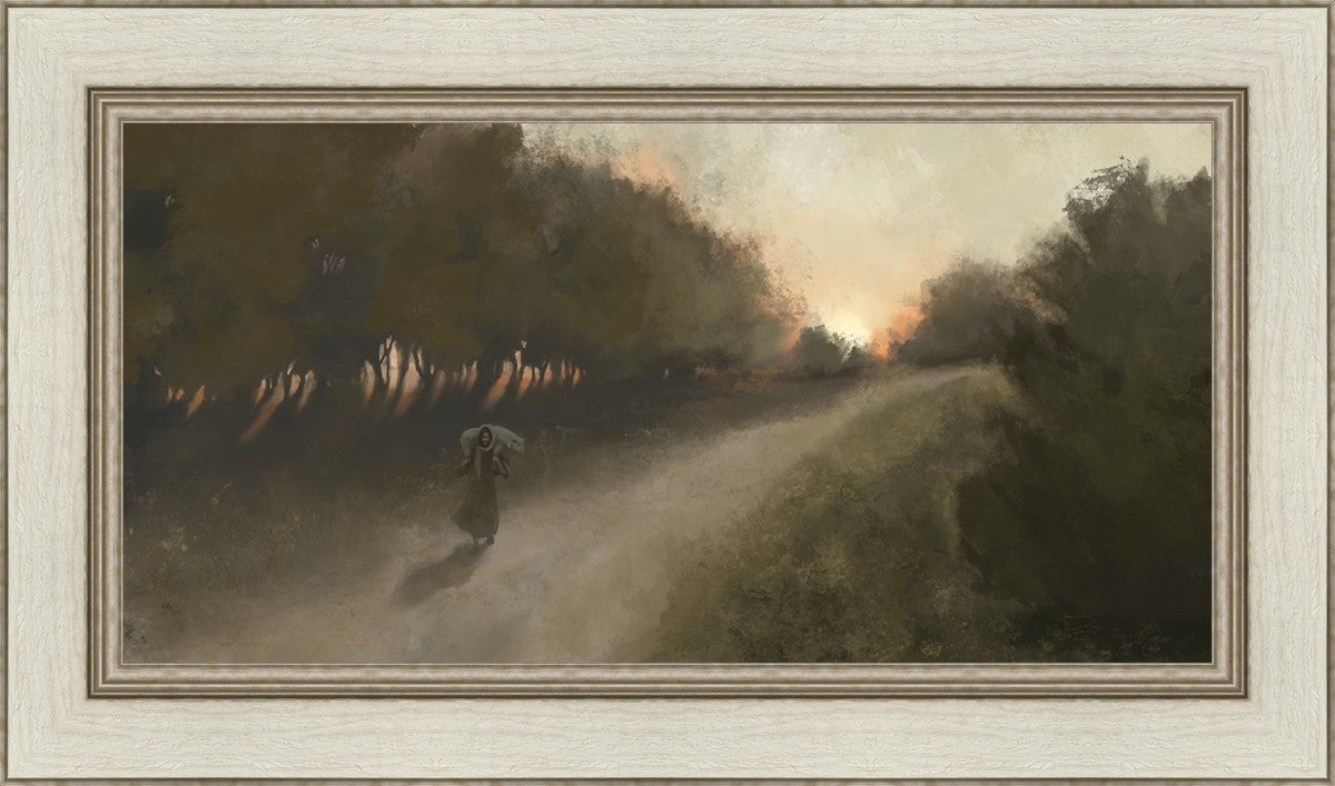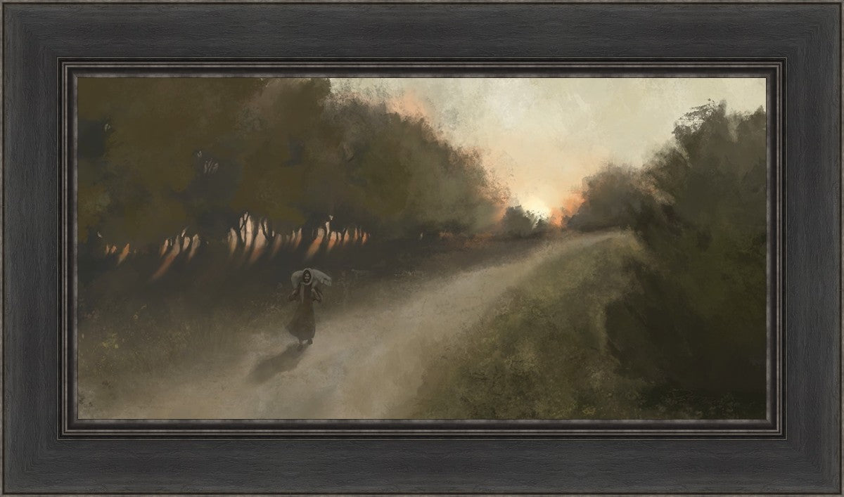 Inspired by the New Testament parable of the Lost Sheep, this piece is a reminder that Christ leaves the 99 the search for the one. This piece depicts the Good Shepherd after a long day of searching, coming home with his precious lost sheep. This piece was created during some scary and potentially life threatening pregnancy complications the artist experienced with her second daughter . The dark, moody colors echo the fear and uncertainty the artist had to navigate while also reconciling her faith that the situation was in God’s hands. When the artist completed the piece, it was a confirmation to her that like the sheep, Christ would carry her through this.