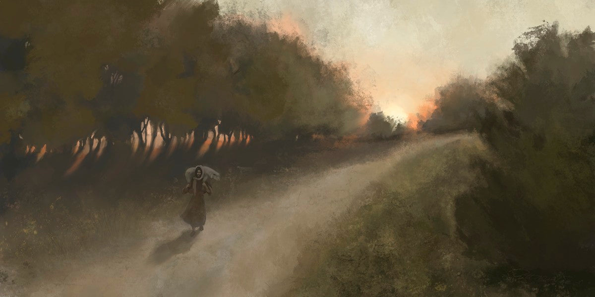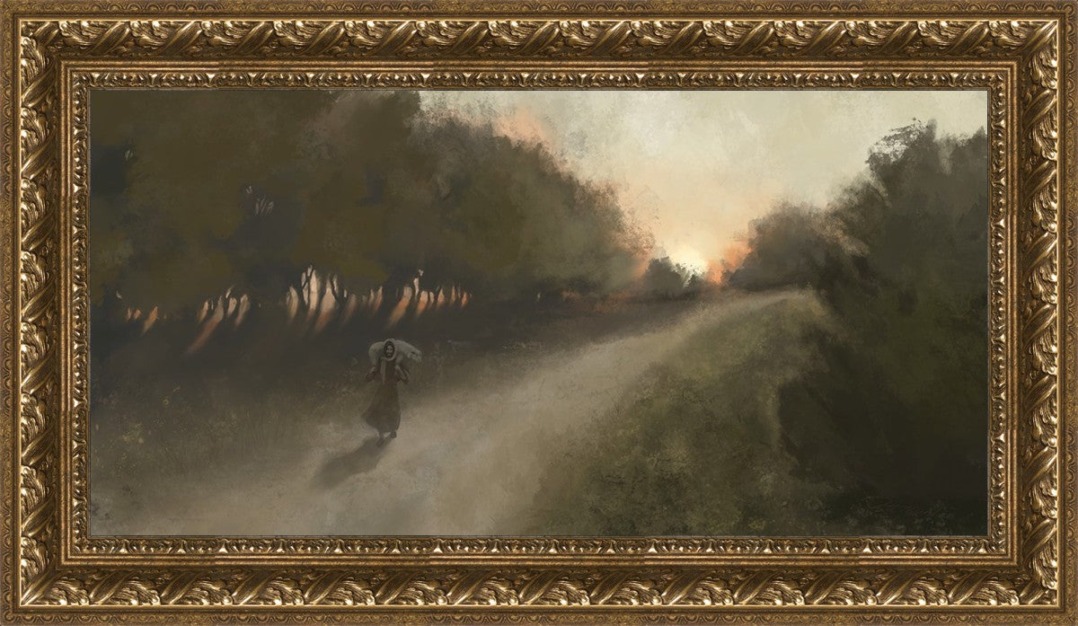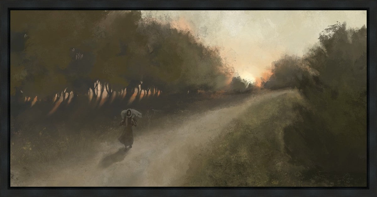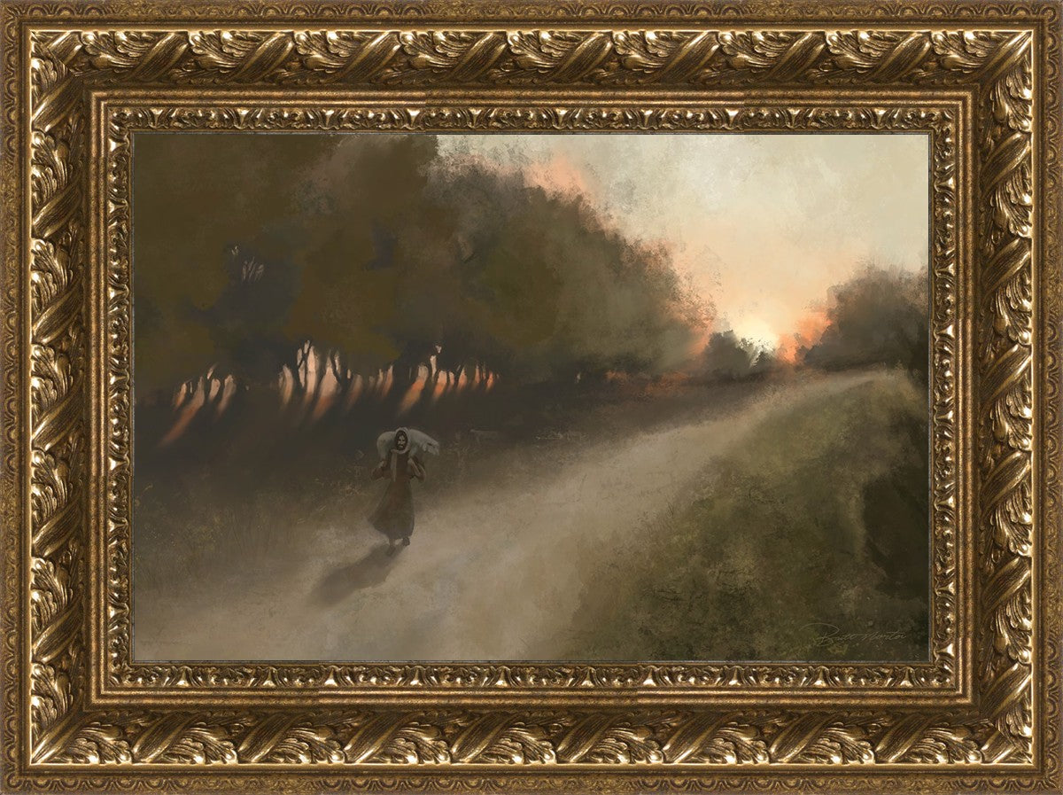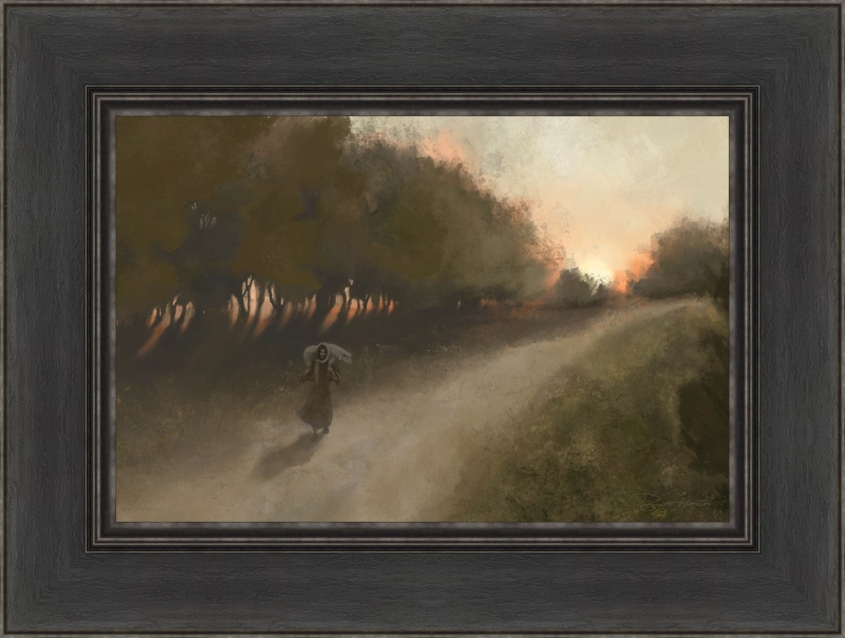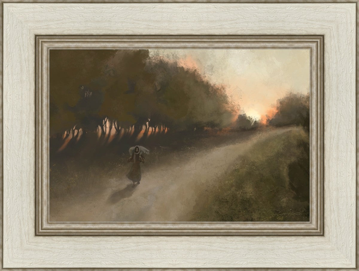 Inspired by the New Testament parable of the Lost Sheep, this piece is a reminder that Christ leaves the 99 the search for the one. This piece depicts the Good Shepherd after a long day of searching, coming home with his precious lost sheep. This piece was created during some scary and potentially life threatening pregnancy complications the artist experienced with her second daughter . The dark, moody colors echo the fear and uncertainty the artist had to navigate while also reconciling her faith that the situation was in God’s hands. When the artist completed the piece, it was a confirmation to her that like the sheep, Christ would carry her through this.