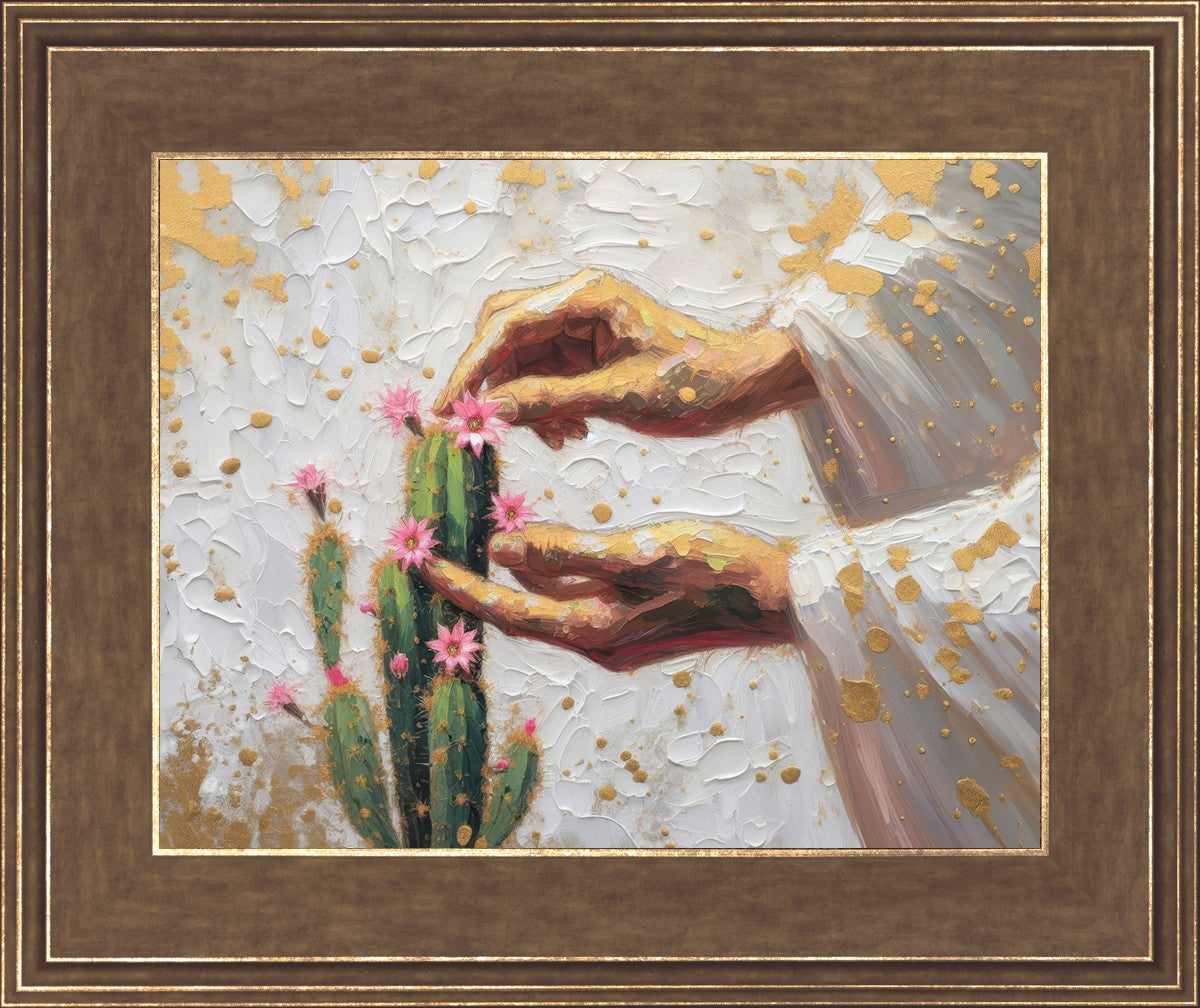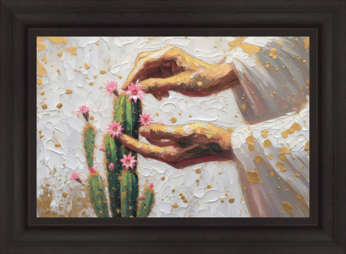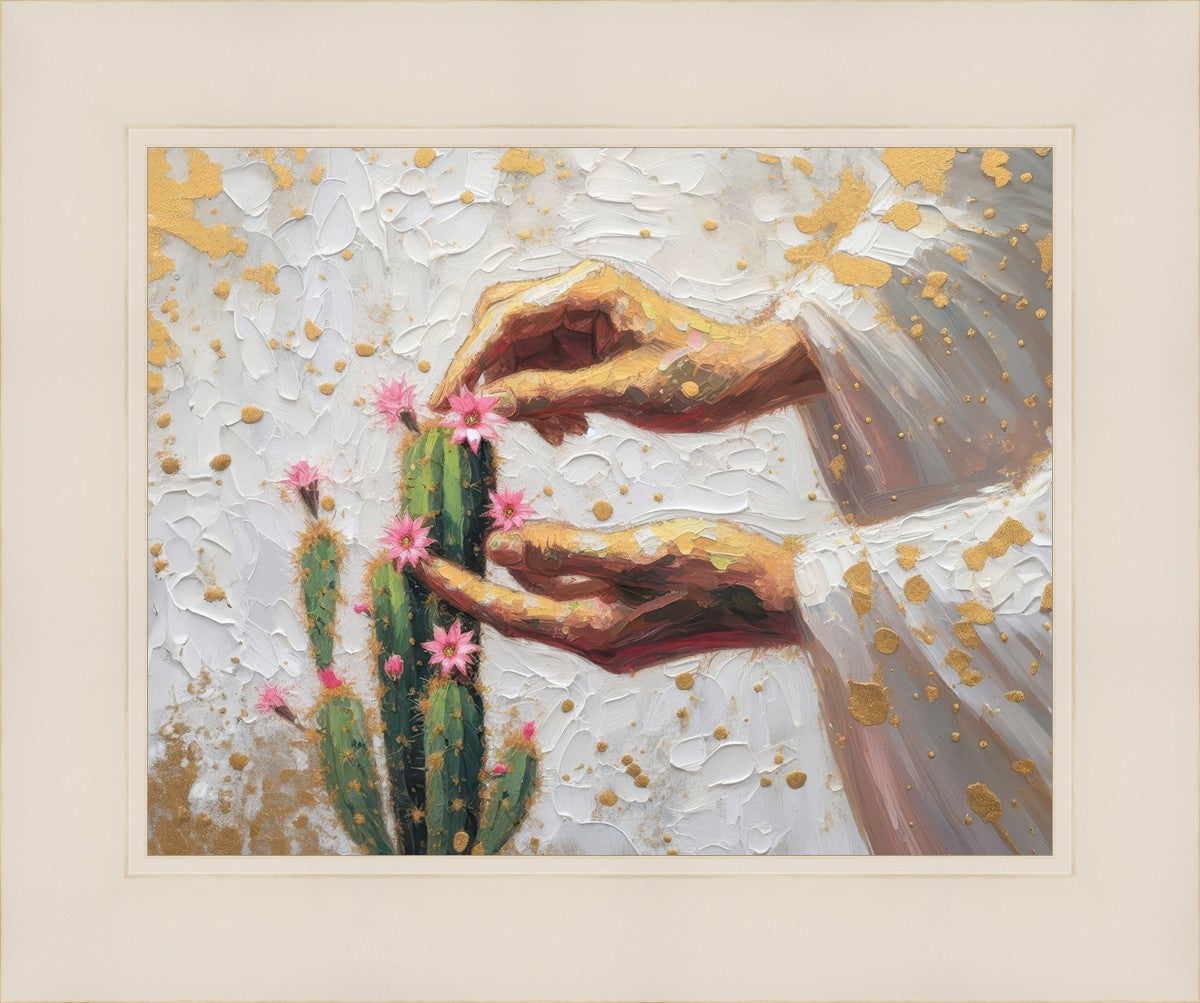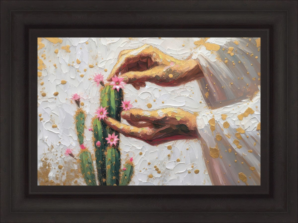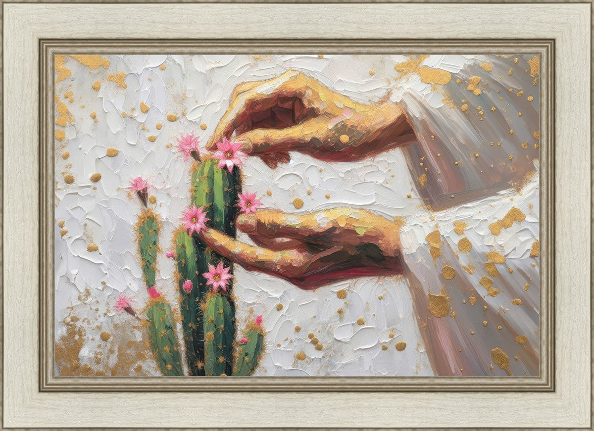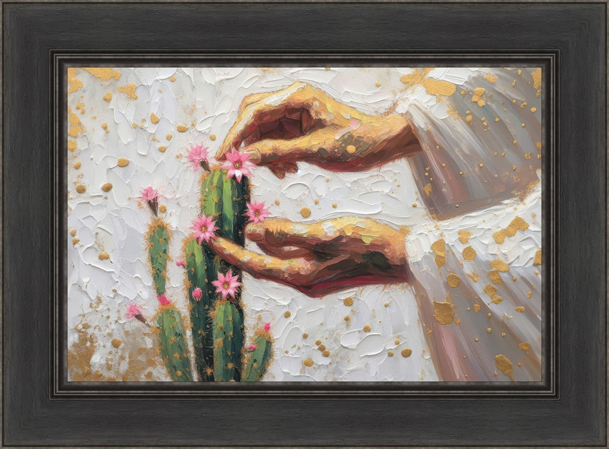 In this piece, we depict Christ as the gentle gardener of our souls. His hands tenderly tend to a cactus—a plant that endures harsh conditions yet continues to grow. Like the cactus, we face trials that may harden us, but under His care, we are nurtured, strengthened, and encouraged to bloom.