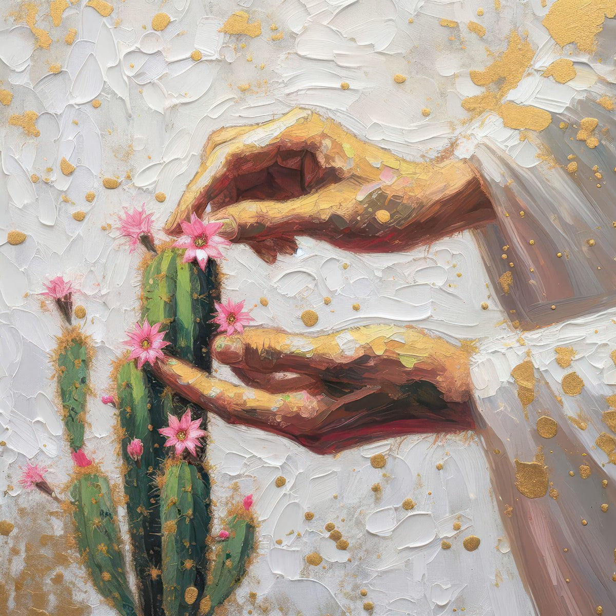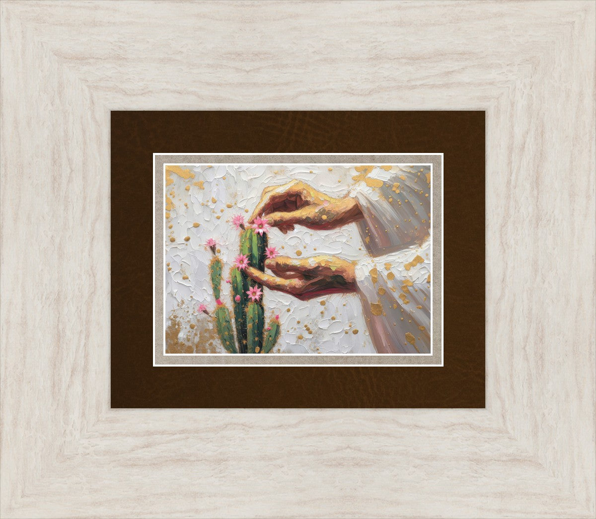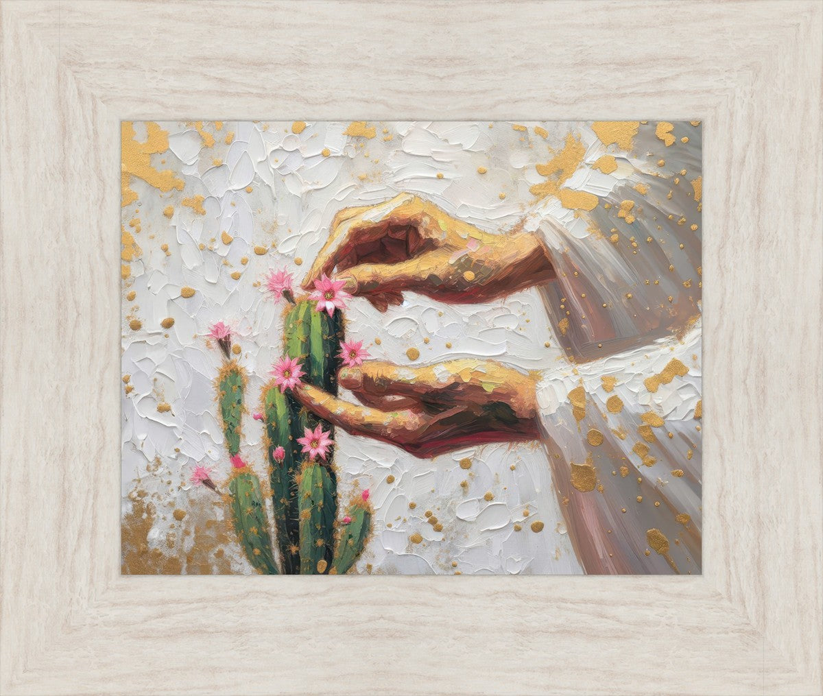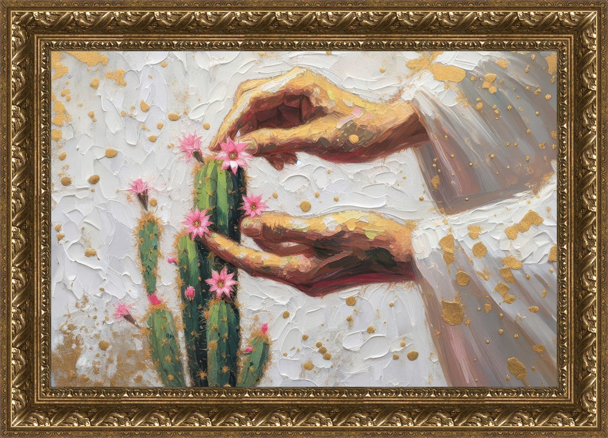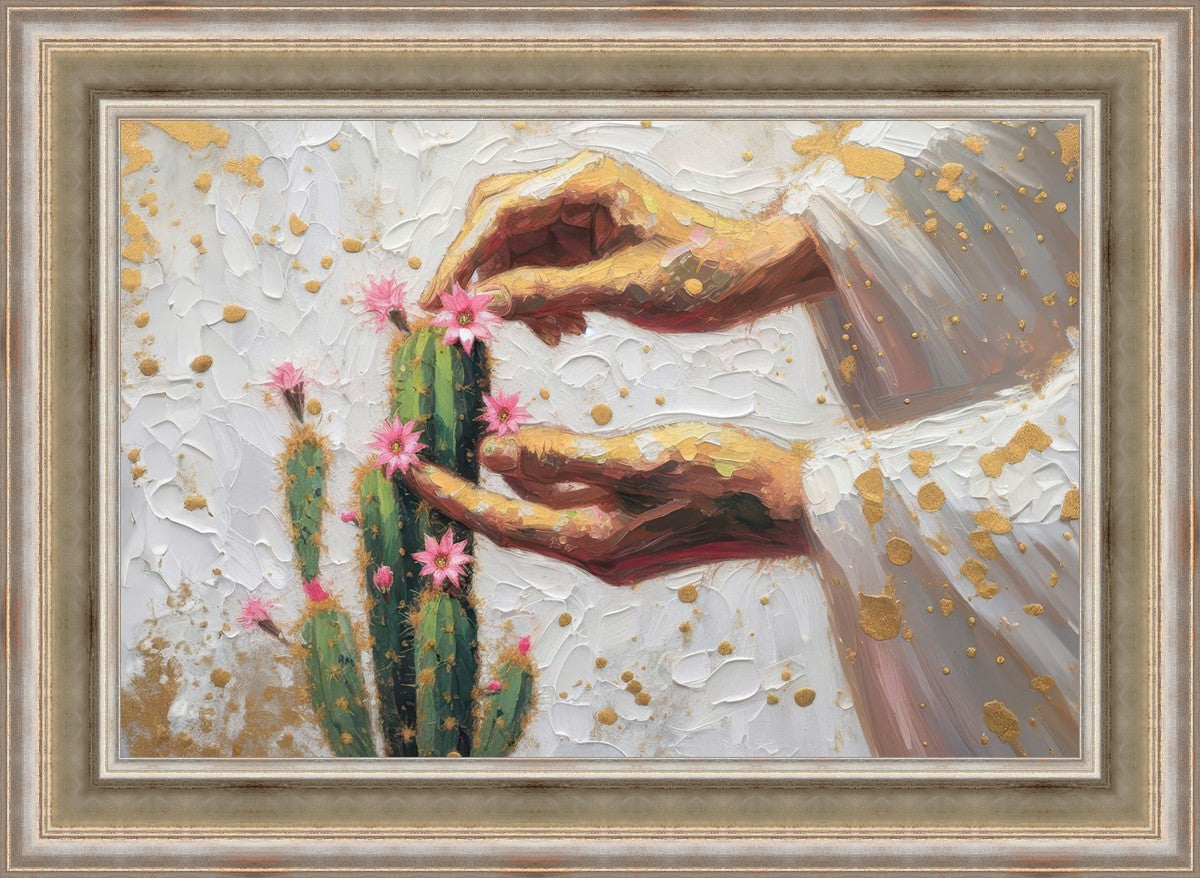 In this piece, we depict Christ as the gentle gardener of our souls. His hands tenderly tend to a cactus—a plant that endures harsh conditions yet continues to grow. Like the cactus, we face trials that may harden us, but under His care, we are nurtured, strengthened, and encouraged to bloom.