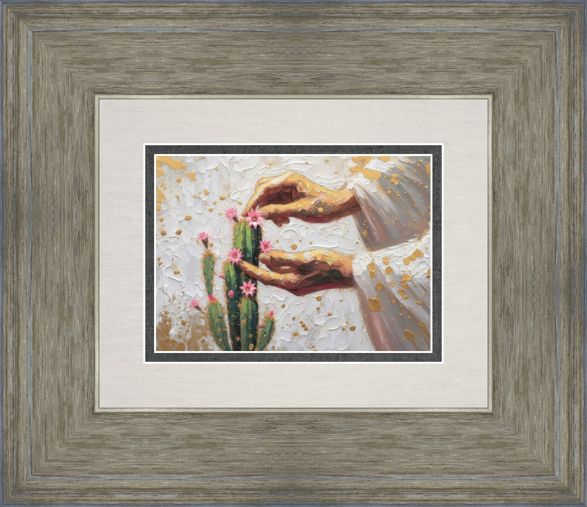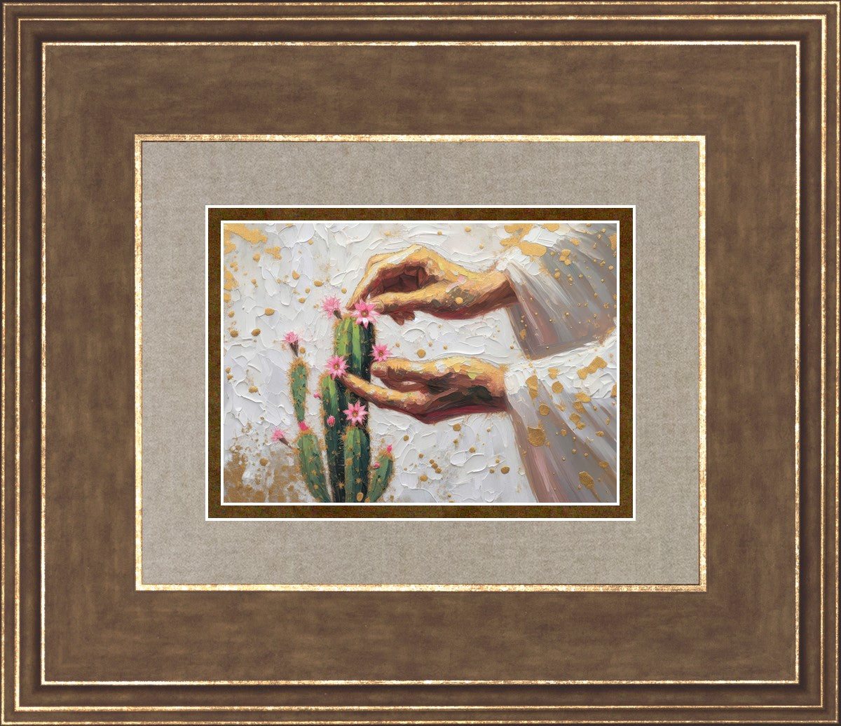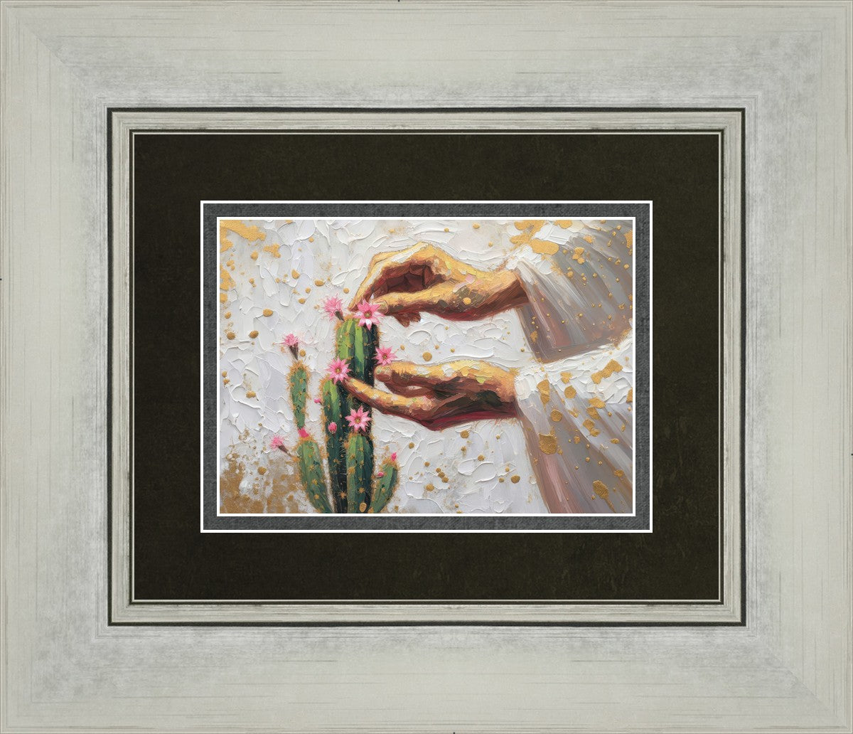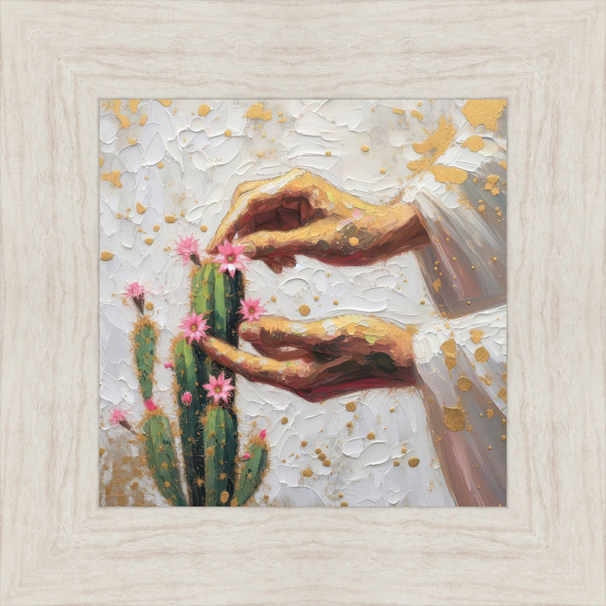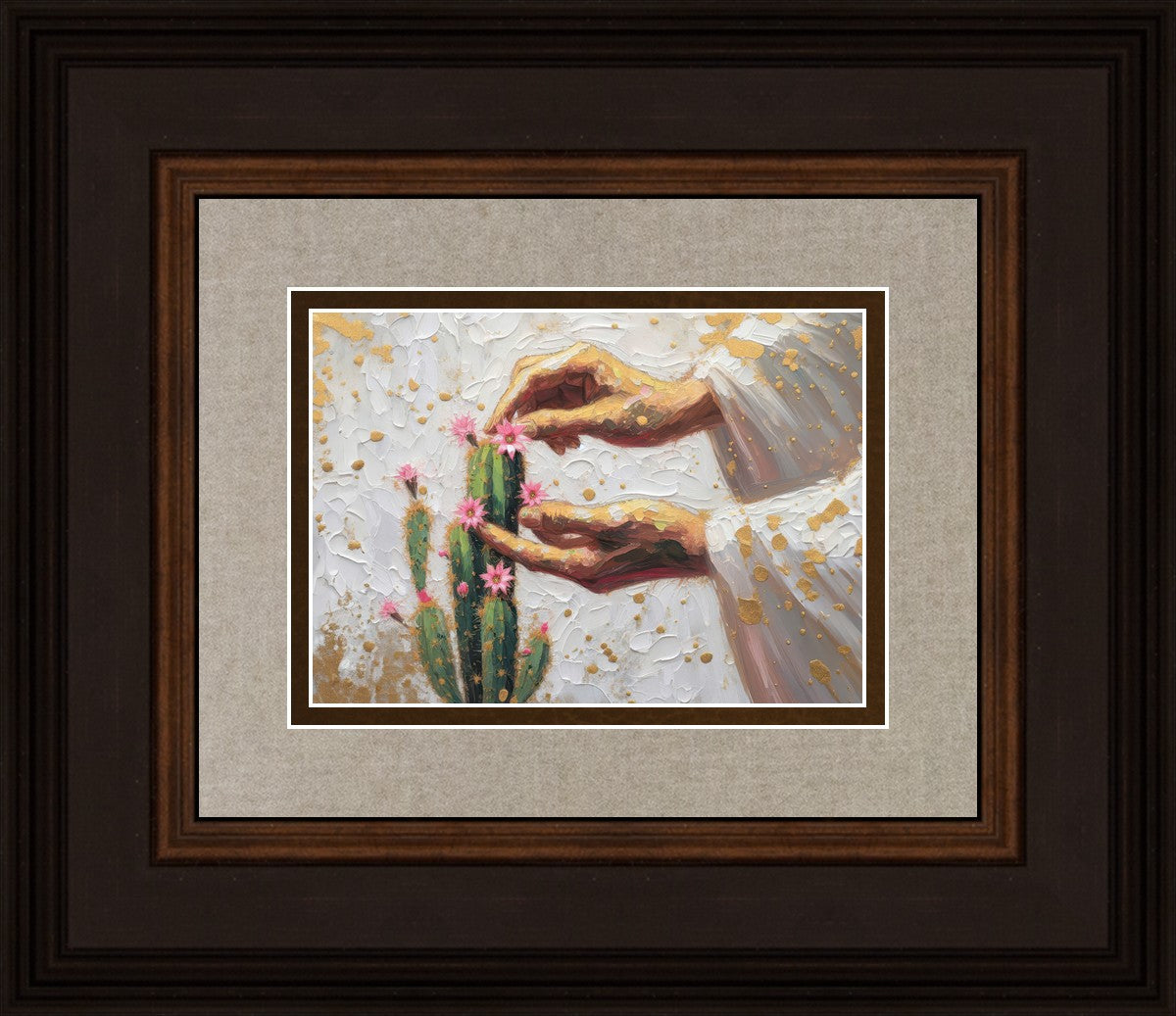 In this piece, we depict Christ as the gentle gardener of our souls. His hands tenderly tend to a cactus—a plant that endures harsh conditions yet continues to grow. Like the cactus, we face trials that may harden us, but under His care, we are nurtured, strengthened, and encouraged to bloom.