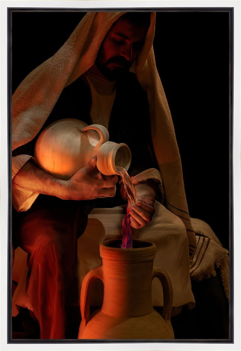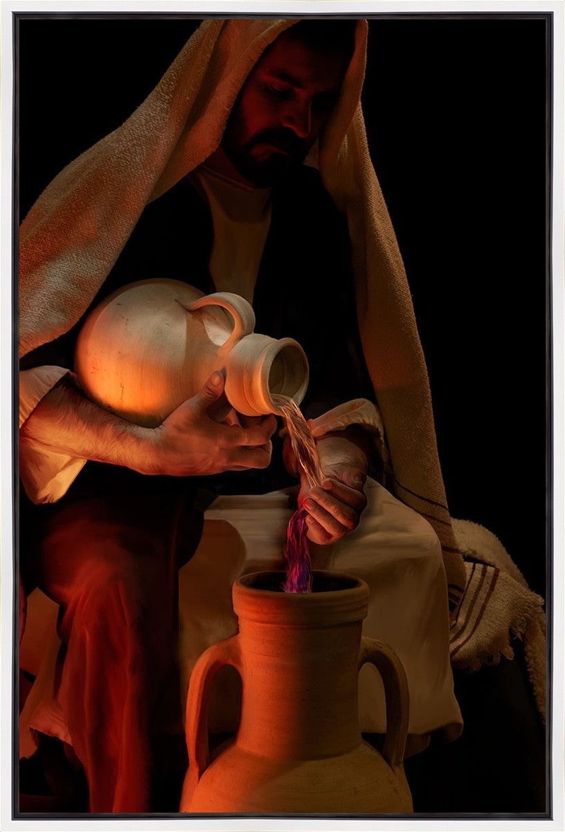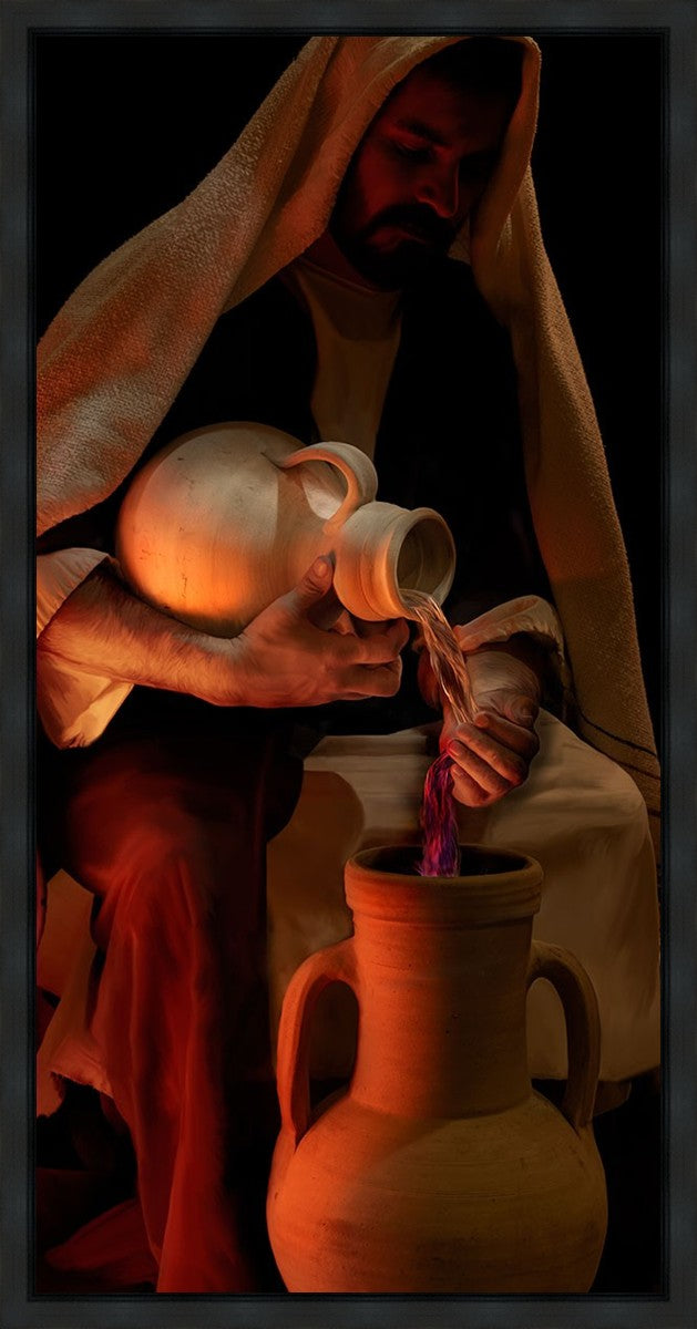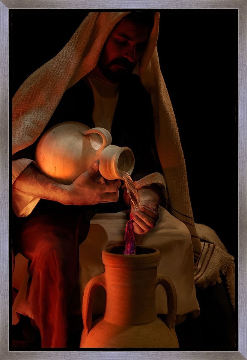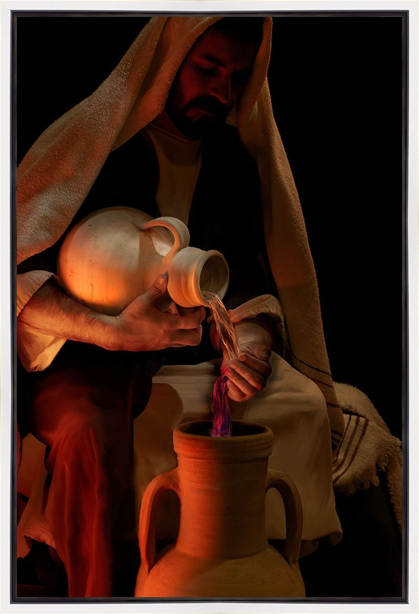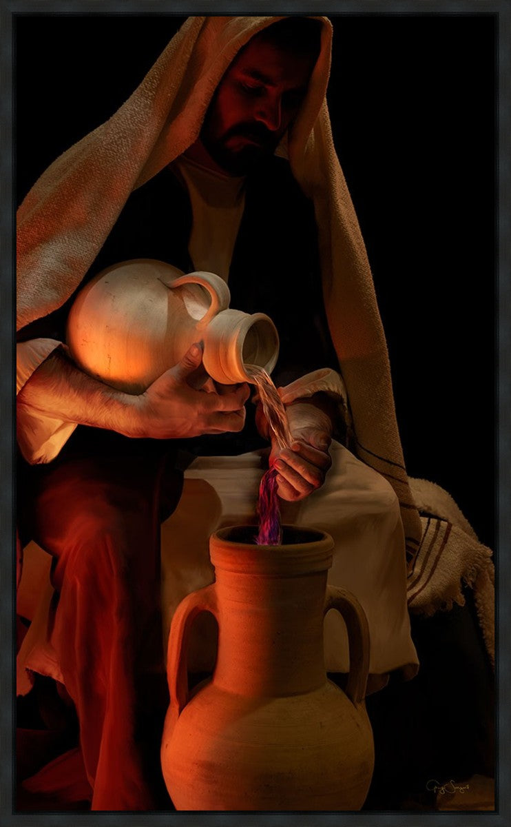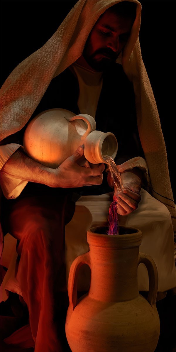 Jesus Christ, at a wedding he attends in Cana, turns water to wine.