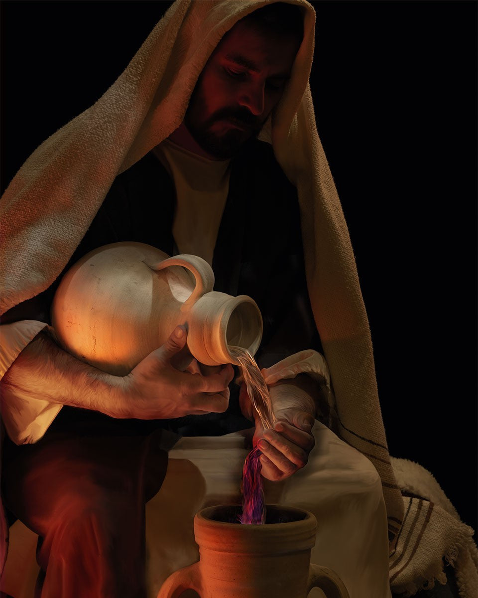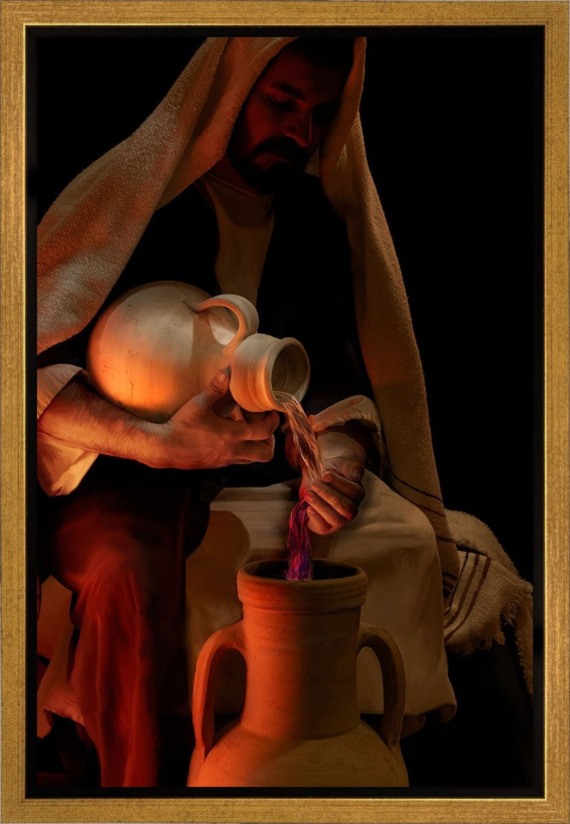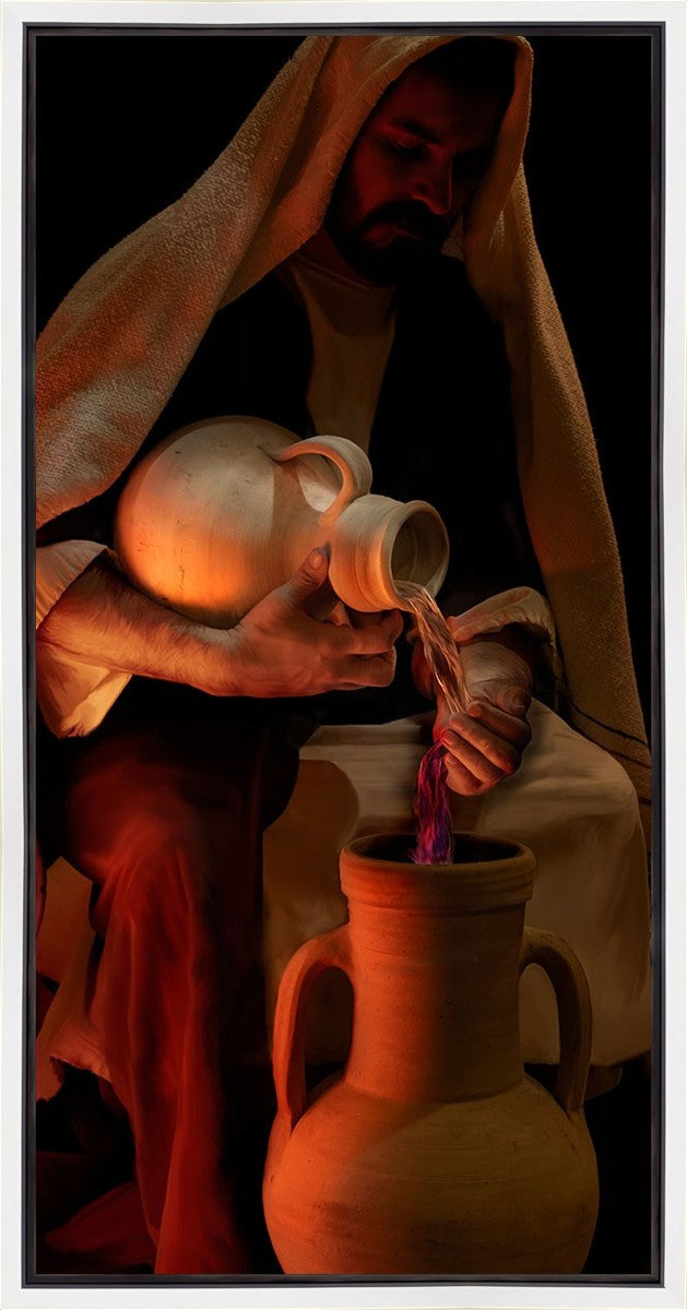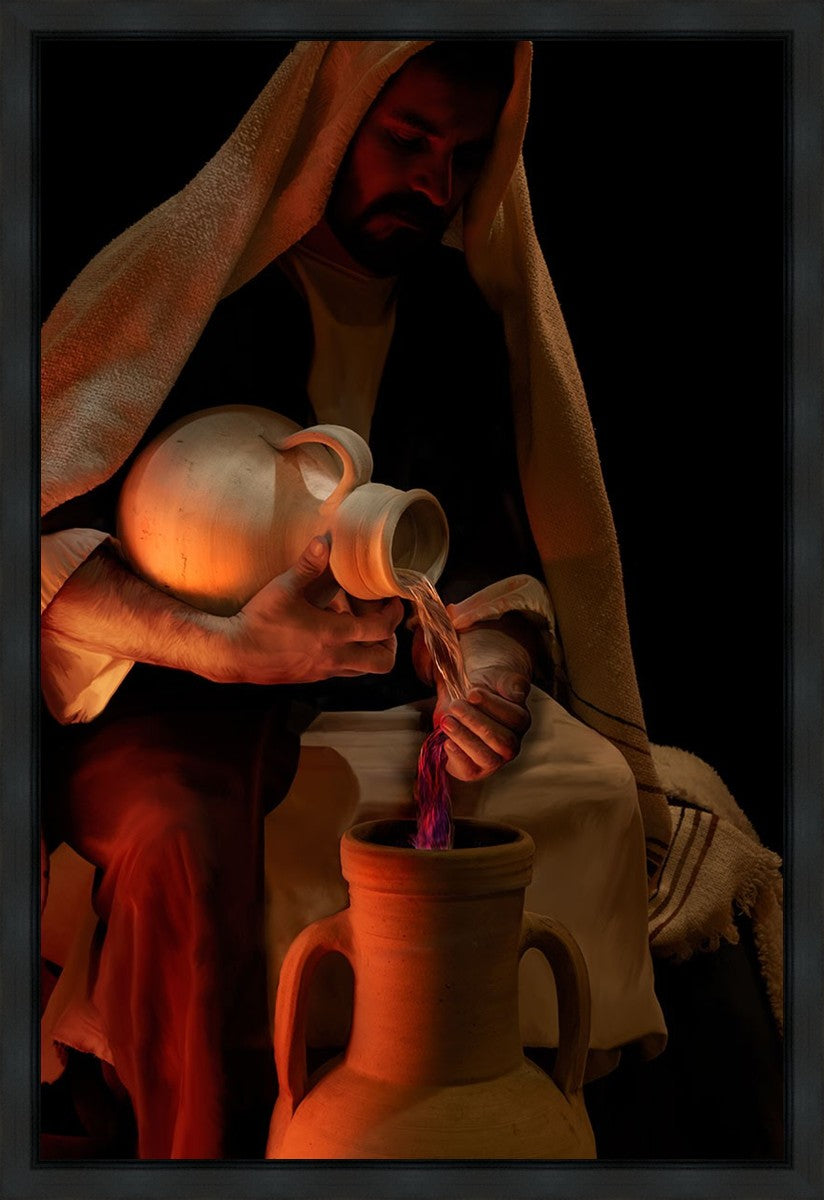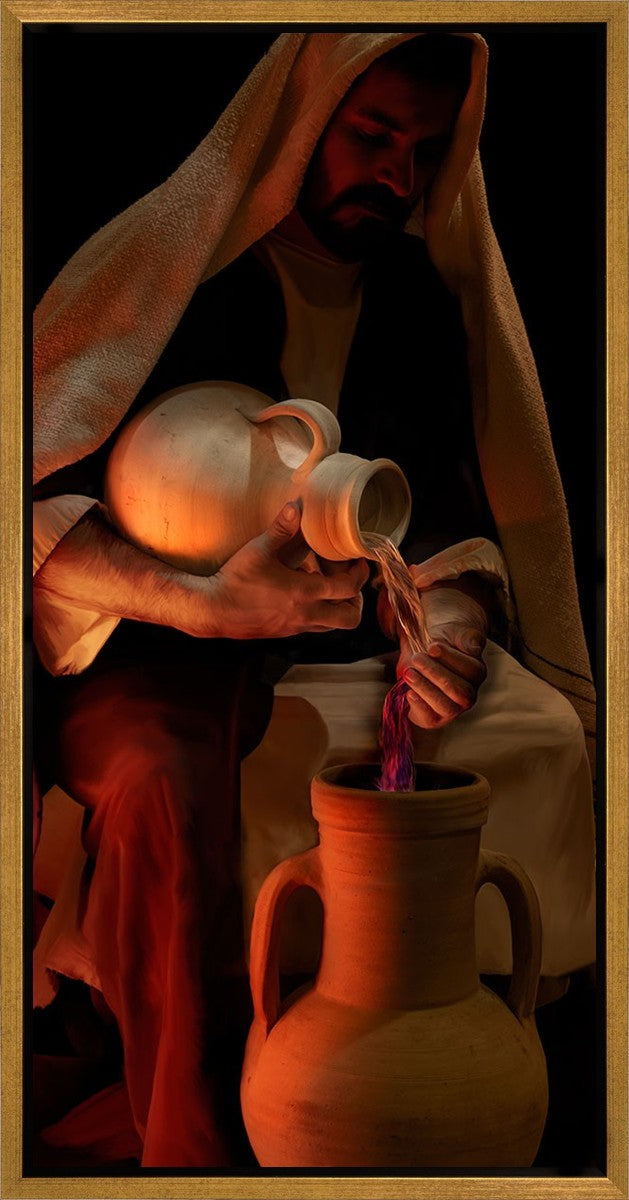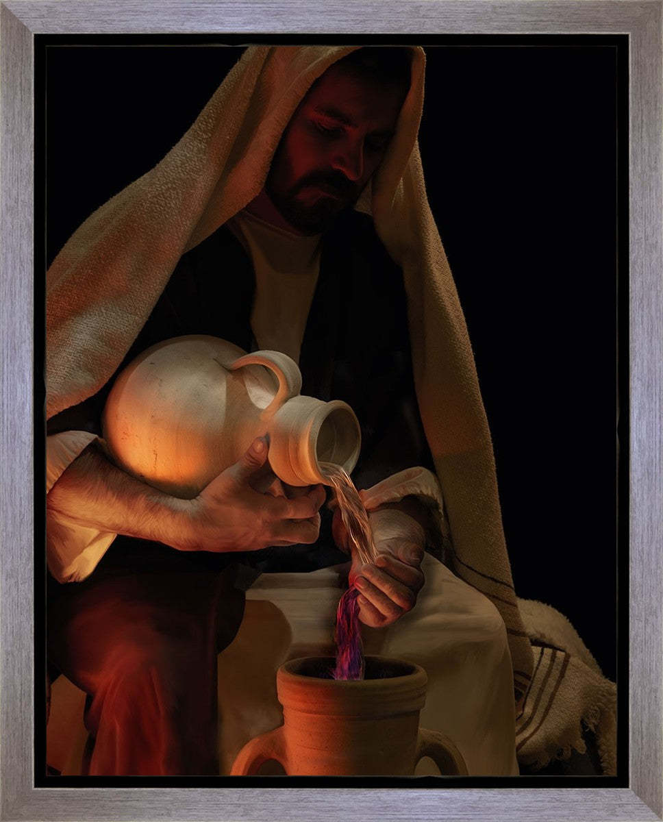 Jesus Christ, at a wedding he attends in Cana, turns water to wine.