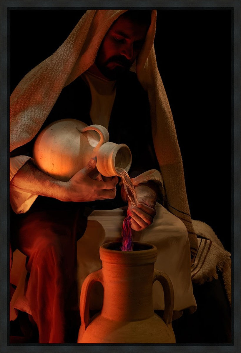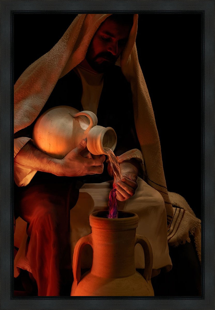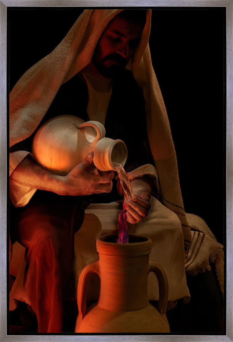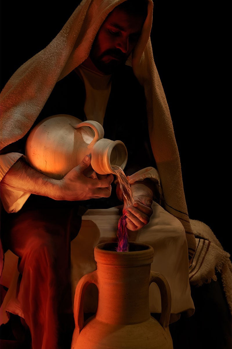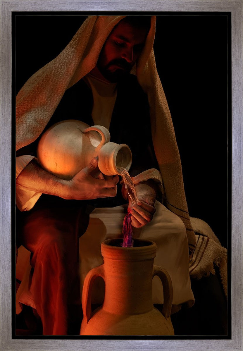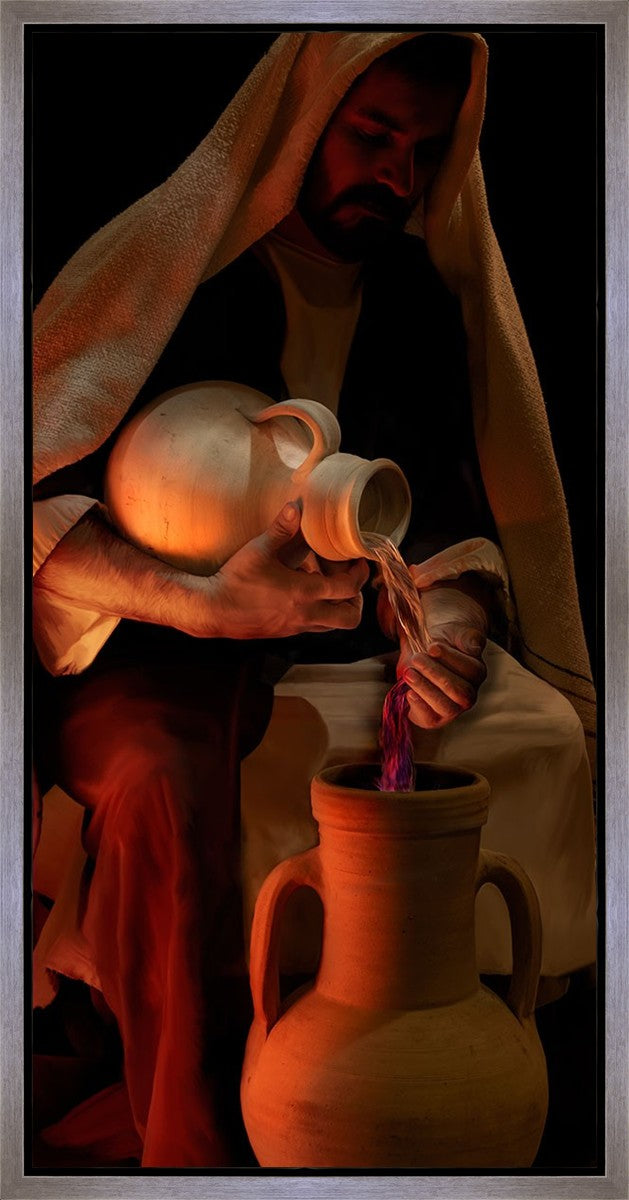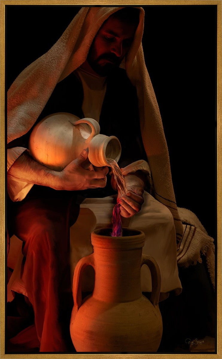 Jesus Christ, at a wedding he attends in Cana, turns water to wine.