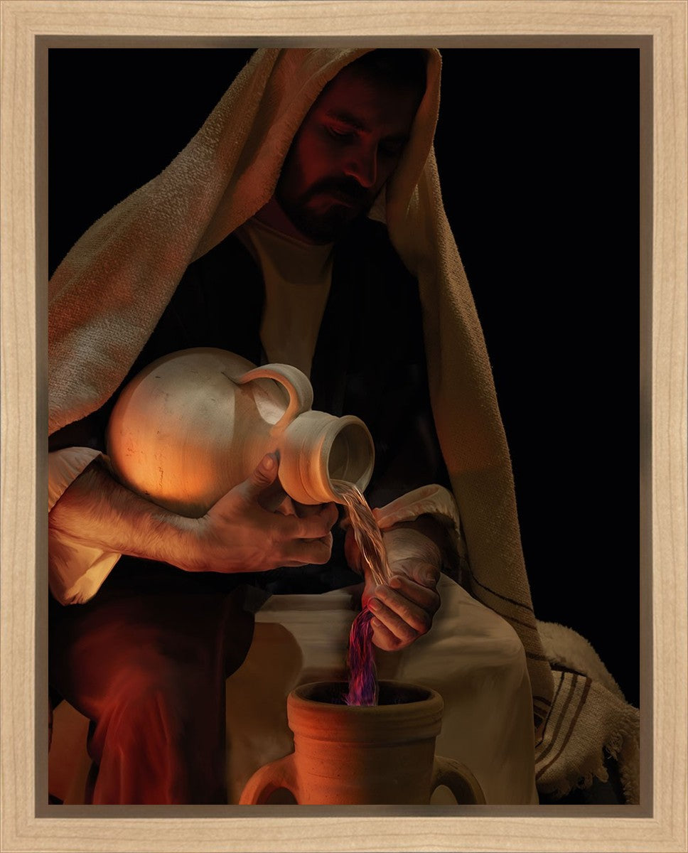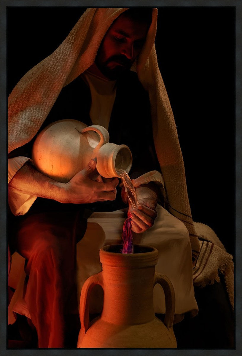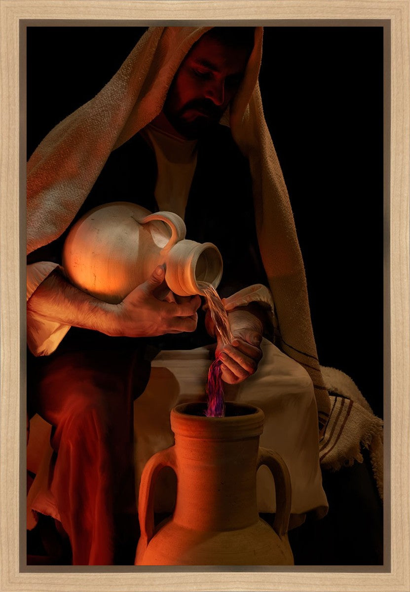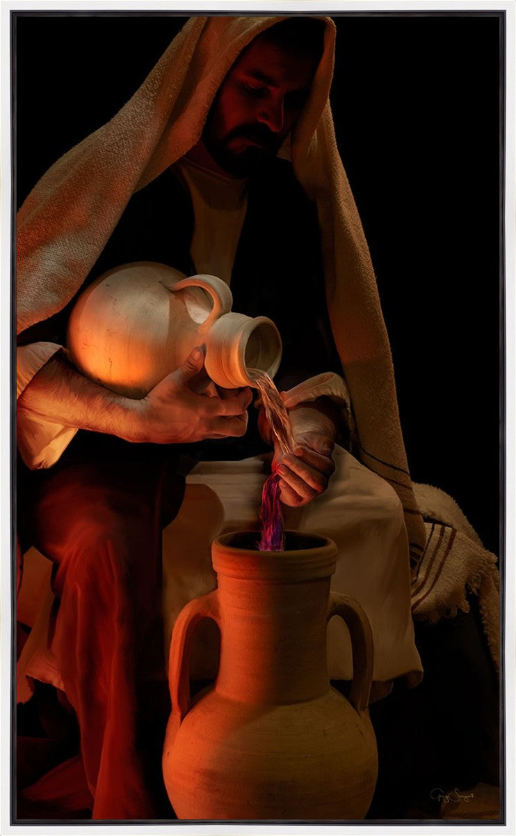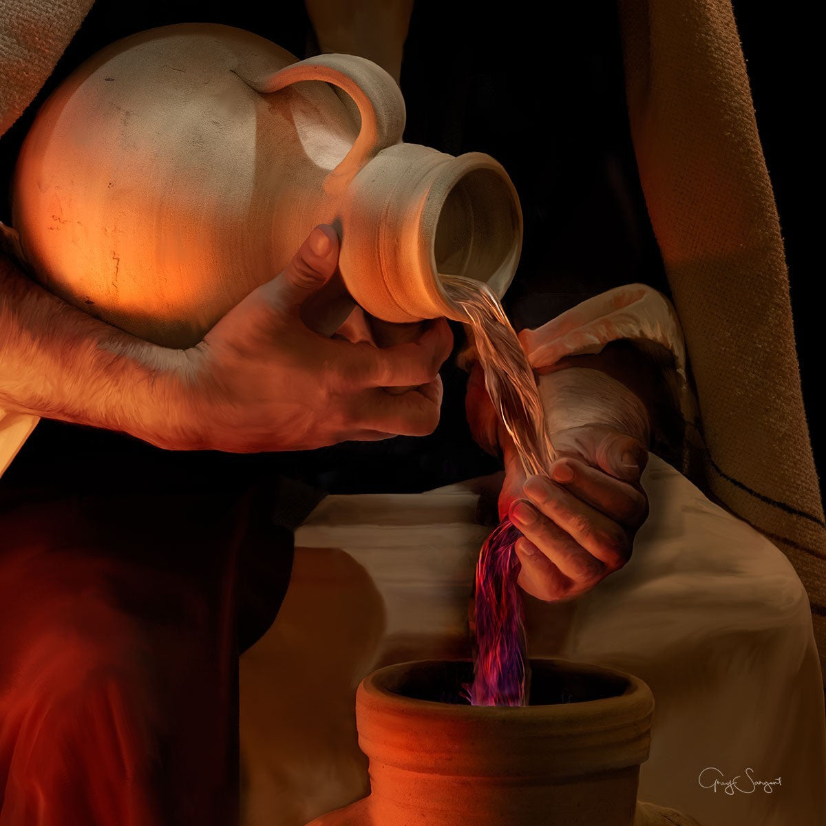 Jesus Christ, at a wedding he attends in Cana, turns water to wine.