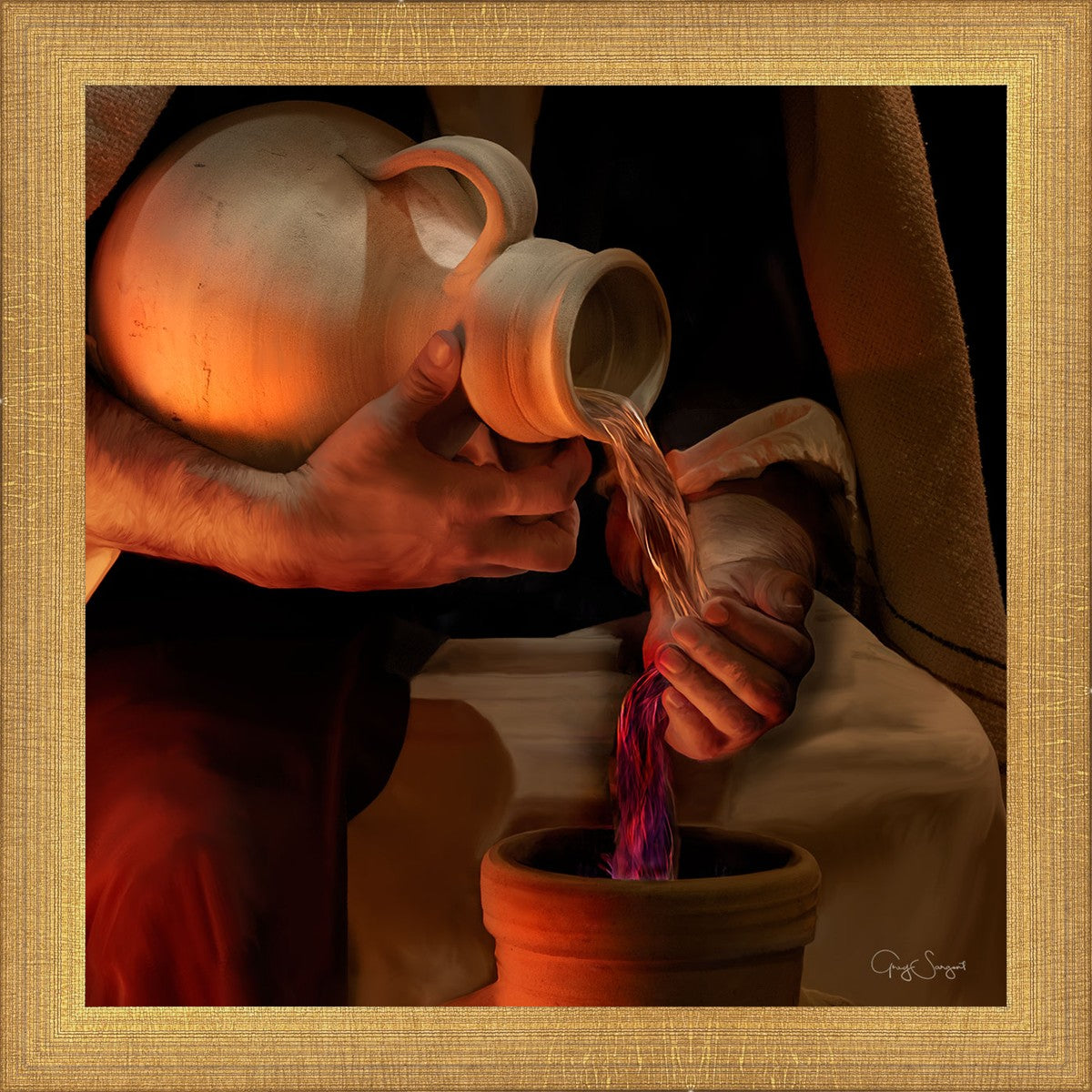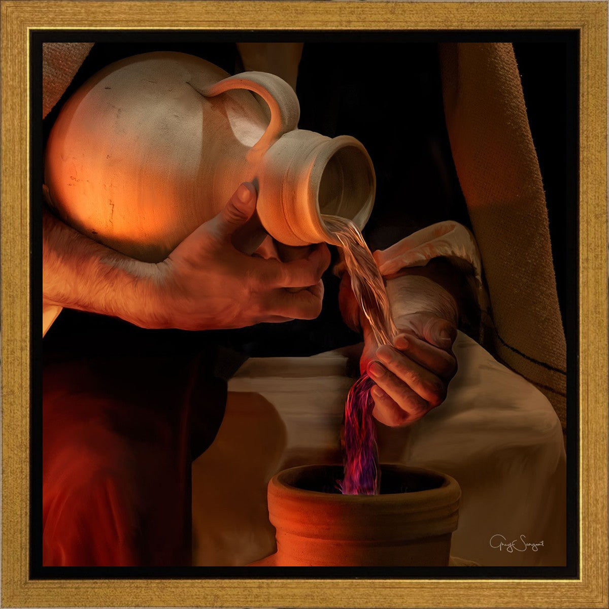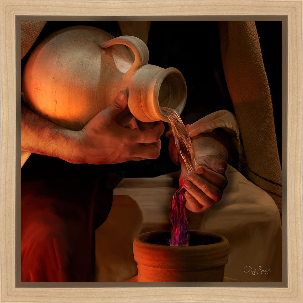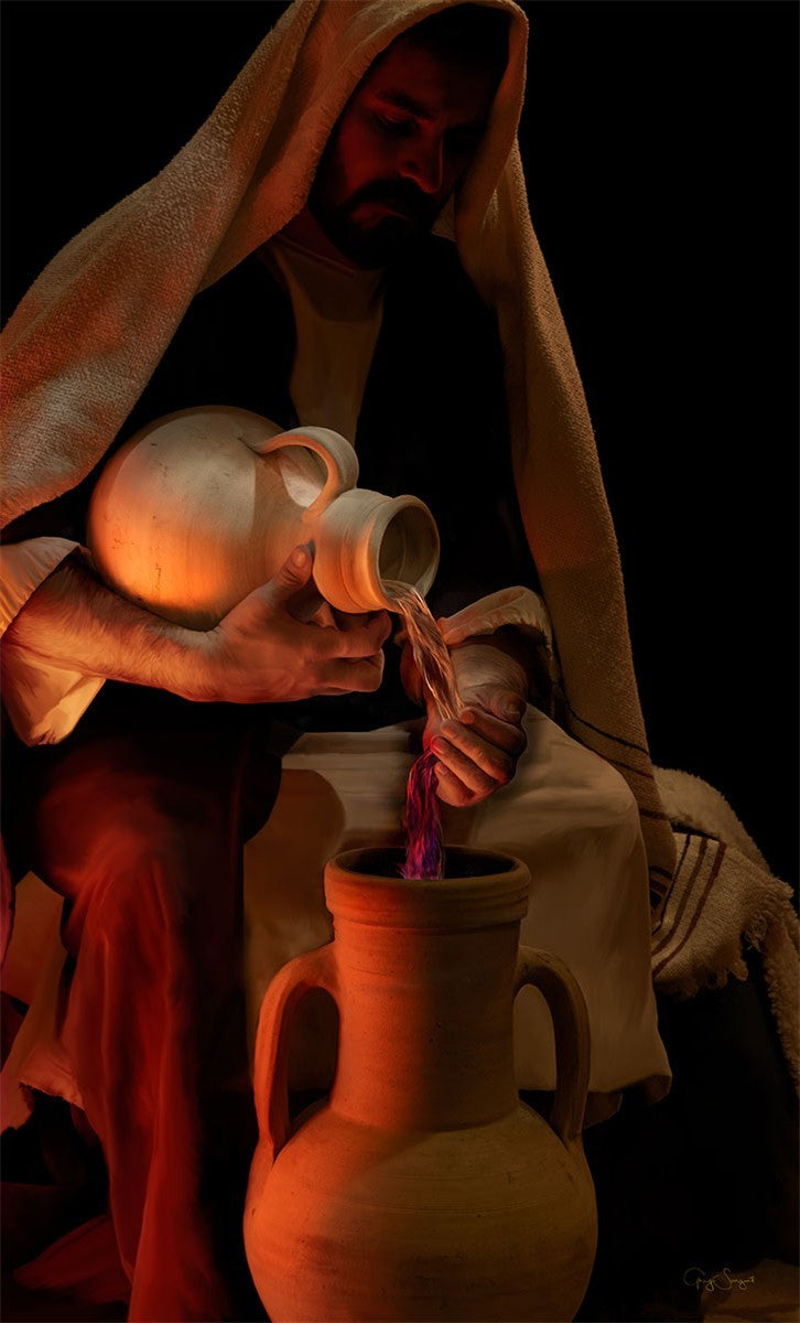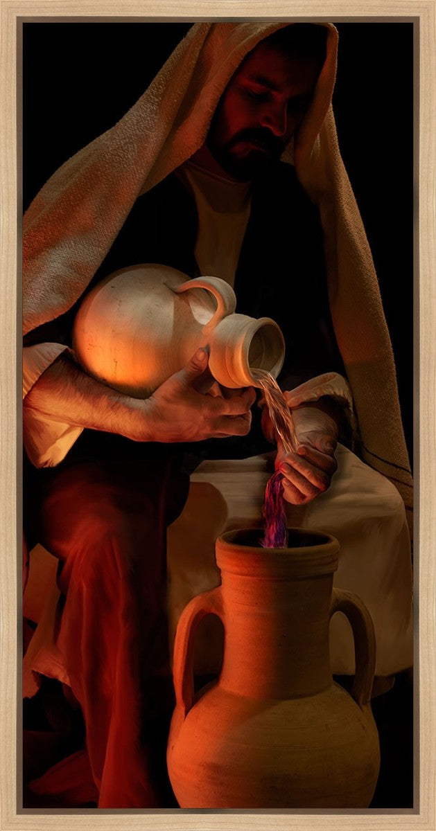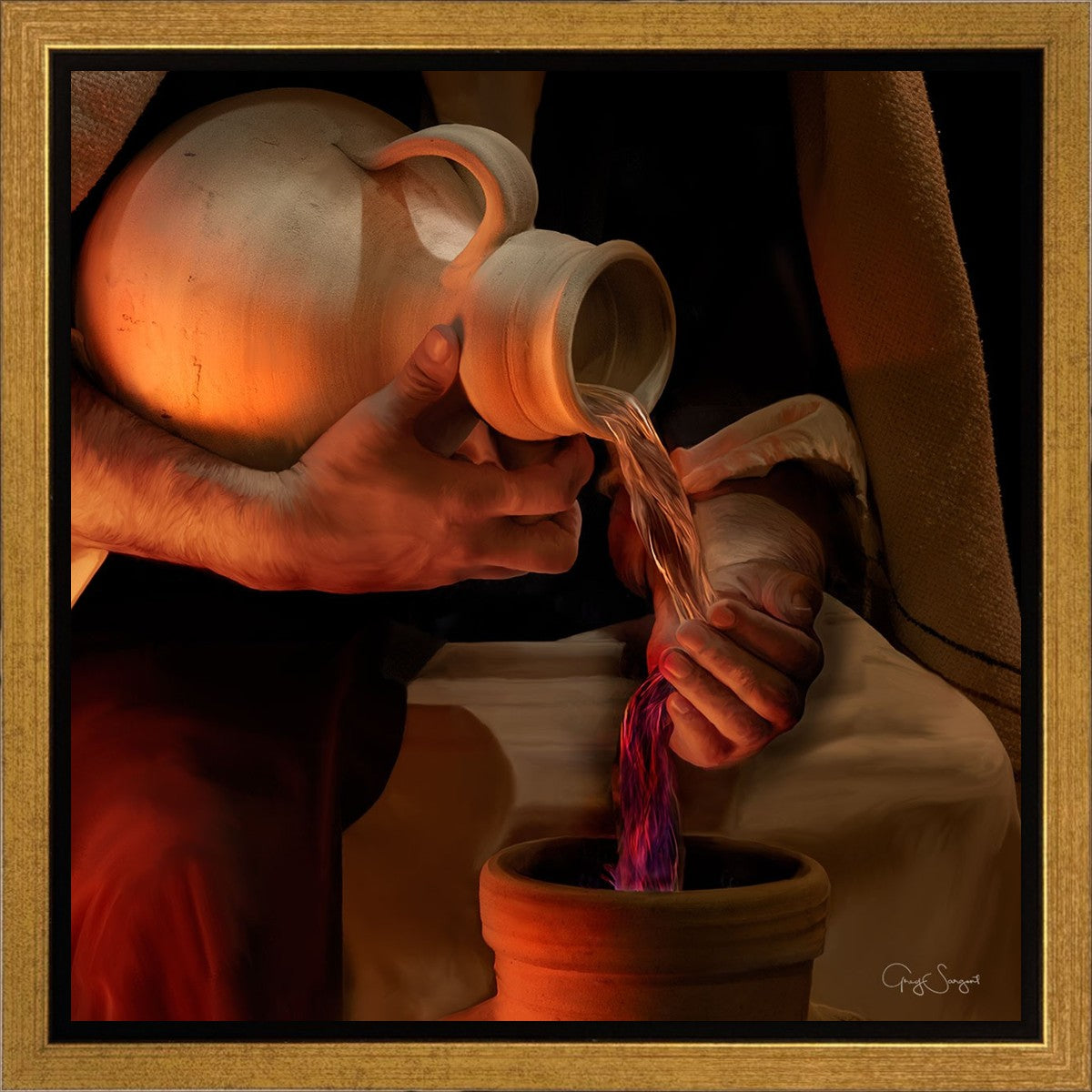 Jesus Christ, at a wedding he attends in Cana, turns water to wine.