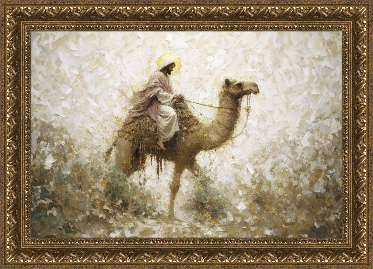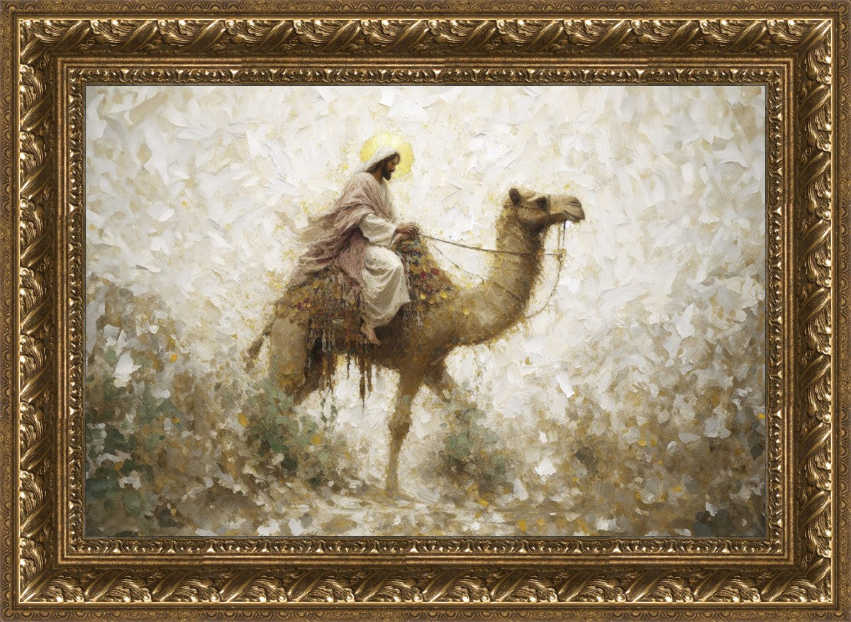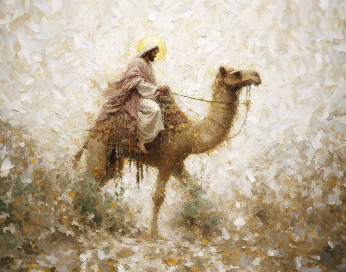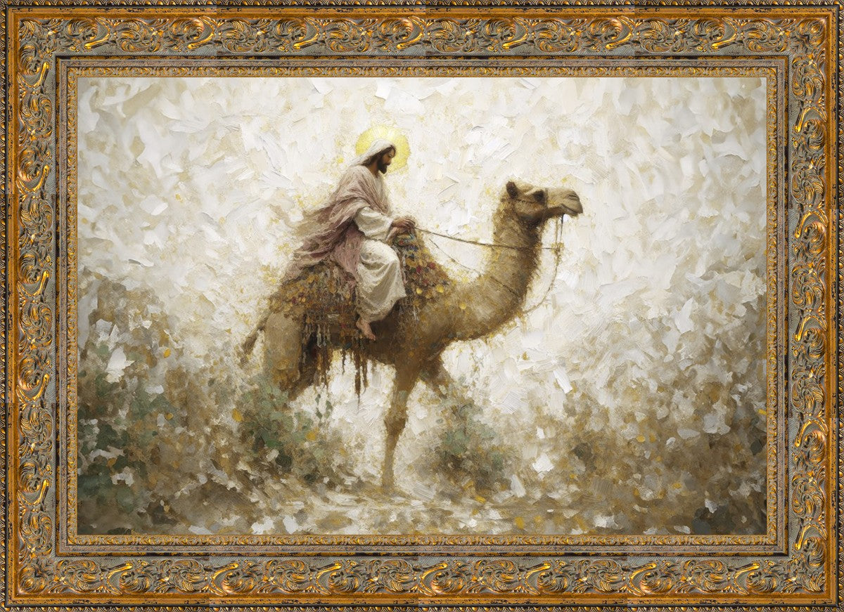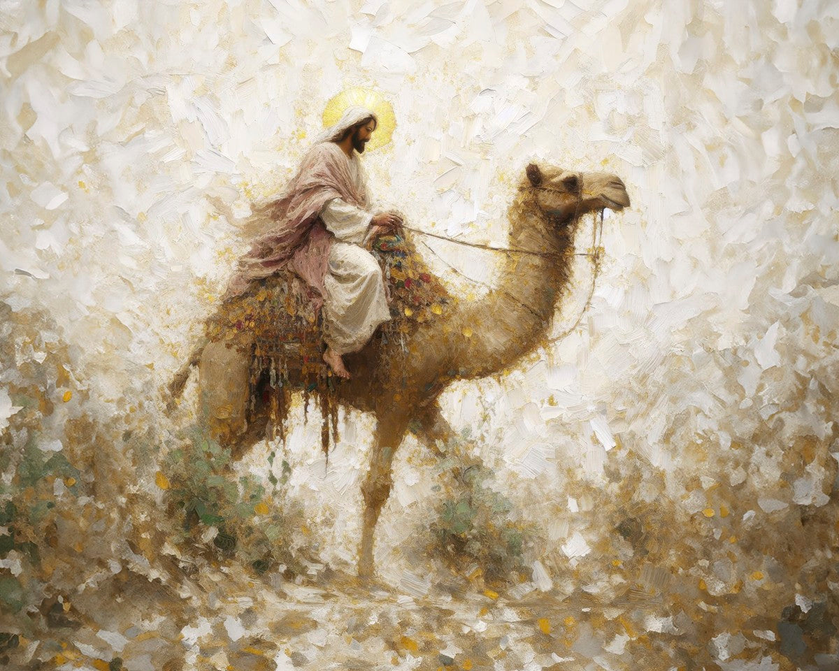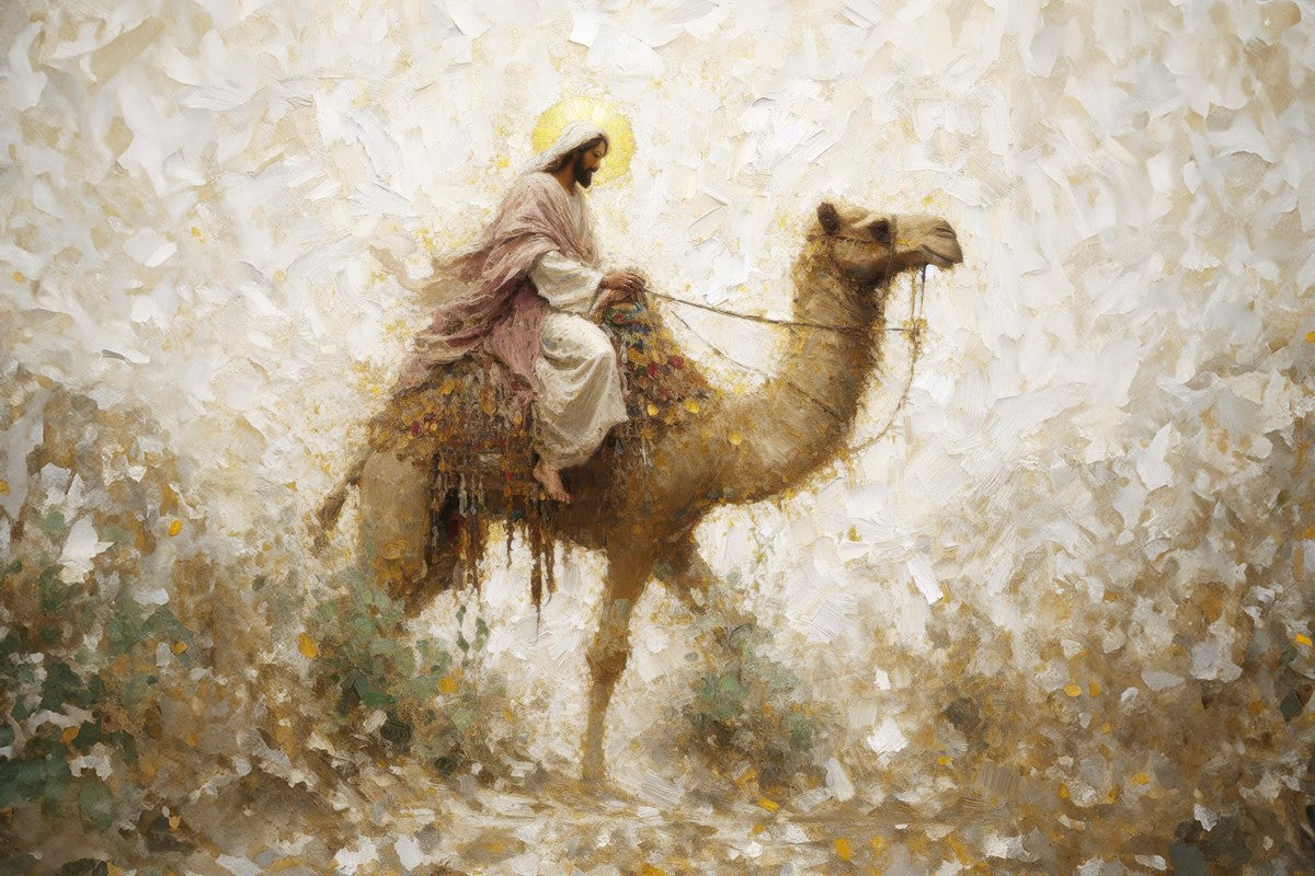 But beyond the powerful teachings and miracles, Jesus also lived a real, everyday life. He walked dusty roads, shared meals with friends, and, who knows? Maybe He even hitched a ride on a camel now and then. This piece imagines one of those simple, in-between moments—a reminder that while Christ was the Son of God, He also experienced the ordinary, just like us.