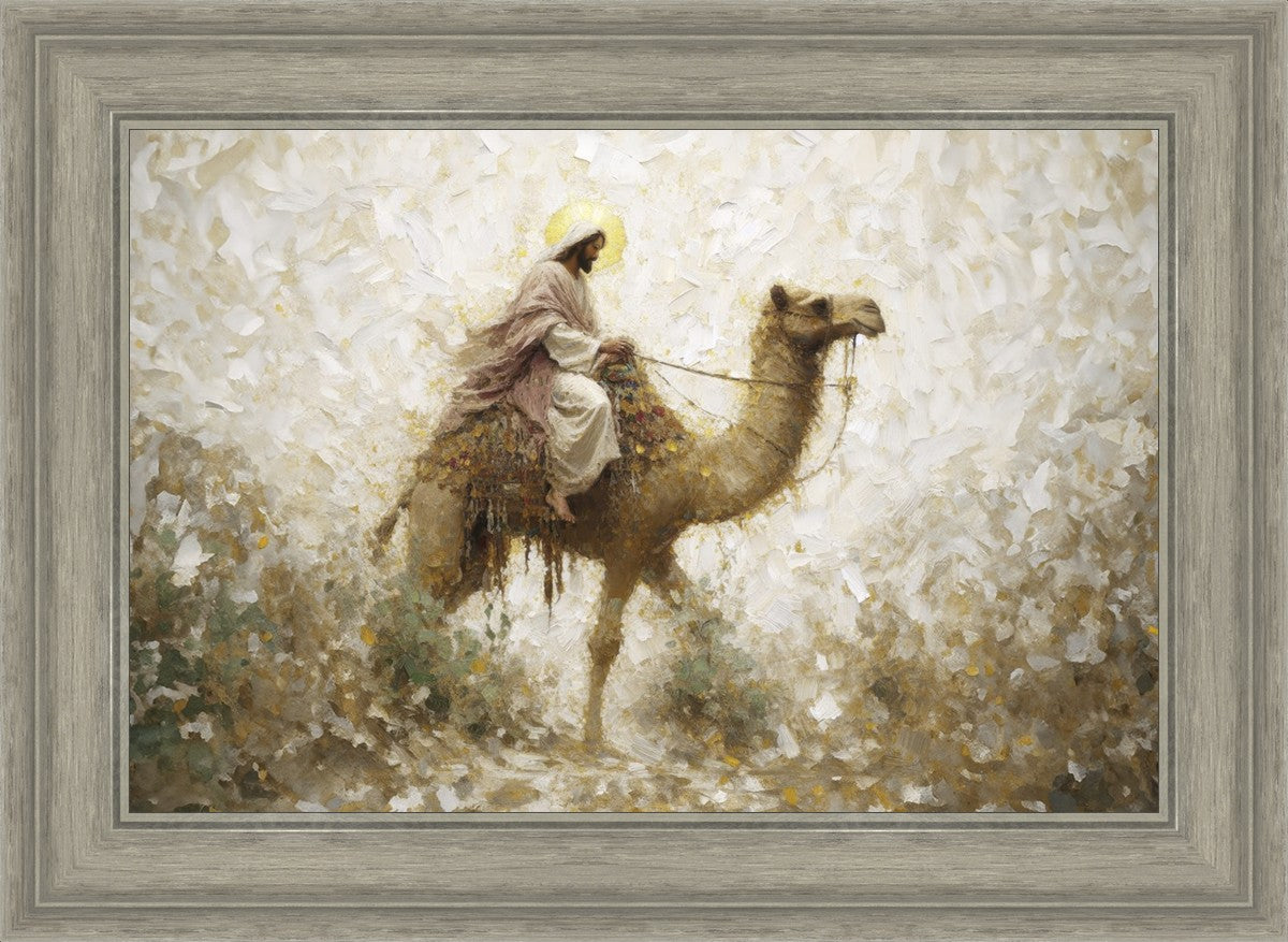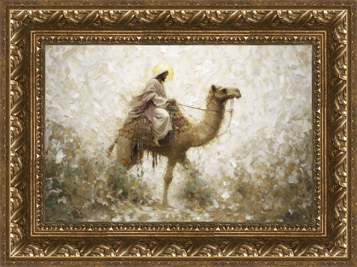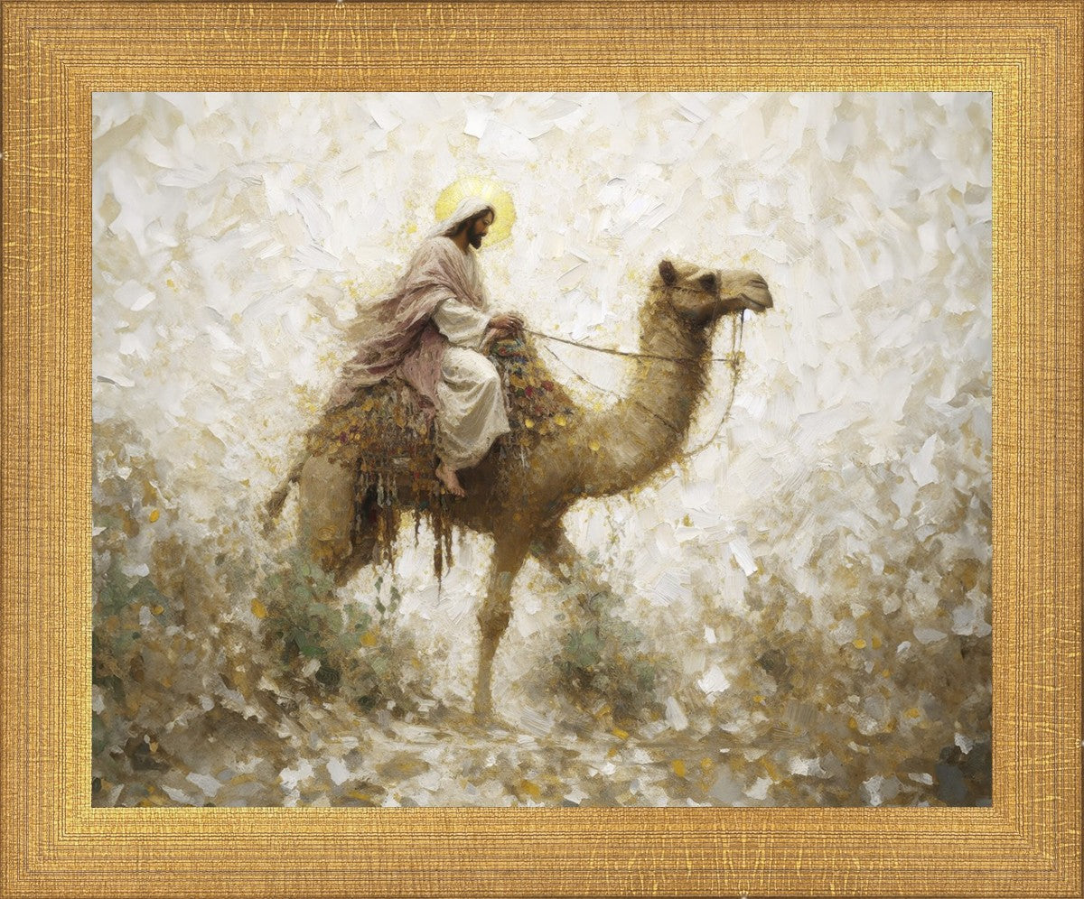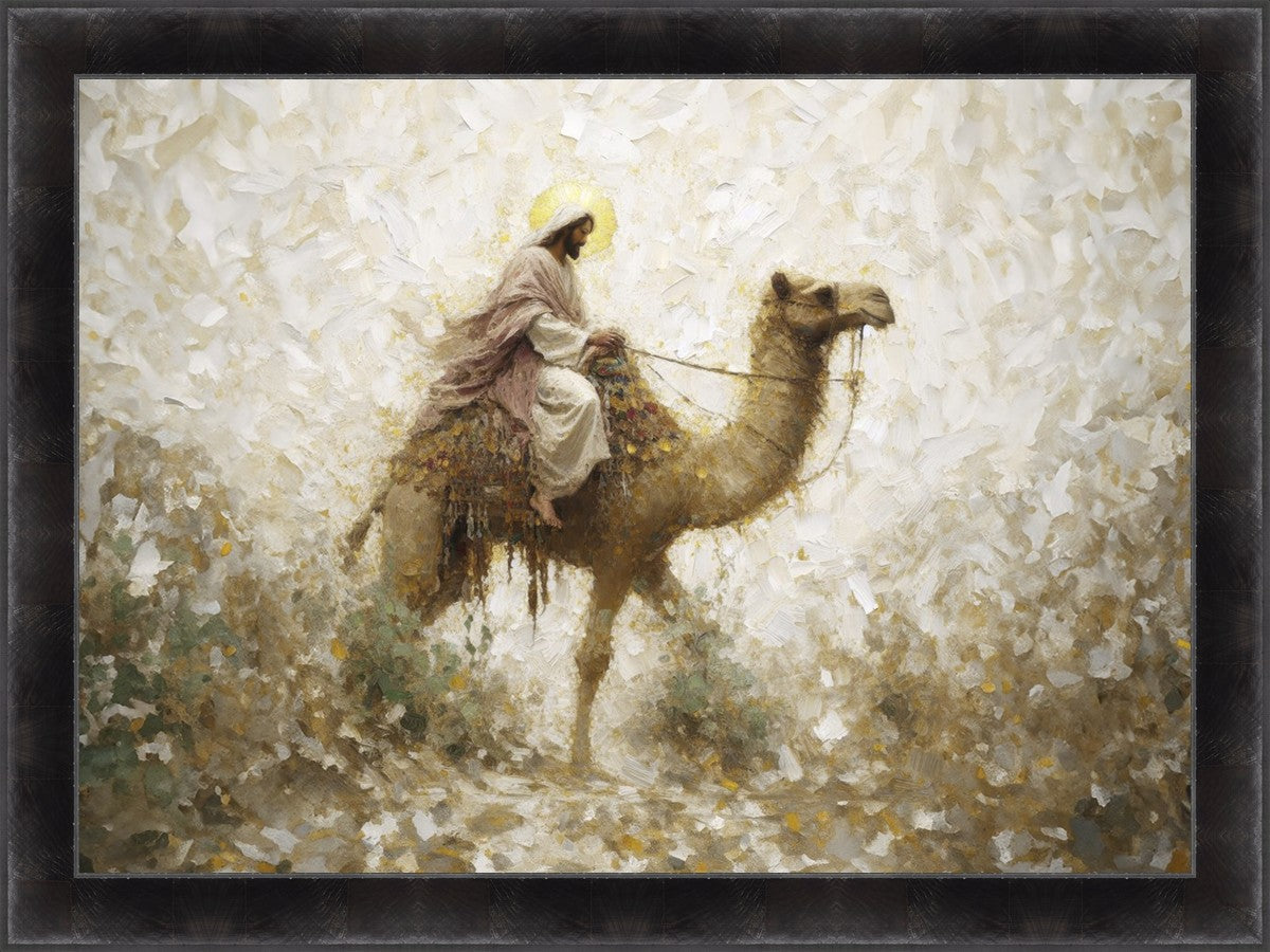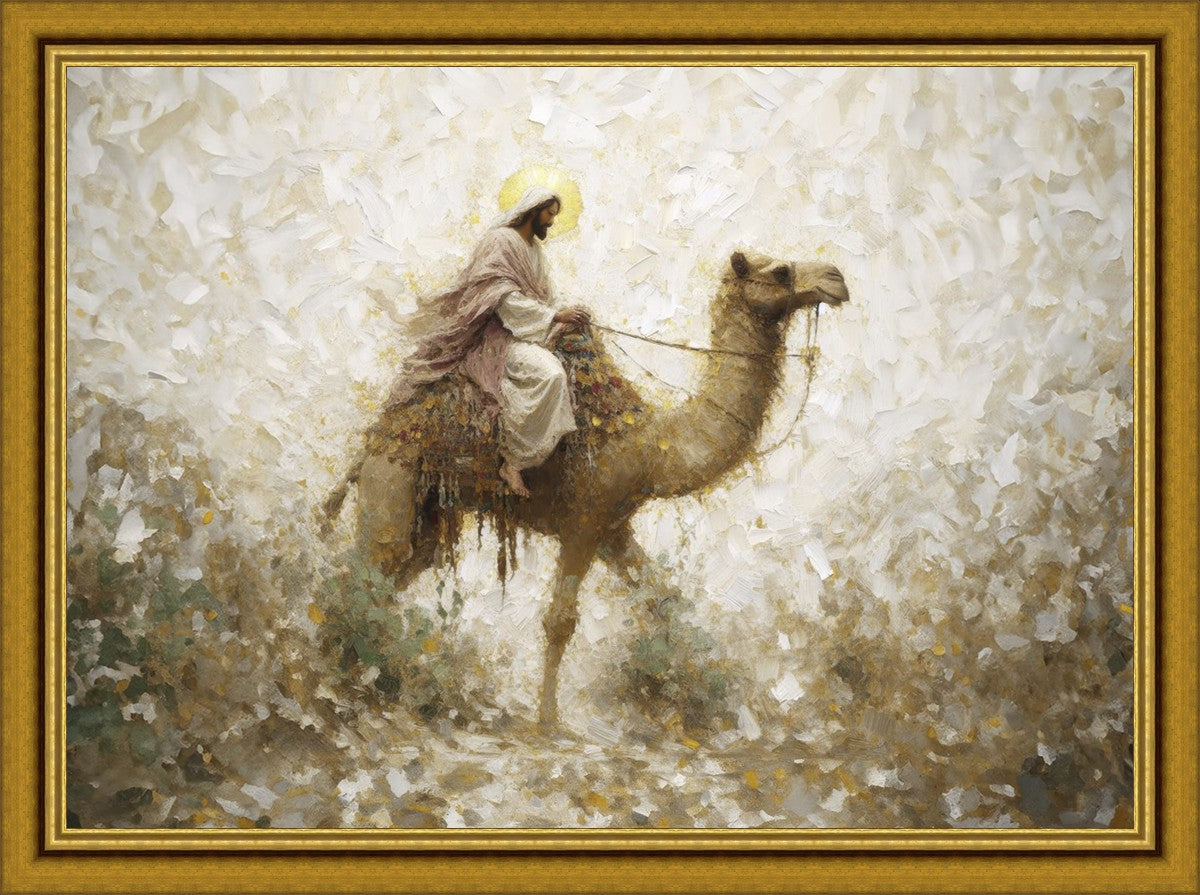 But beyond the powerful teachings and miracles, Jesus also lived a real, everyday life. He walked dusty roads, shared meals with friends, and, who knows? Maybe He even hitched a ride on a camel now and then. This piece imagines one of those simple, in-between moments—a reminder that while Christ was the Son of God, He also experienced the ordinary, just like us.