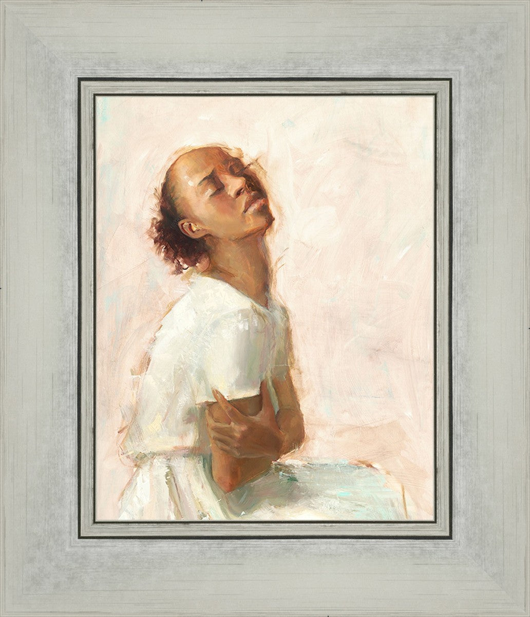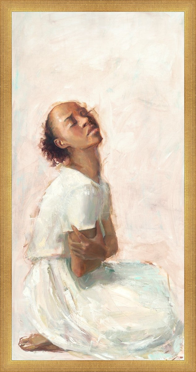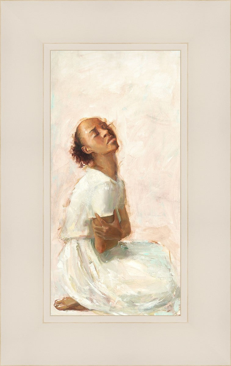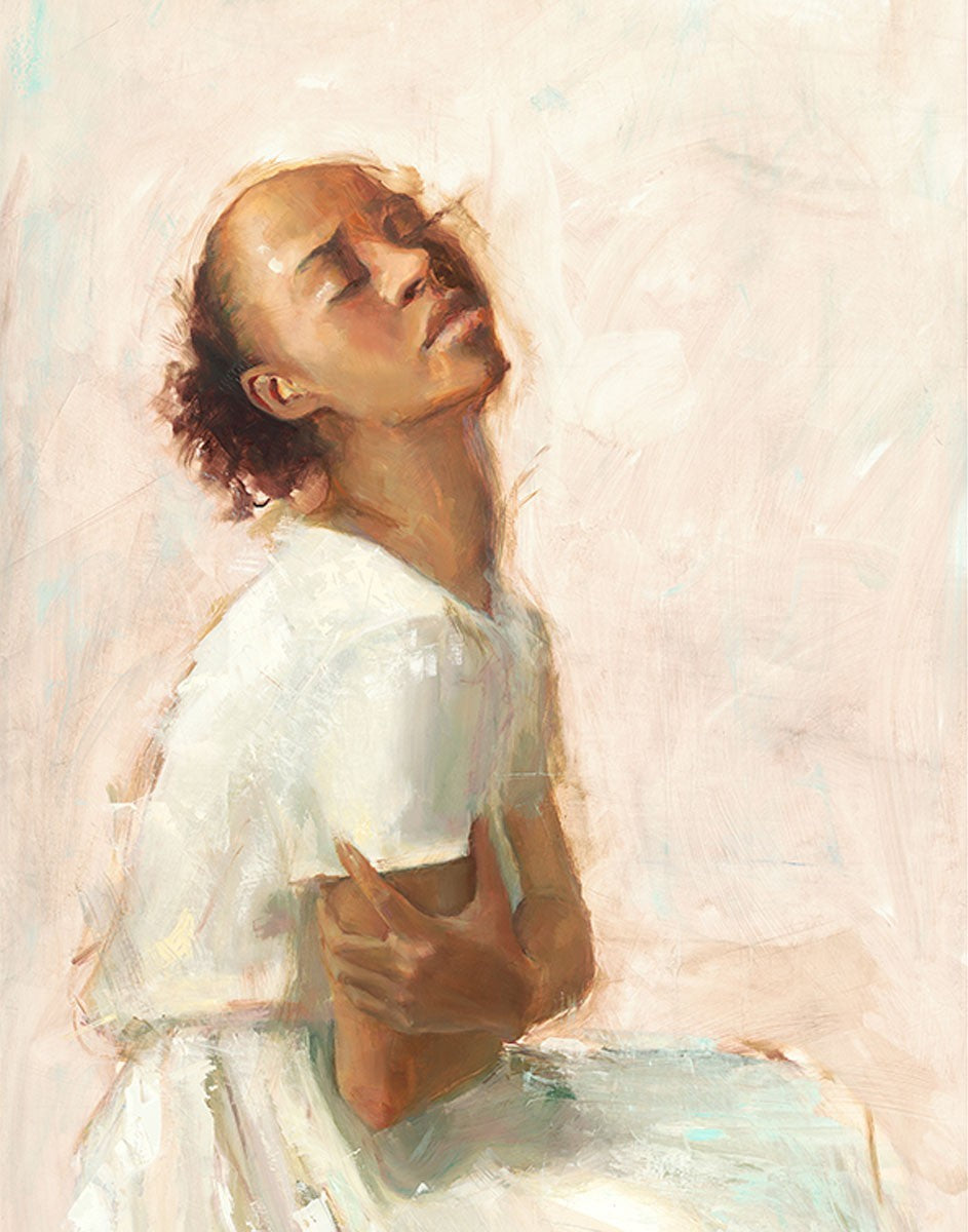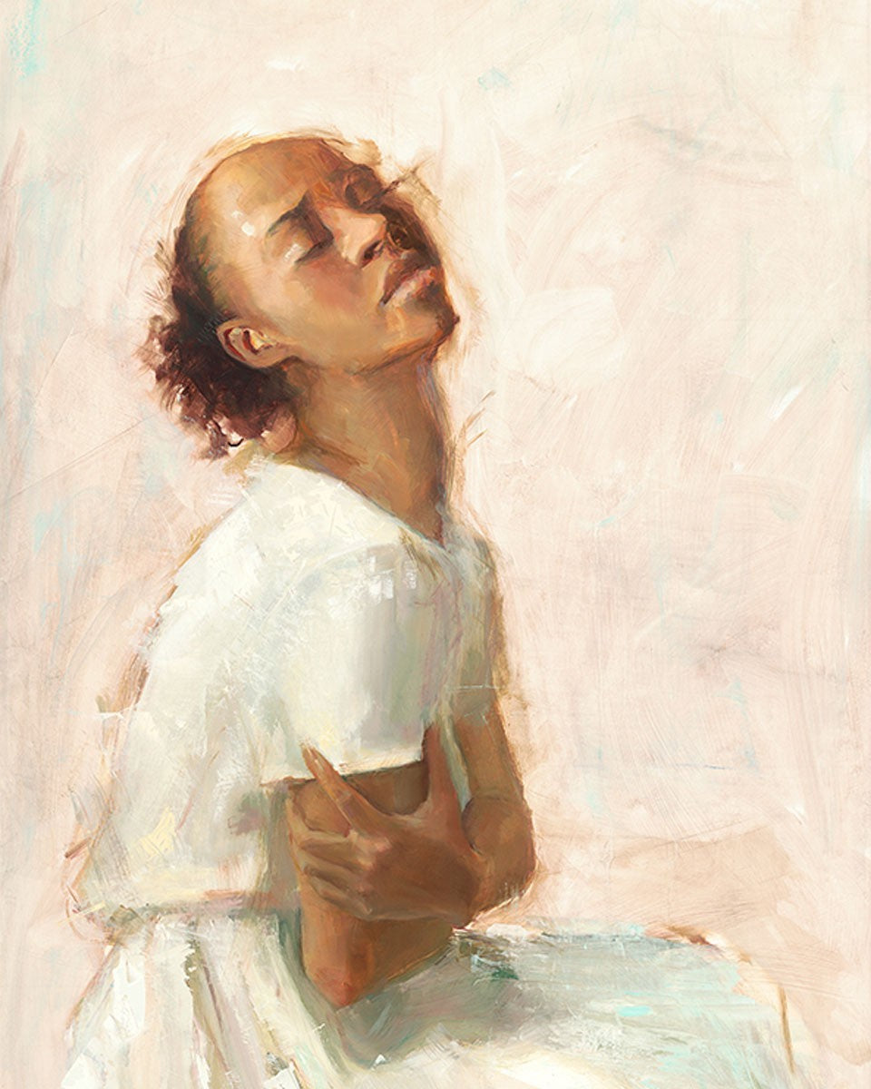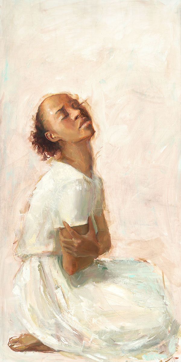 This painting came about while I was struggling to feel adequate. I wanted to be a better person to be closer to my parents in heaven. My inadequacies were acutely painful and paralyzing. I often felt that I was drifting further from heaven, tossed in the sea of my own ineptitude. I set out to make a painting to process this experience. This painting was my prayer to realize a closer relationship with Heavenly Parents and to become more like them. Over time, I felt closer to them and the sharpness of the pain dulled. This relief found its way into the facial expression of the subject. Originally the painting was about the struggle and pain of this experience but I decided to keep a more peaceful face. It mirrored my experience of gaining calm and quiet in the process of drawing closer to Heavenly Mother and Father. Though I still feel inadequate some days, a closer relationship with my Heavenly Parents has taken immobilizing self-doubt and turned it into a more productive and healthy discipleship.