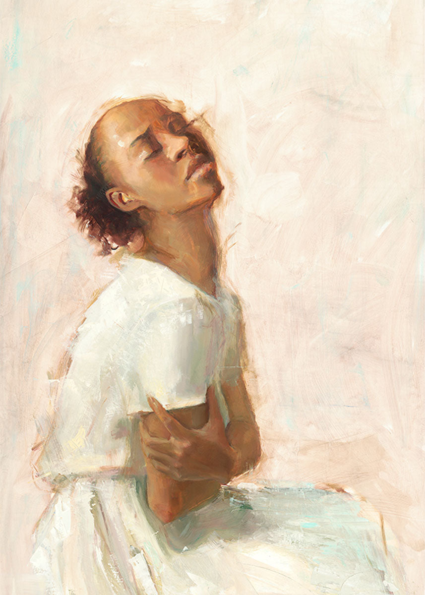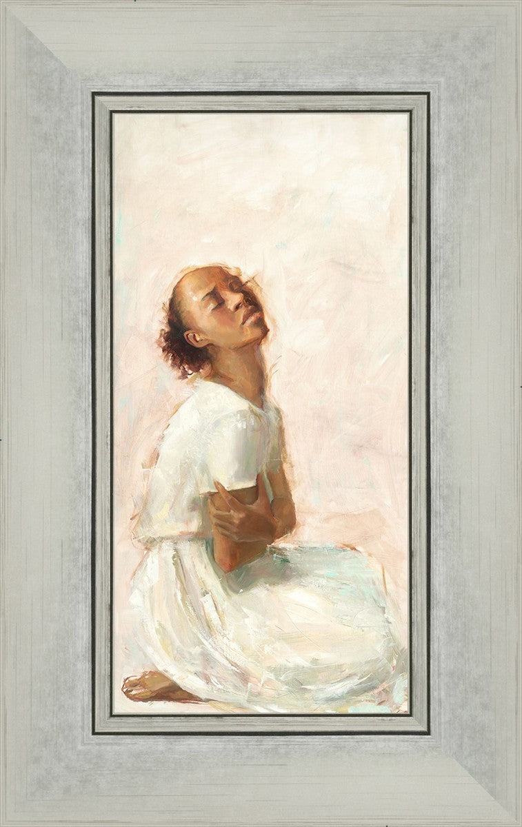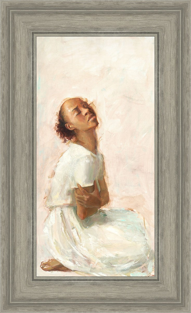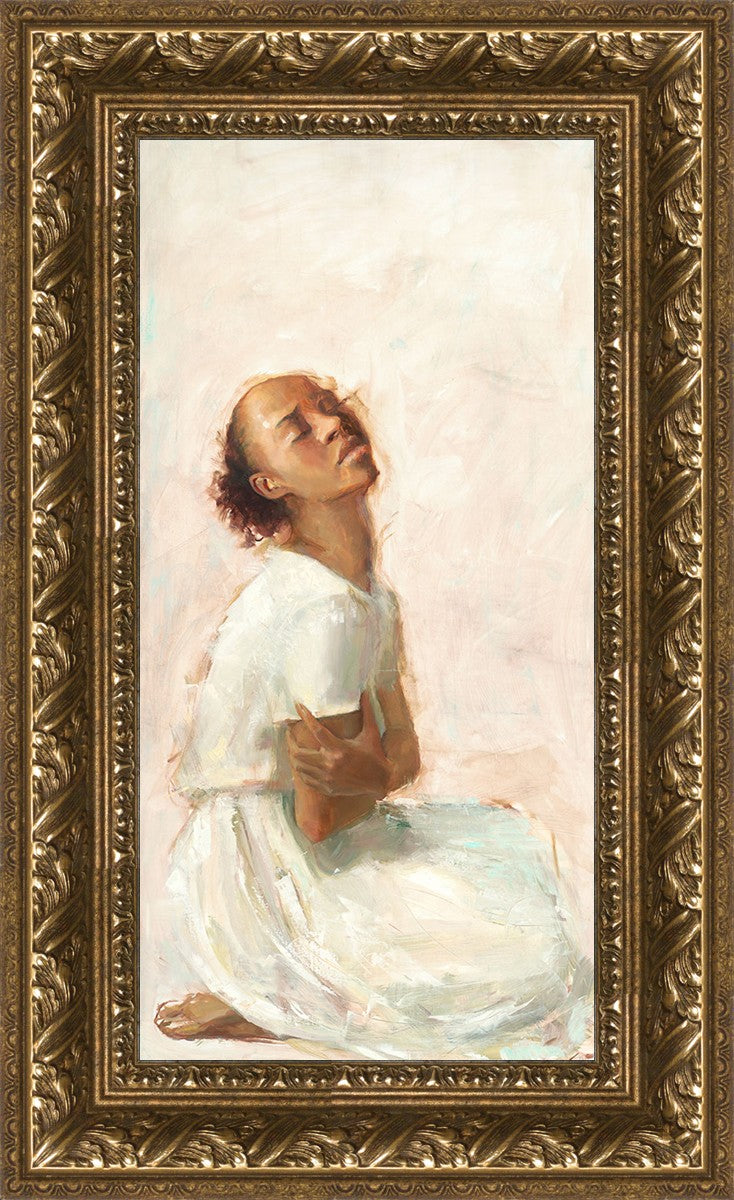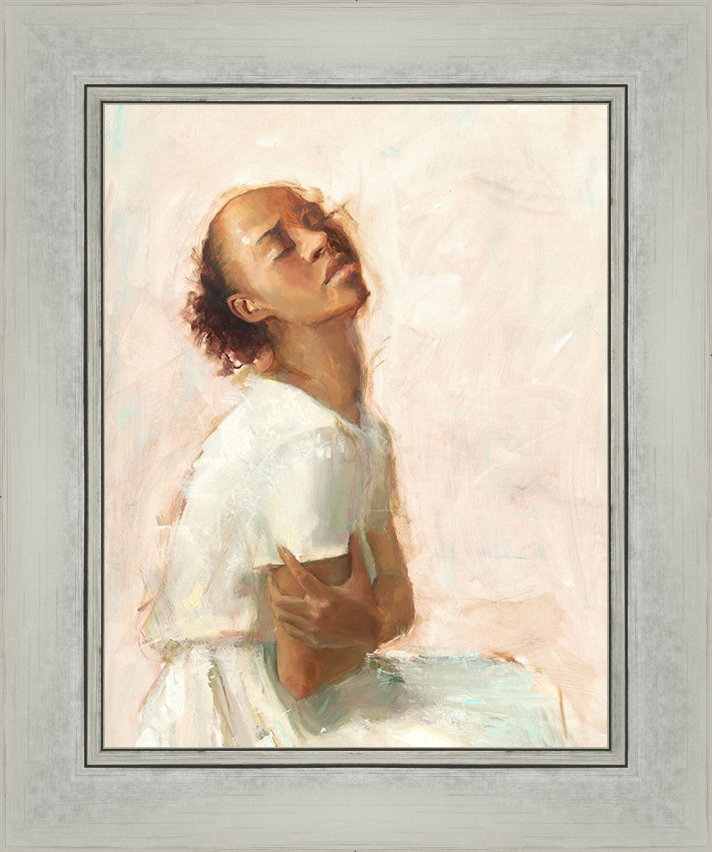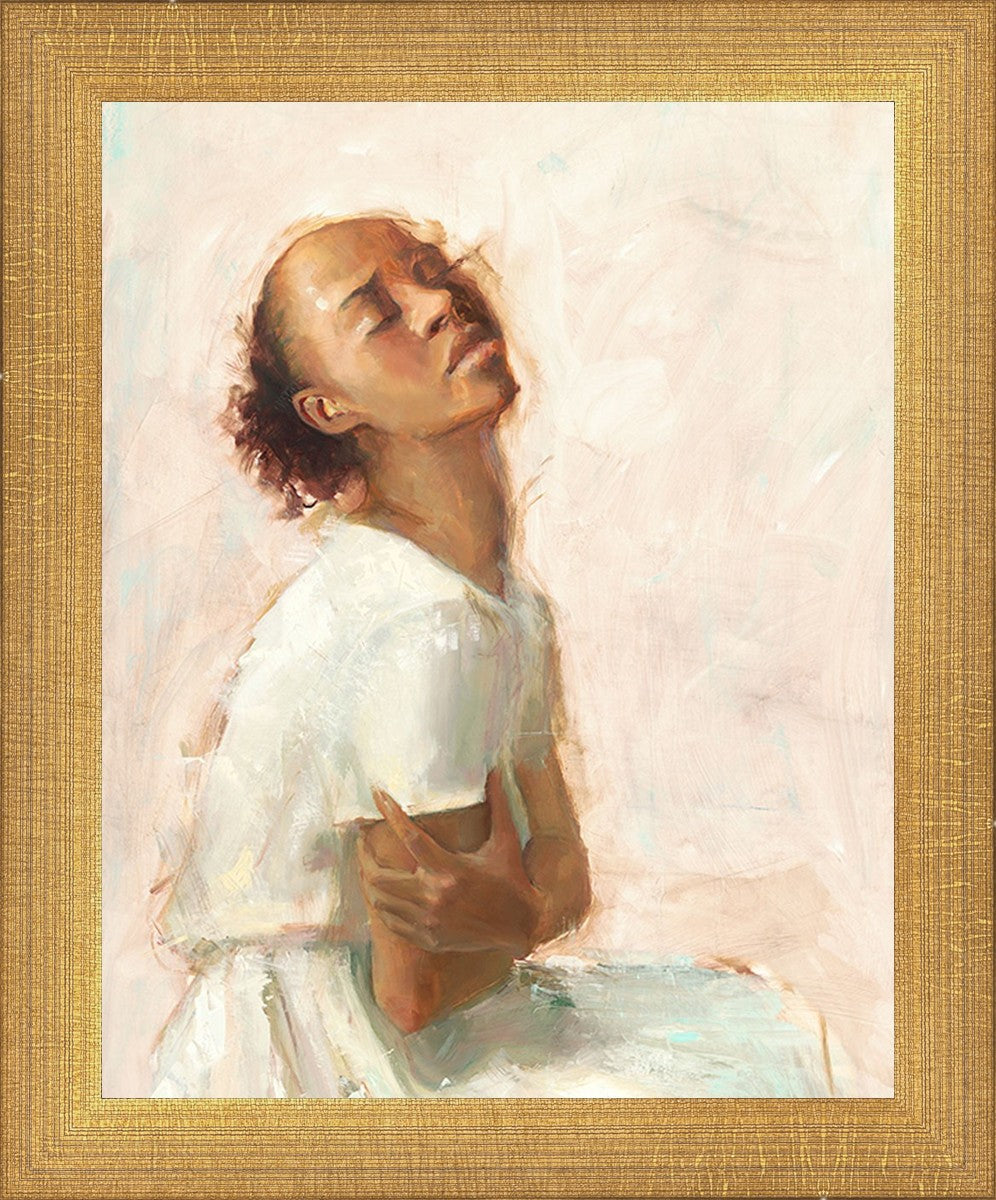This painting came about while I was struggling to feel adequate. I wanted to be a better person to be closer to my parents in heaven. My inadequacies were acutely painful and paralyzing. I often felt that I was drifting further from heaven, tossed in the sea of my own ineptitude. I set out to make a painting to process this experience. This painting was my prayer to realize a closer relationship with Heavenly Parents and to become more like them. Over time, I felt closer to them and the sharpness of the pain dulled. This relief found its way into the facial expression of the subject. Originally the painting was about the struggle and pain of this experience but I decided to keep a more peaceful face. It mirrored my experience of gaining calm and quiet in the process of drawing closer to Heavenly Mother and Father. Though I still feel inadequate some days, a closer relationship with my Heavenly Parents has taken immobilizing self-doubt and turned it into a more productive and healthy discipleship.