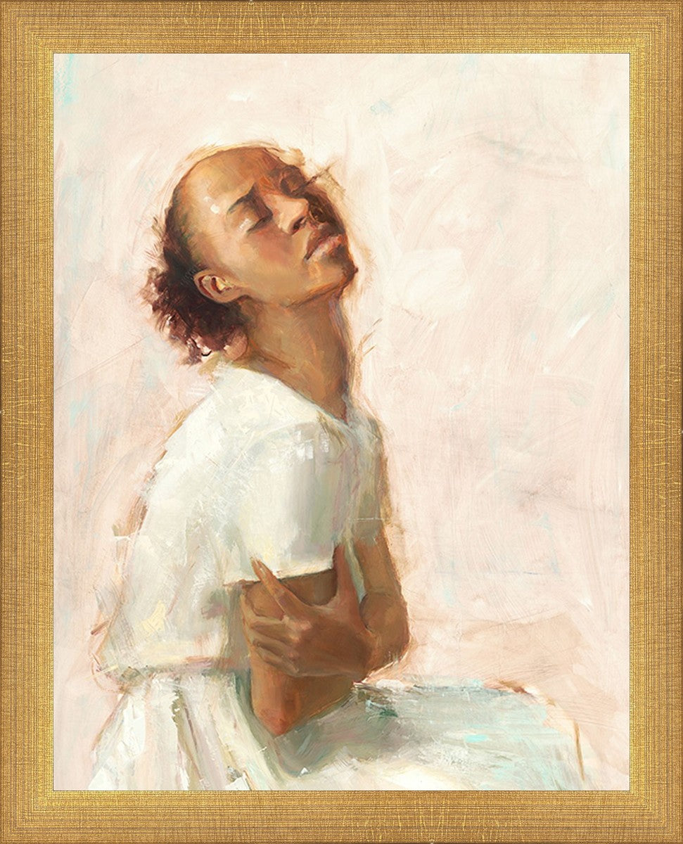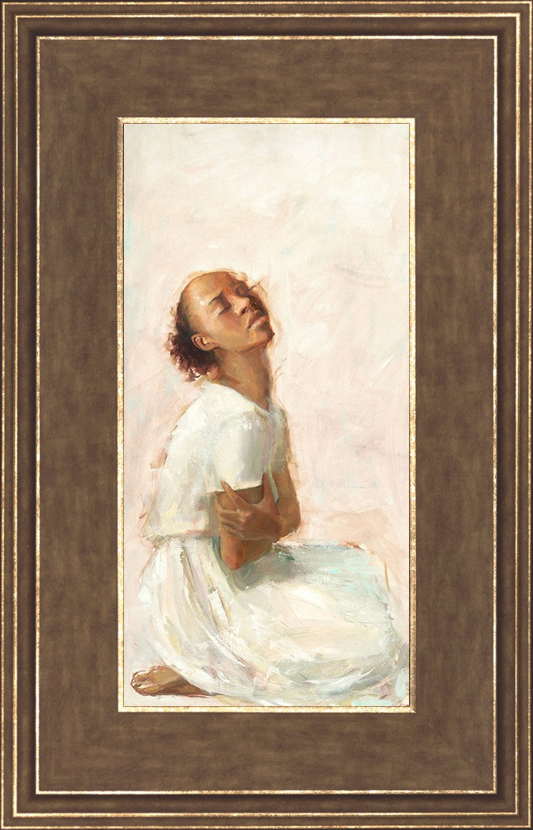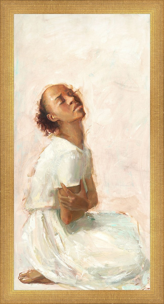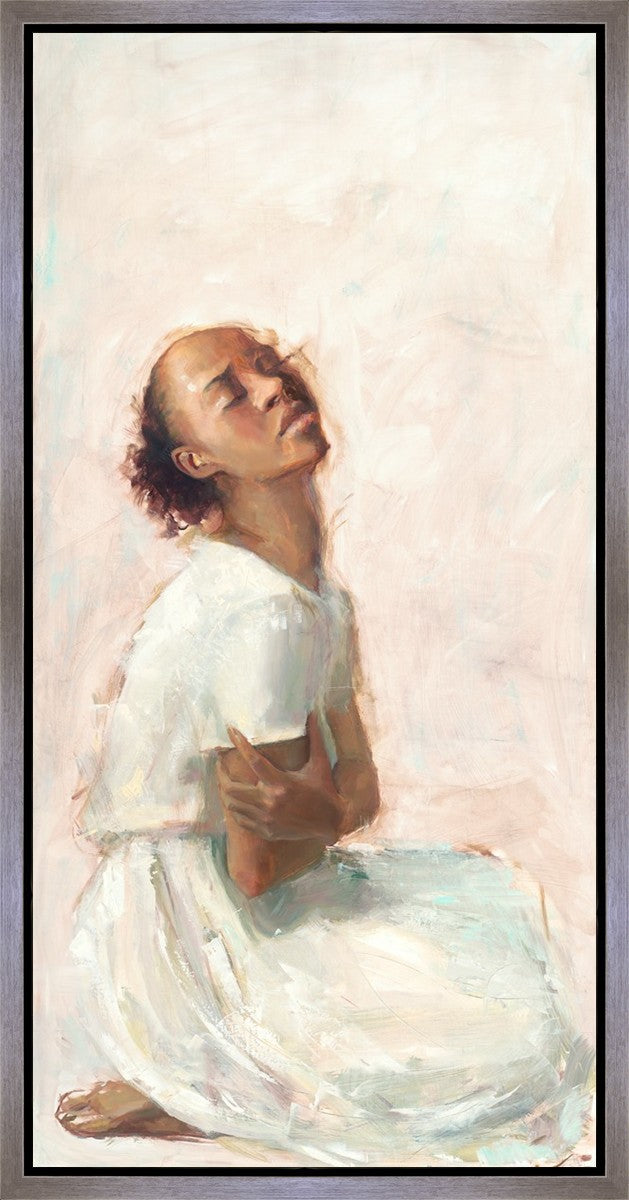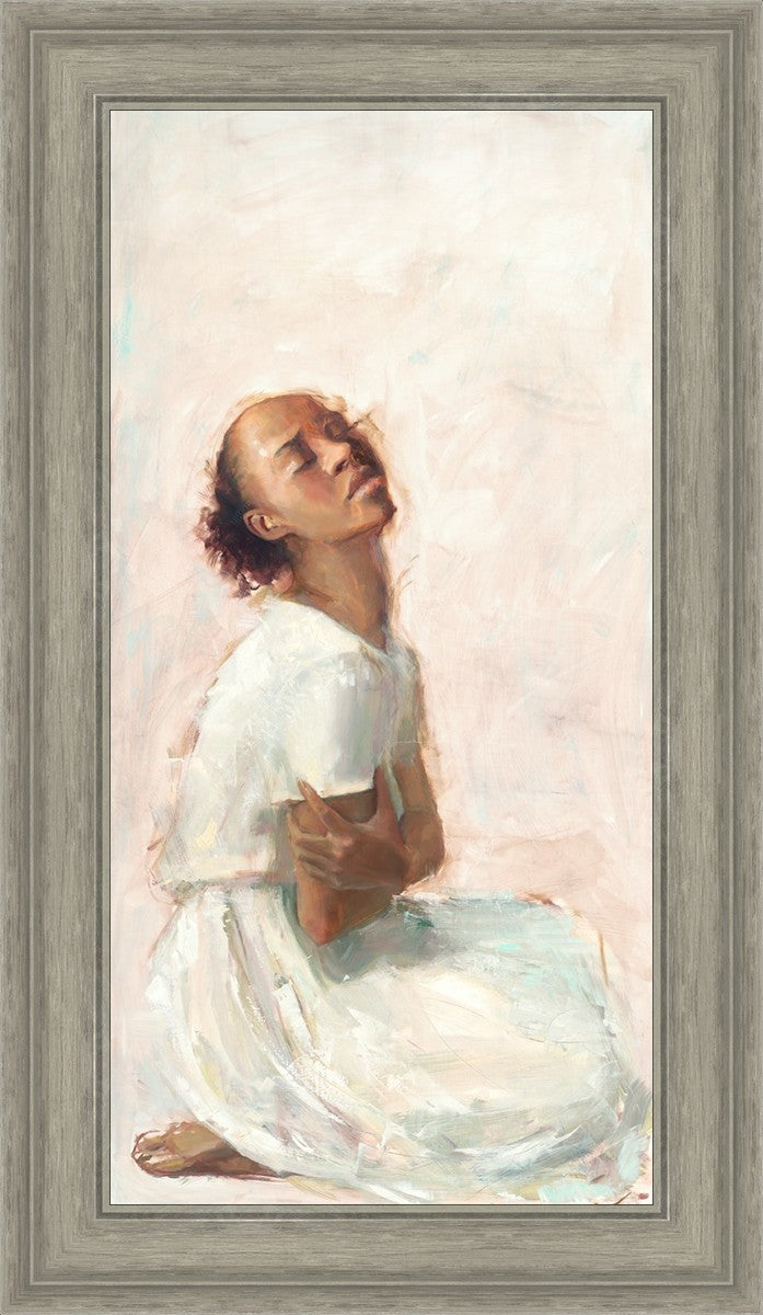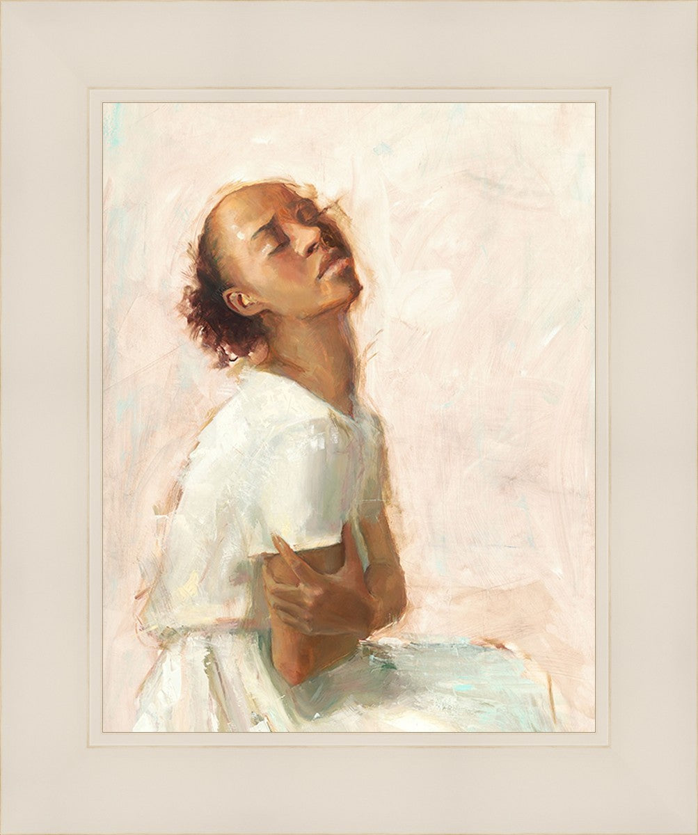 This painting came about while I was struggling to feel adequate. I wanted to be a better person to be closer to my parents in heaven. My inadequacies were acutely painful and paralyzing. I often felt that I was drifting further from heaven, tossed in the sea of my own ineptitude. I set out to make a painting to process this experience. This painting was my prayer to realize a closer relationship with Heavenly Parents and to become more like them. Over time, I felt closer to them and the sharpness of the pain dulled. This relief found its way into the facial expression of the subject. Originally the painting was about the struggle and pain of this experience but I decided to keep a more peaceful face. It mirrored my experience of gaining calm and quiet in the process of drawing closer to Heavenly Mother and Father. Though I still feel inadequate some days, a closer relationship with my Heavenly Parents has taken immobilizing self-doubt and turned it into a more productive and healthy discipleship.