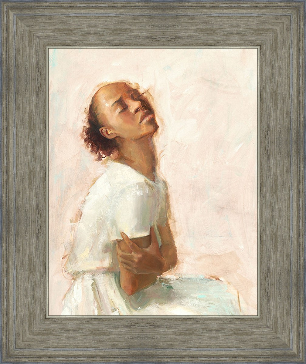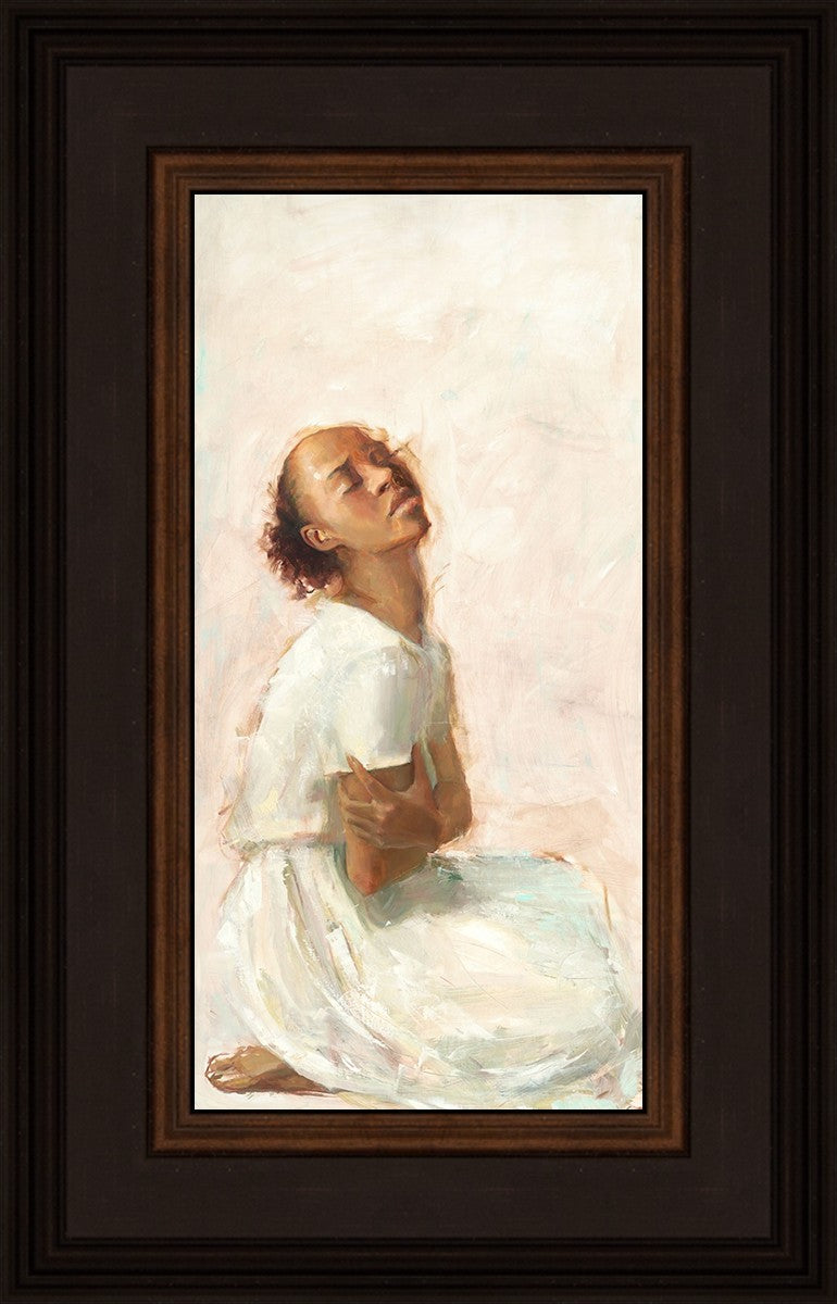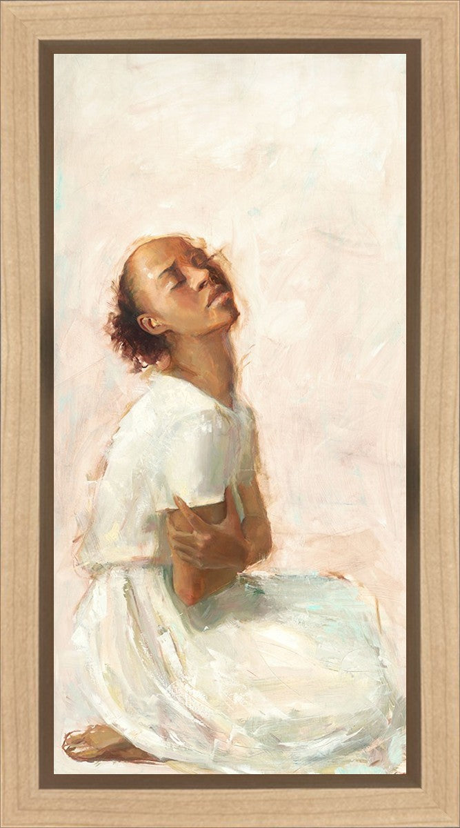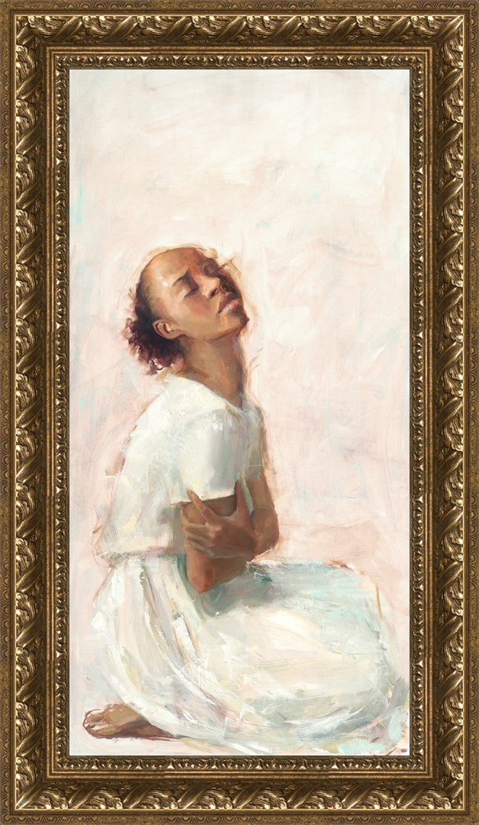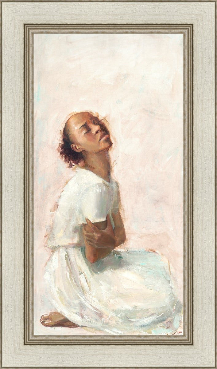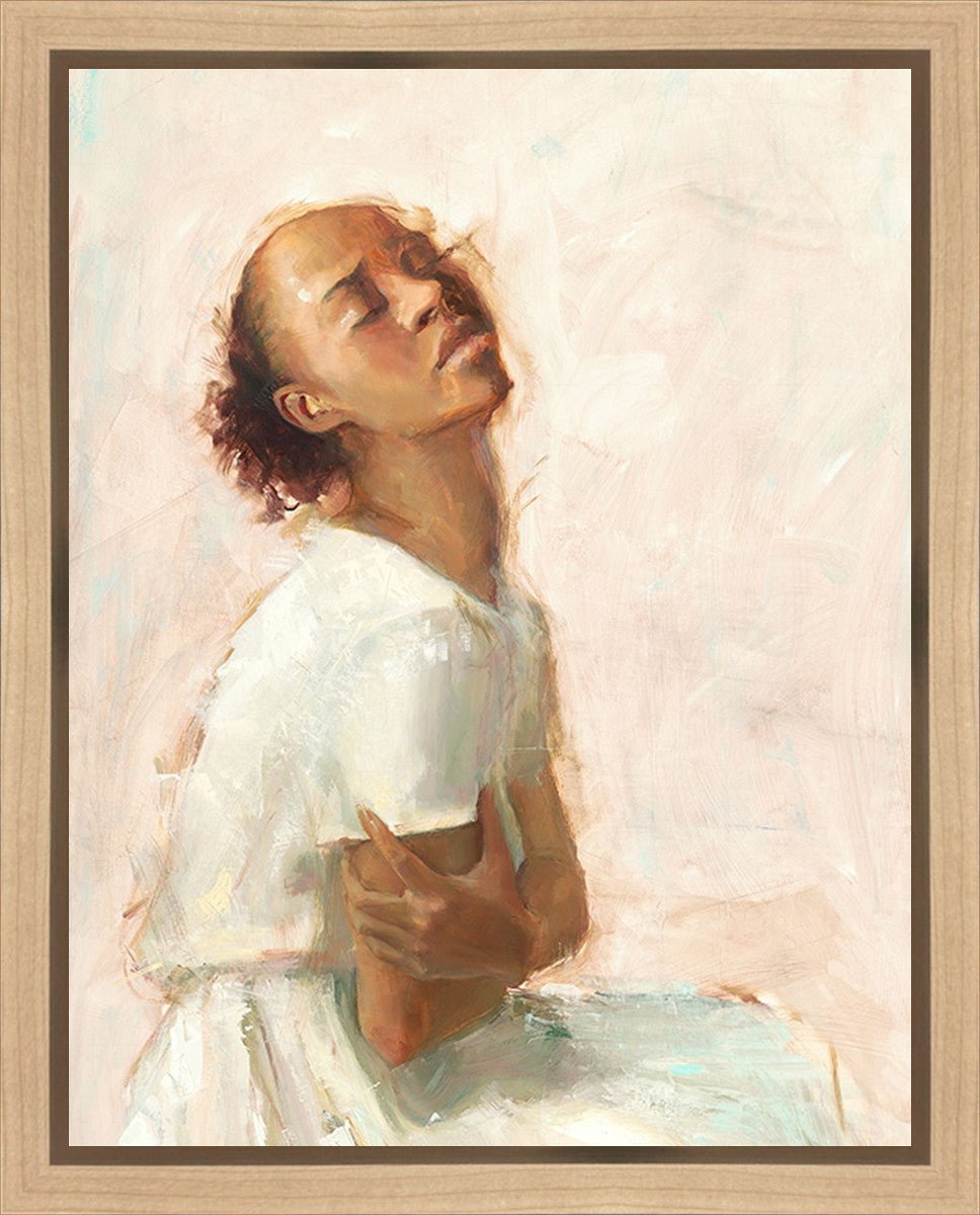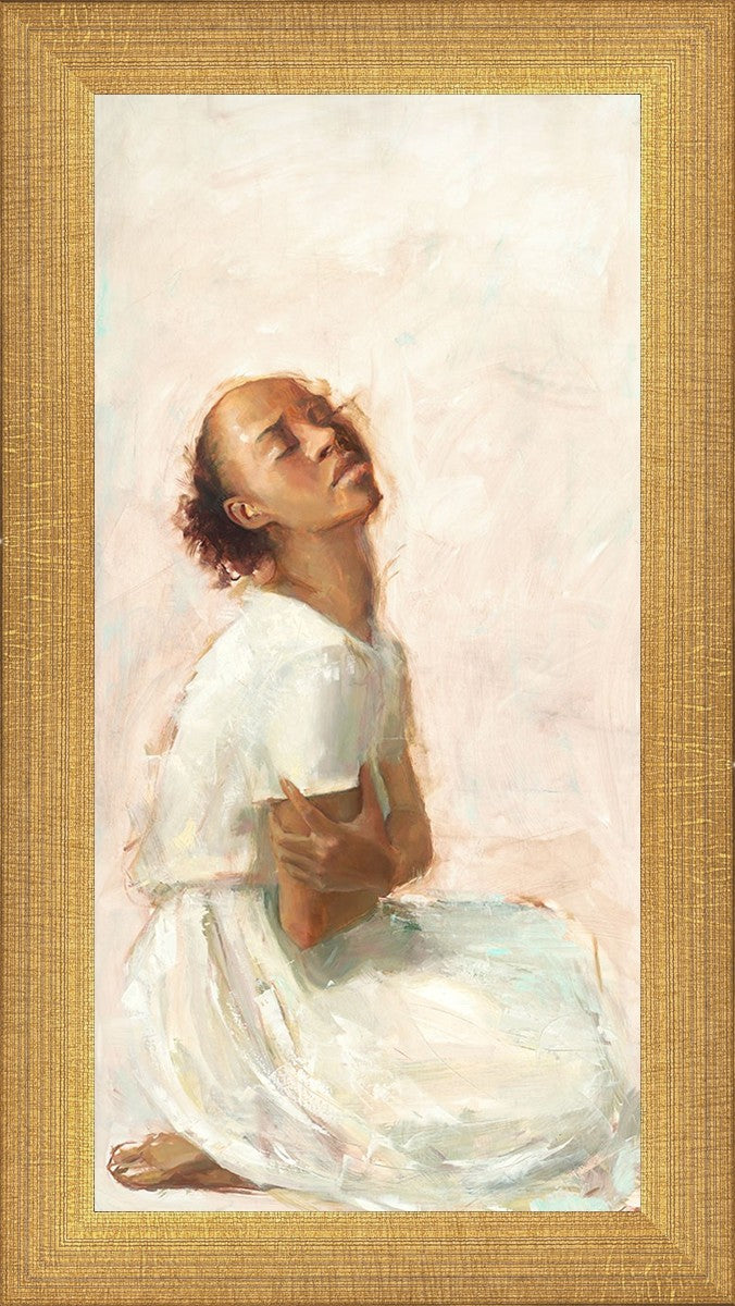 This painting came about while I was struggling to feel adequate. I wanted to be a better person to be closer to my parents in heaven. My inadequacies were acutely painful and paralyzing. I often felt that I was drifting further from heaven, tossed in the sea of my own ineptitude. I set out to make a painting to process this experience. This painting was my prayer to realize a closer relationship with Heavenly Parents and to become more like them. Over time, I felt closer to them and the sharpness of the pain dulled. This relief found its way into the facial expression of the subject. Originally the painting was about the struggle and pain of this experience but I decided to keep a more peaceful face. It mirrored my experience of gaining calm and quiet in the process of drawing closer to Heavenly Mother and Father. Though I still feel inadequate some days, a closer relationship with my Heavenly Parents has taken immobilizing self-doubt and turned it into a more productive and healthy discipleship.