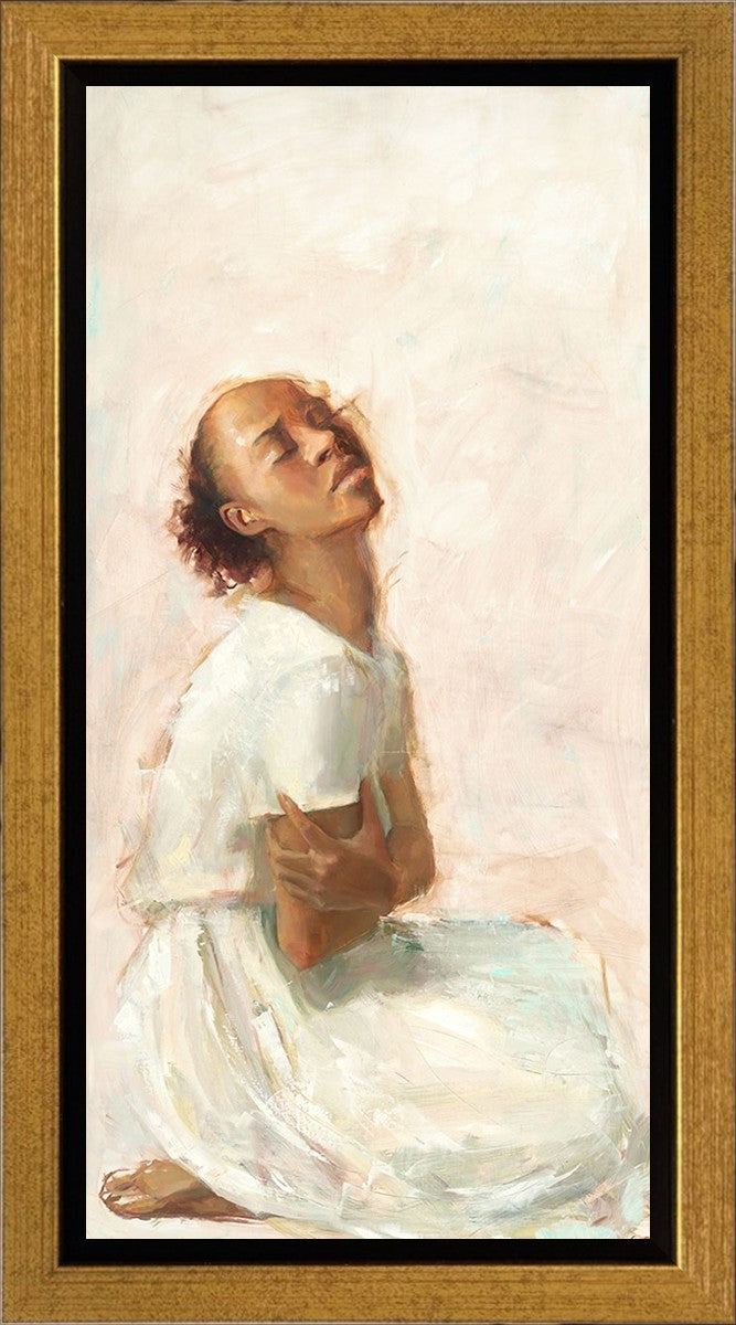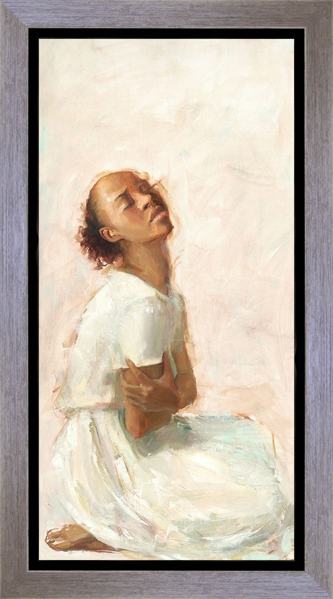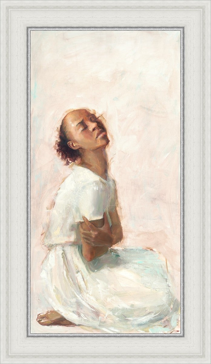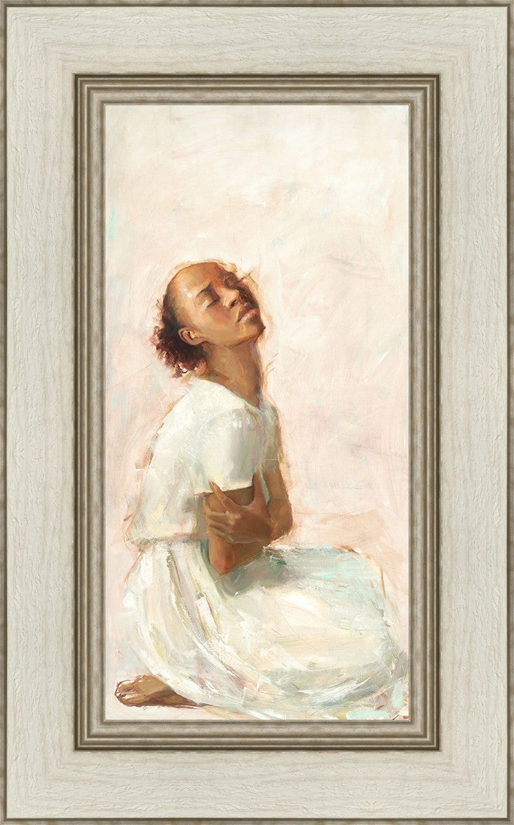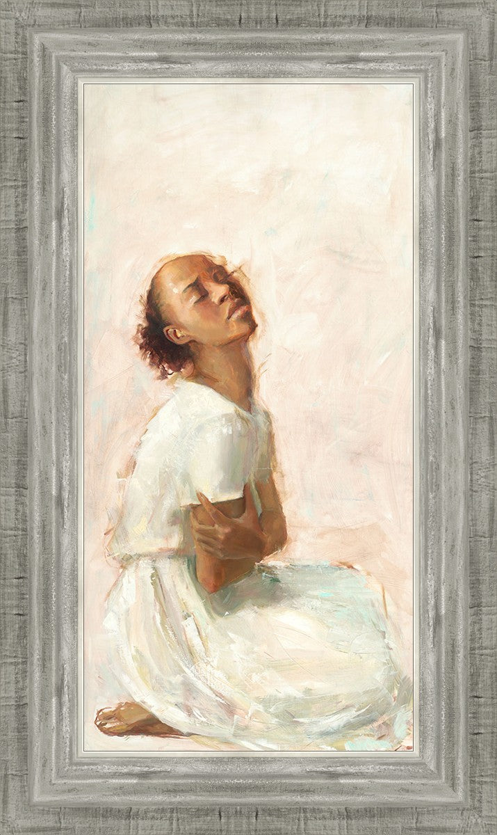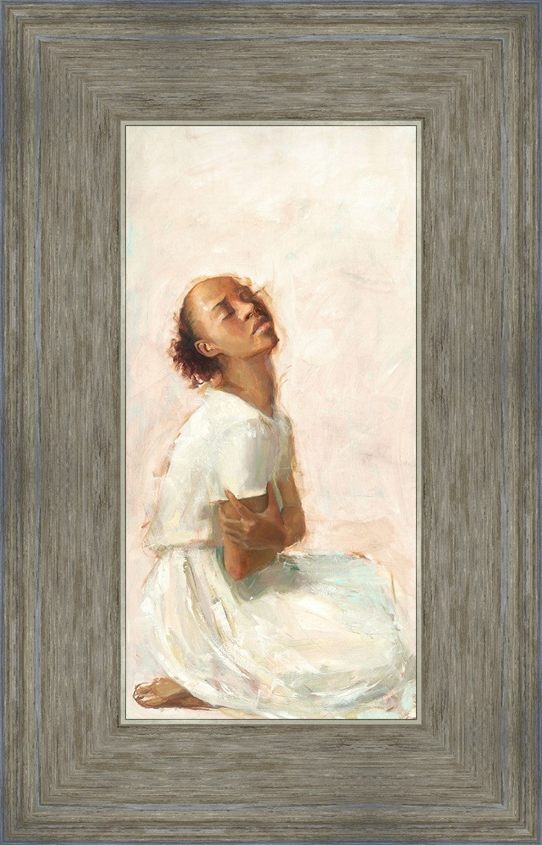 This painting came about while I was struggling to feel adequate. I wanted to be a better person to be closer to my parents in heaven. My inadequacies were acutely painful and paralyzing. I often felt that I was drifting further from heaven, tossed in the sea of my own ineptitude. I set out to make a painting to process this experience. This painting was my prayer to realize a closer relationship with Heavenly Parents and to become more like them. Over time, I felt closer to them and the sharpness of the pain dulled. This relief found its way into the facial expression of the subject. Originally the painting was about the struggle and pain of this experience but I decided to keep a more peaceful face. It mirrored my experience of gaining calm and quiet in the process of drawing closer to Heavenly Mother and Father. Though I still feel inadequate some days, a closer relationship with my Heavenly Parents has taken immobilizing self-doubt and turned it into a more productive and healthy discipleship.