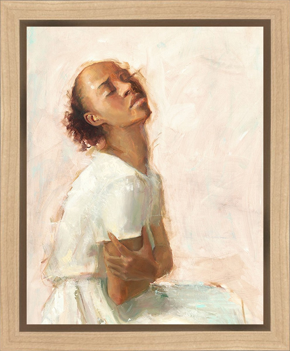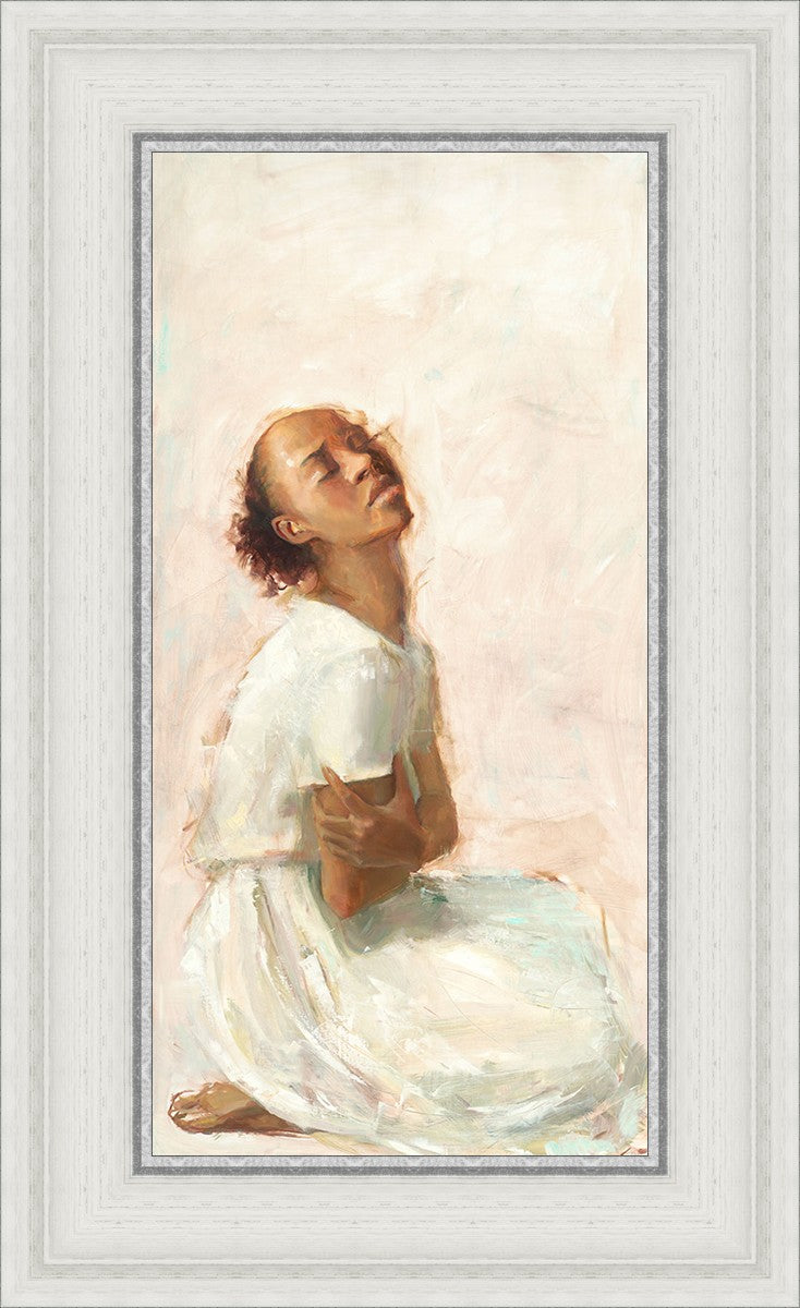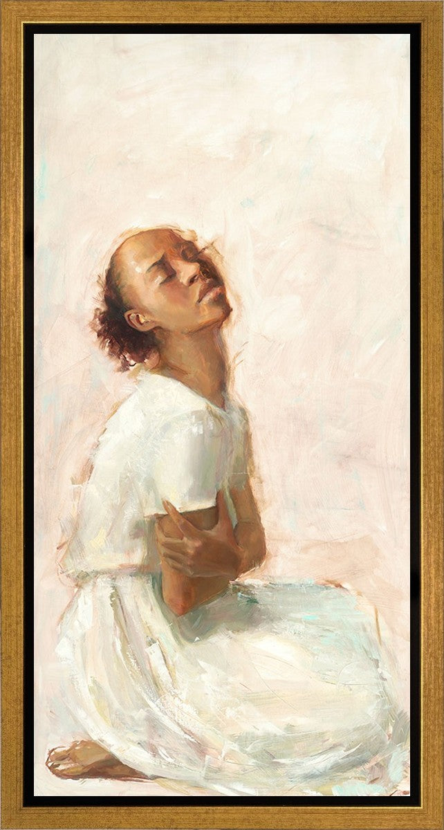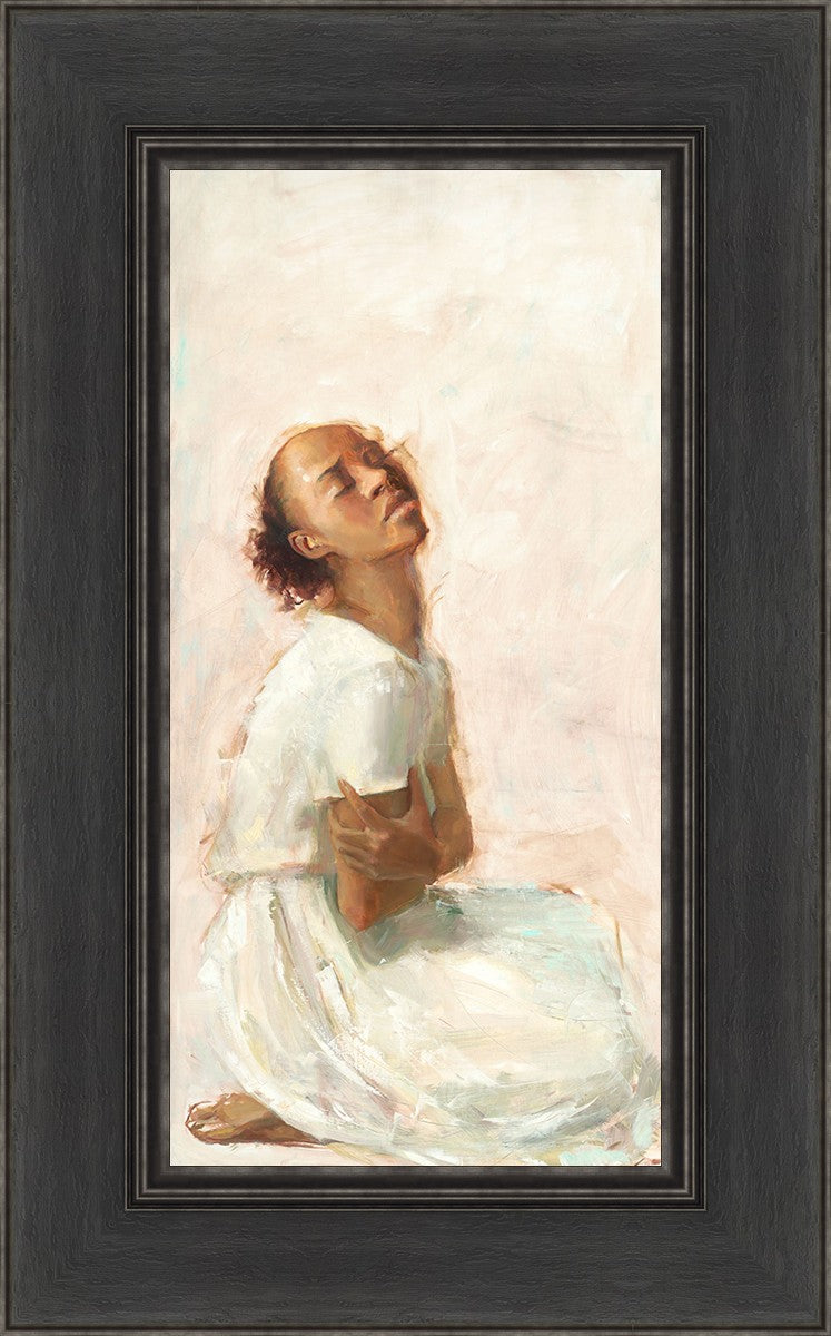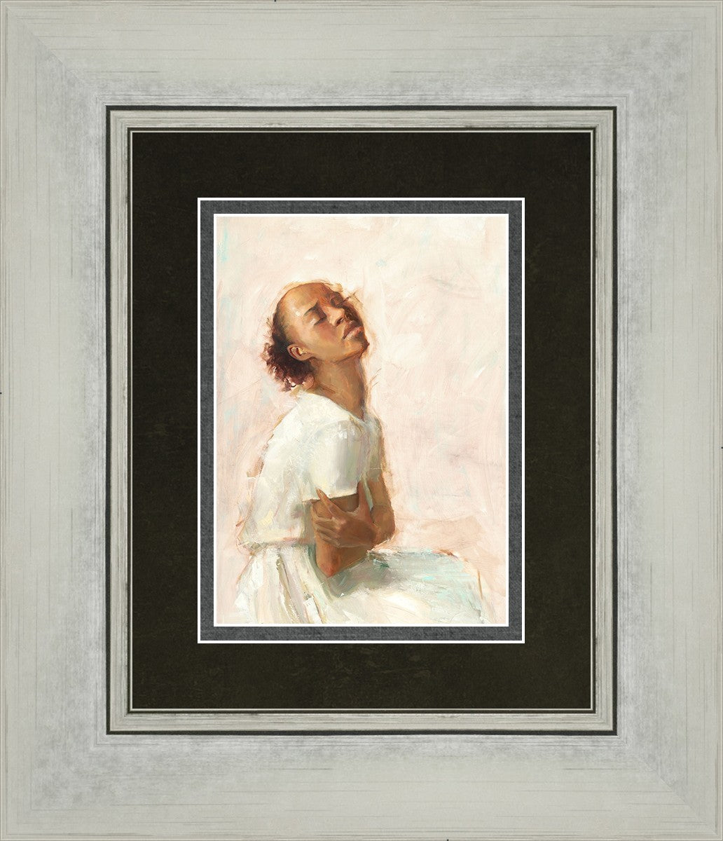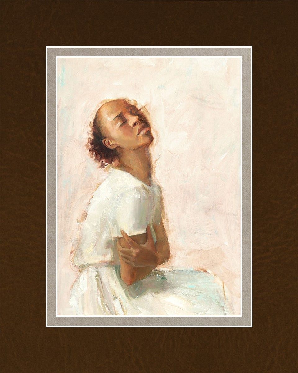 This painting came about while I was struggling to feel adequate. I wanted to be a better person to be closer to my parents in heaven. My inadequacies were acutely painful and paralyzing. I often felt that I was drifting further from heaven, tossed in the sea of my own ineptitude. I set out to make a painting to process this experience. This painting was my prayer to realize a closer relationship with Heavenly Parents and to become more like them. Over time, I felt closer to them and the sharpness of the pain dulled. This relief found its way into the facial expression of the subject. Originally the painting was about the struggle and pain of this experience but I decided to keep a more peaceful face. It mirrored my experience of gaining calm and quiet in the process of drawing closer to Heavenly Mother and Father. Though I still feel inadequate some days, a closer relationship with my Heavenly Parents has taken immobilizing self-doubt and turned it into a more productive and healthy discipleship.