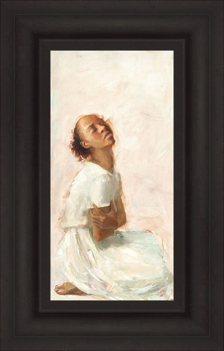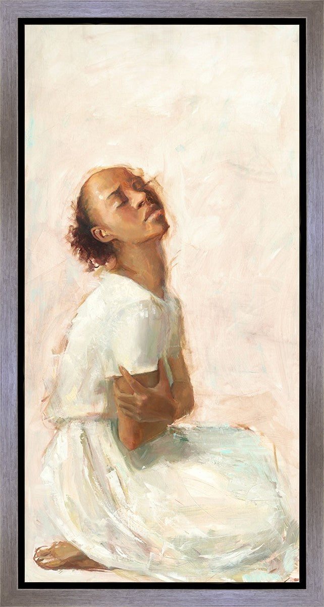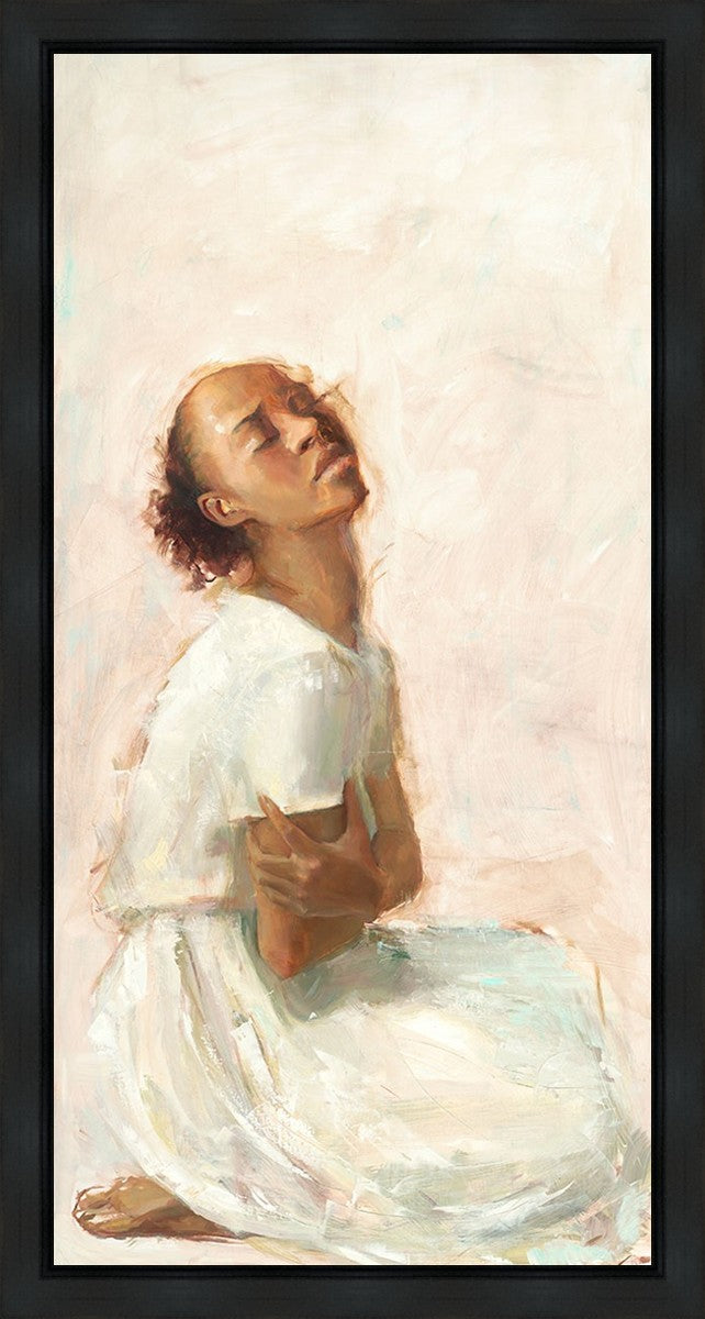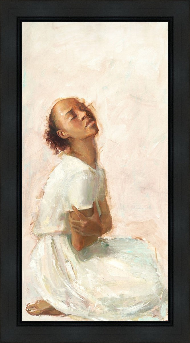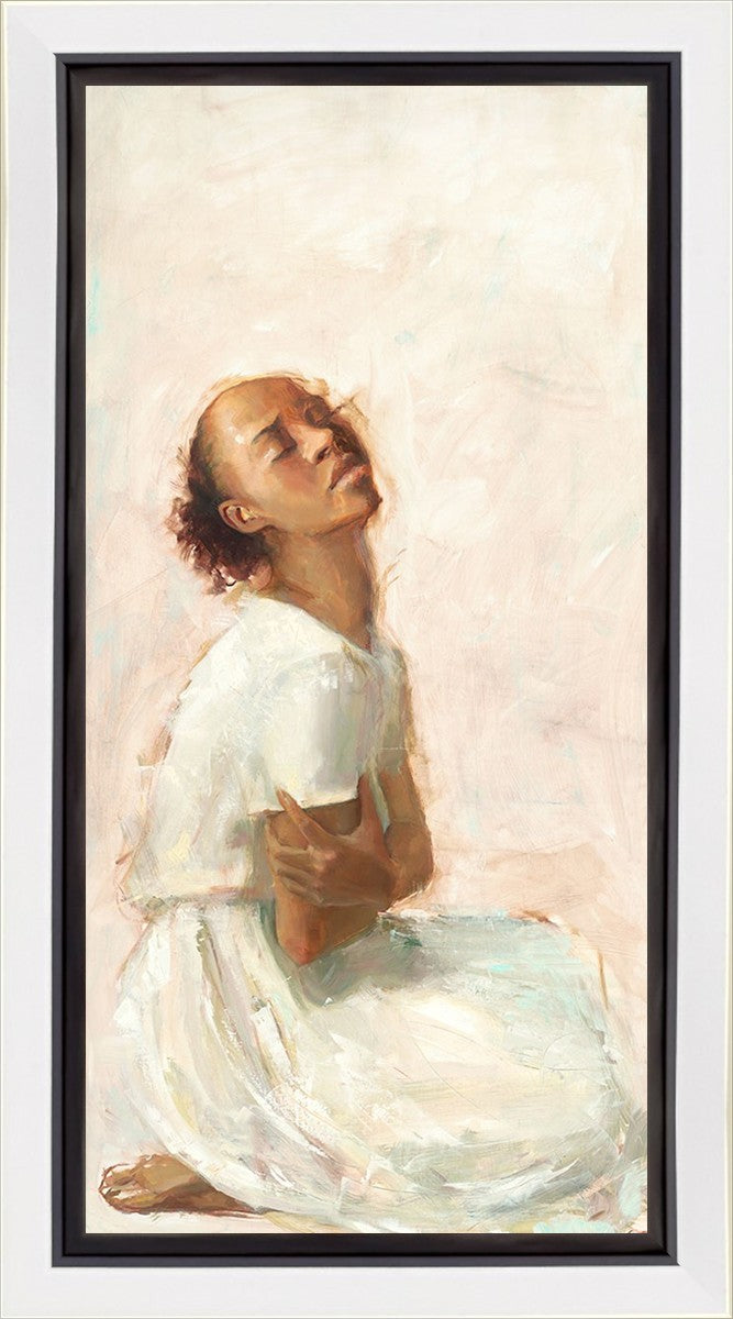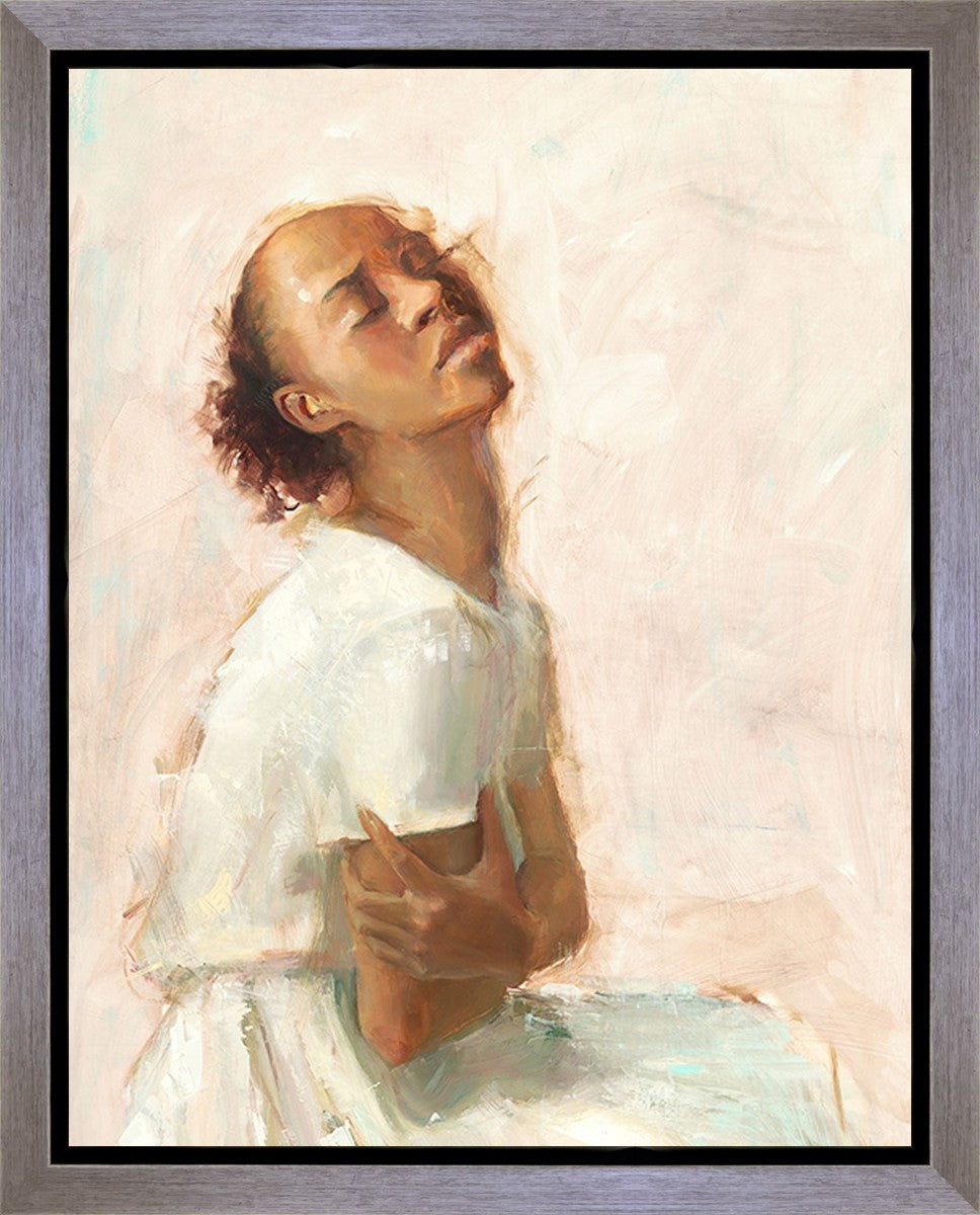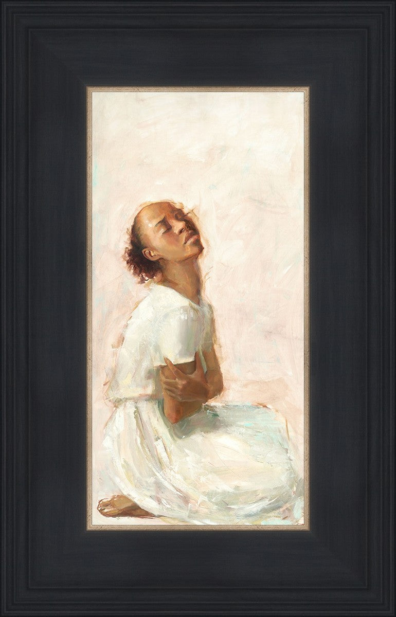 This painting came about while I was struggling to feel adequate. I wanted to be a better person to be closer to my parents in heaven. My inadequacies were acutely painful and paralyzing. I often felt that I was drifting further from heaven, tossed in the sea of my own ineptitude. I set out to make a painting to process this experience. This painting was my prayer to realize a closer relationship with Heavenly Parents and to become more like them. Over time, I felt closer to them and the sharpness of the pain dulled. This relief found its way into the facial expression of the subject. Originally the painting was about the struggle and pain of this experience but I decided to keep a more peaceful face. It mirrored my experience of gaining calm and quiet in the process of drawing closer to Heavenly Mother and Father. Though I still feel inadequate some days, a closer relationship with my Heavenly Parents has taken immobilizing self-doubt and turned it into a more productive and healthy discipleship.