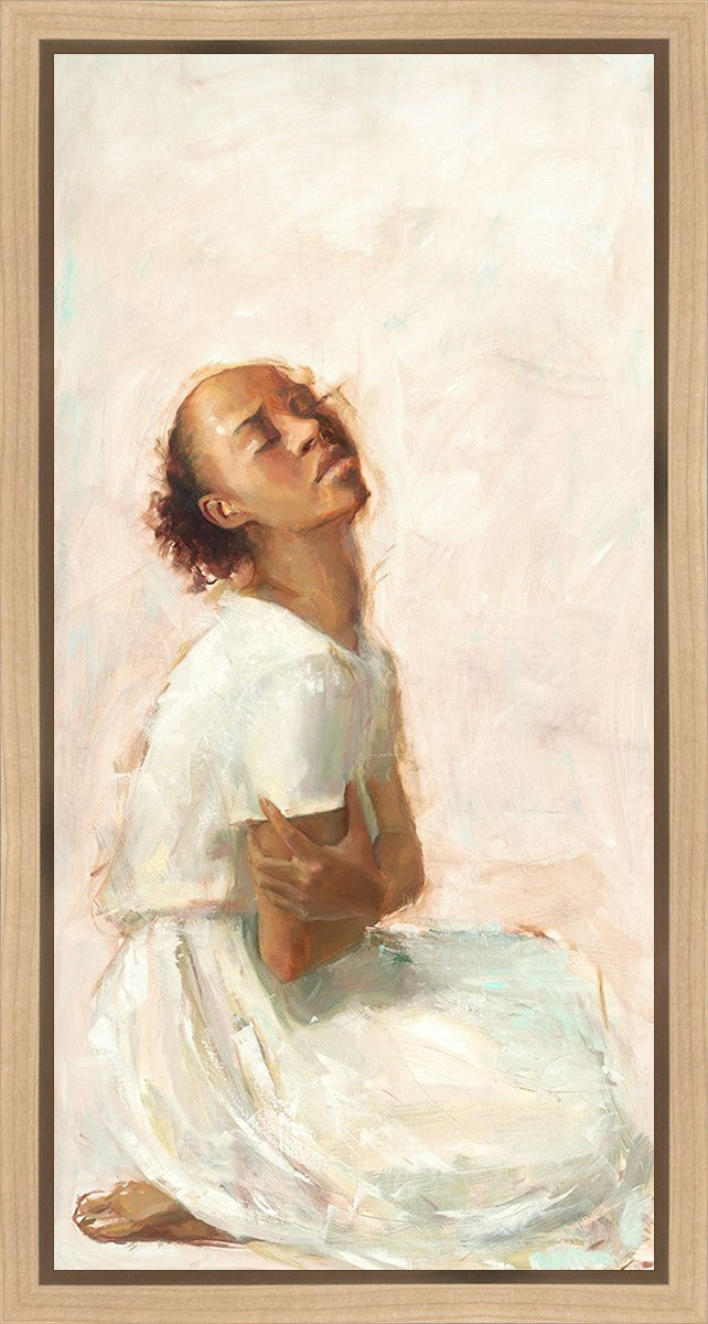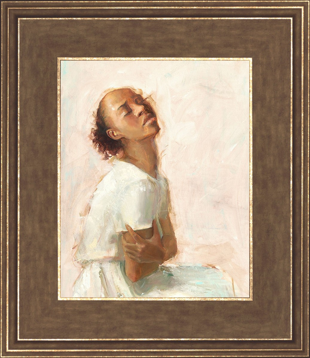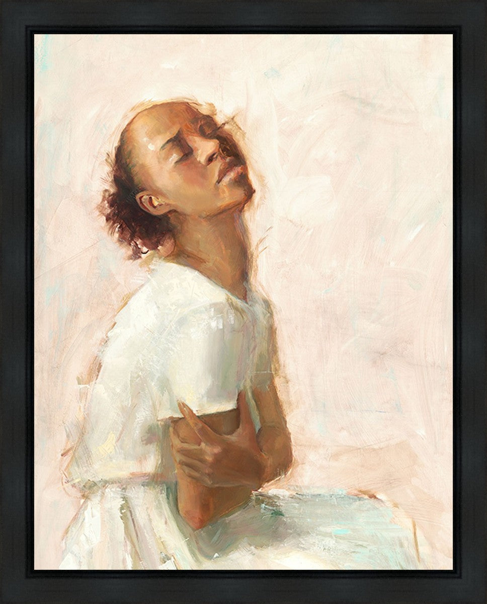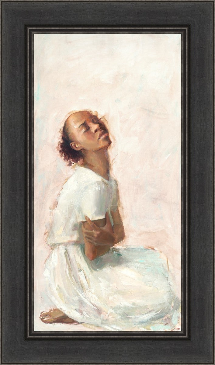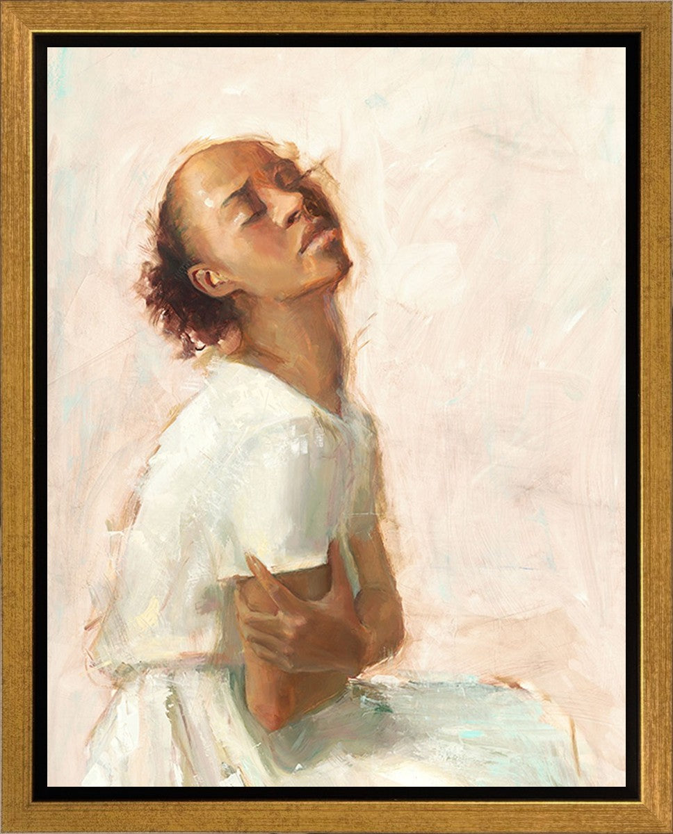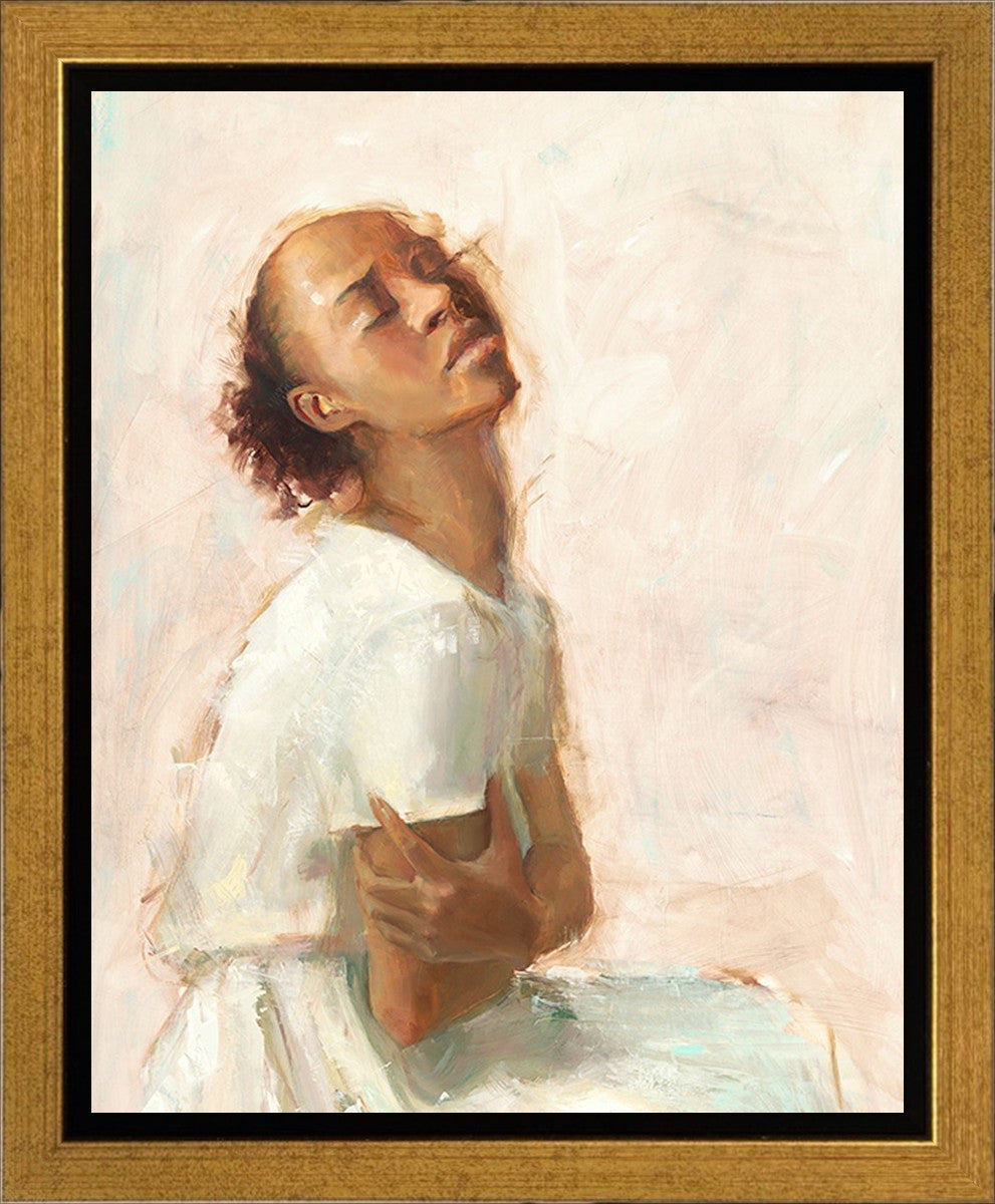 This painting came about while I was struggling to feel adequate. I wanted to be a better person to be closer to my parents in heaven. My inadequacies were acutely painful and paralyzing. I often felt that I was drifting further from heaven, tossed in the sea of my own ineptitude. I set out to make a painting to process this experience. This painting was my prayer to realize a closer relationship with Heavenly Parents and to become more like them. Over time, I felt closer to them and the sharpness of the pain dulled. This relief found its way into the facial expression of the subject. Originally the painting was about the struggle and pain of this experience but I decided to keep a more peaceful face. It mirrored my experience of gaining calm and quiet in the process of drawing closer to Heavenly Mother and Father. Though I still feel inadequate some days, a closer relationship with my Heavenly Parents has taken immobilizing self-doubt and turned it into a more productive and healthy discipleship.