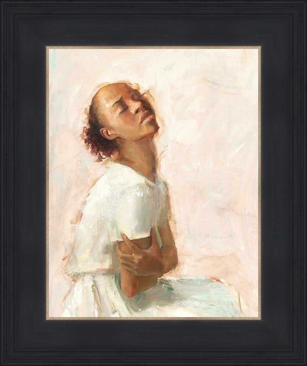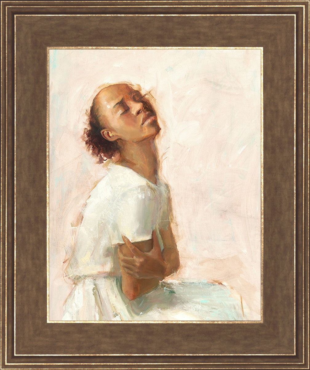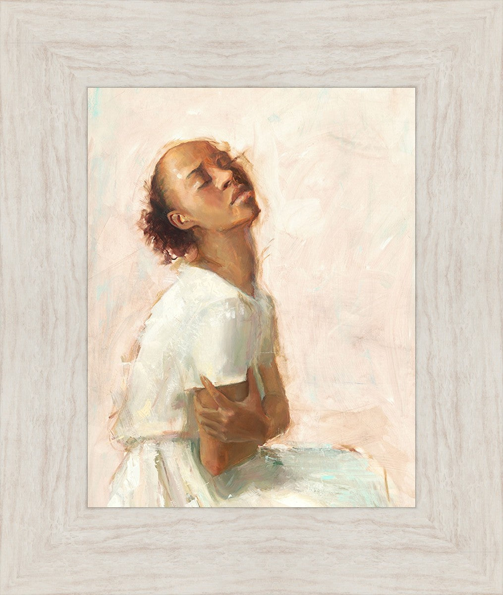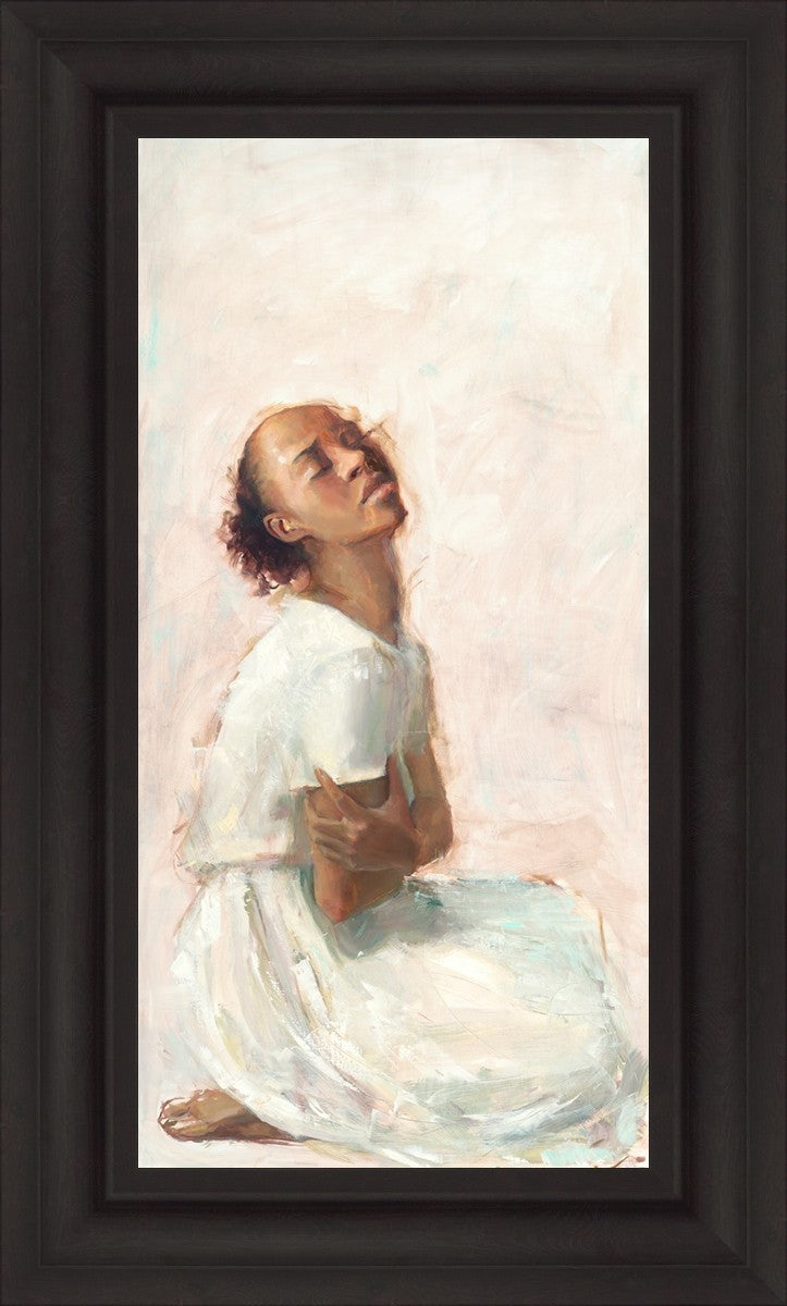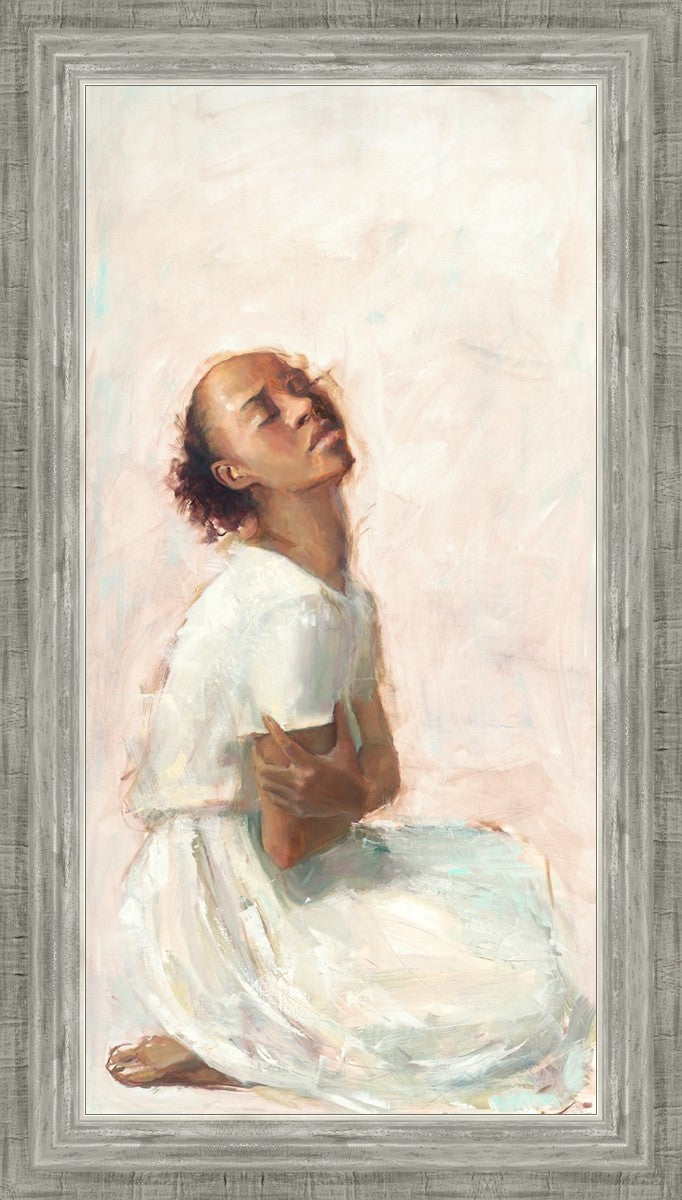 This painting came about while I was struggling to feel adequate. I wanted to be a better person to be closer to my parents in heaven. My inadequacies were acutely painful and paralyzing. I often felt that I was drifting further from heaven, tossed in the sea of my own ineptitude. I set out to make a painting to process this experience. This painting was my prayer to realize a closer relationship with Heavenly Parents and to become more like them. Over time, I felt closer to them and the sharpness of the pain dulled. This relief found its way into the facial expression of the subject. Originally the painting was about the struggle and pain of this experience but I decided to keep a more peaceful face. It mirrored my experience of gaining calm and quiet in the process of drawing closer to Heavenly Mother and Father. Though I still feel inadequate some days, a closer relationship with my Heavenly Parents has taken immobilizing self-doubt and turned it into a more productive and healthy discipleship.
