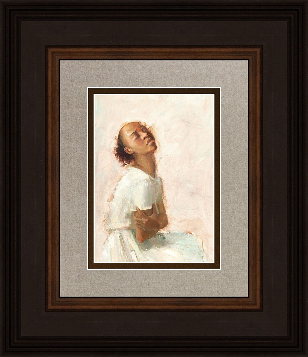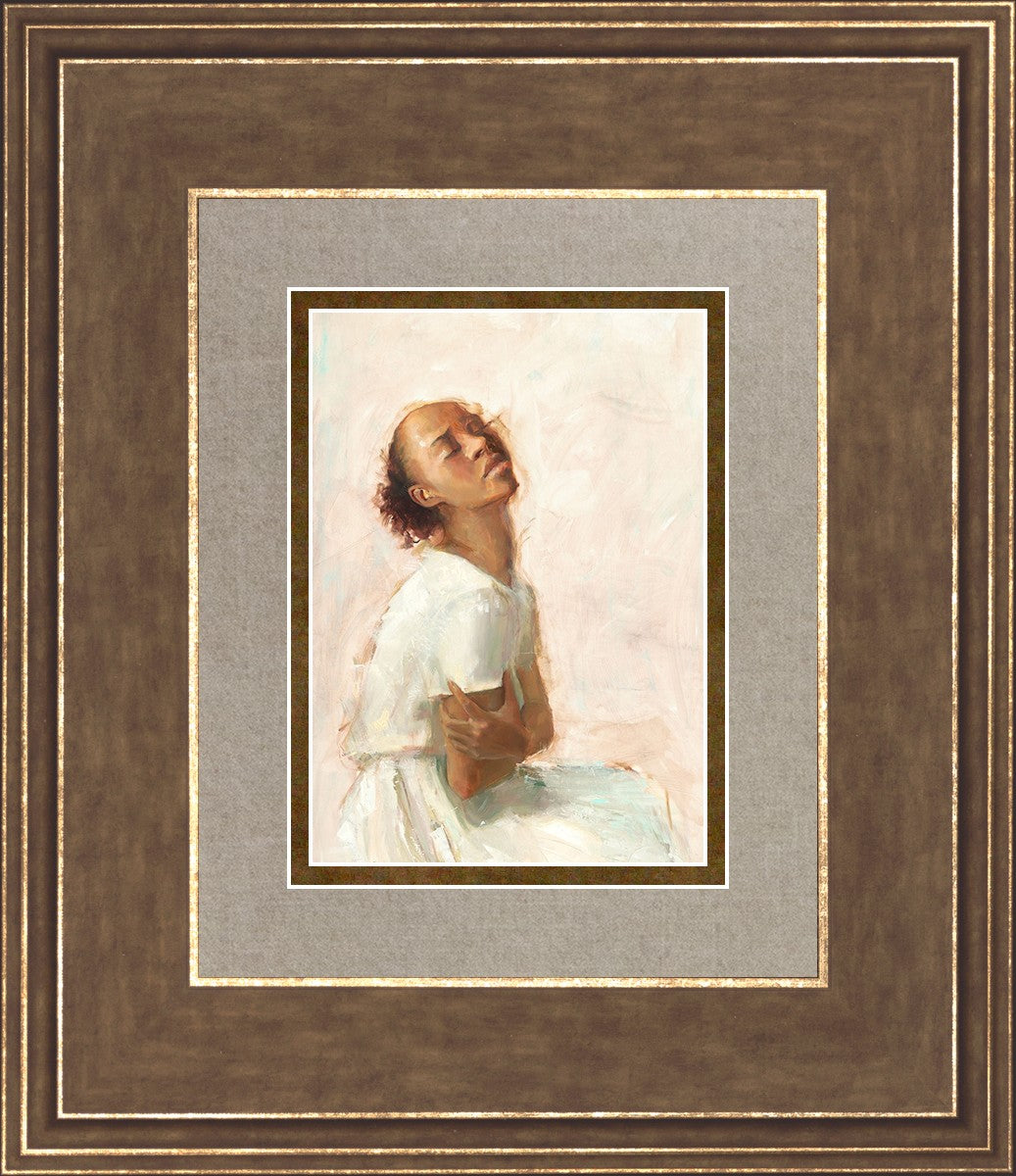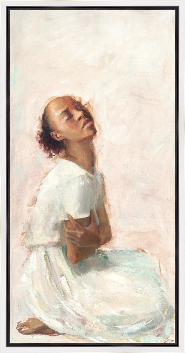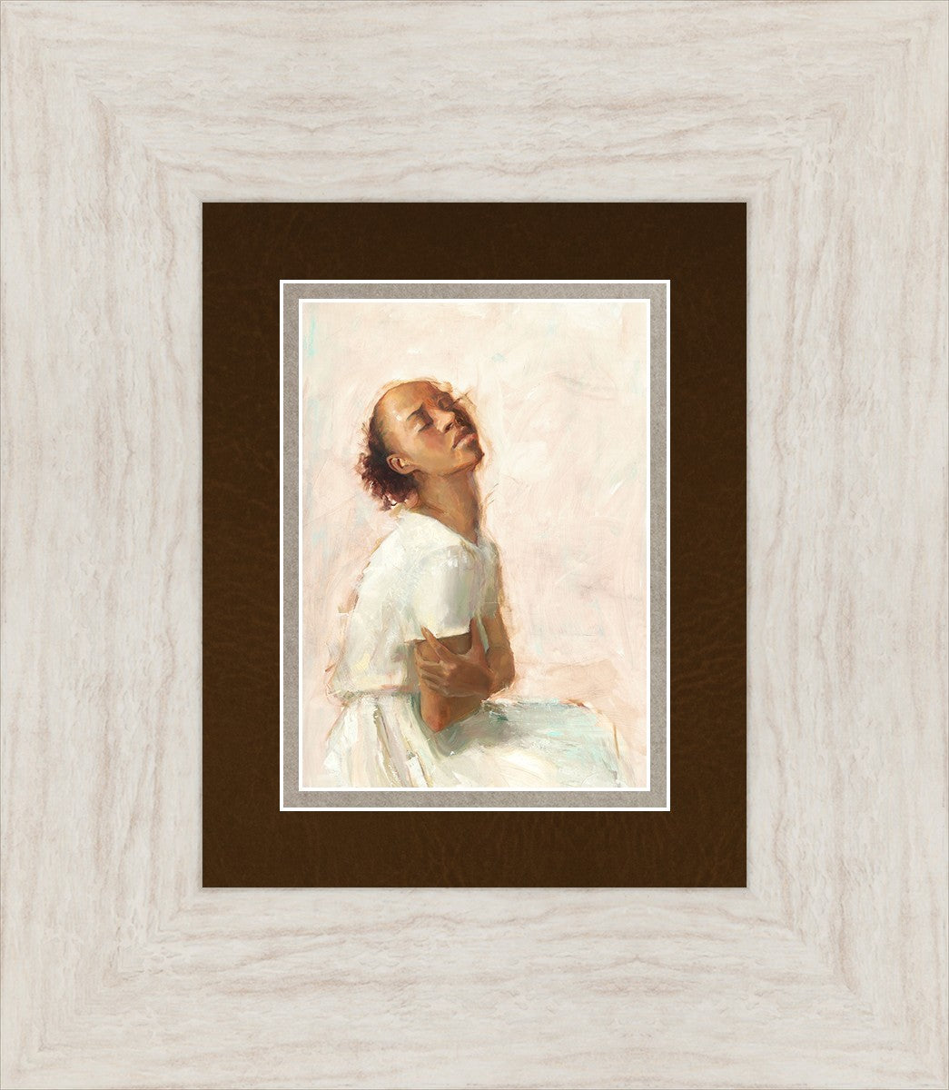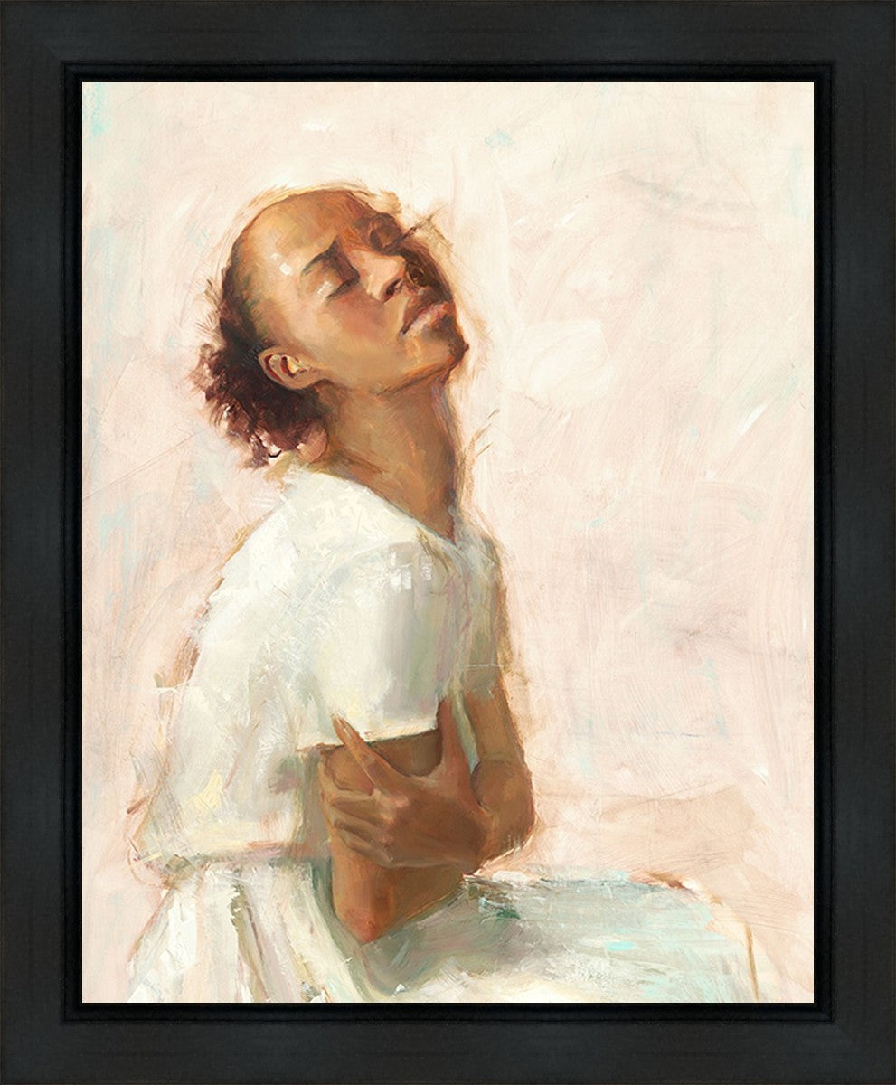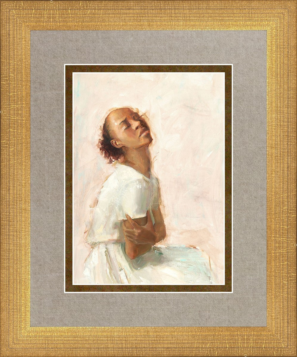 This painting came about while I was struggling to feel adequate. I wanted to be a better person to be closer to my parents in heaven. My inadequacies were acutely painful and paralyzing. I often felt that I was drifting further from heaven, tossed in the sea of my own ineptitude. I set out to make a painting to process this experience. This painting was my prayer to realize a closer relationship with Heavenly Parents and to become more like them. Over time, I felt closer to them and the sharpness of the pain dulled. This relief found its way into the facial expression of the subject. Originally the painting was about the struggle and pain of this experience but I decided to keep a more peaceful face. It mirrored my experience of gaining calm and quiet in the process of drawing closer to Heavenly Mother and Father. Though I still feel inadequate some days, a closer relationship with my Heavenly Parents has taken immobilizing self-doubt and turned it into a more productive and healthy discipleship.