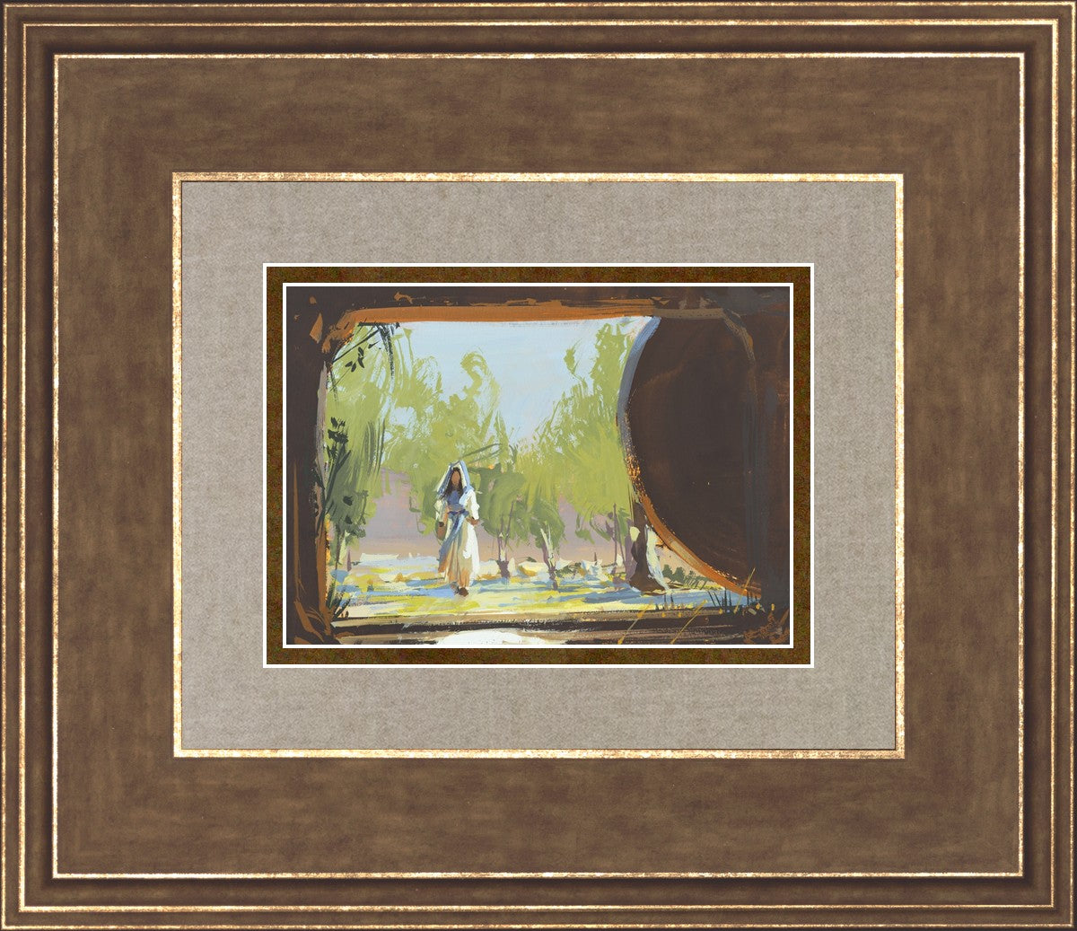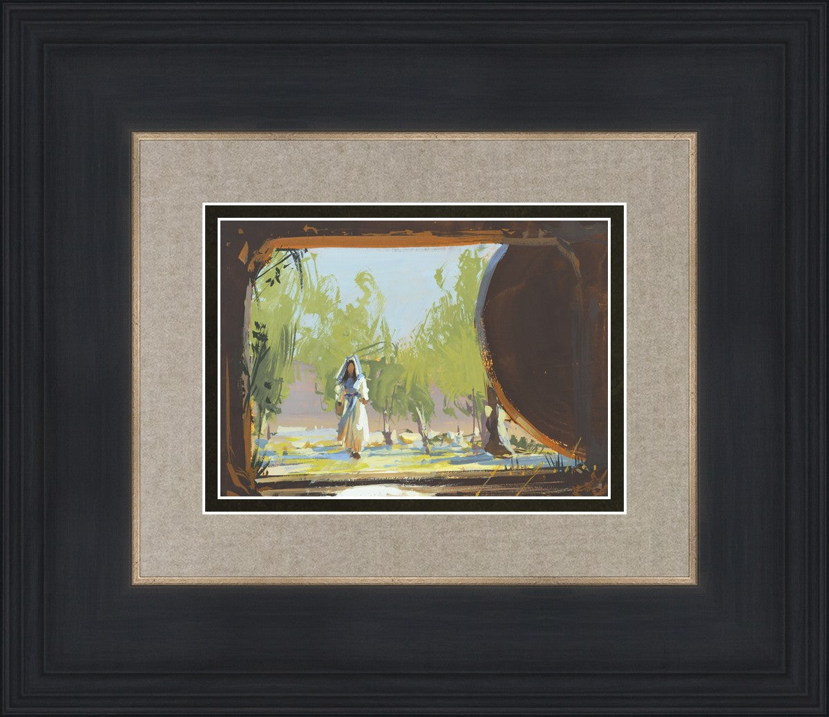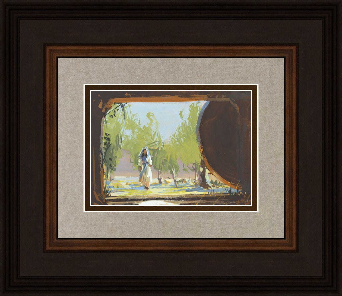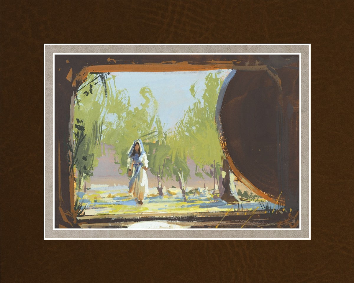 We are viewing from the tomb out to the world where a woman in a cream and blue dress is approaching. The tomb is empty and a round stone is on the right side of the frame. Everything in the tomb is dark and silhouetted. There are stairs leading up from the tomb. It is a bright spring morning with trees behind the woman.