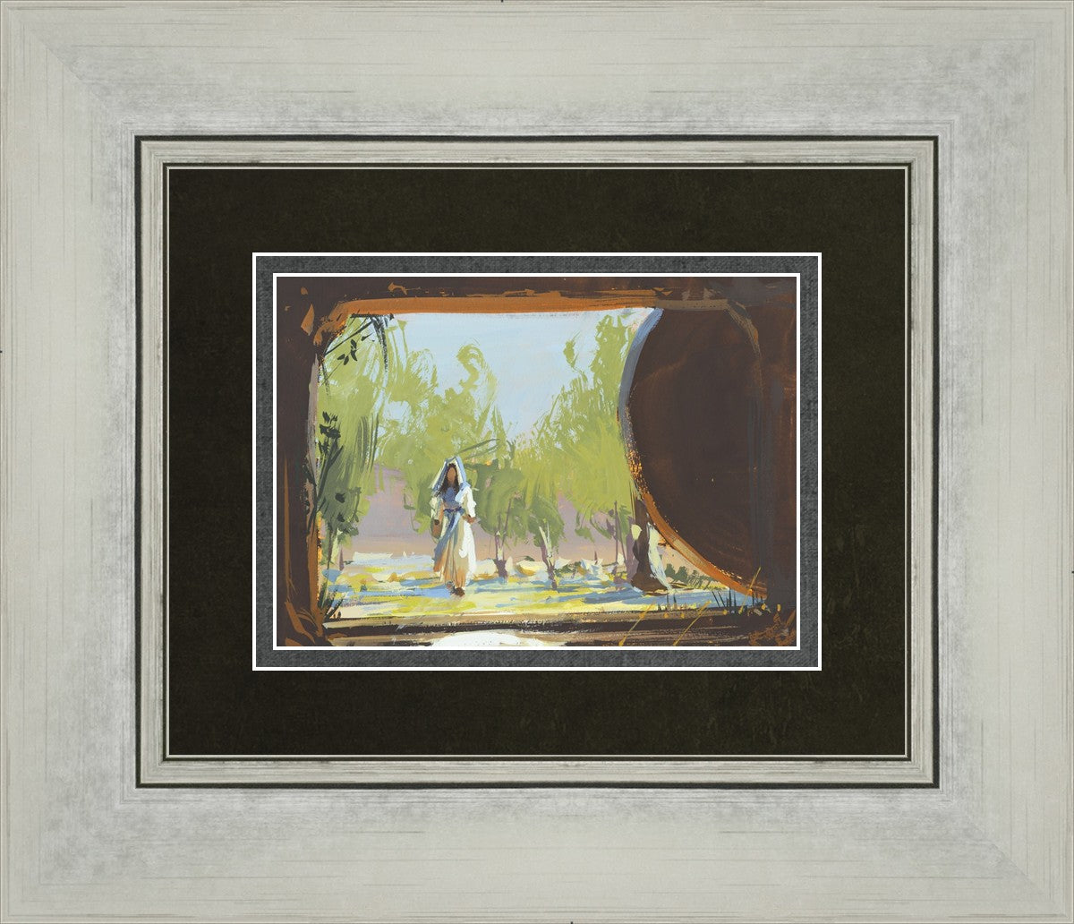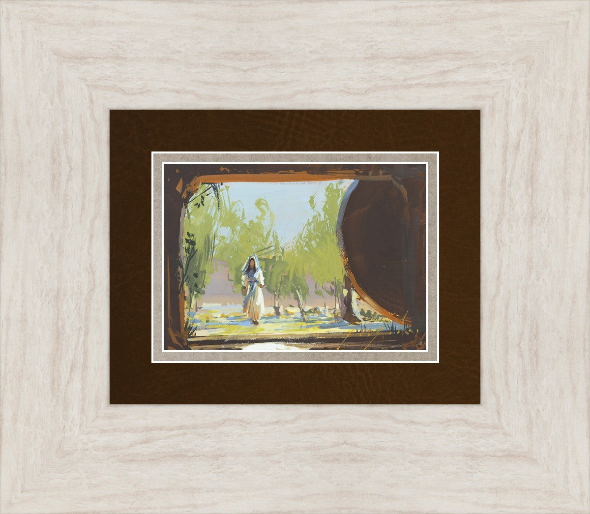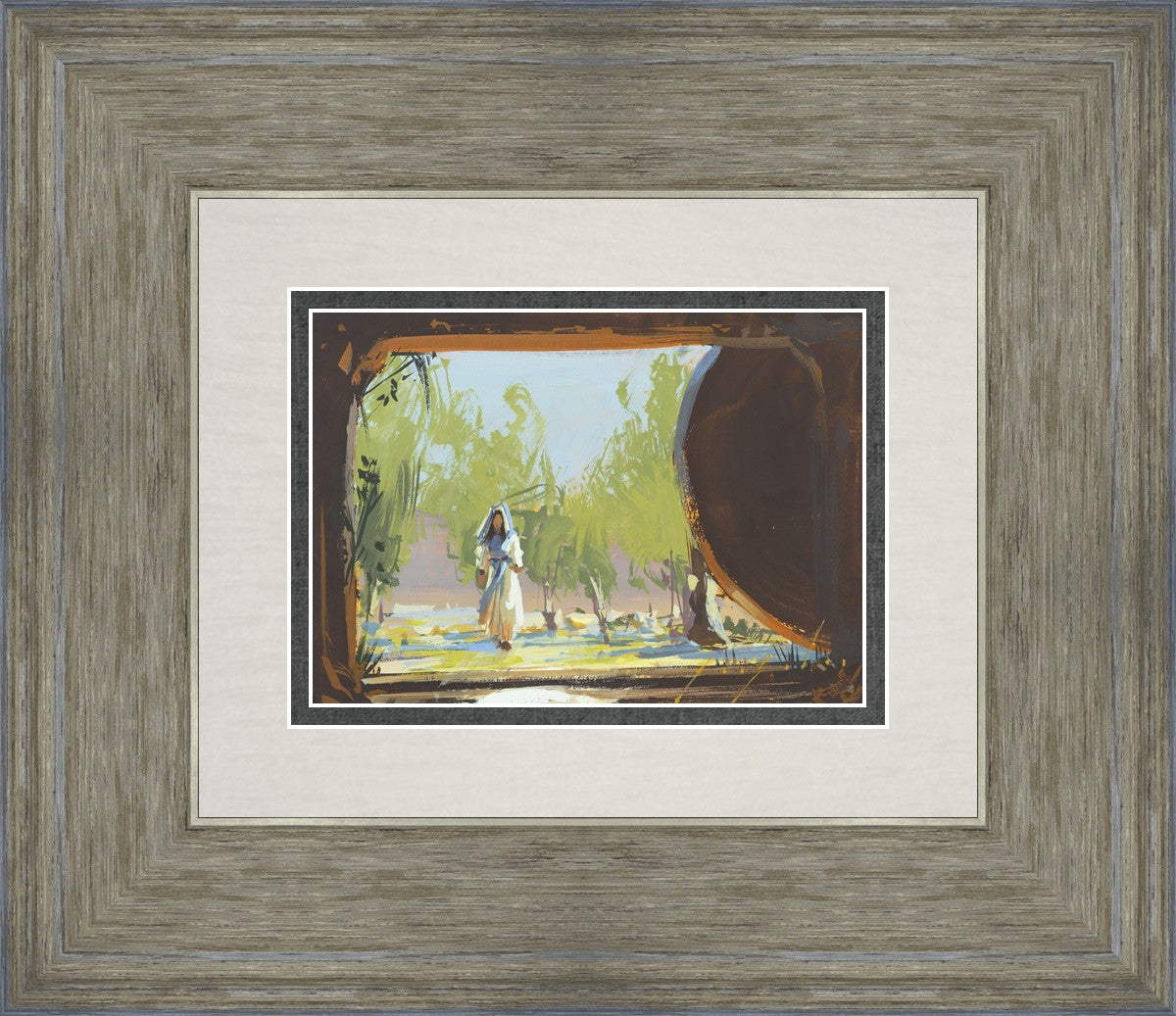 We are viewing from the tomb out to the world where a woman in a cream and blue dress is approaching. The tomb is empty and a round stone is on the right side of the frame. Everything in the tomb is dark and silhouetted. There are stairs leading up from the tomb. It is a bright spring morning with trees behind the woman.