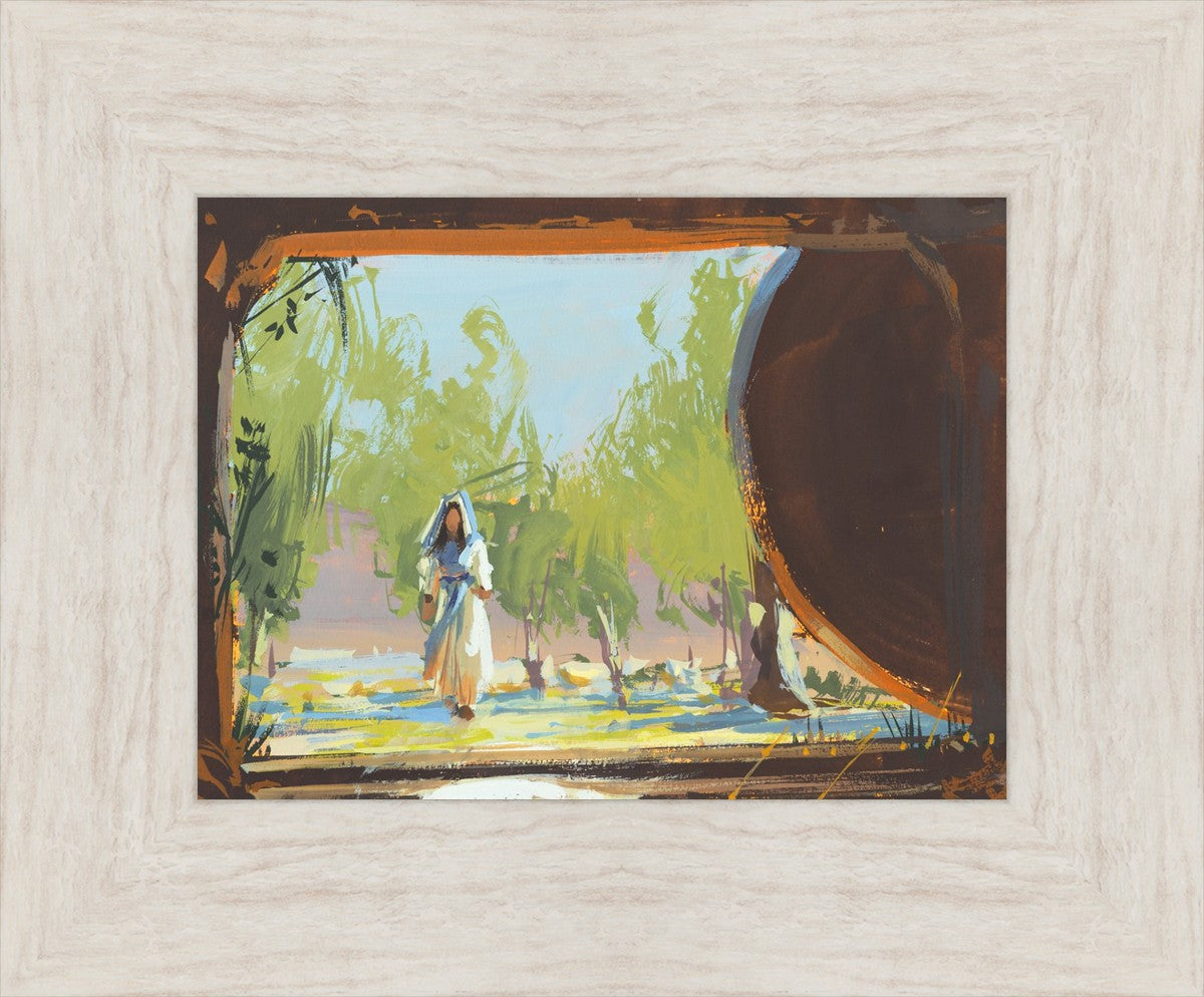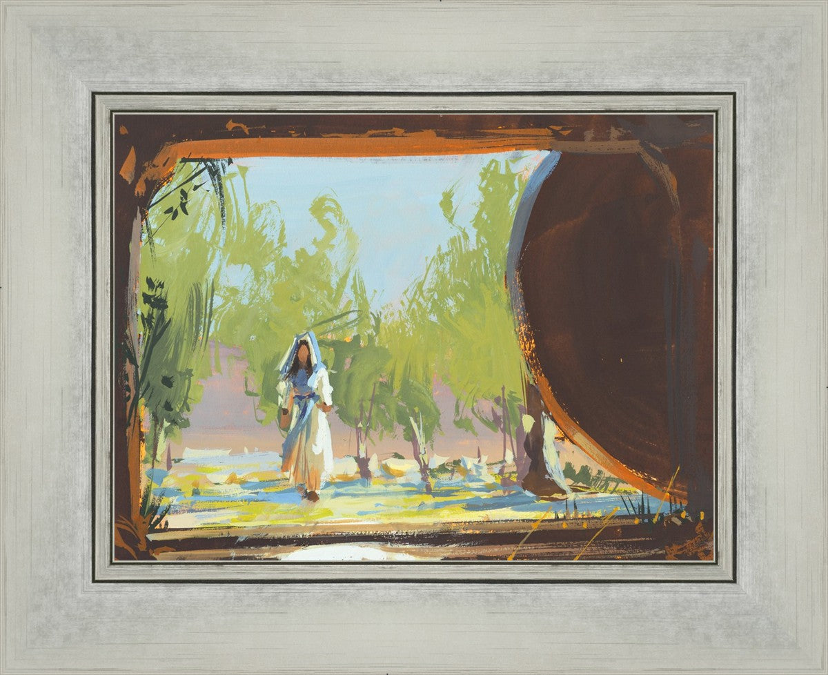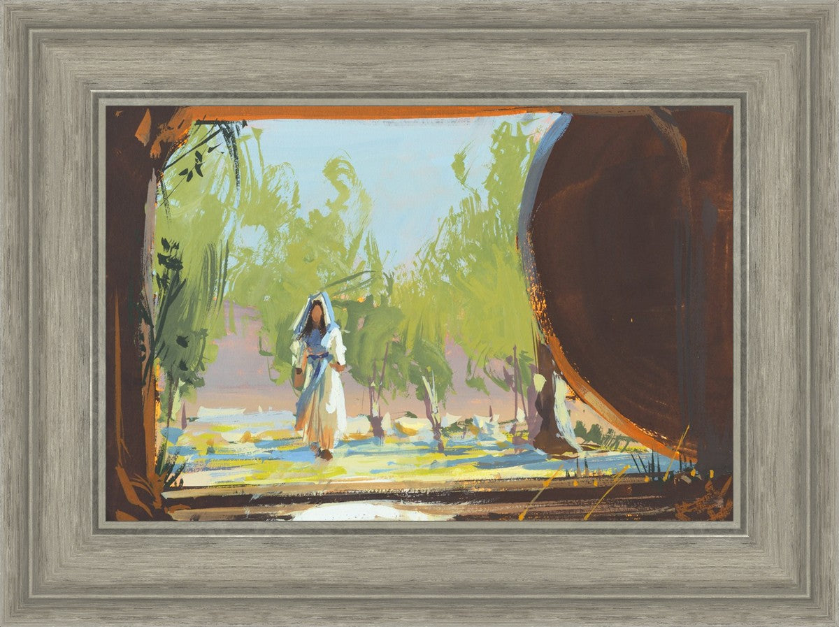 This is when Mary Magdalene approached the empty tomb where Christ was buried and where she found his body not there. This is moments before she knew that. She sees the stone rolled away and perhaps is starting to feel some anxiety that something is wrong. This story is so beautiful. As far as we know, she was the first to see the risen Lord.
