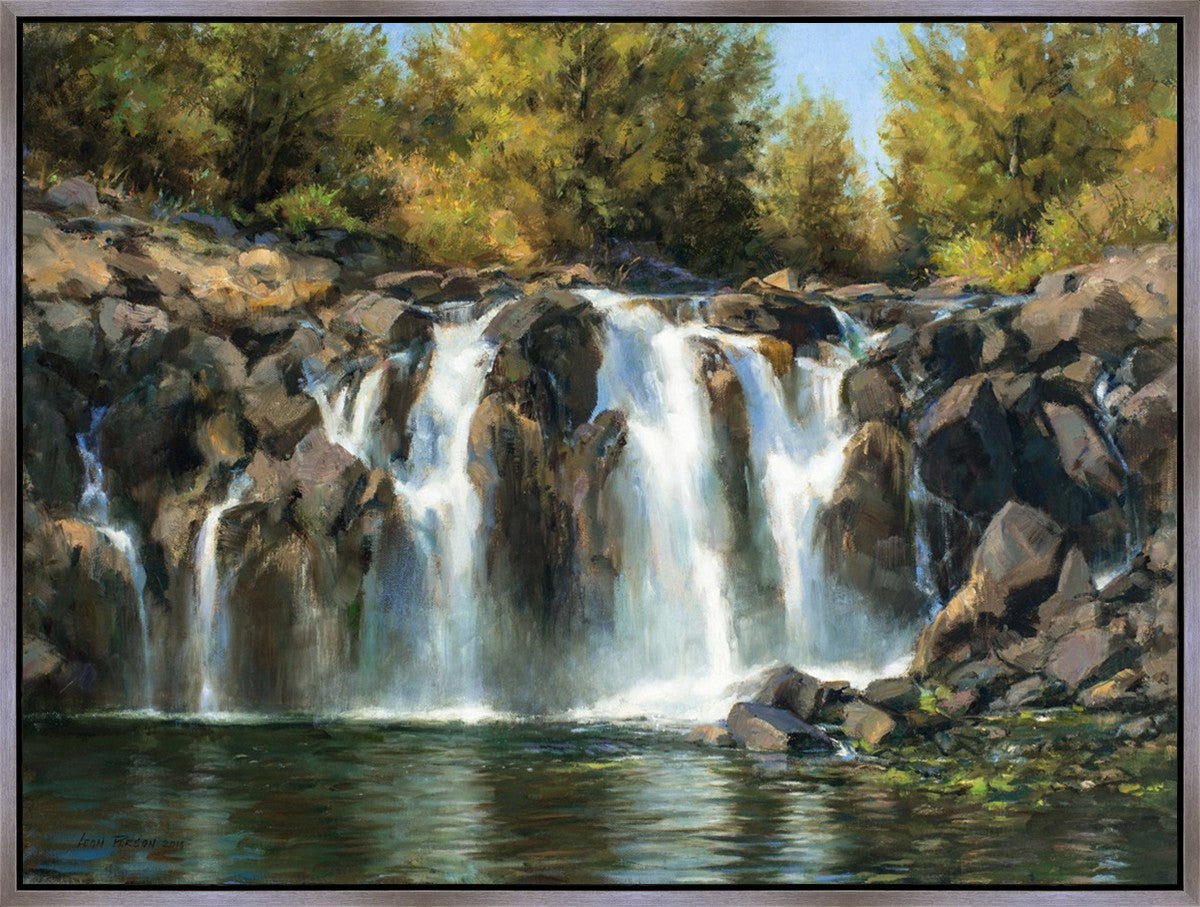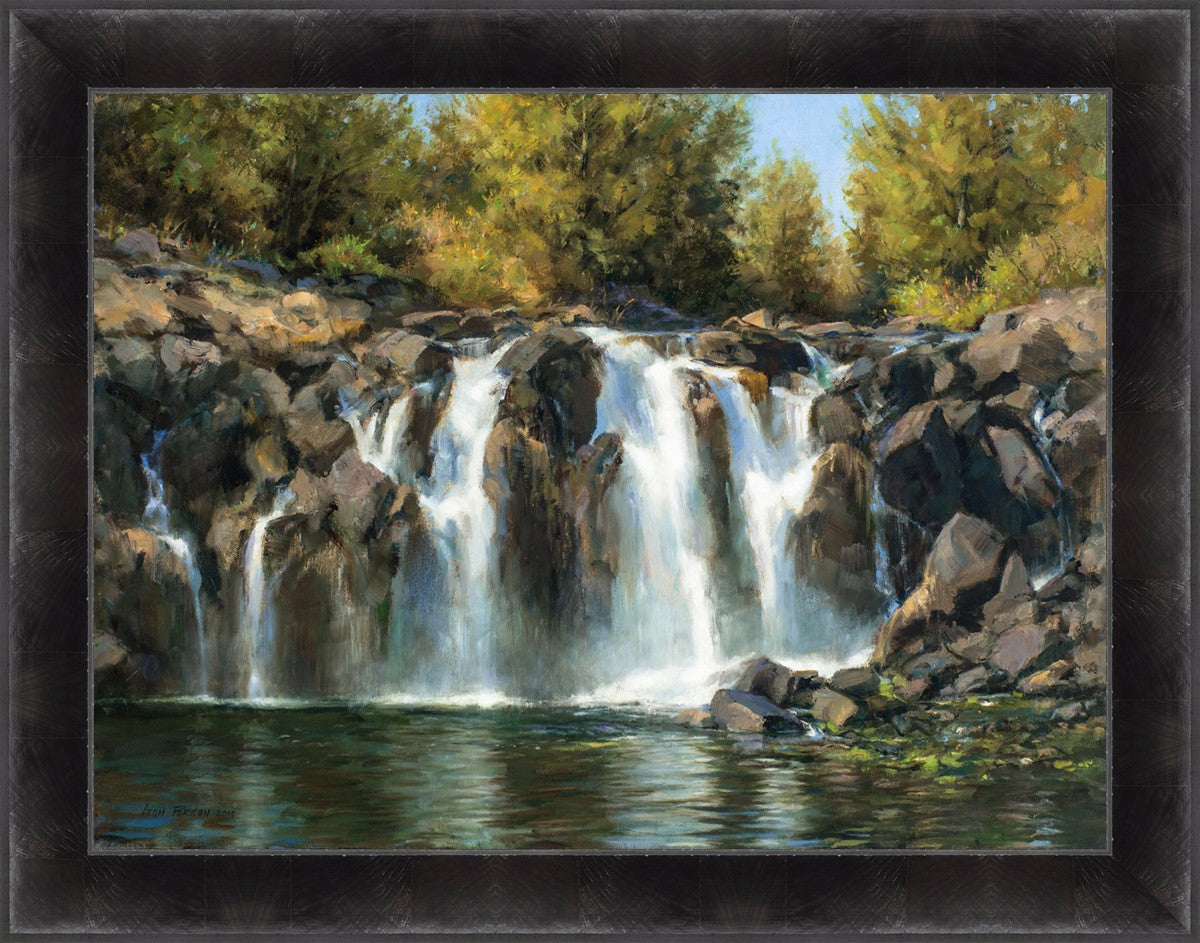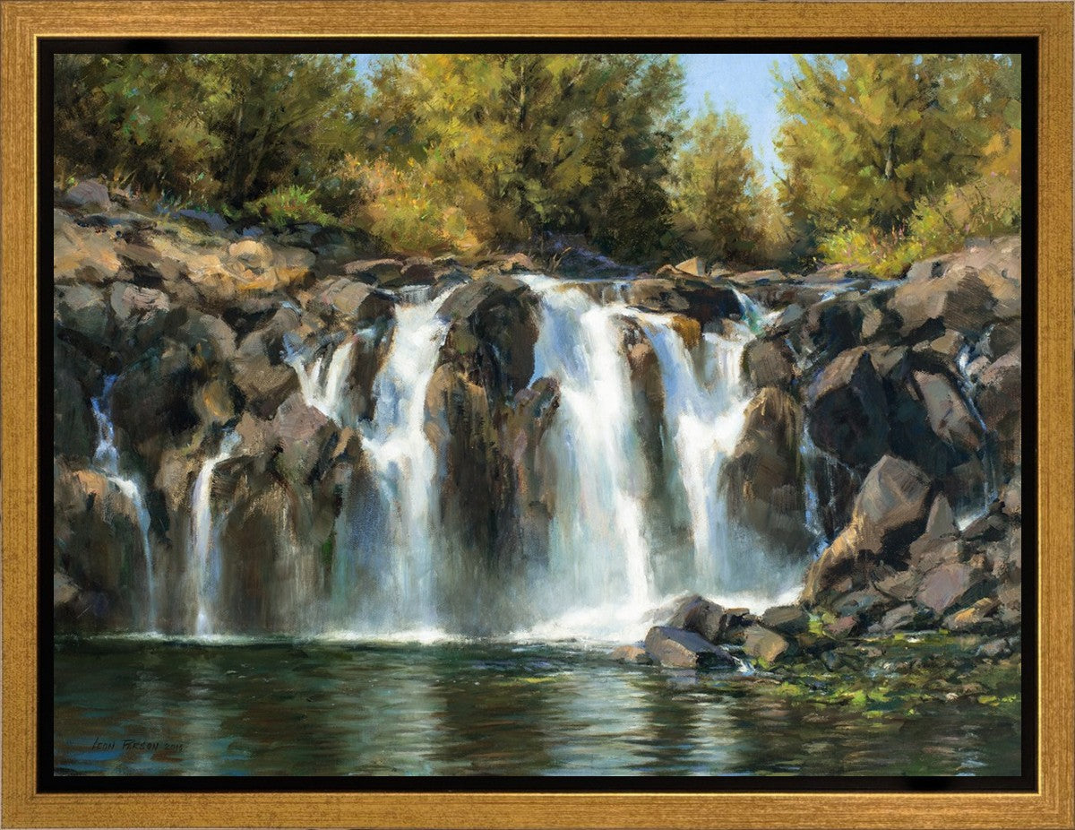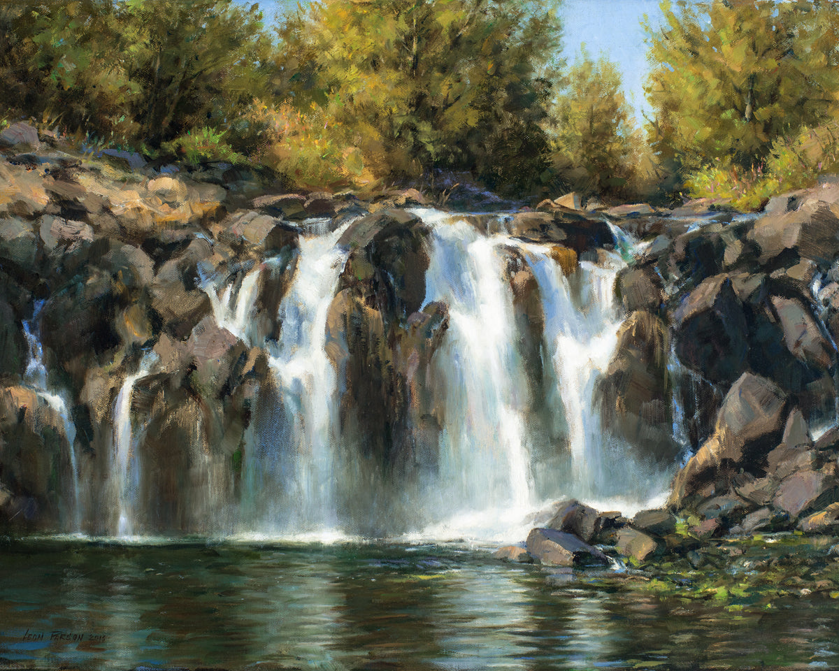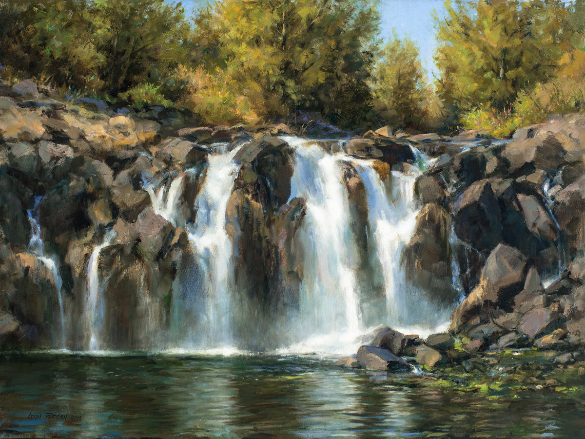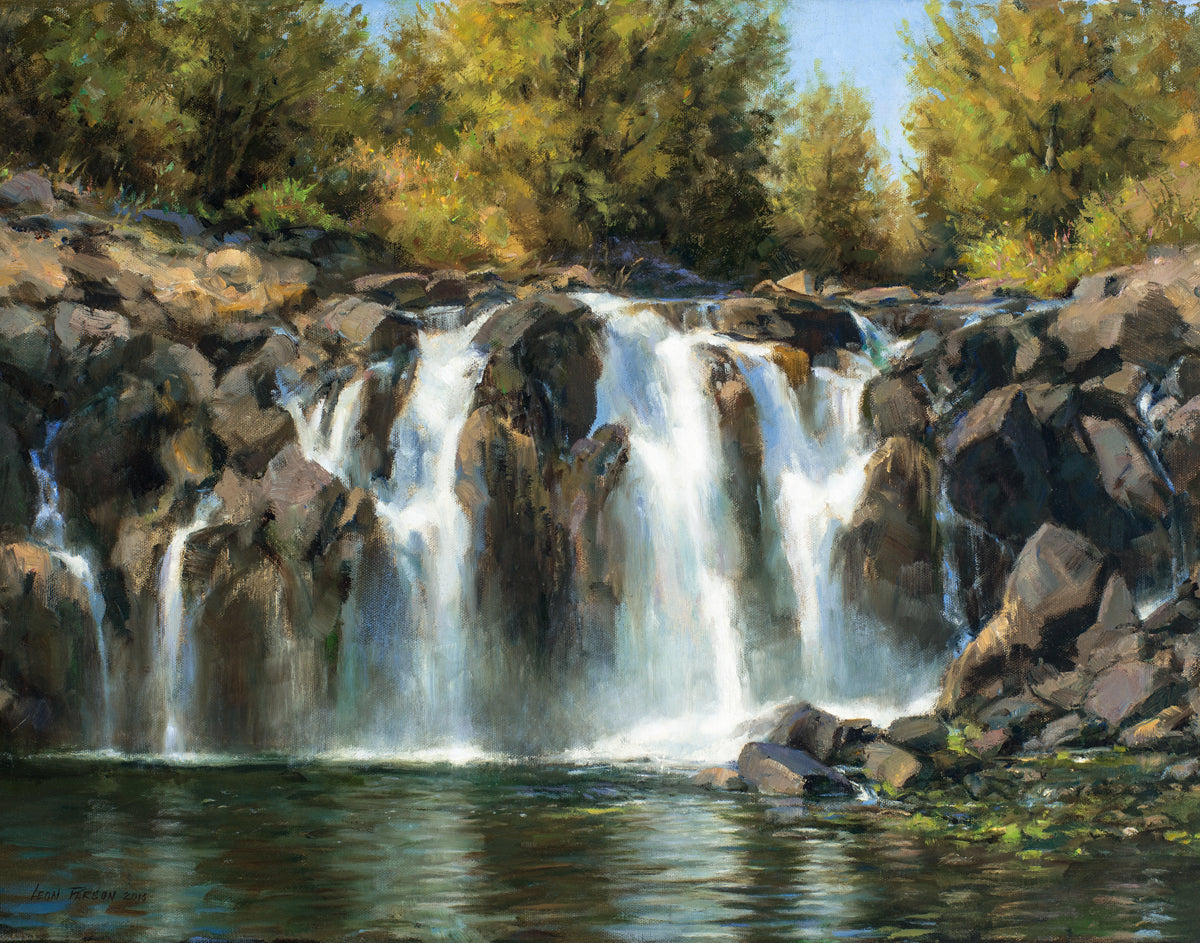 Waterfalls to me are both paradoxical and magical at the same time. I love the mesmerizing continuous, movement as if alive – yet it truth it is falling, pounding water. The waterfall is called Monkey Rock and is found just north of Teton Idaho and flows from there into the Teton River. This painting was started as a demo in my BYUI landscape class using a 9”x12” plein air painting as a basis then finished later at home in my studio.