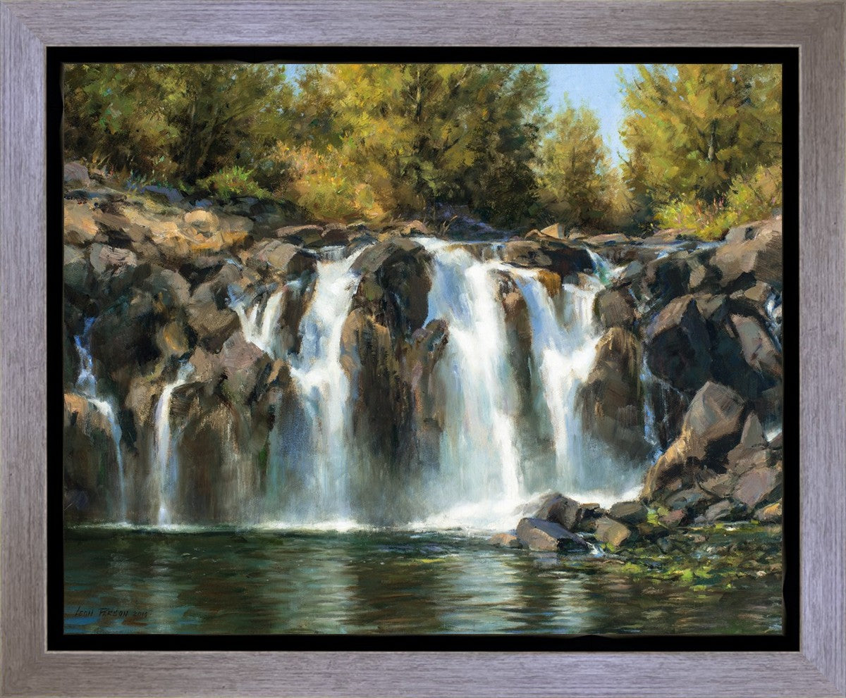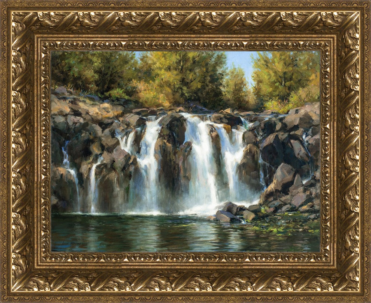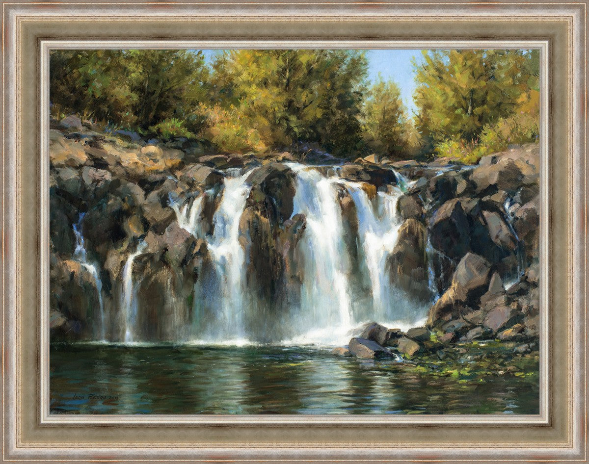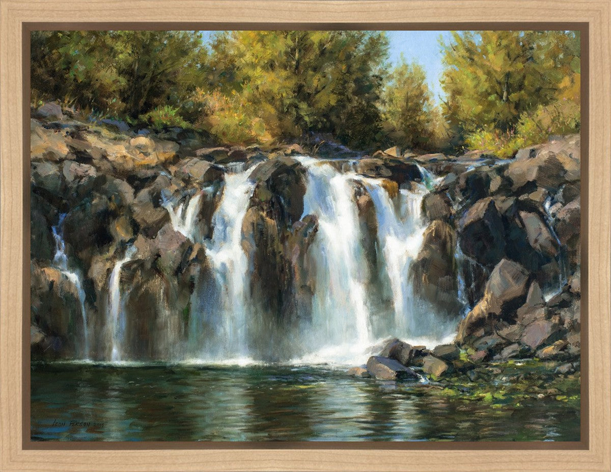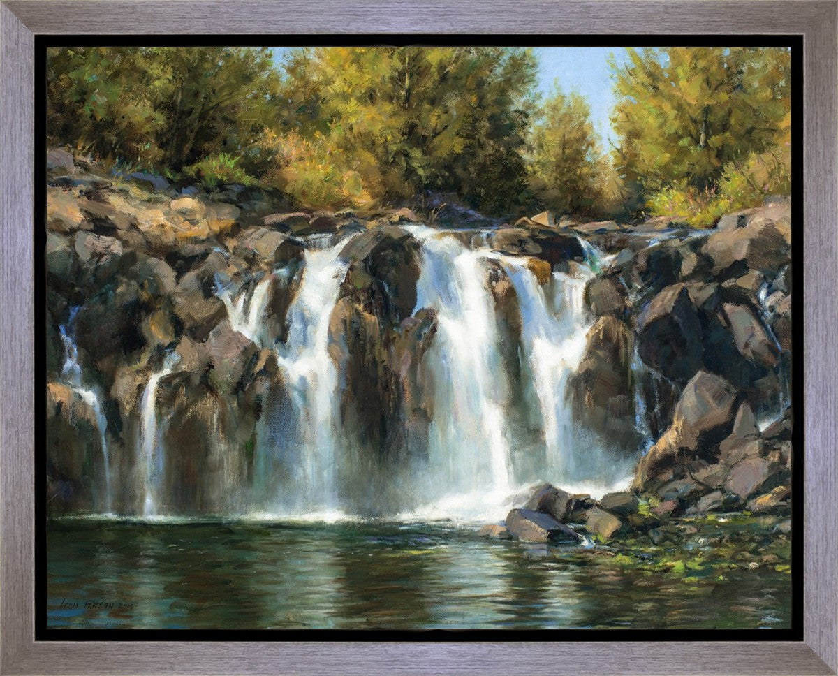 Waterfalls to me are both paradoxical and magical at the same time. I love the mesmerizing continuous, movement as if alive – yet it truth it is falling, pounding water. The waterfall is called Monkey Rock and is found just north of Teton Idaho and flows from there into the Teton River. This painting was started as a demo in my BYUI landscape class using a 9”x12” plein air painting as a basis then finished later at home in my studio.