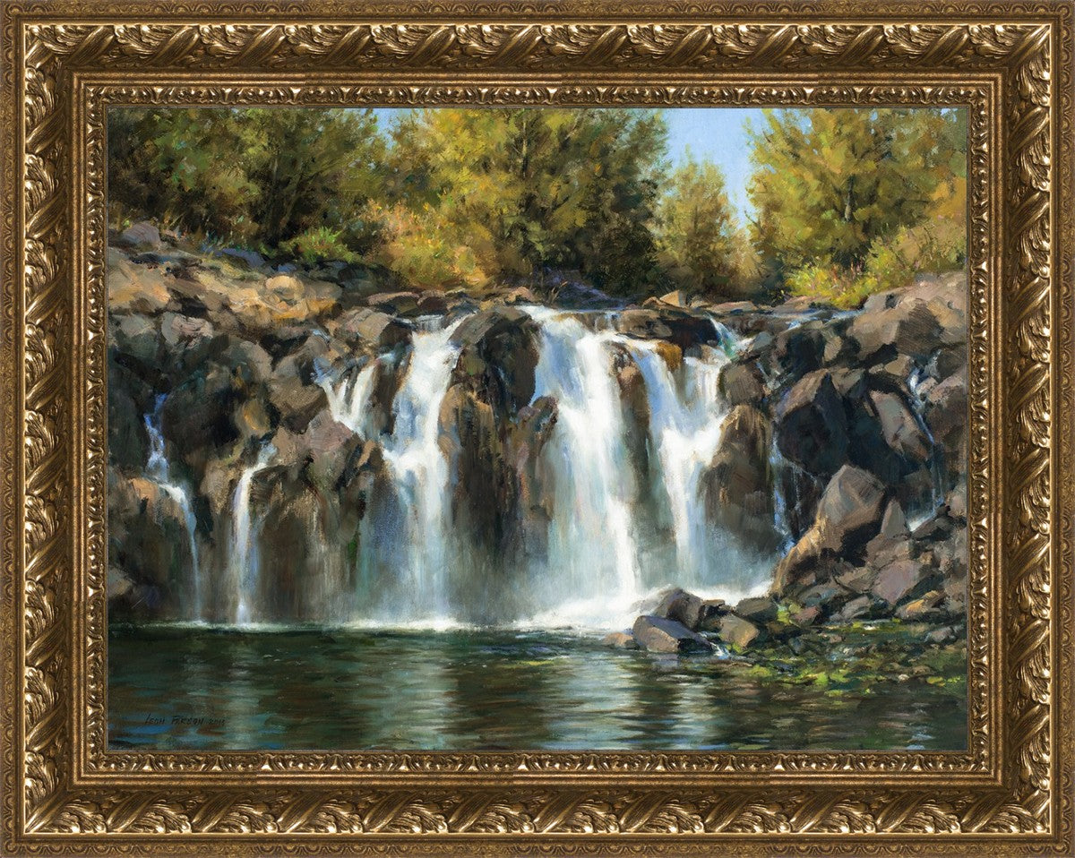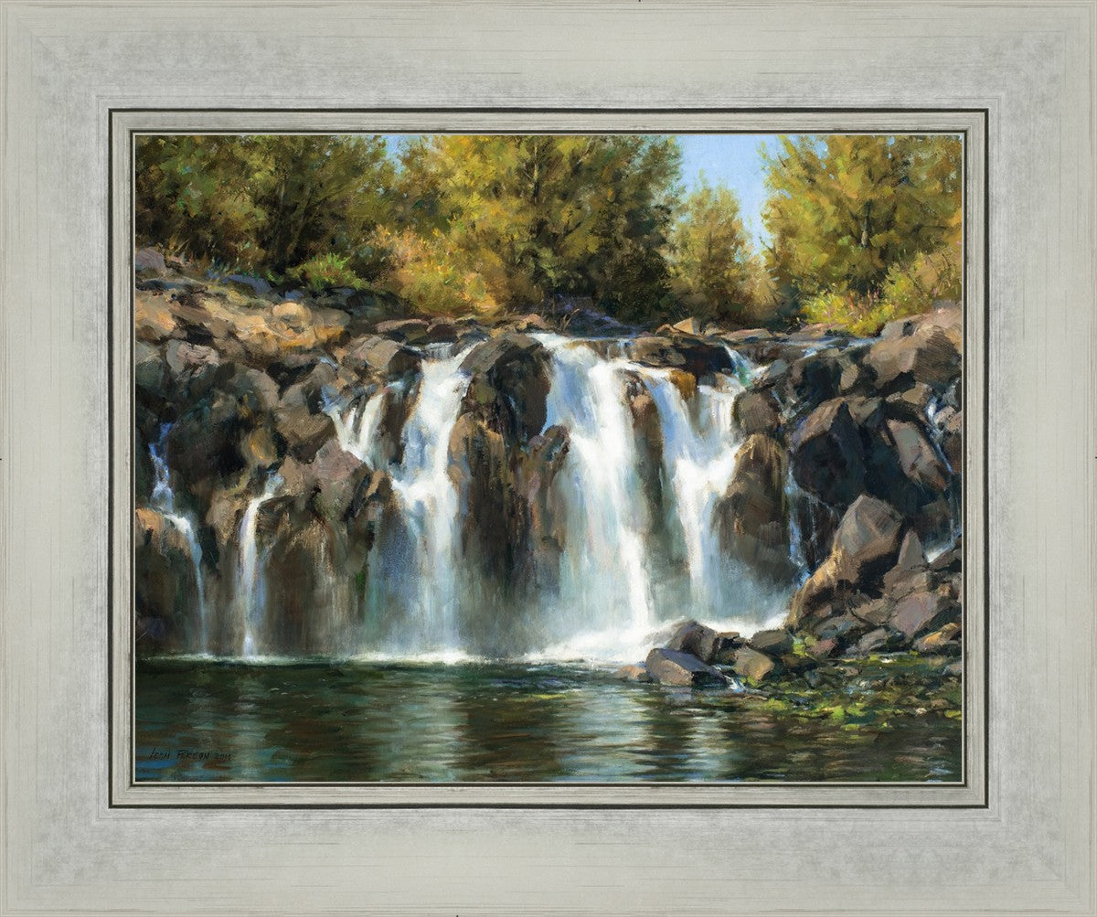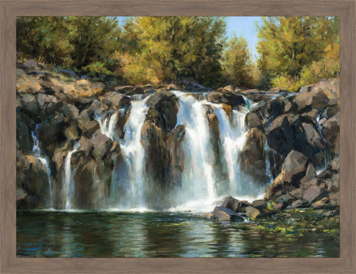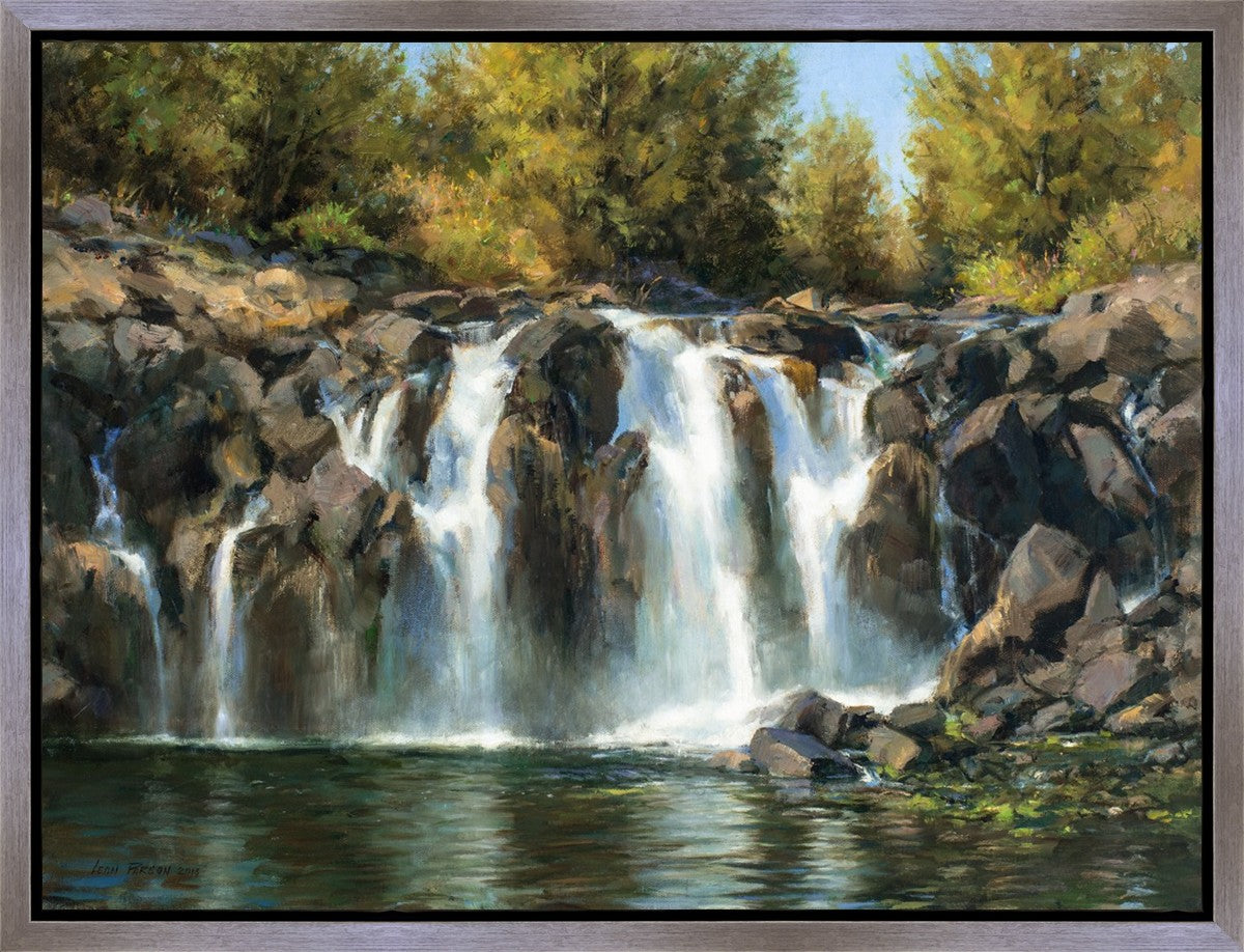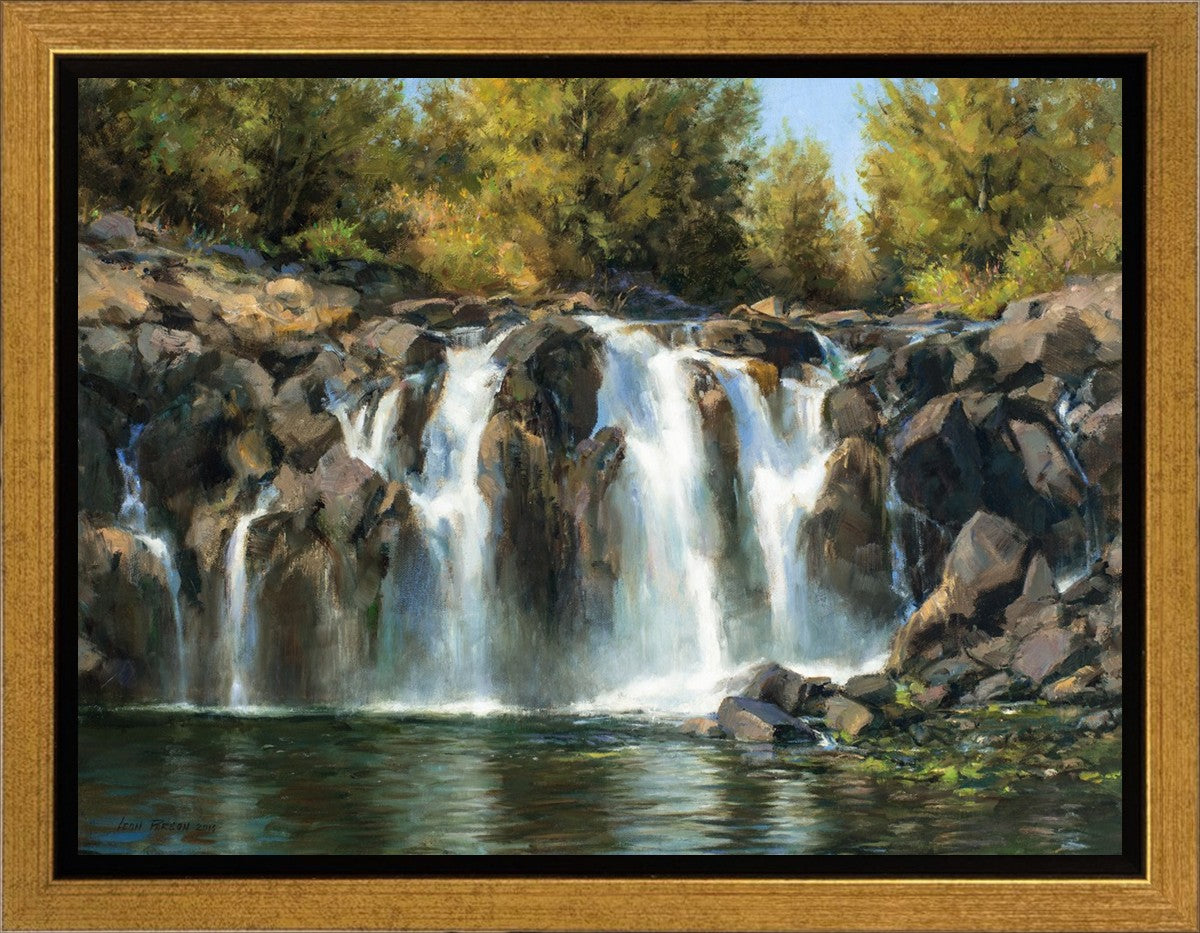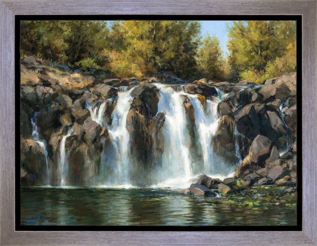 Waterfalls to me are both paradoxical and magical at the same time. I love the mesmerizing continuous, movement as if alive – yet it truth it is falling, pounding water. The waterfall is called Monkey Rock and is found just north of Teton Idaho and flows from there into the Teton River. This painting was started as a demo in my BYUI landscape class using a 9”x12” plein air painting as a basis then finished later at home in my studio.