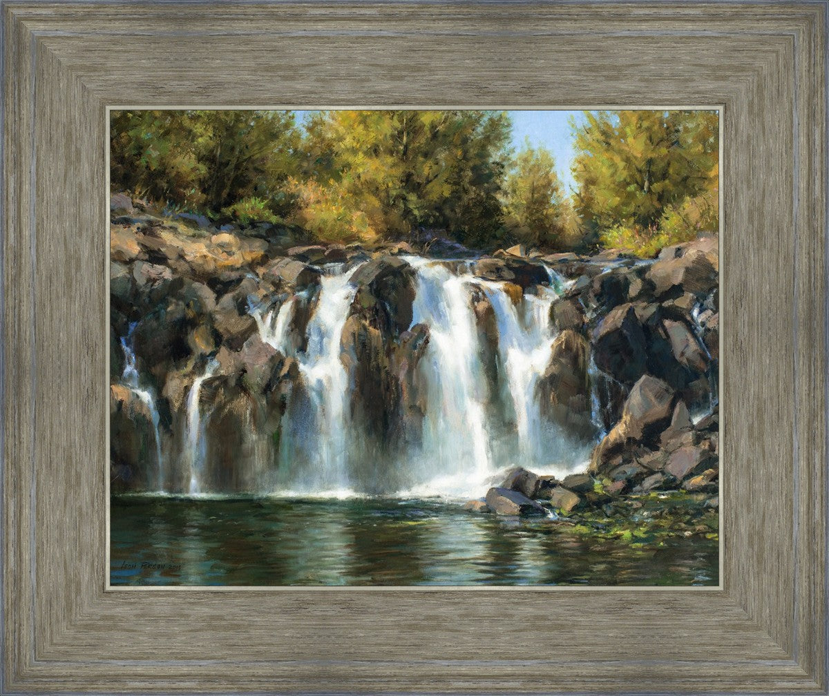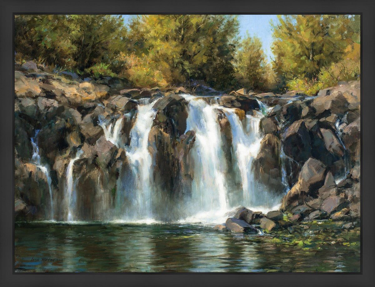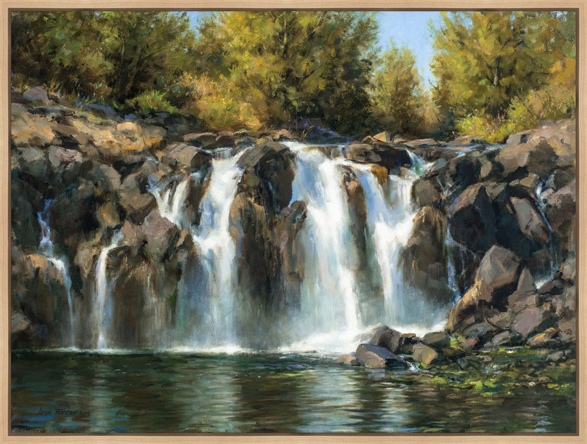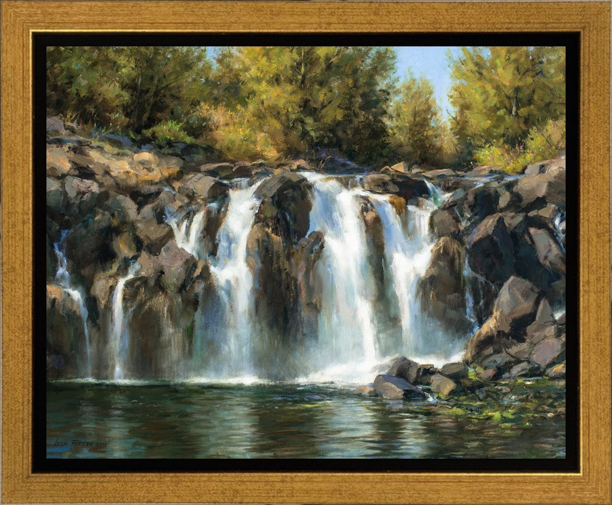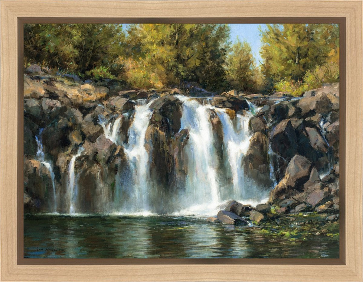 Waterfalls to me are both paradoxical and magical at the same time. I love the mesmerizing continuous, movement as if alive – yet it truth it is falling, pounding water. The waterfall is called Monkey Rock and is found just north of Teton Idaho and flows from there into the Teton River. This painting was started as a demo in my BYUI landscape class using a 9”x12” plein air painting as a basis then finished later at home in my studio.