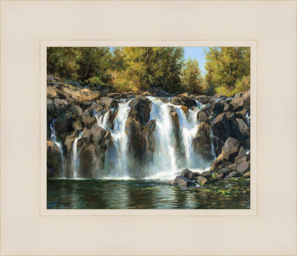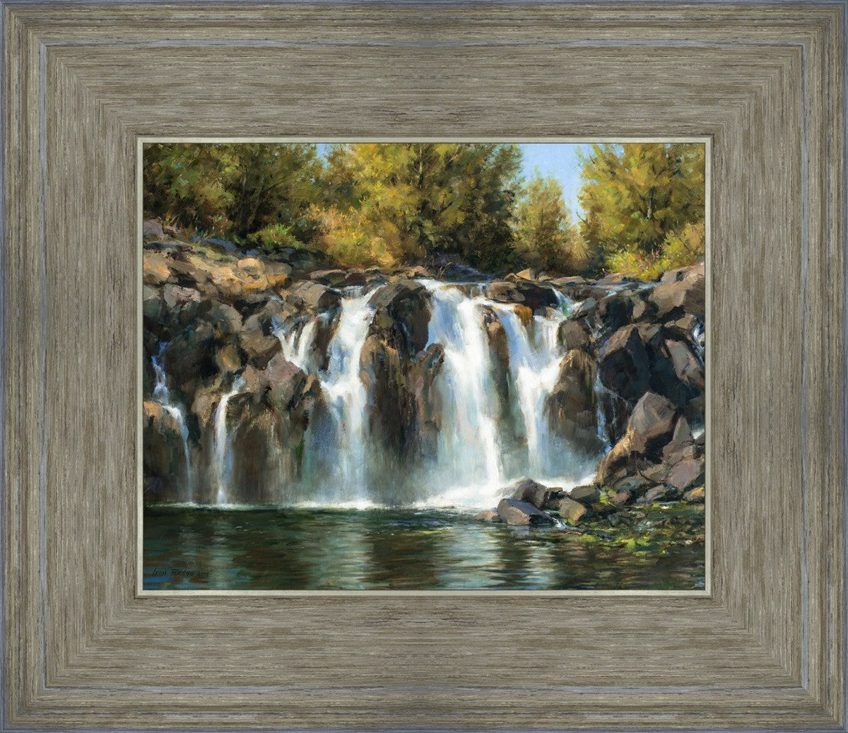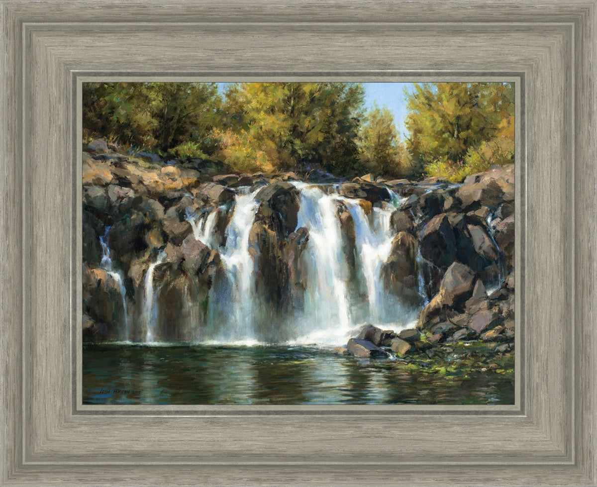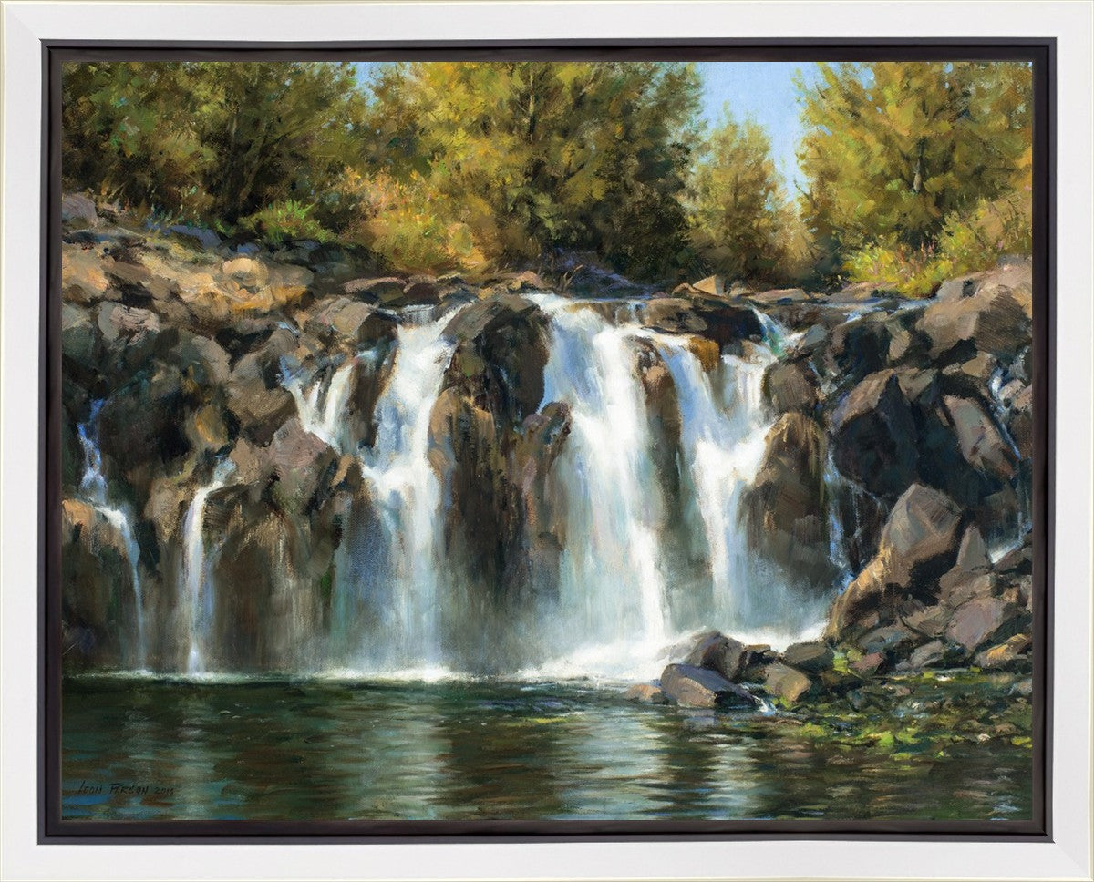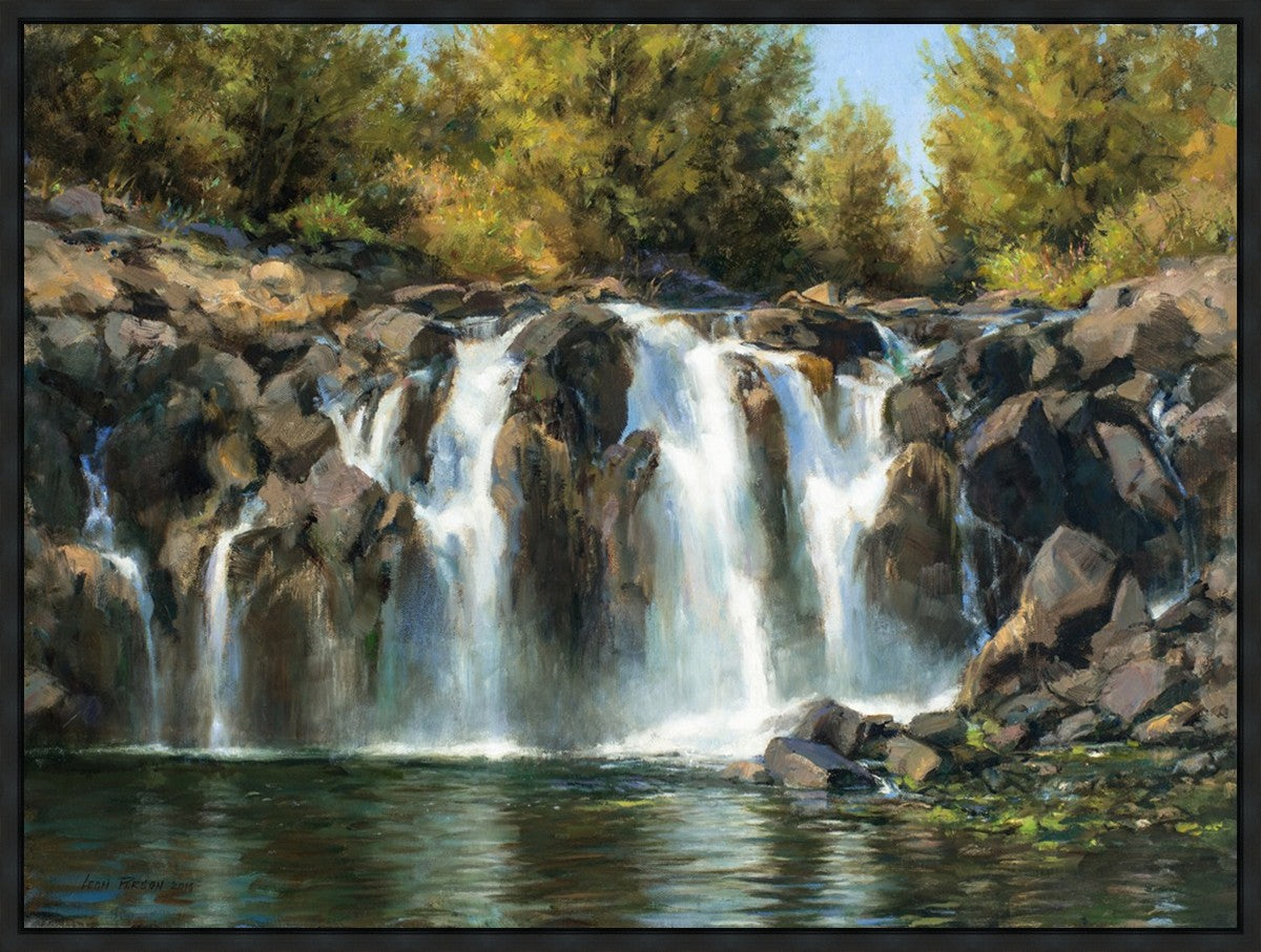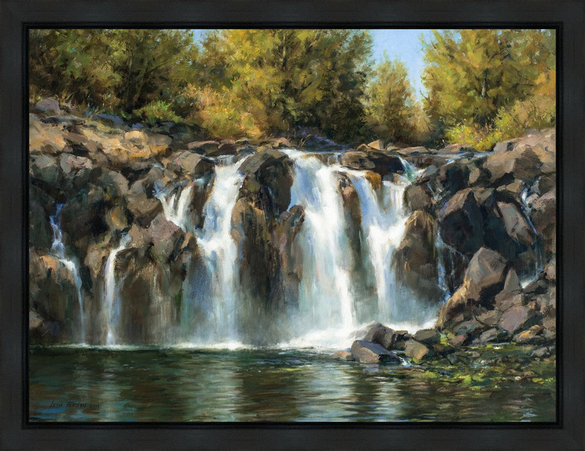 Waterfalls to me are both paradoxical and magical at the same time. I love the mesmerizing continuous, movement as if alive – yet it truth it is falling, pounding water. The waterfall is called Monkey Rock and is found just north of Teton Idaho and flows from there into the Teton River. This painting was started as a demo in my BYUI landscape class using a 9”x12” plein air painting as a basis then finished later at home in my studio.