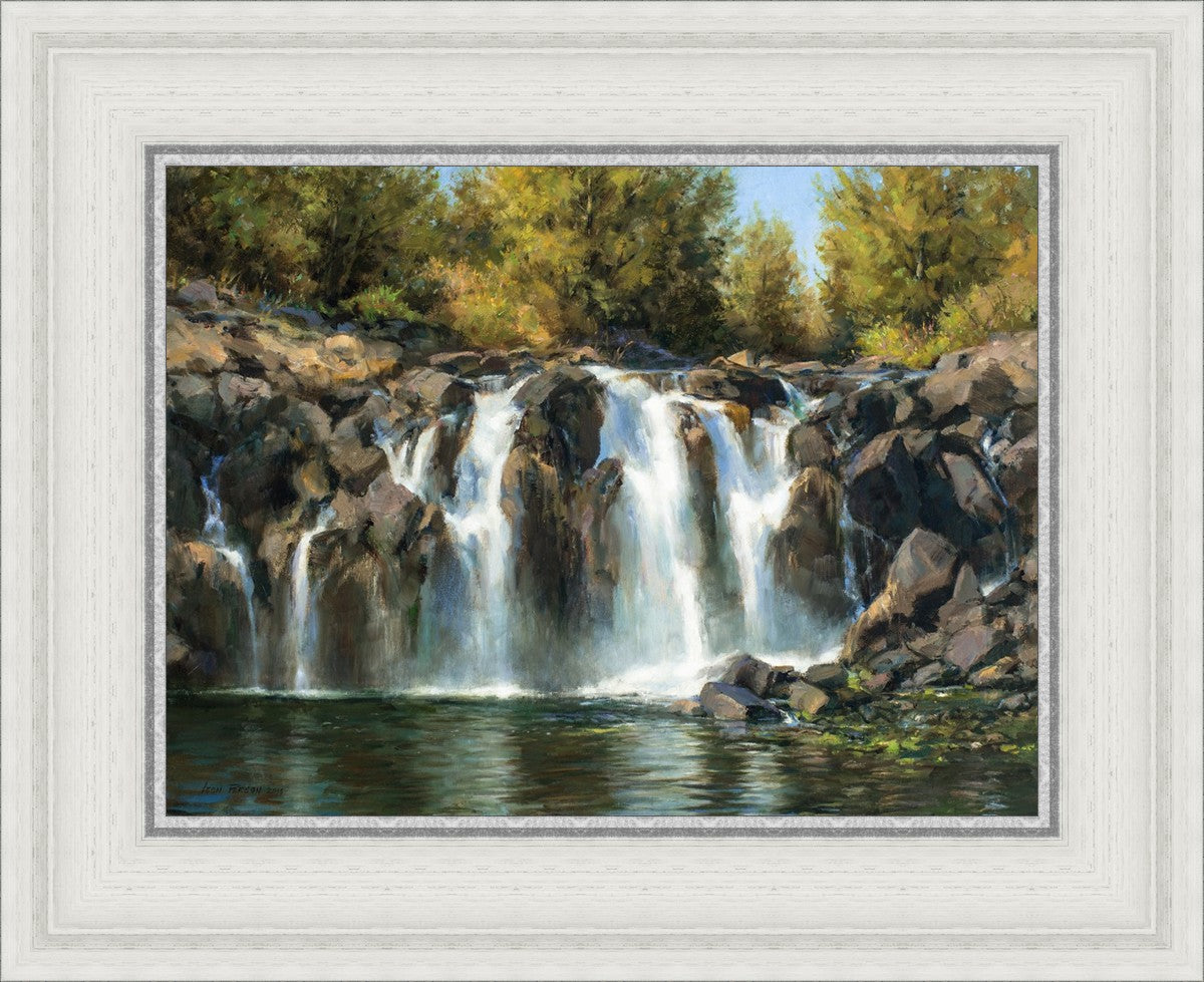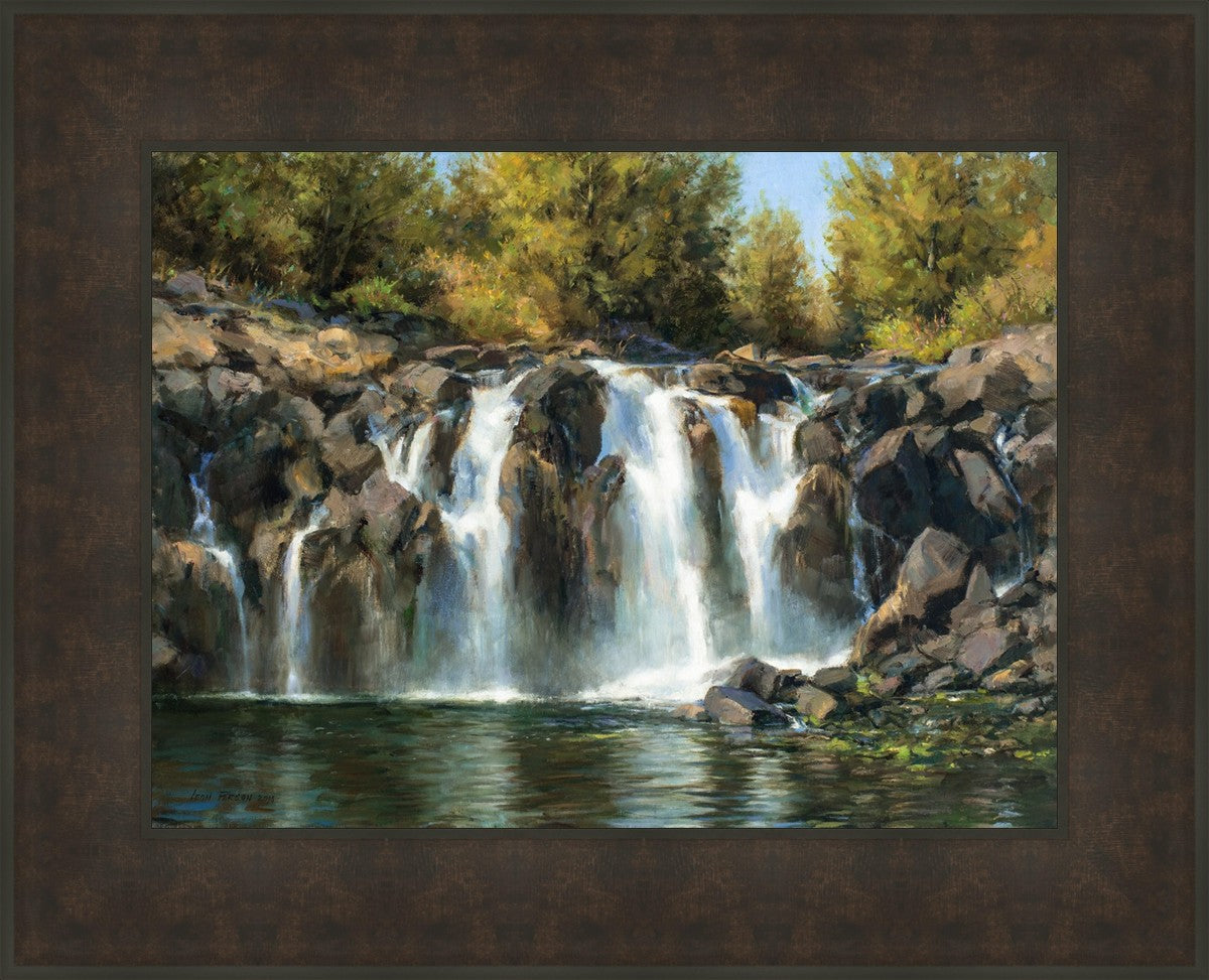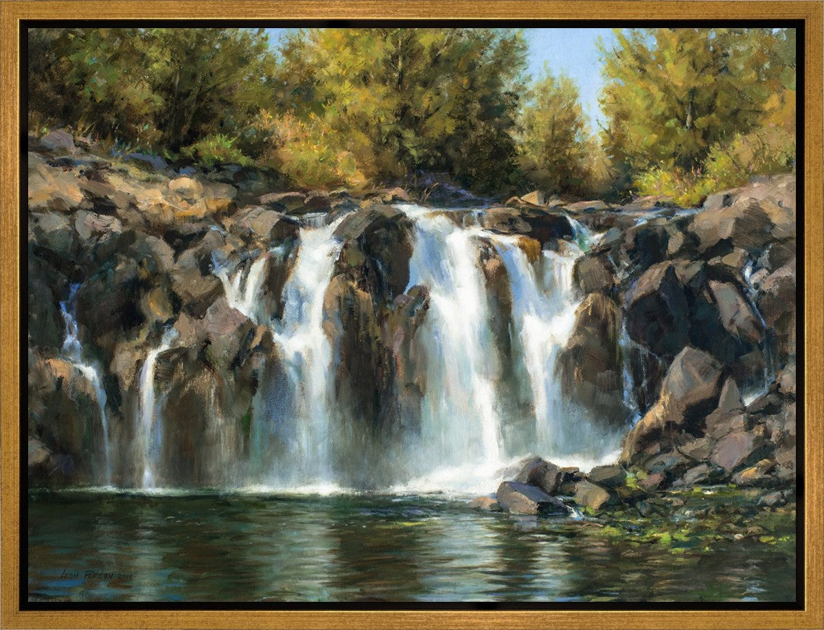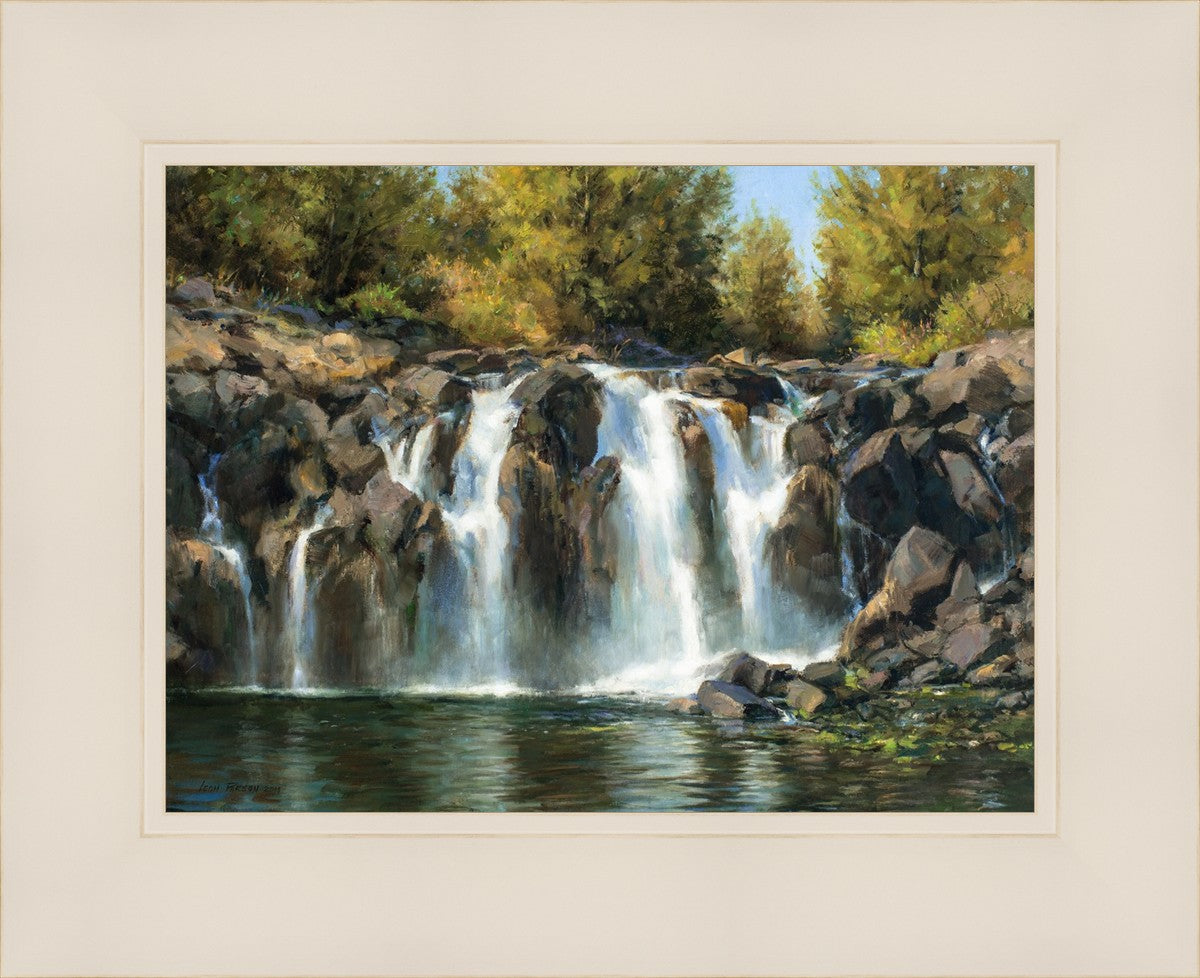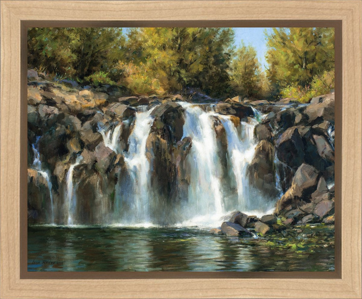 Waterfalls to me are both paradoxical and magical at the same time. I love the mesmerizing continuous, movement as if alive – yet it truth it is falling, pounding water. The waterfall is called Monkey Rock and is found just north of Teton Idaho and flows from there into the Teton River. This painting was started as a demo in my BYUI landscape class using a 9”x12” plein air painting as a basis then finished later at home in my studio.