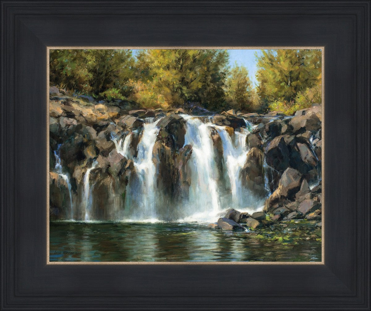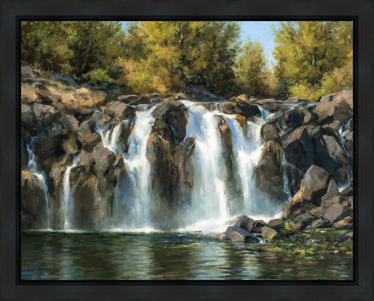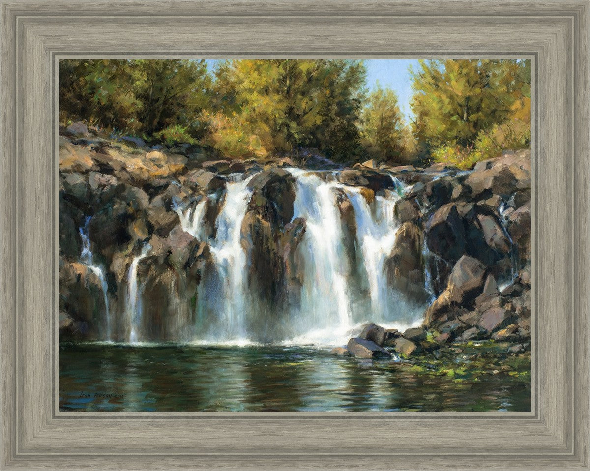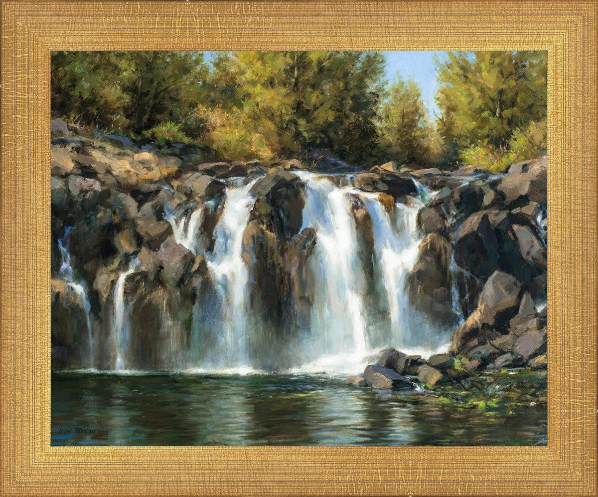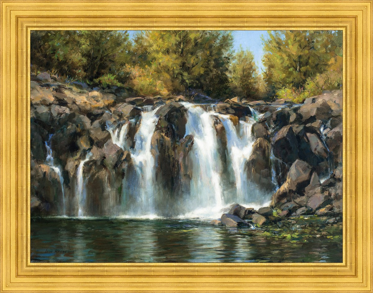 Waterfalls to me are both paradoxical and magical at the same time. I love the mesmerizing continuous, movement as if alive – yet it truth it is falling, pounding water. The waterfall is called Monkey Rock and is found just north of Teton Idaho and flows from there into the Teton River. This painting was started as a demo in my BYUI landscape class using a 9”x12” plein air painting as a basis then finished later at home in my studio.