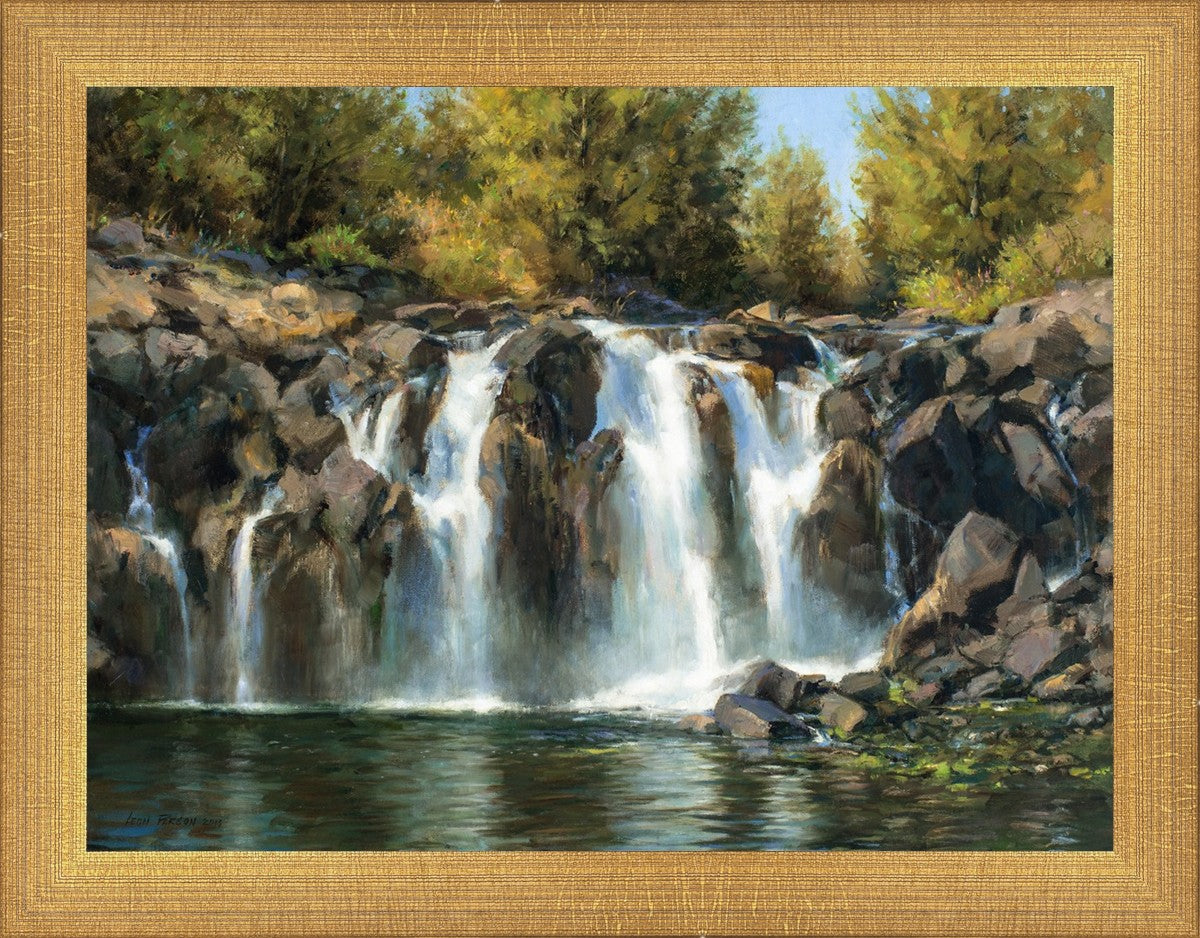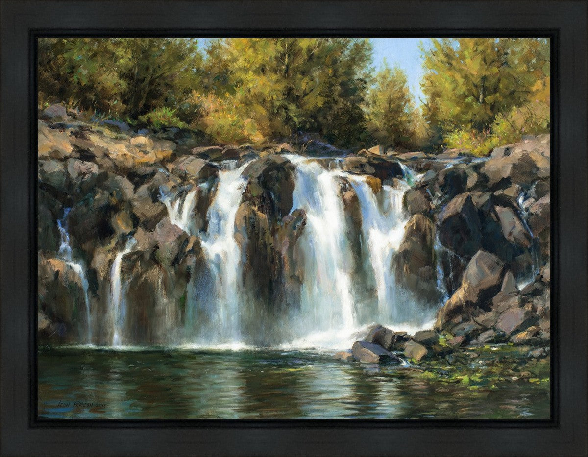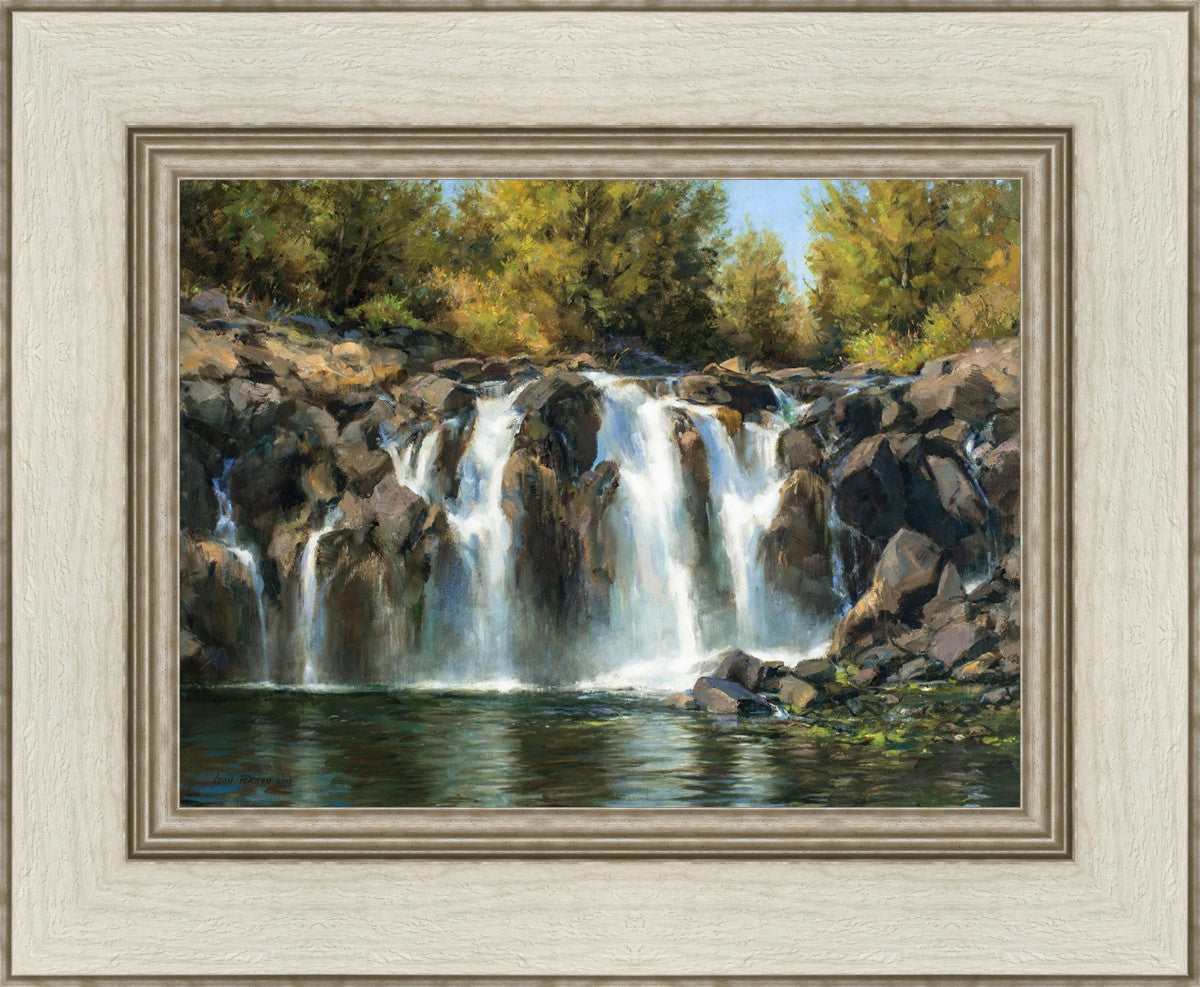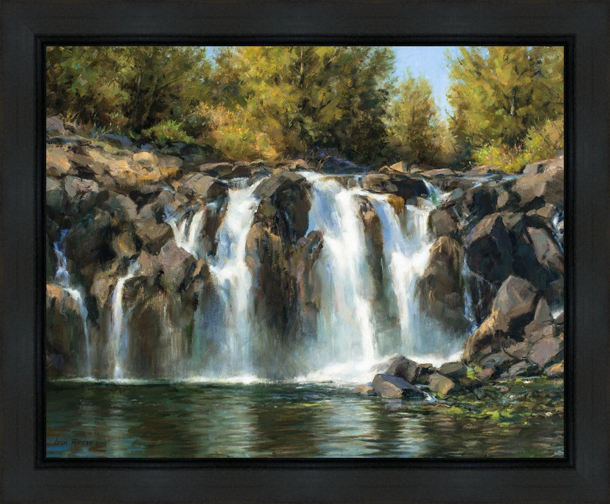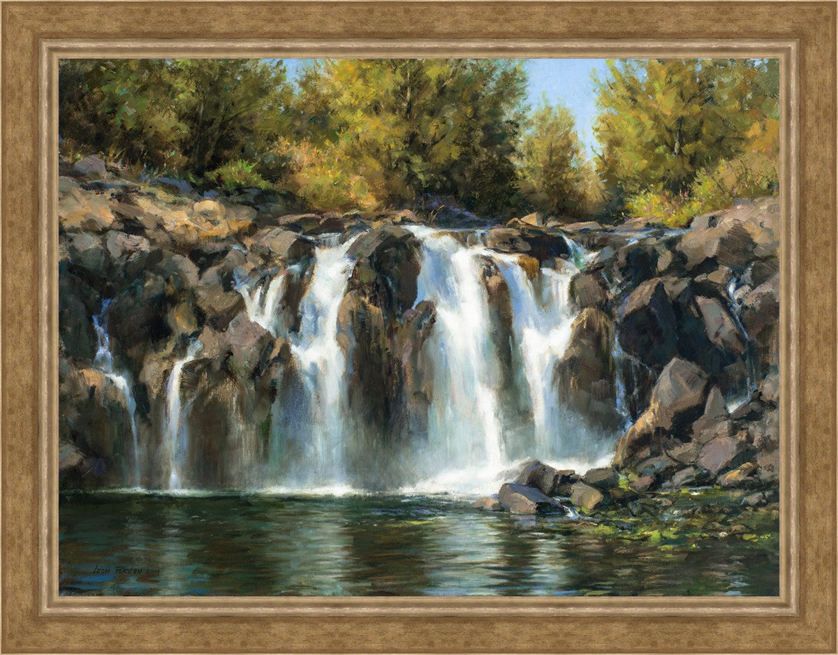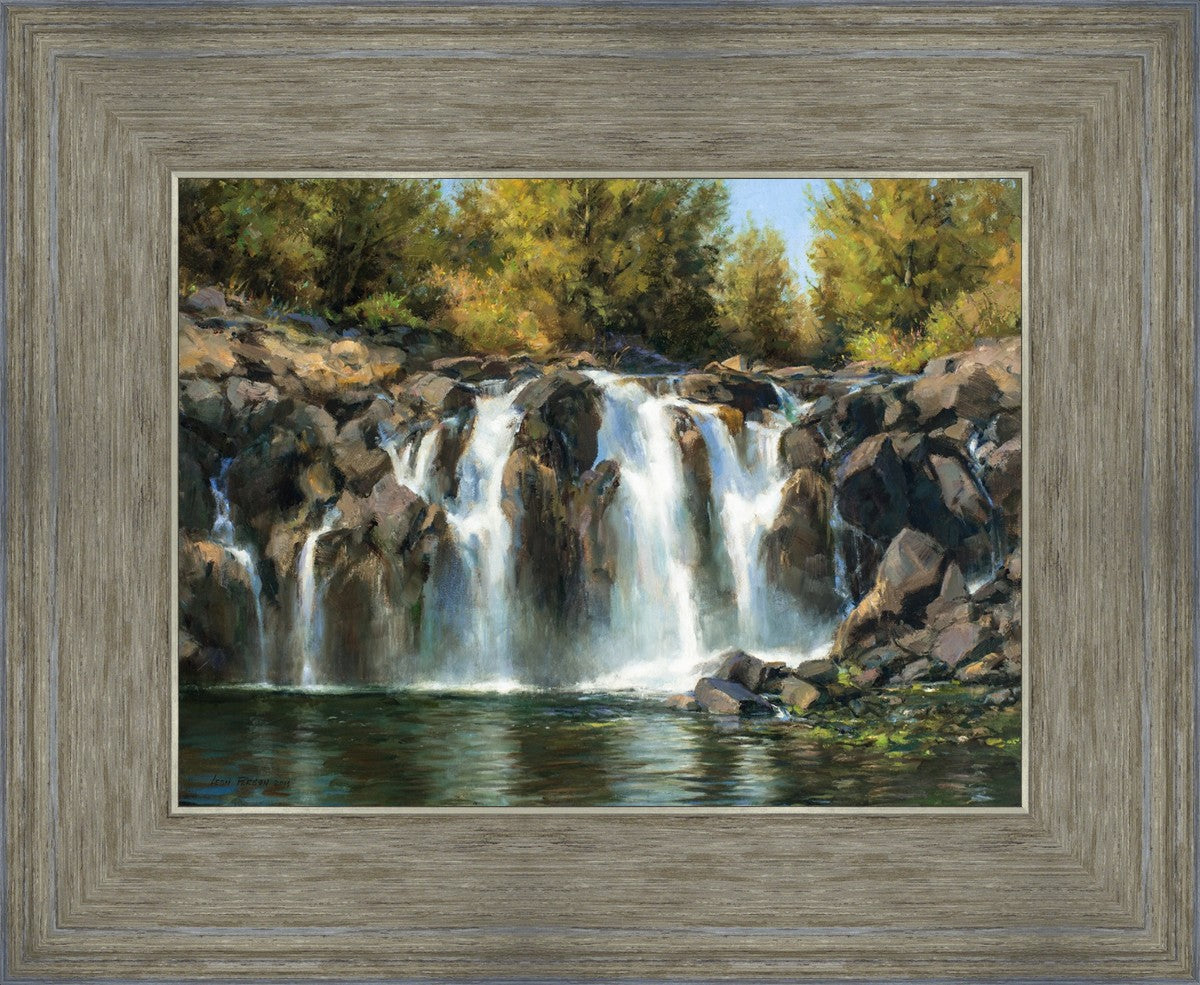 Waterfalls to me are both paradoxical and magical at the same time. I love the mesmerizing continuous, movement as if alive – yet it truth it is falling, pounding water. The waterfall is called Monkey Rock and is found just north of Teton Idaho and flows from there into the Teton River. This painting was started as a demo in my BYUI landscape class using a 9”x12” plein air painting as a basis then finished later at home in my studio.