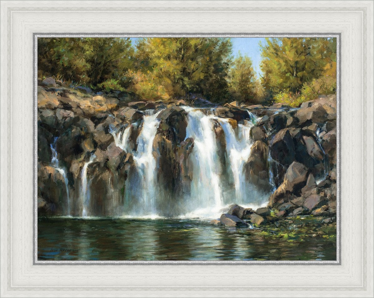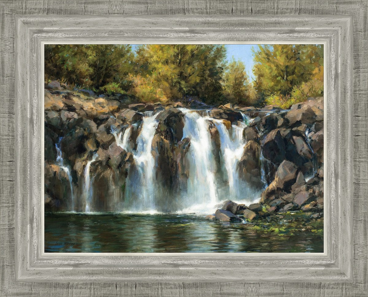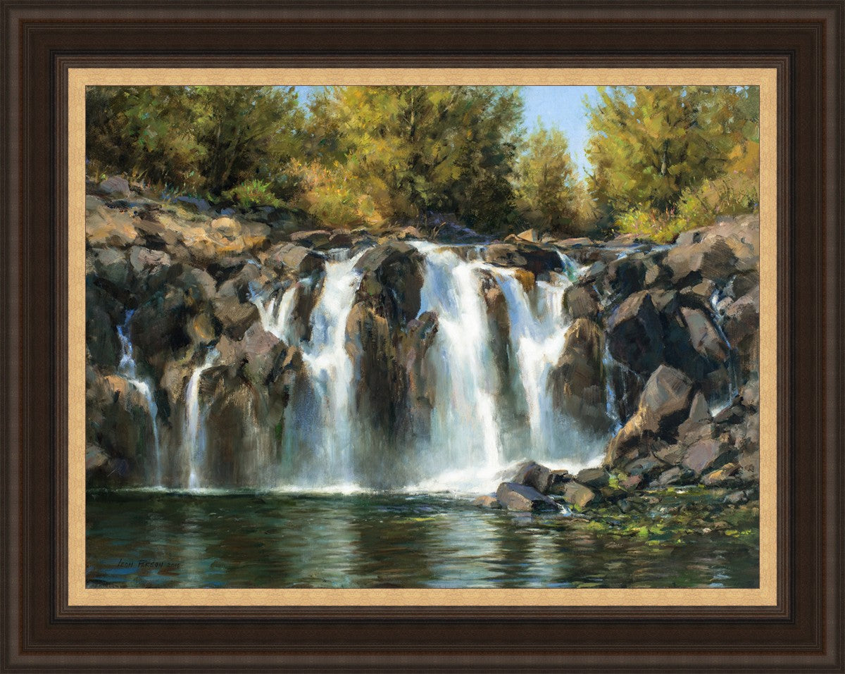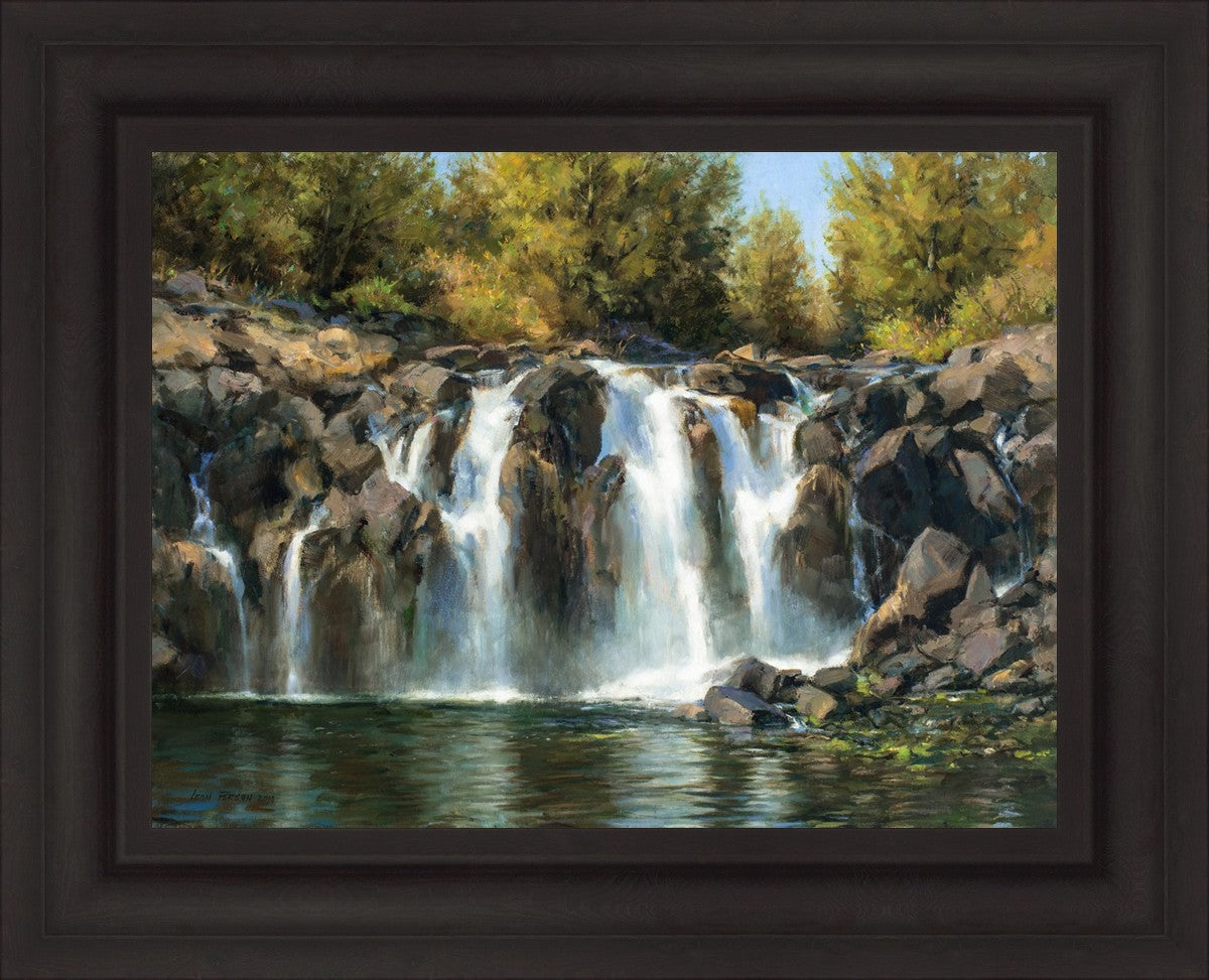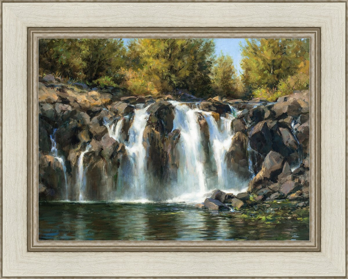 Waterfalls to me are both paradoxical and magical at the same time. I love the mesmerizing continuous, movement as if alive – yet it truth it is falling, pounding water. The waterfall is called Monkey Rock and is found just north of Teton Idaho and flows from there into the Teton River. This painting was started as a demo in my BYUI landscape class using a 9”x12” plein air painting as a basis then finished later at home in my studio.