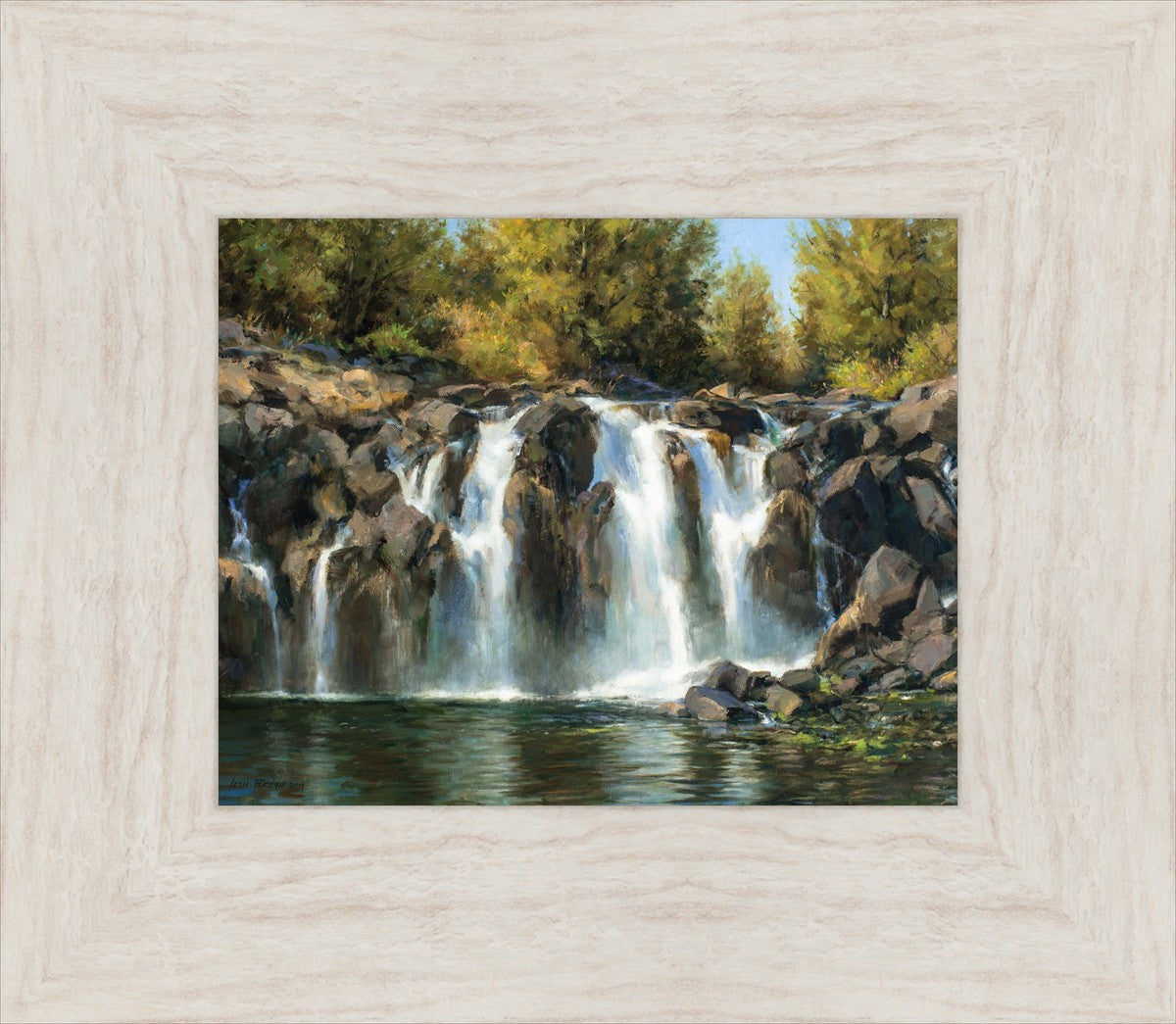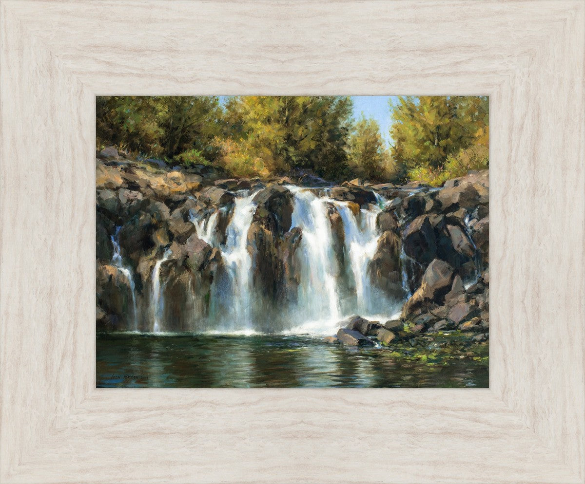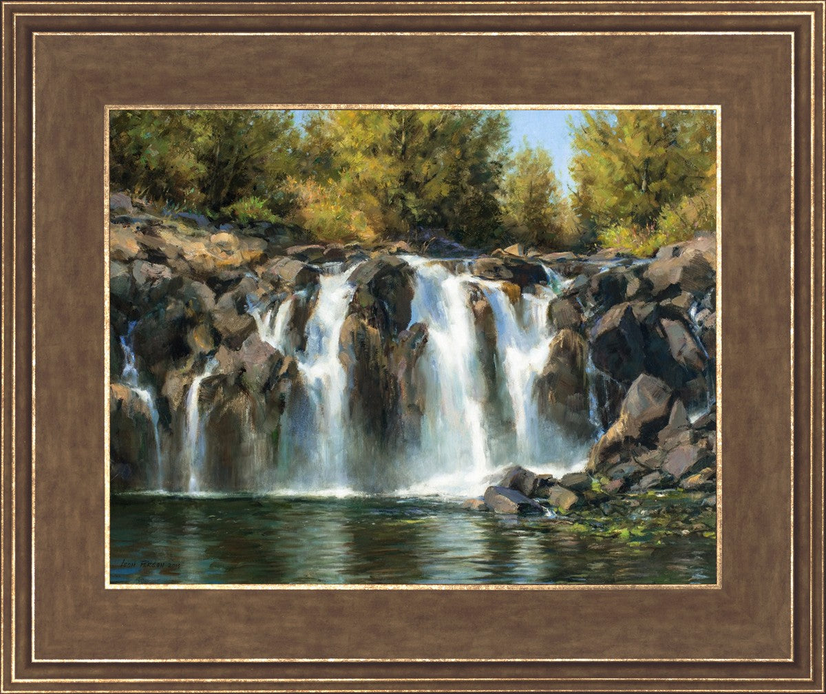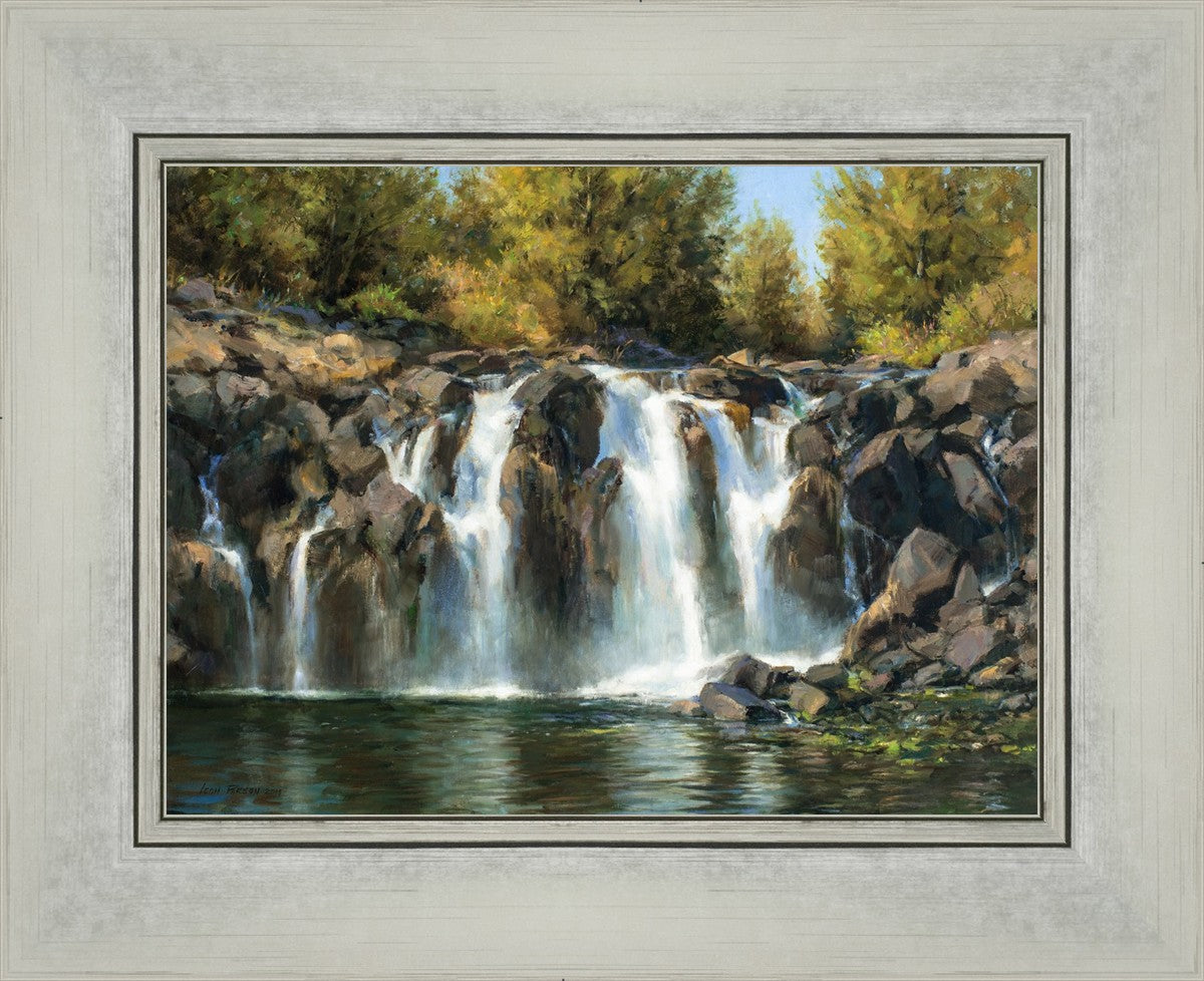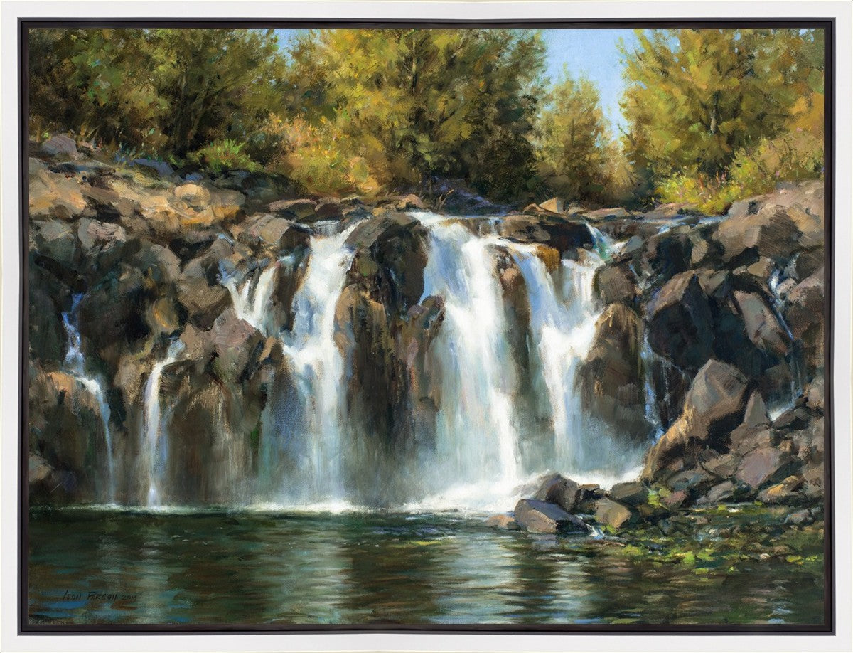 Waterfalls to me are both paradoxical and magical at the same time. I love the mesmerizing continuous, movement as if alive – yet it truth it is falling, pounding water. The waterfall is called Monkey Rock and is found just north of Teton Idaho and flows from there into the Teton River. This painting was started as a demo in my BYUI landscape class using a 9”x12” plein air painting as a basis then finished later at home in my studio.